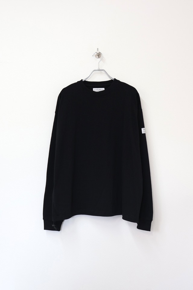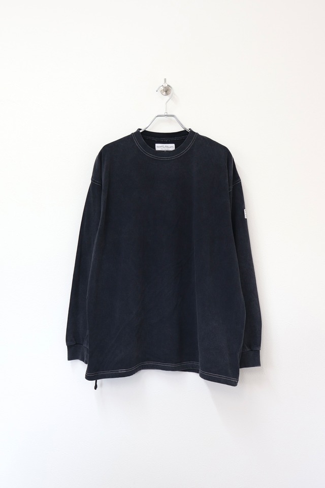 elephant TRIBAL fabrics Fade Fat Long T-SH E02-F / FLT25F FATシリーズ 強撚糸を使用したシャリ感のあるヘビーオンスなLong T-SH。身幅にゆとりを持たせたボックスシルエット。製品後、硫化染めを施しさらにブリーチをナノサイズにしたミストで追い加工を施した細かなフェード感のあるアイテム。裾部分にはアジャスター付きドローコードを配置しシルエット変更が可能。 モデル身長 / 168cm 着用サイズ / F COTTON 100% SIZE FREE : 着丈71cm 身幅62cm 肩幅58cm 裄丈87cm