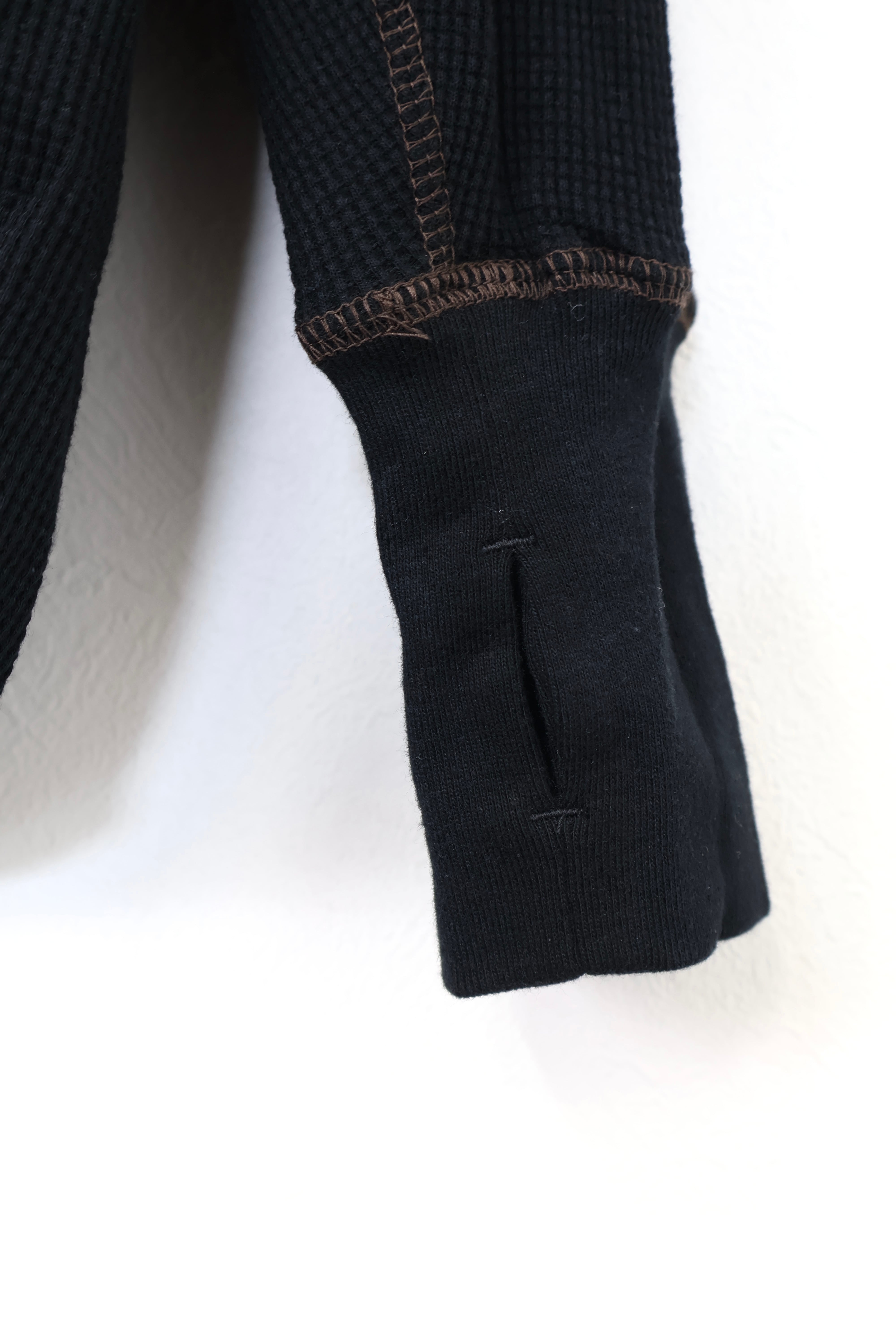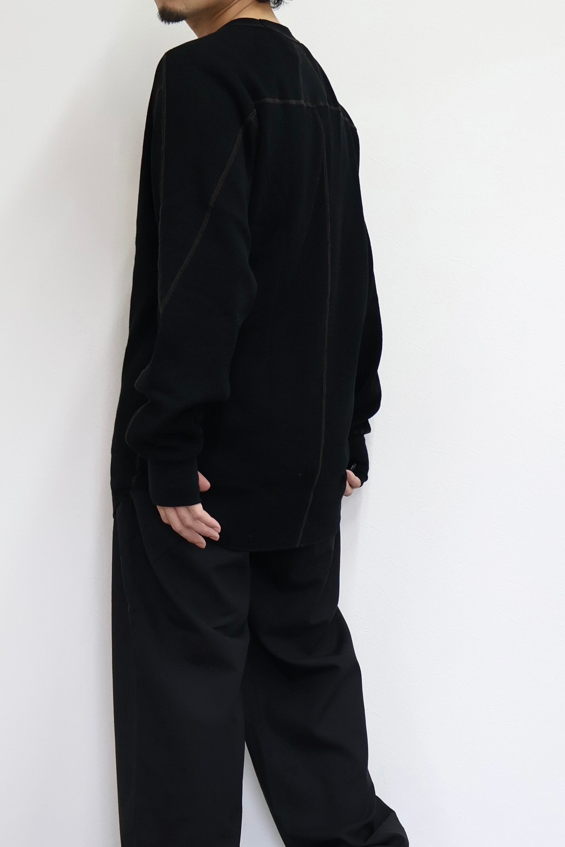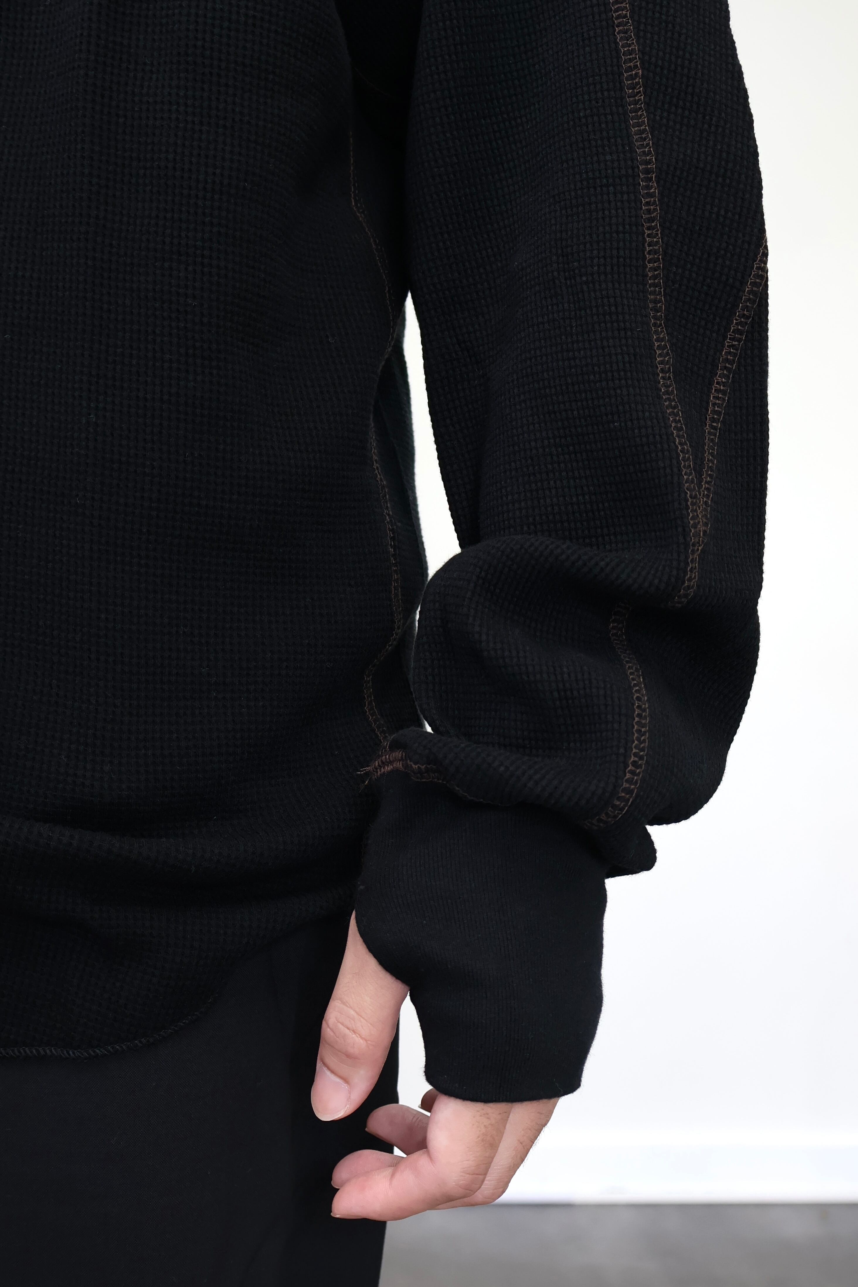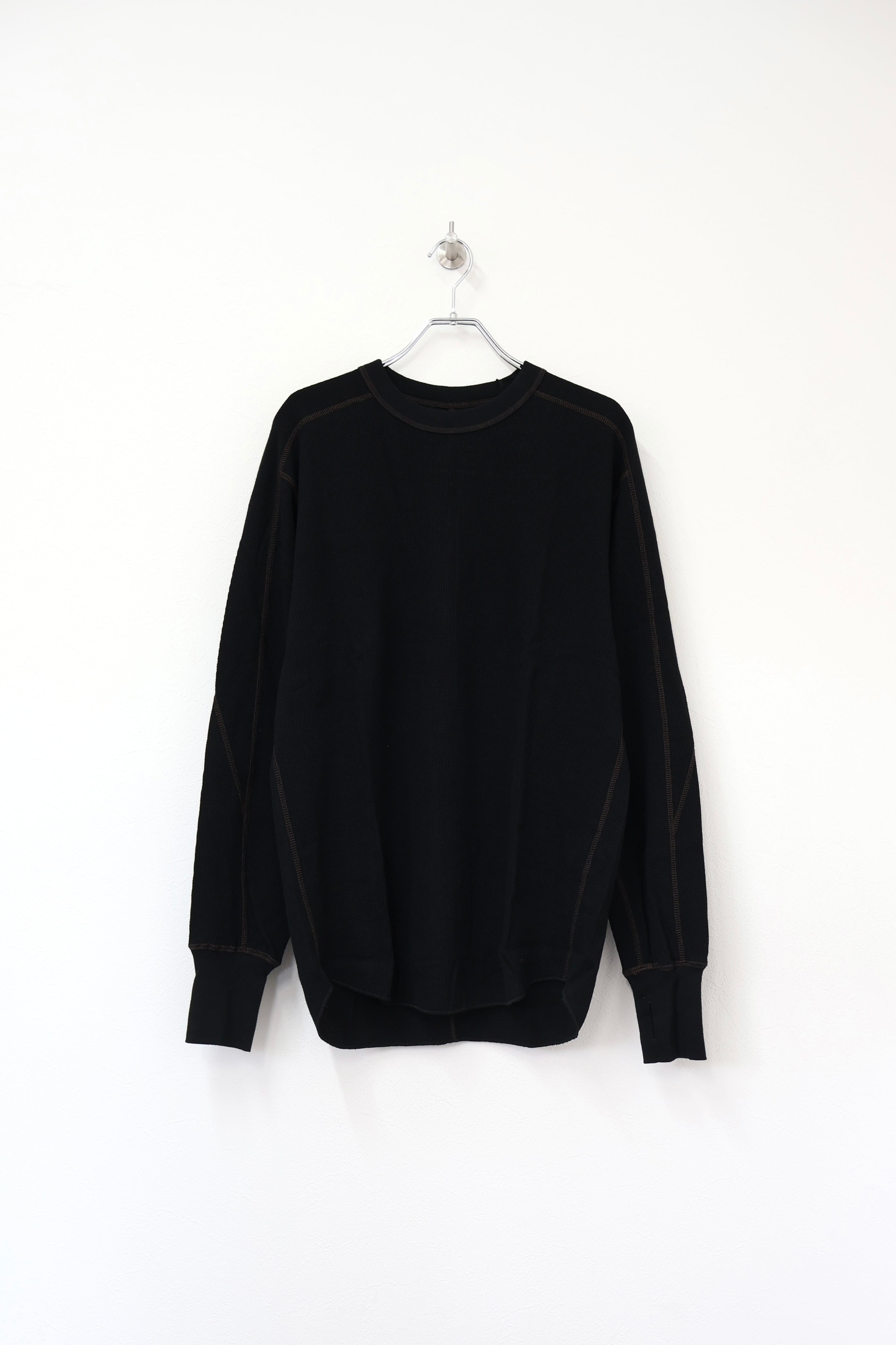 ロングスリーブクルー。スウェーデン軍サーマルの構造を参考にした変形パターン。着丈長めのリラックスフィット。裾ラウンド、袖口にはサムホールを配置。配色ステッチがデザインポイント。