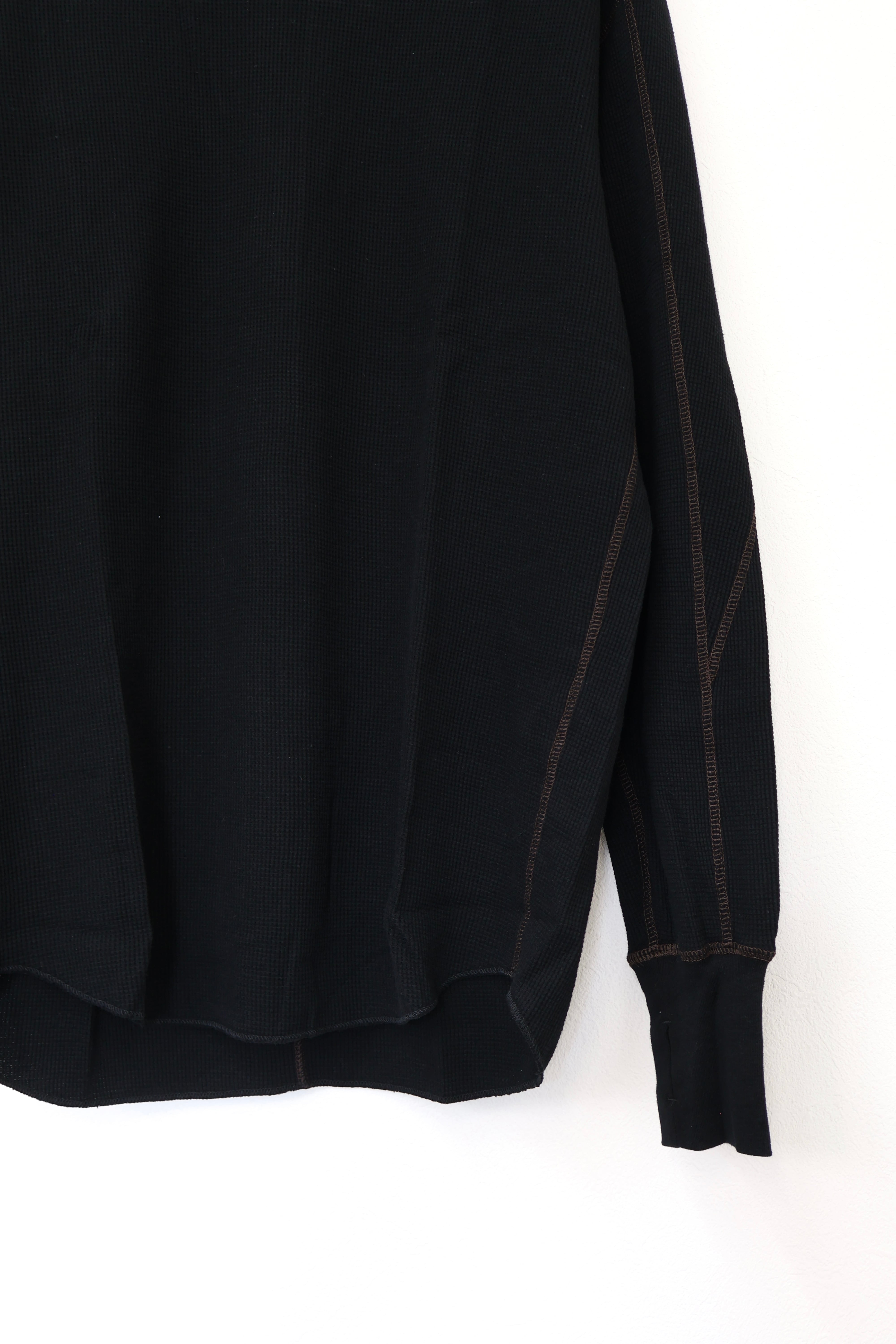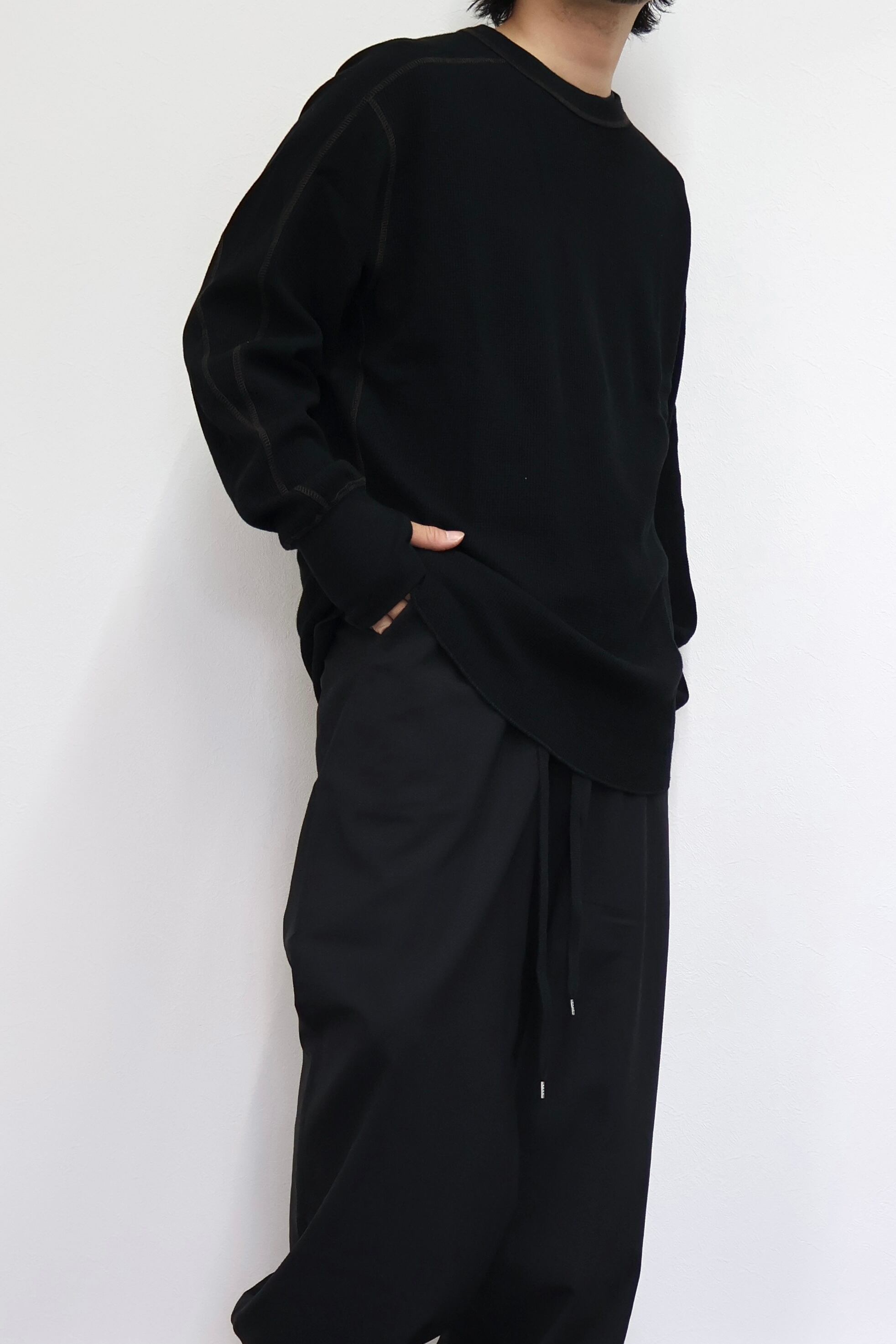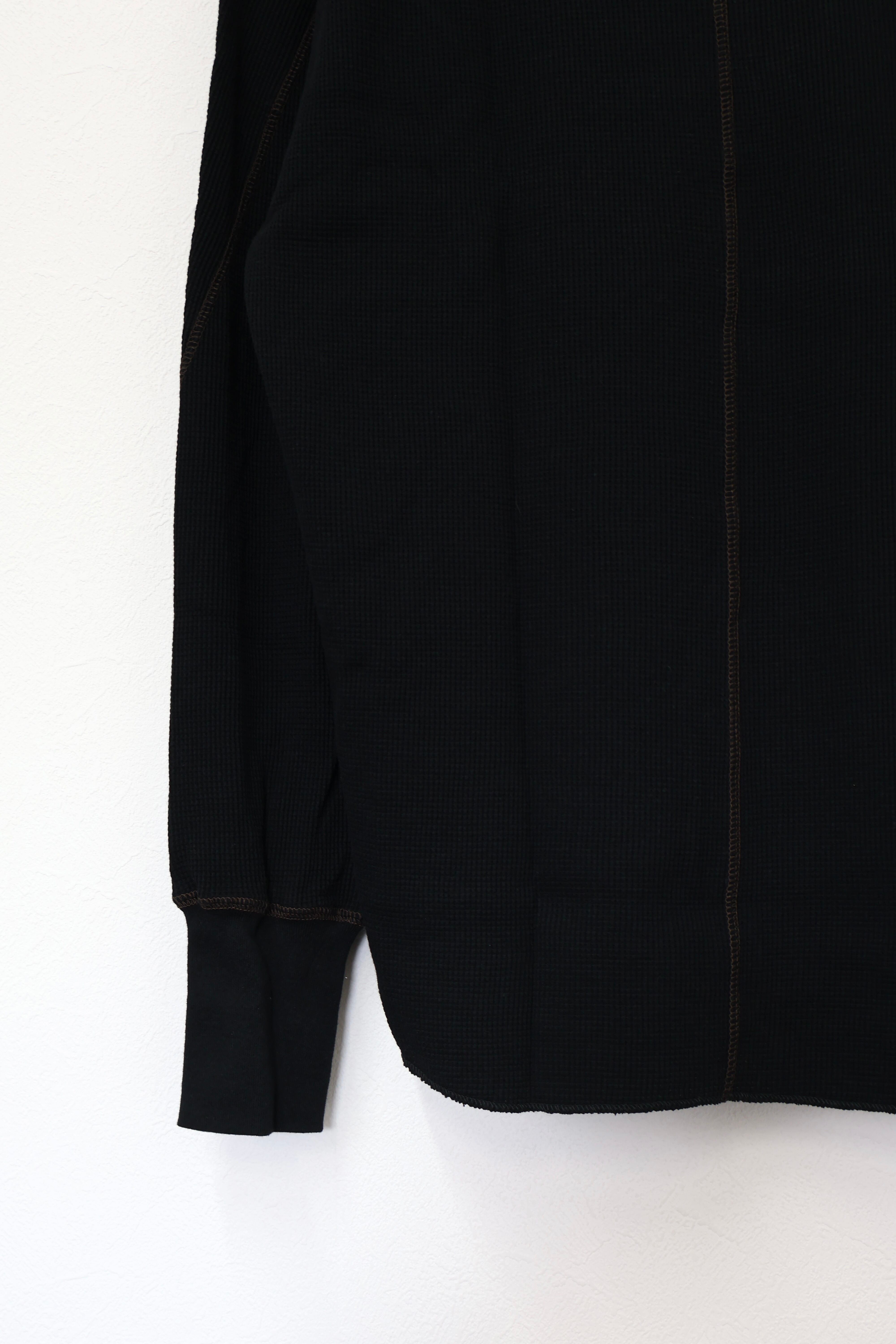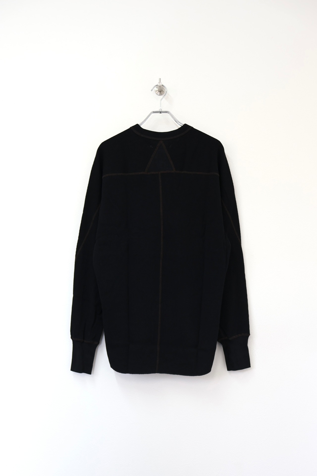 ロングスリーブクルー。スウェーデン軍サーマルの構造を参考にした変形パターン。着丈長めのリラックスフィット。裾ラウンド、袖口にはサムホールを配置。配色ステッチがデザインポイント。