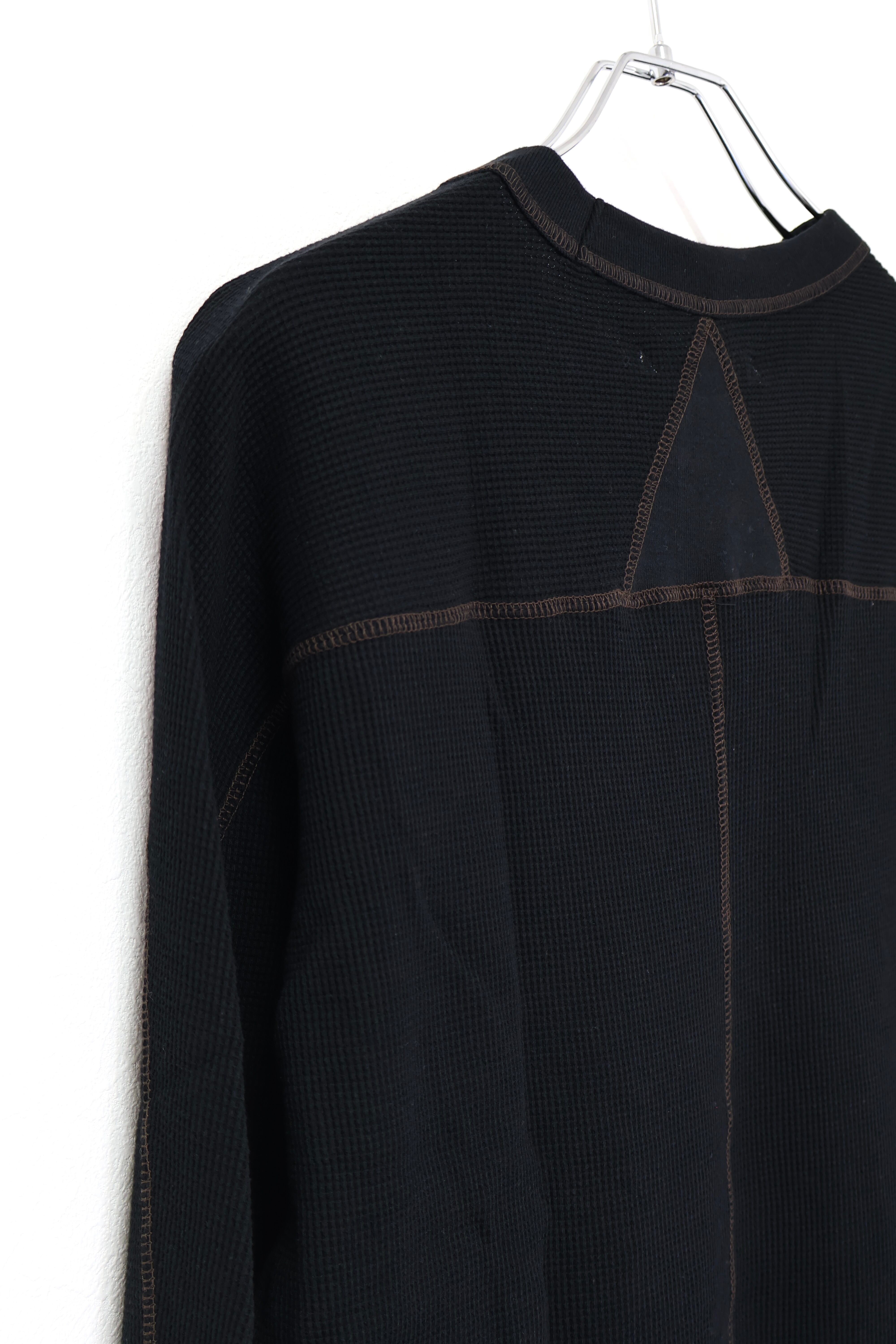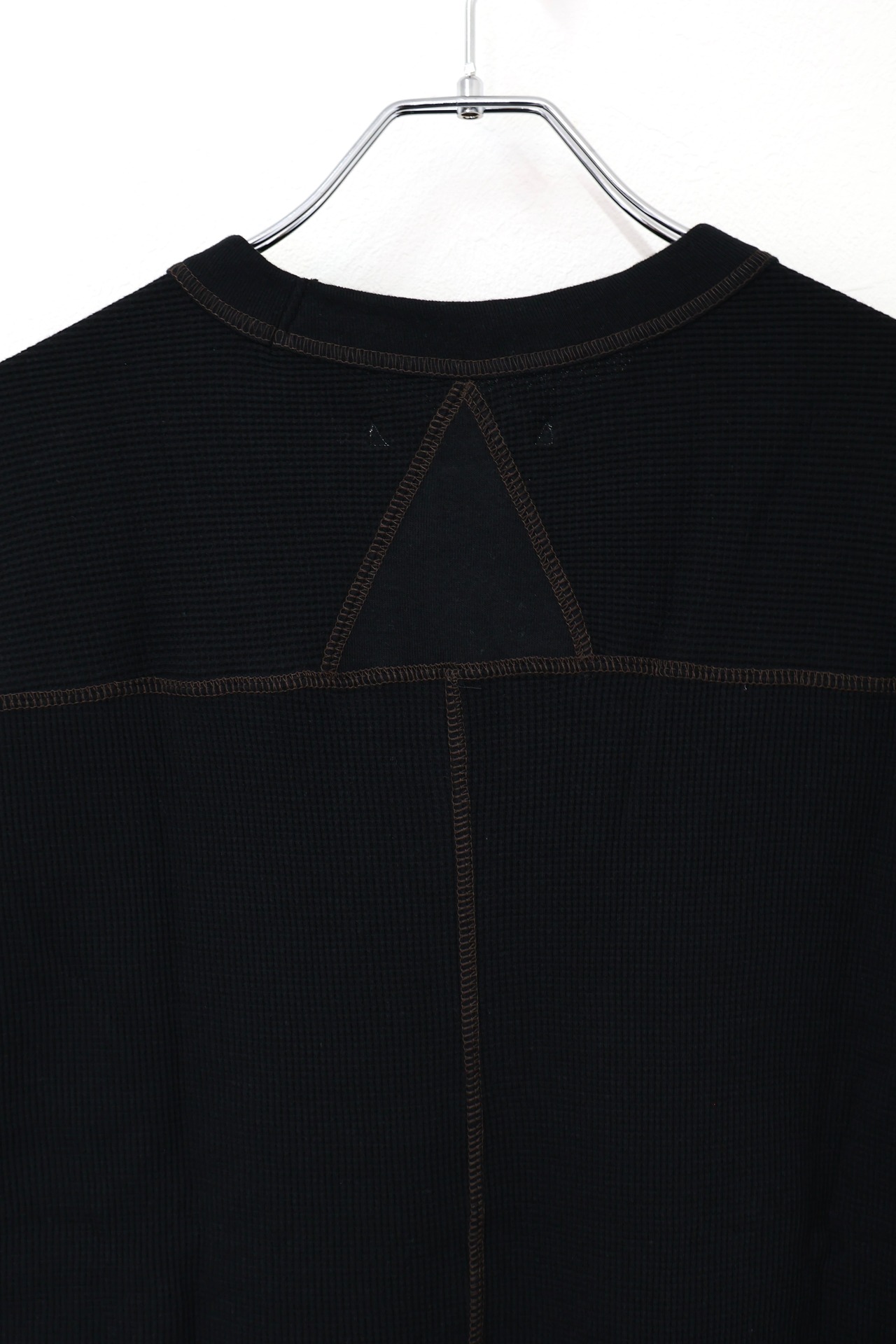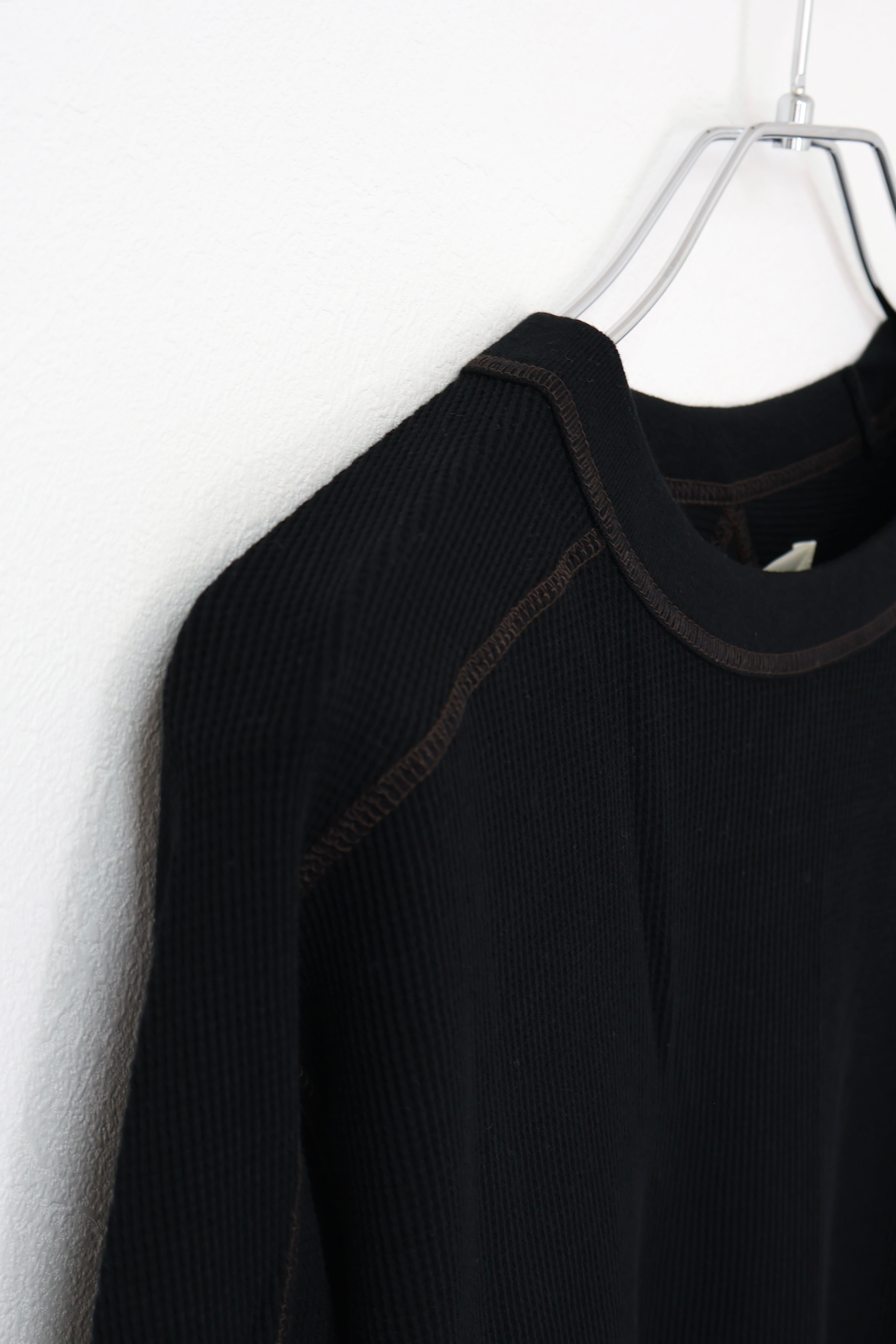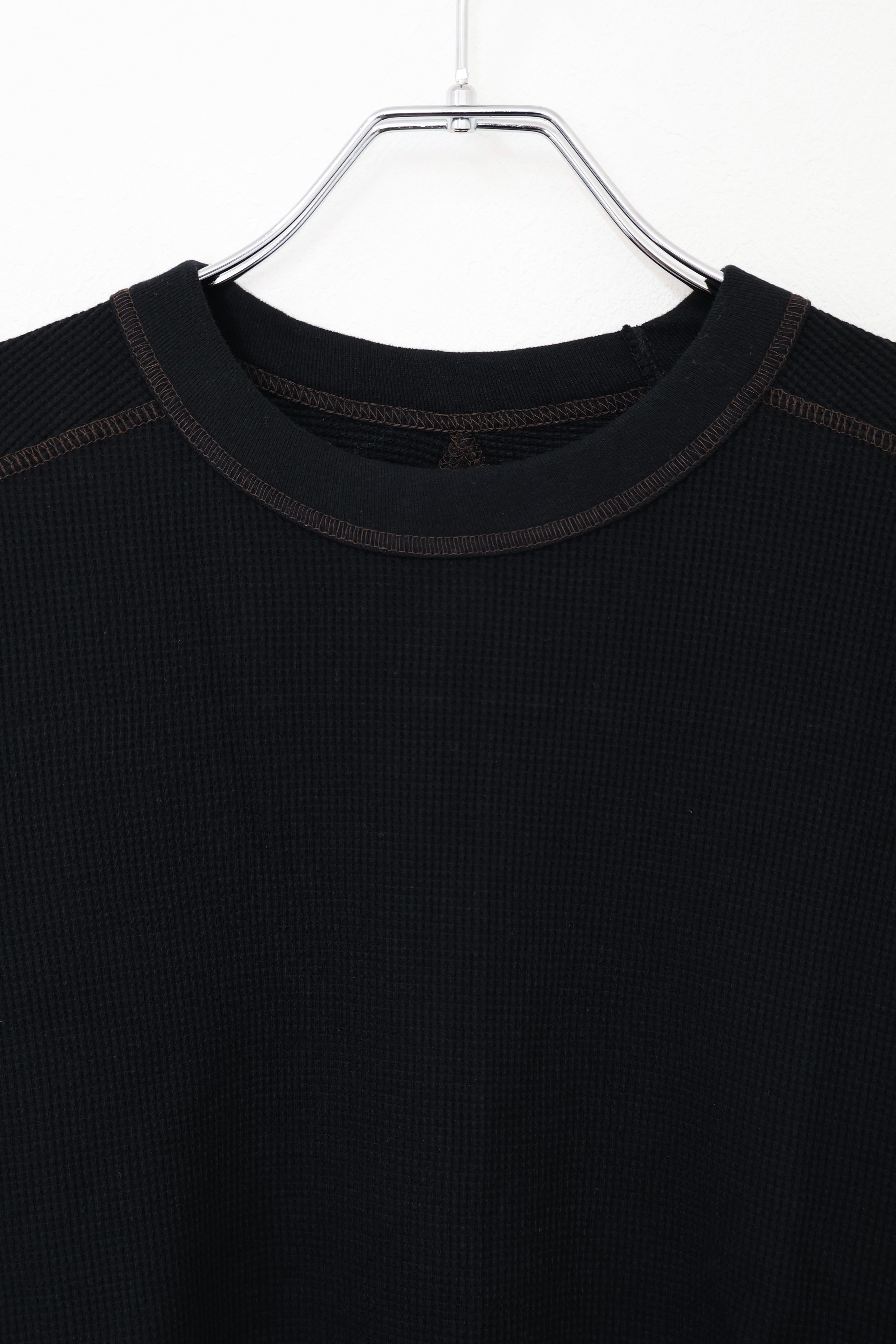 ロングスリーブクルー。スウェーデン軍サーマルの構造を参考にした変形パターン。着丈長めのリラックスフィット。裾ラウンド、袖口にはサムホールを配置。配色ステッチがデザインポイント。