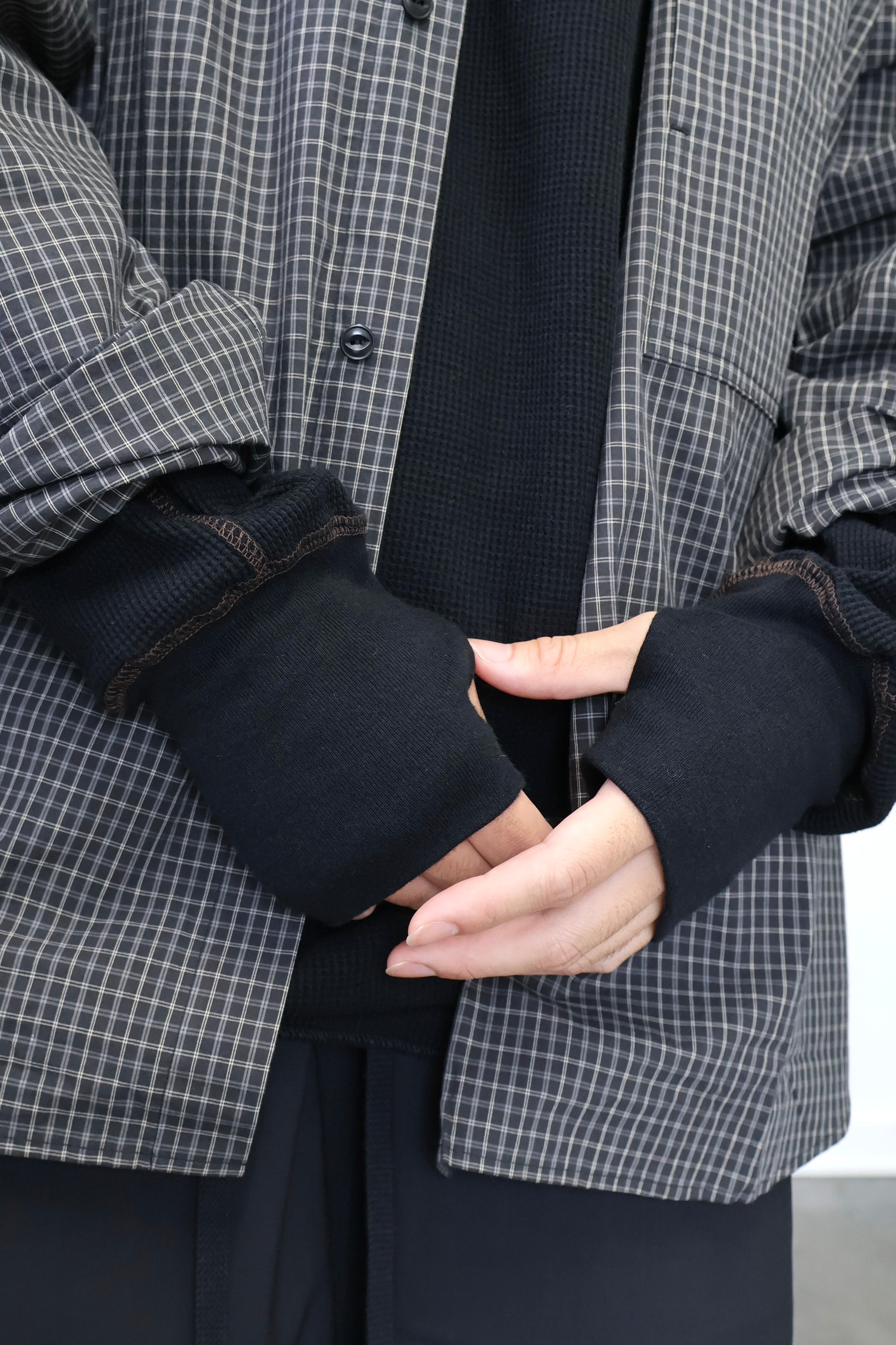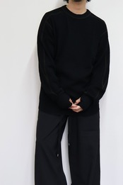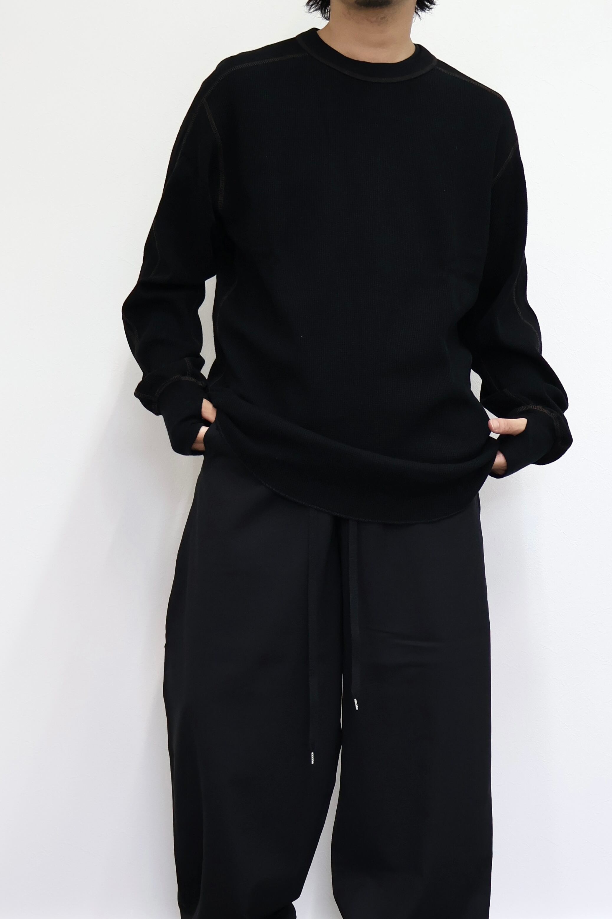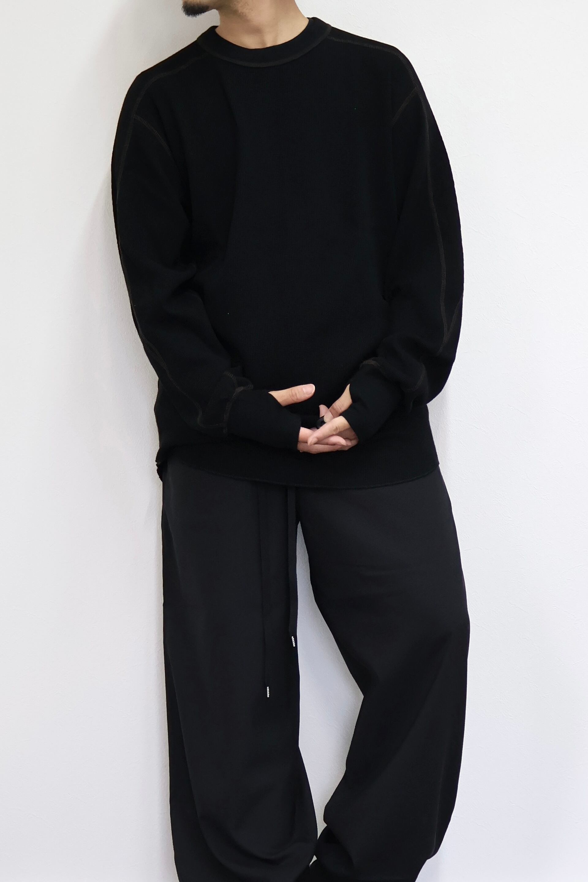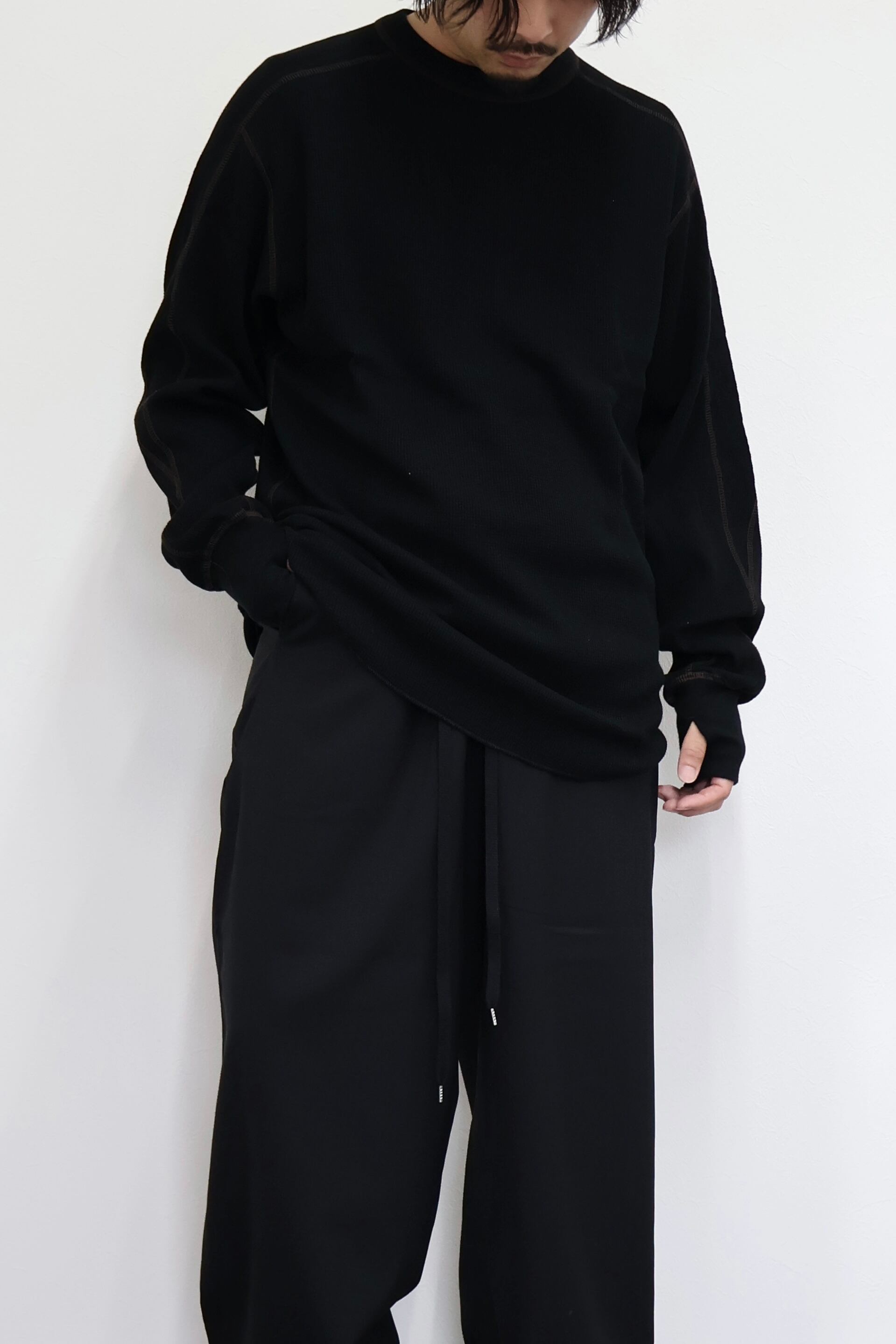 ロングスリーブクルー。スウェーデン軍サーマルの構造を参考にした変形パターン。着丈長めのリラックスフィット。裾ラウンド、袖口にはサムホールを配置。配色ステッチがデザインポイント。