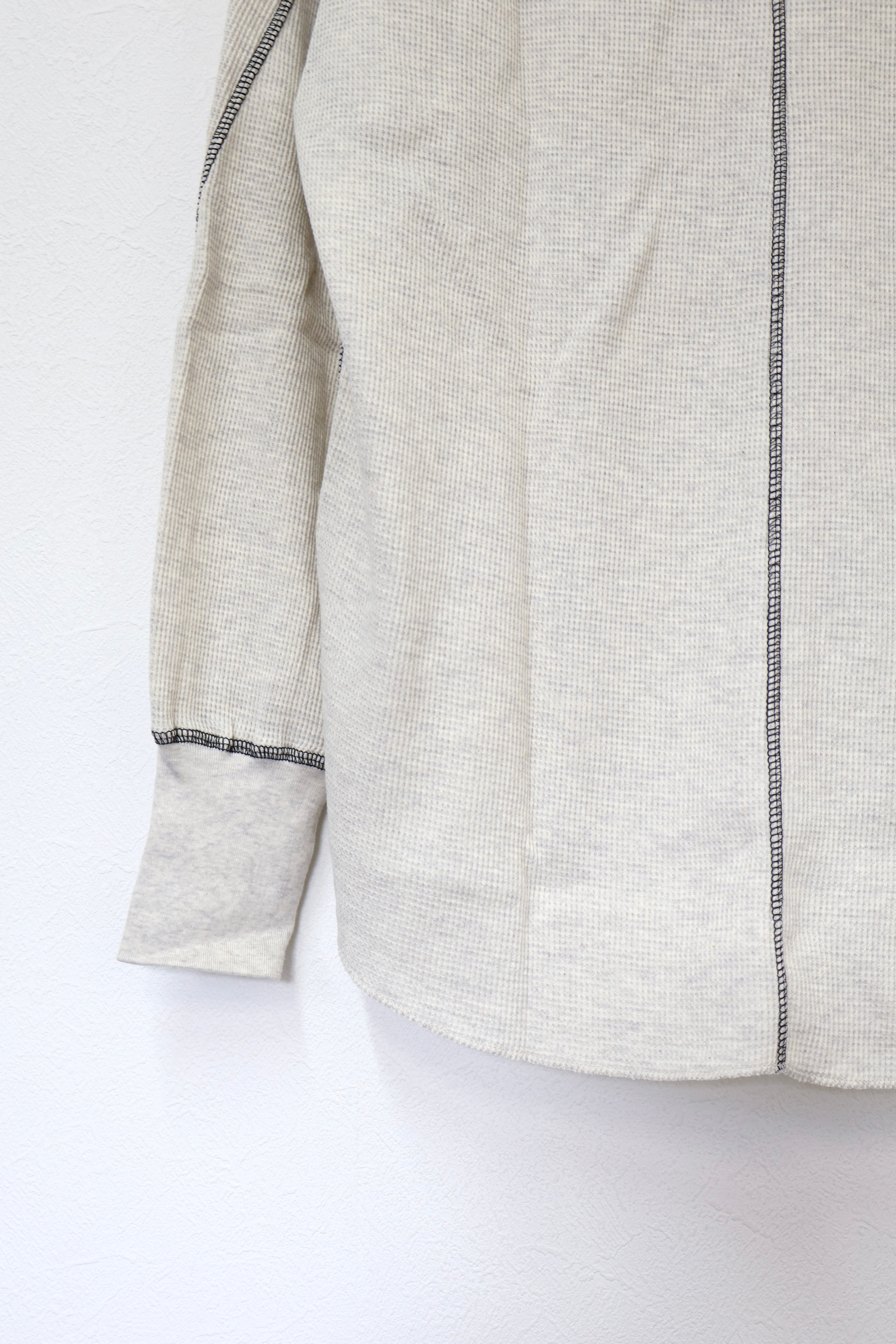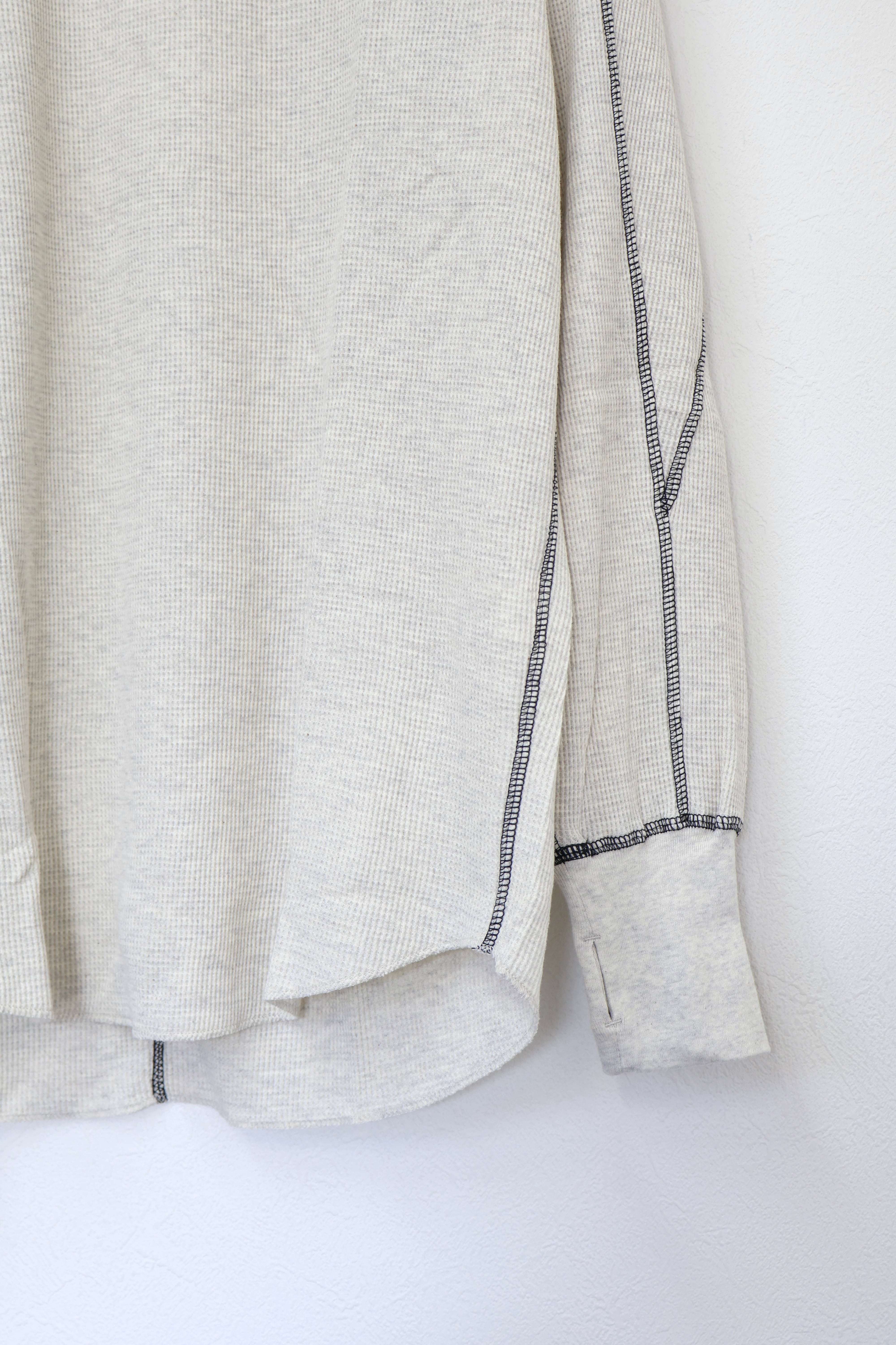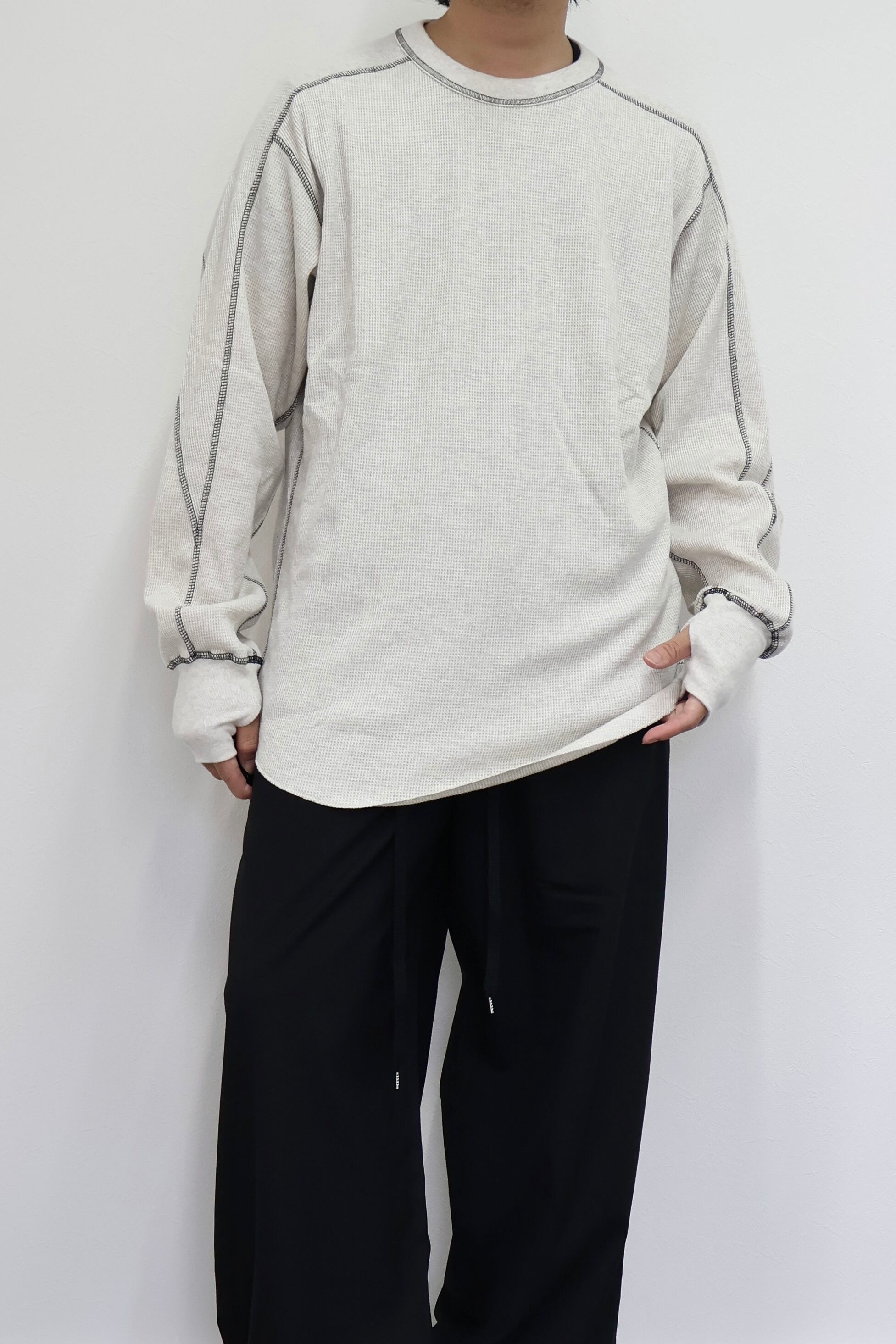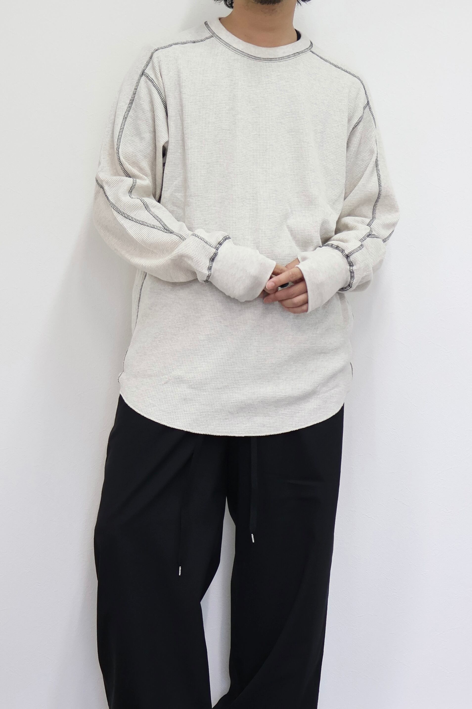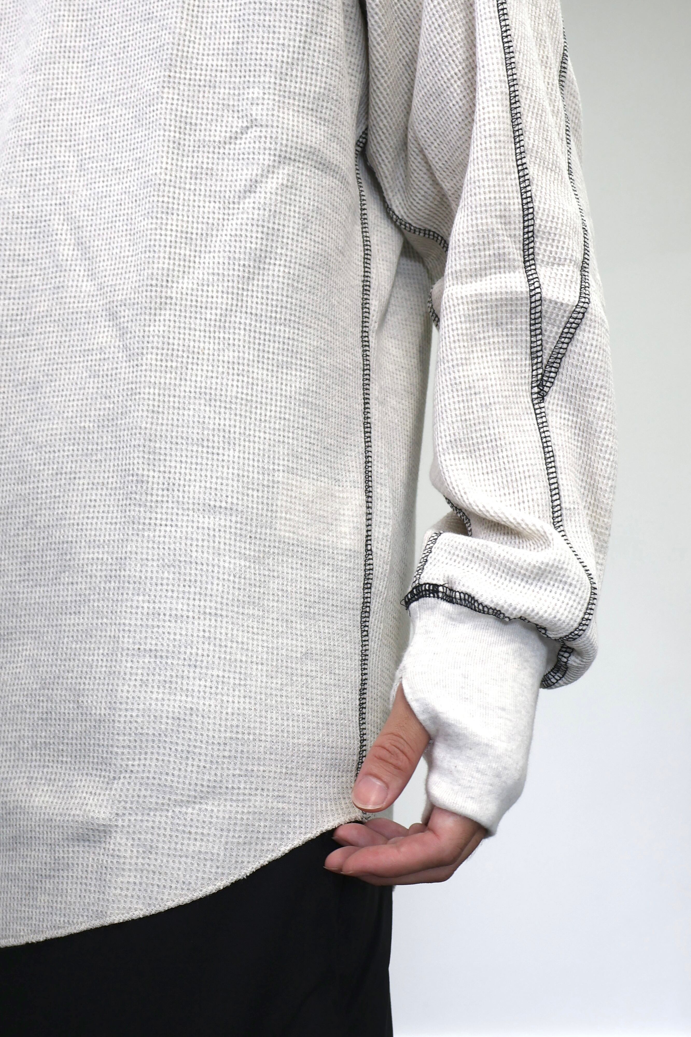 ロングスリーブクルー。スウェーデン軍サーマルの構造を参考にした変形パターン。着丈長めのリラックスフィット。裾ラウンド、袖口にはサムホールを配置。配色ステッチがデザインポイント。