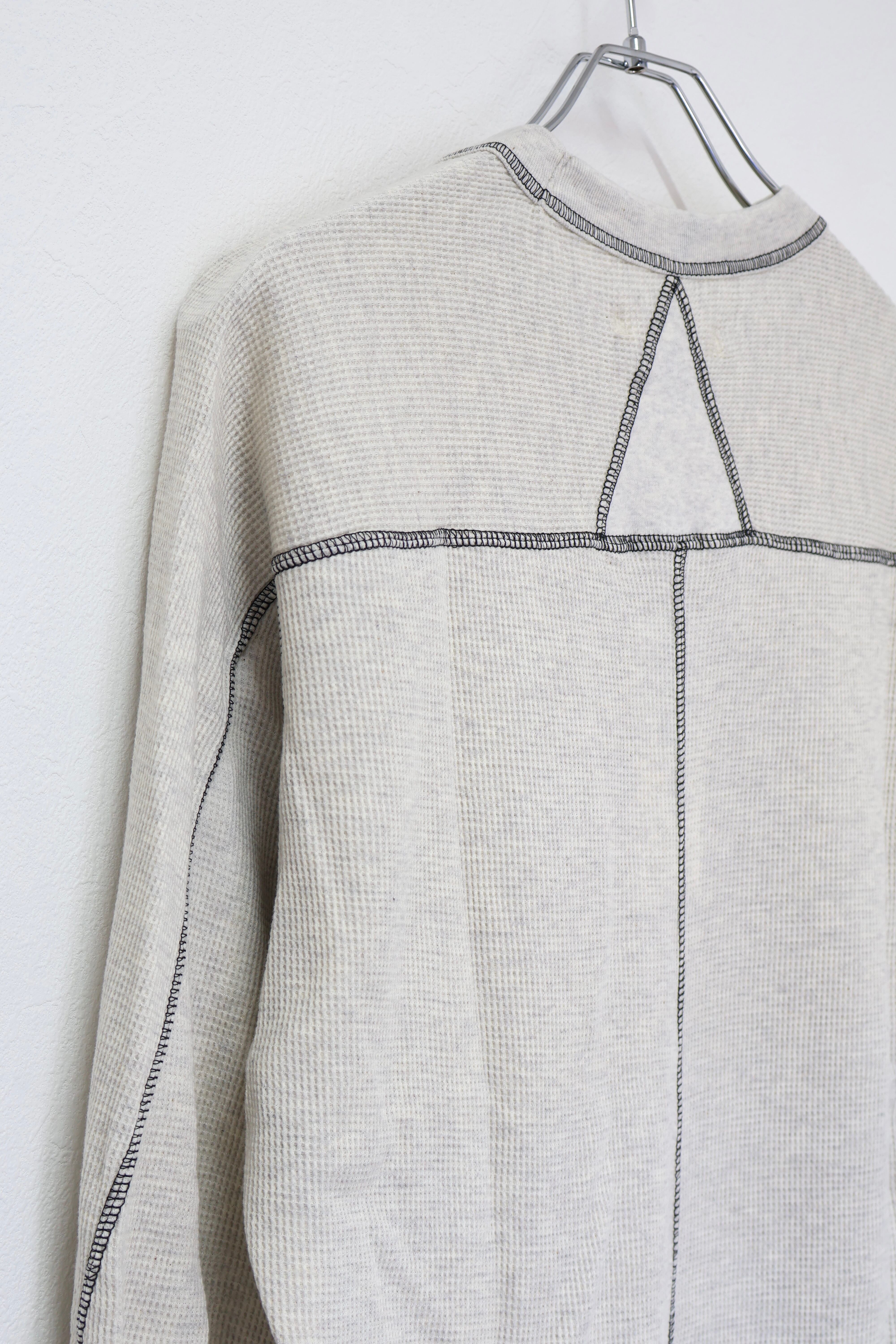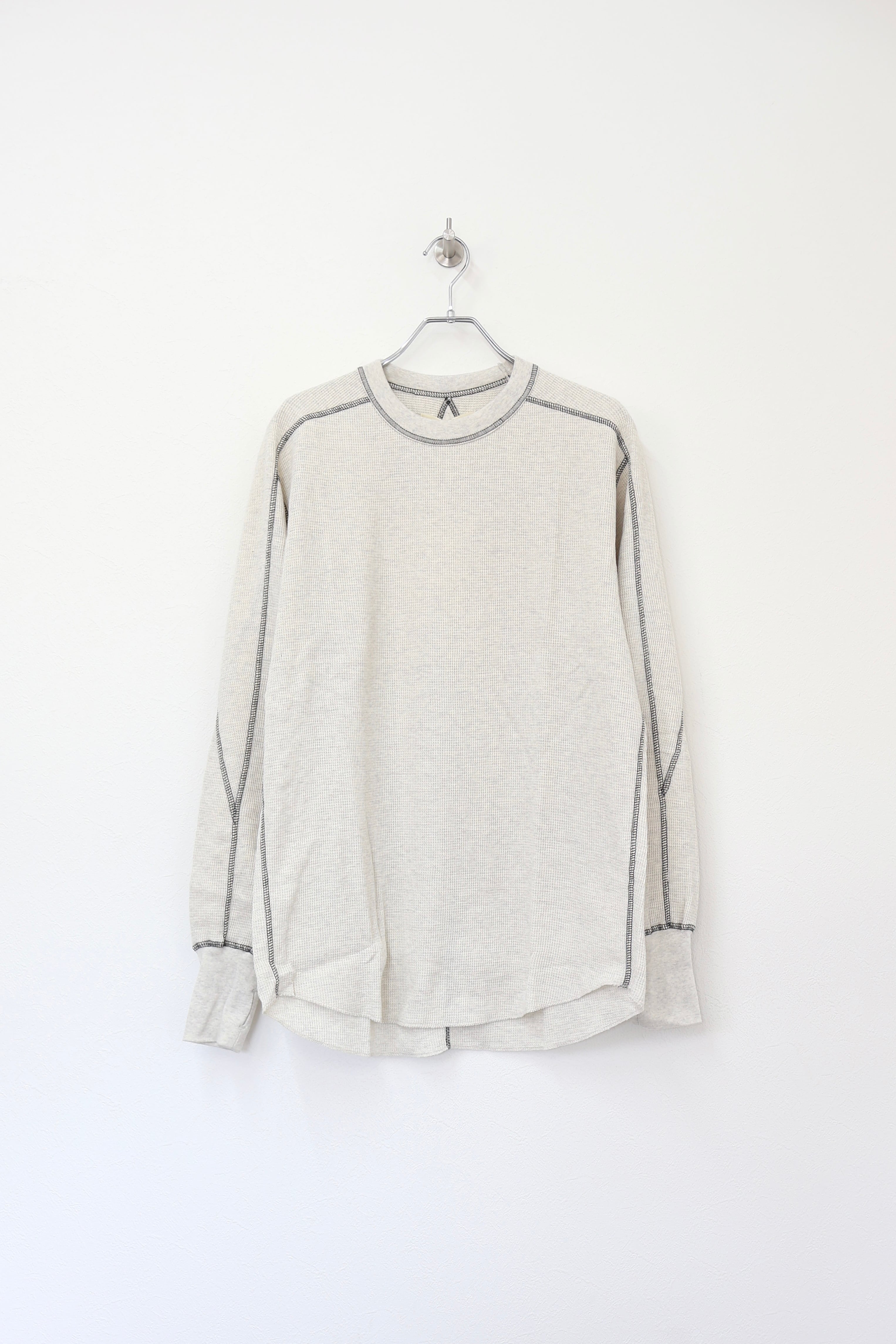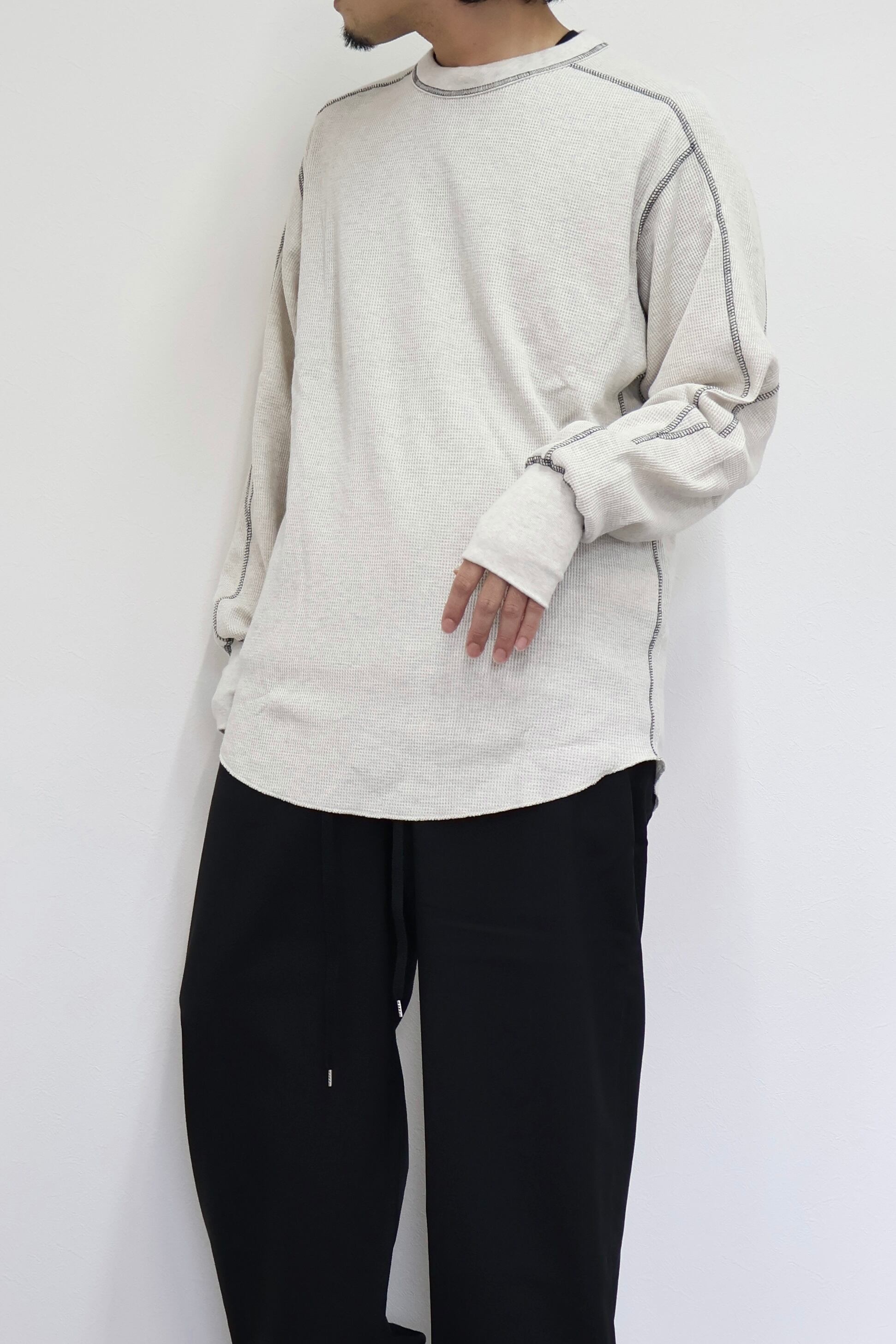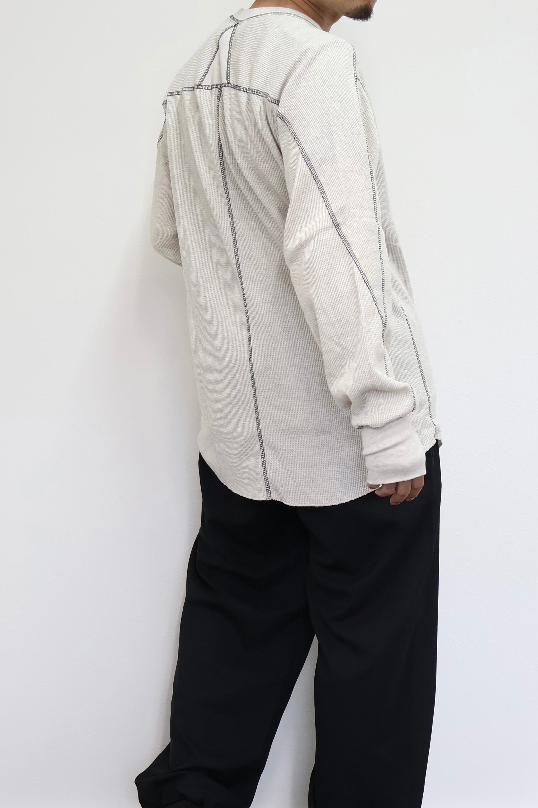 ロングスリーブクルー。スウェーデン軍サーマルの構造を参考にした変形パターン。着丈長めのリラックスフィット。裾ラウンド、袖口にはサムホールを配置。配色ステッチがデザインポイント。