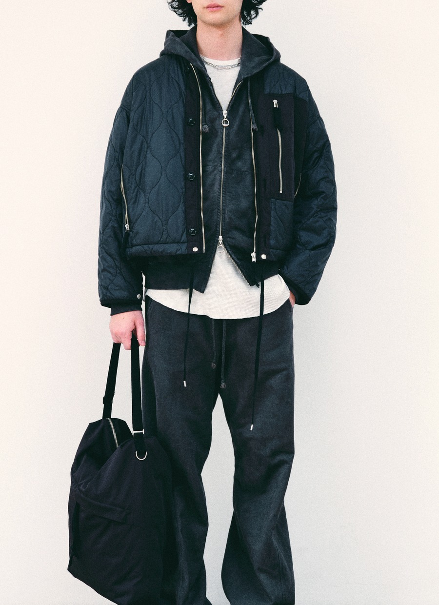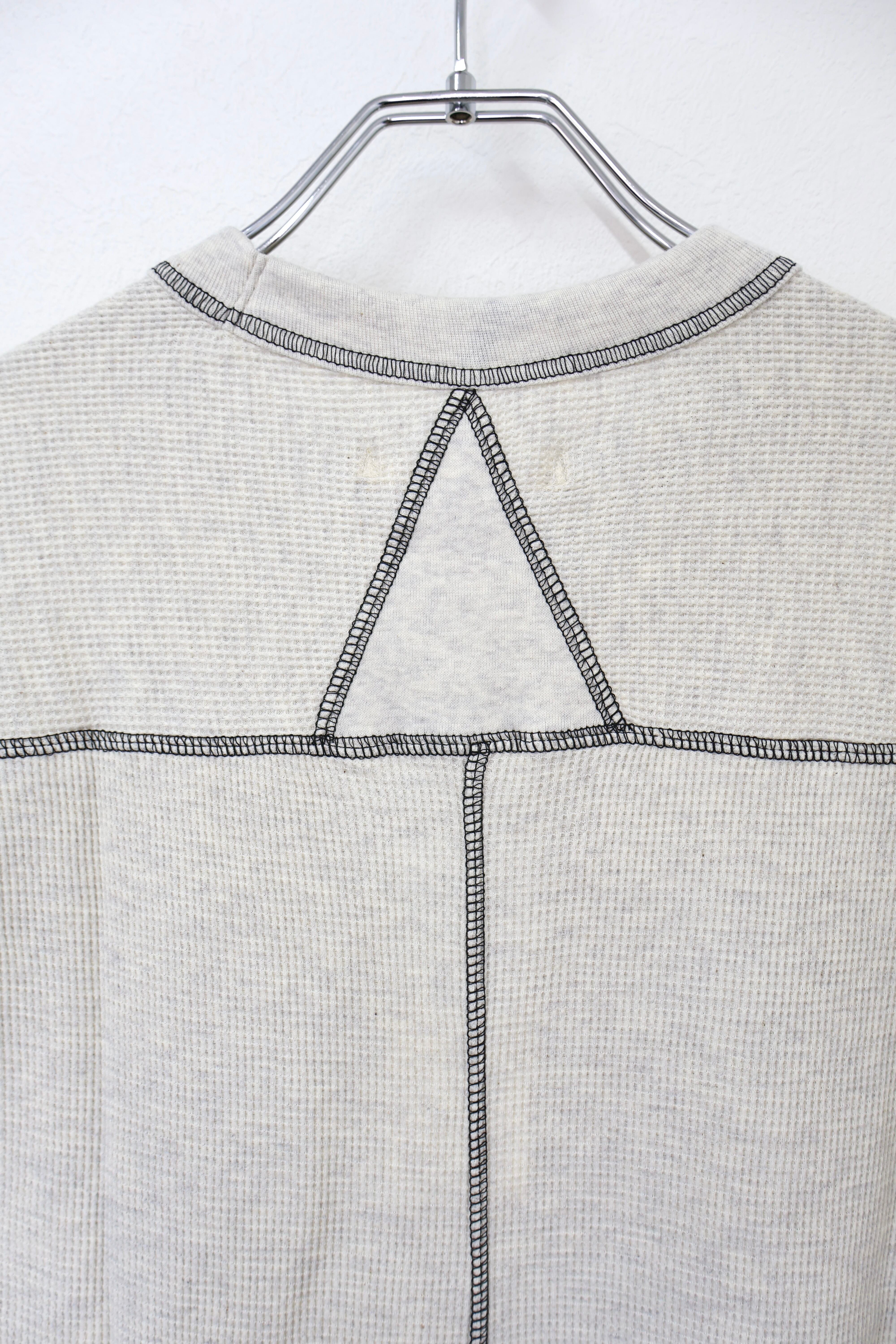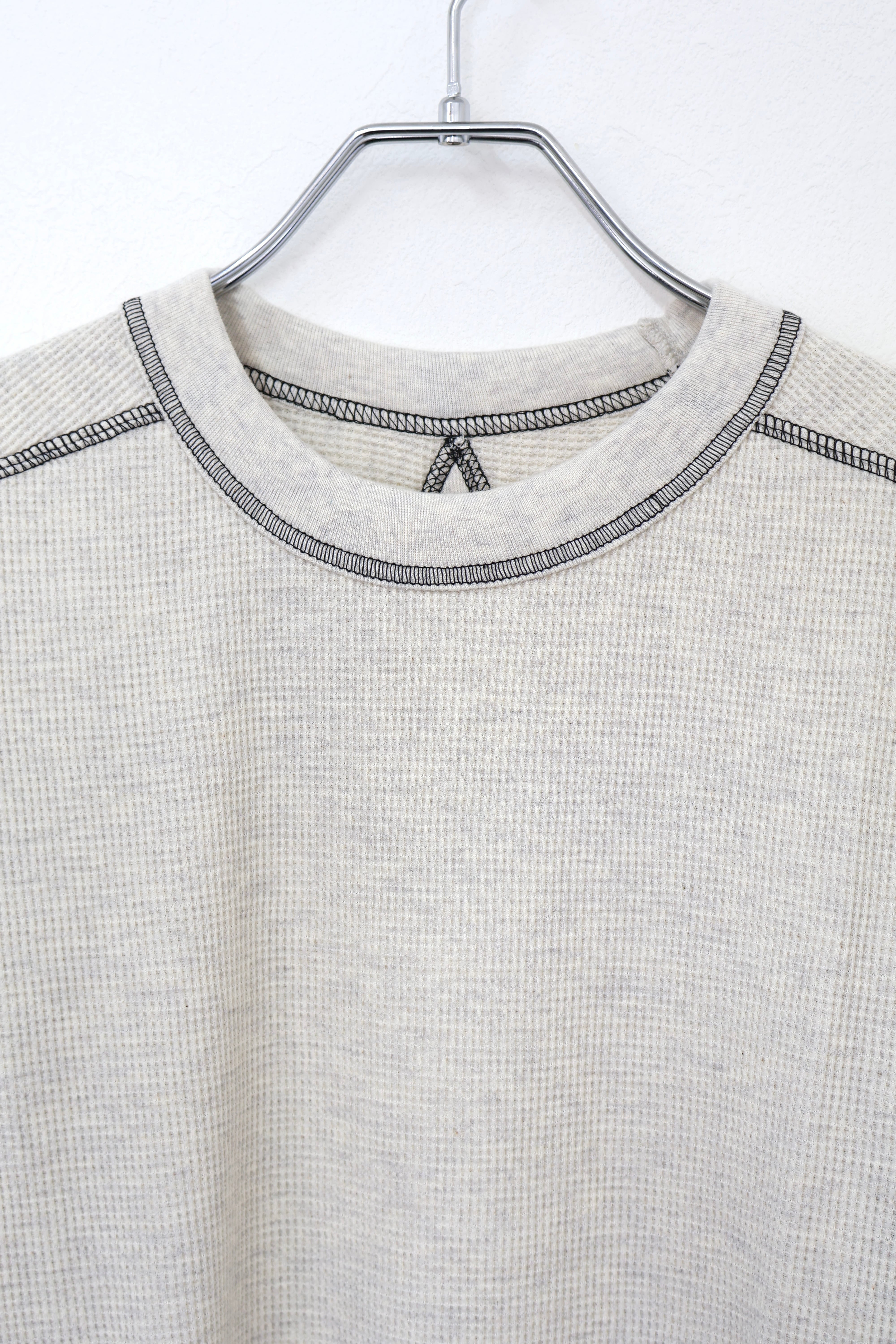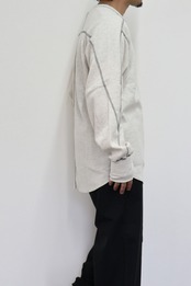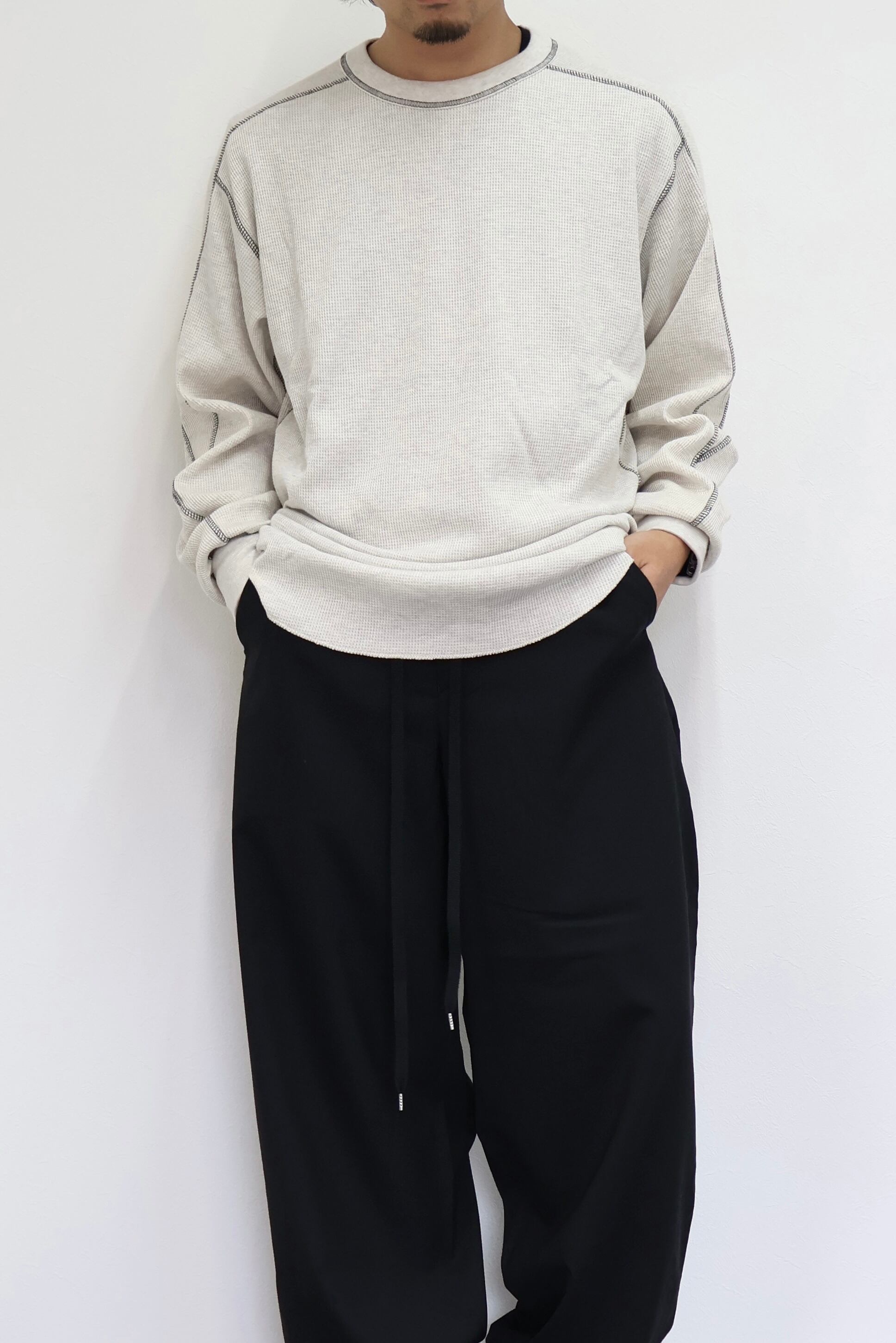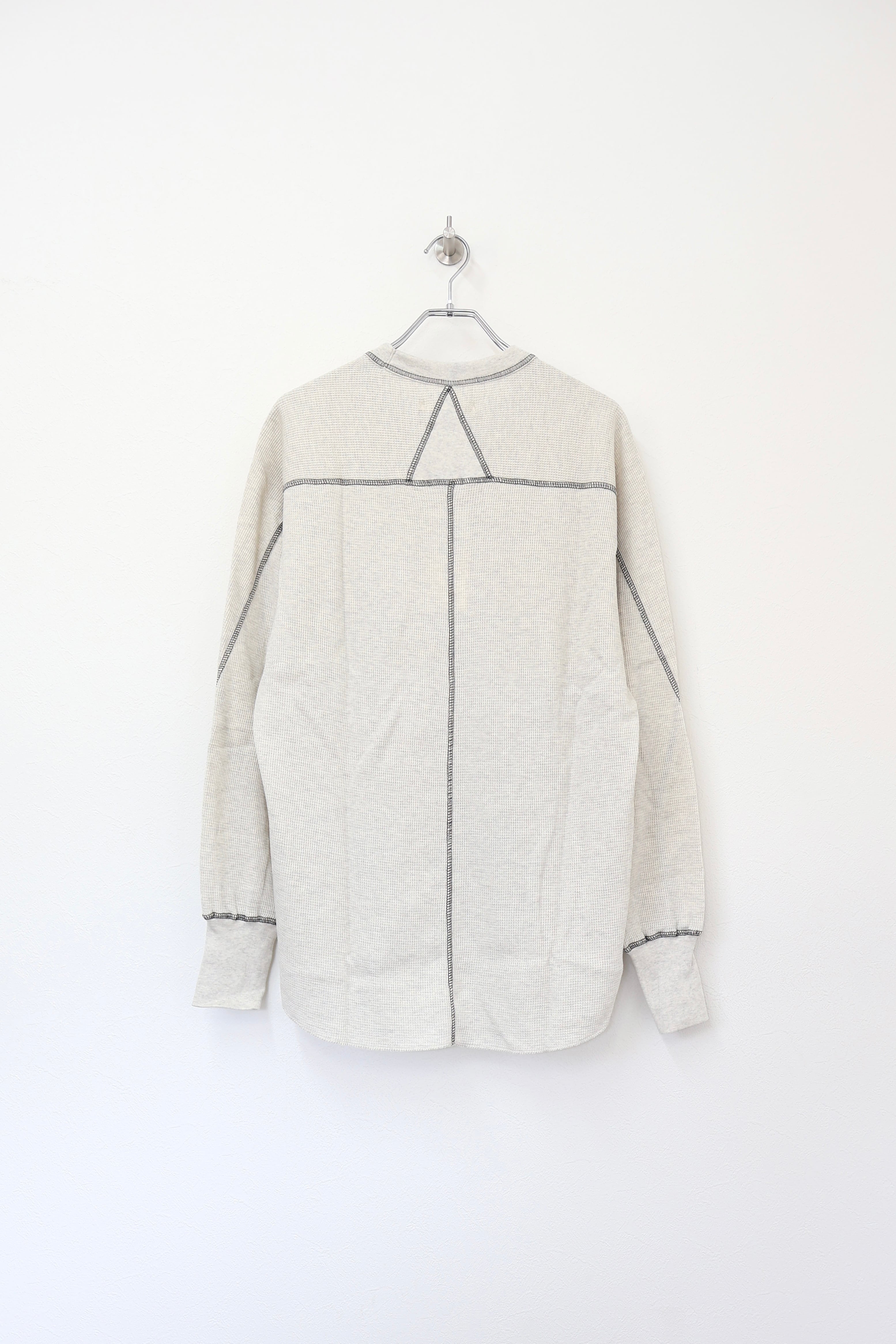 ロングスリーブクルー。スウェーデン軍サーマルの構造を参考にした変形パターン。着丈長めのリラックスフィット。裾ラウンド、袖口にはサムホールを配置。配色ステッチがデザインポイント。