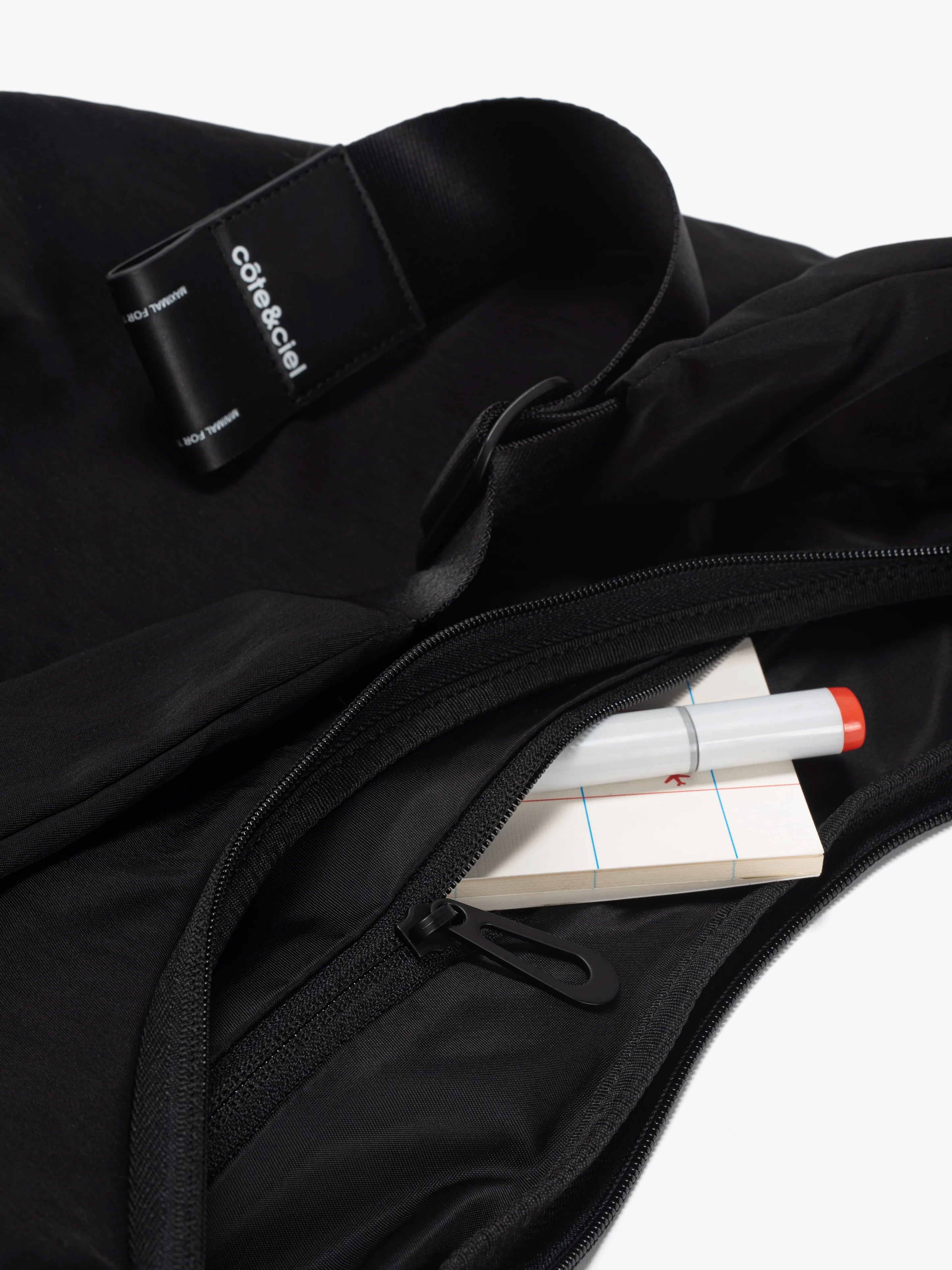 撥水性があり、ソフトな手触りでセミマットな仕上がりのスムースブラックナイロン生地を使用しています。