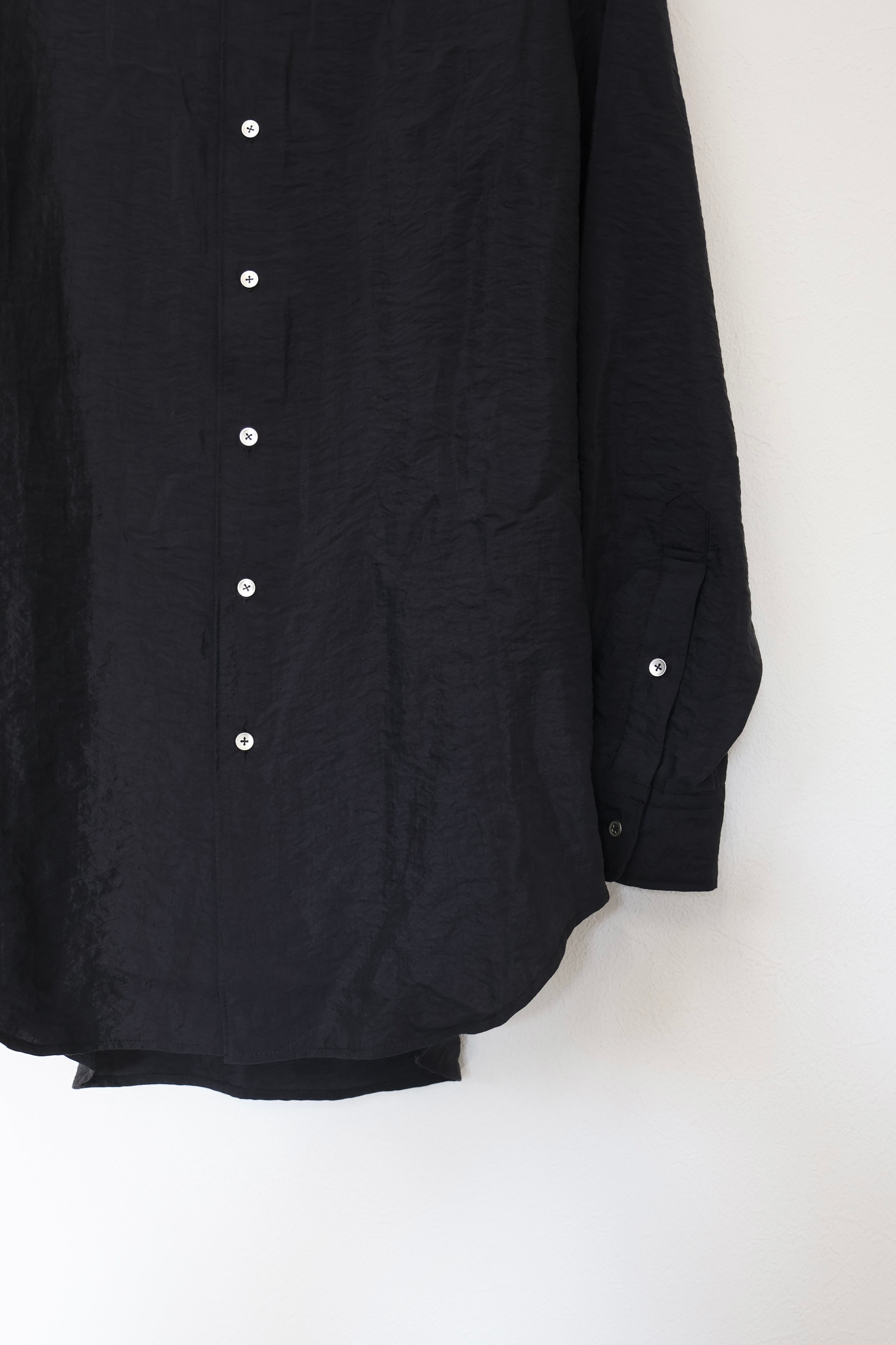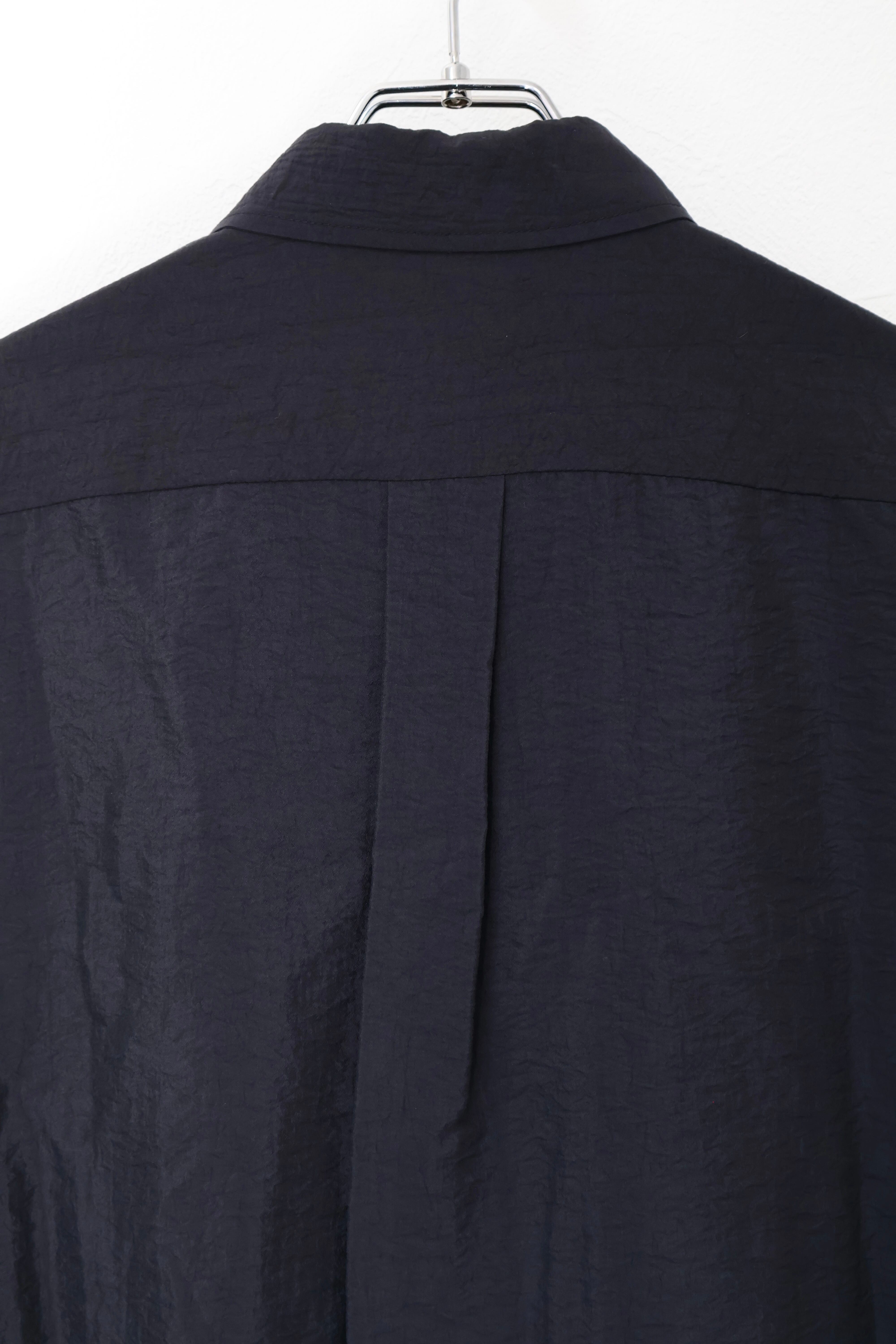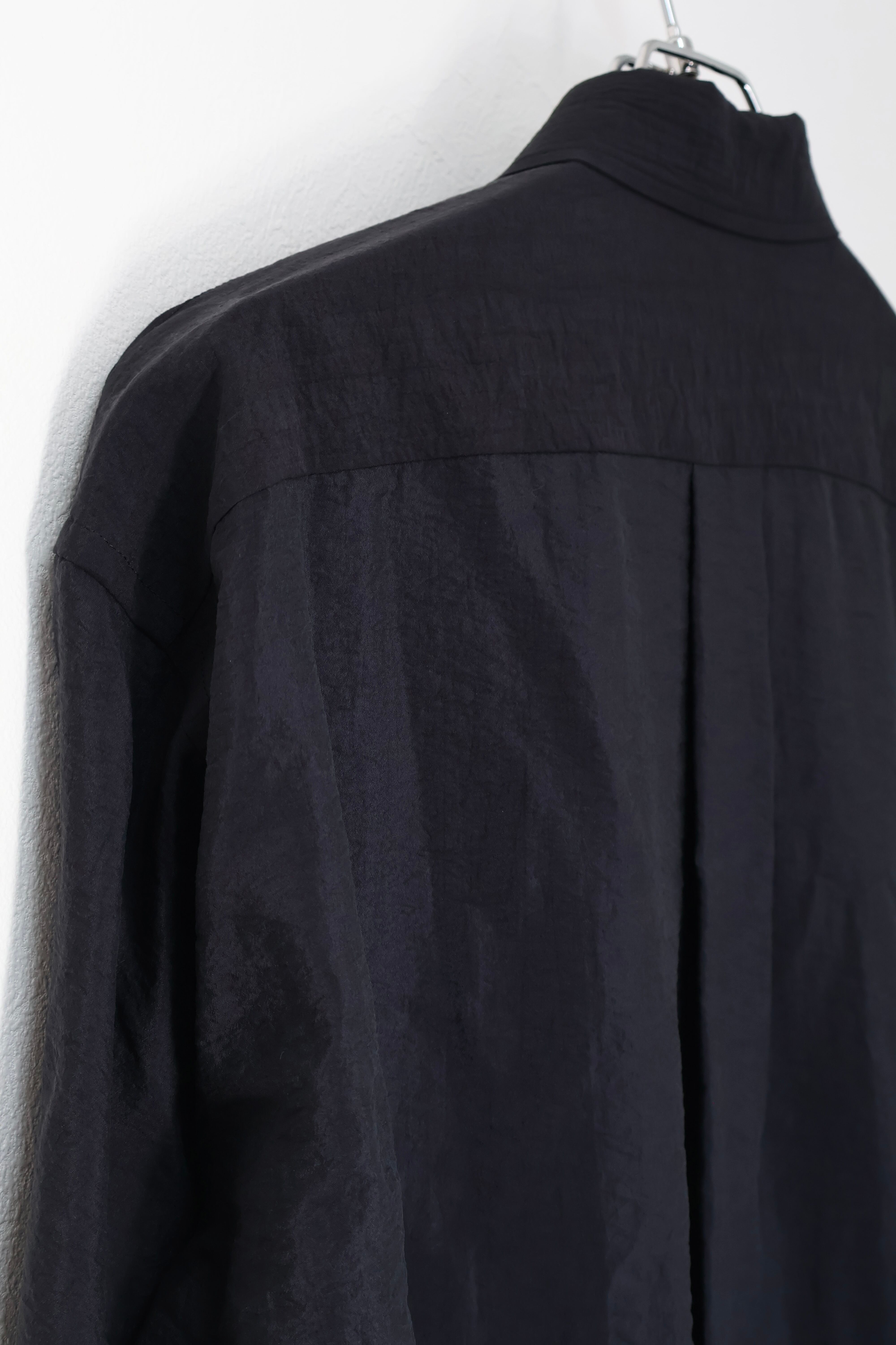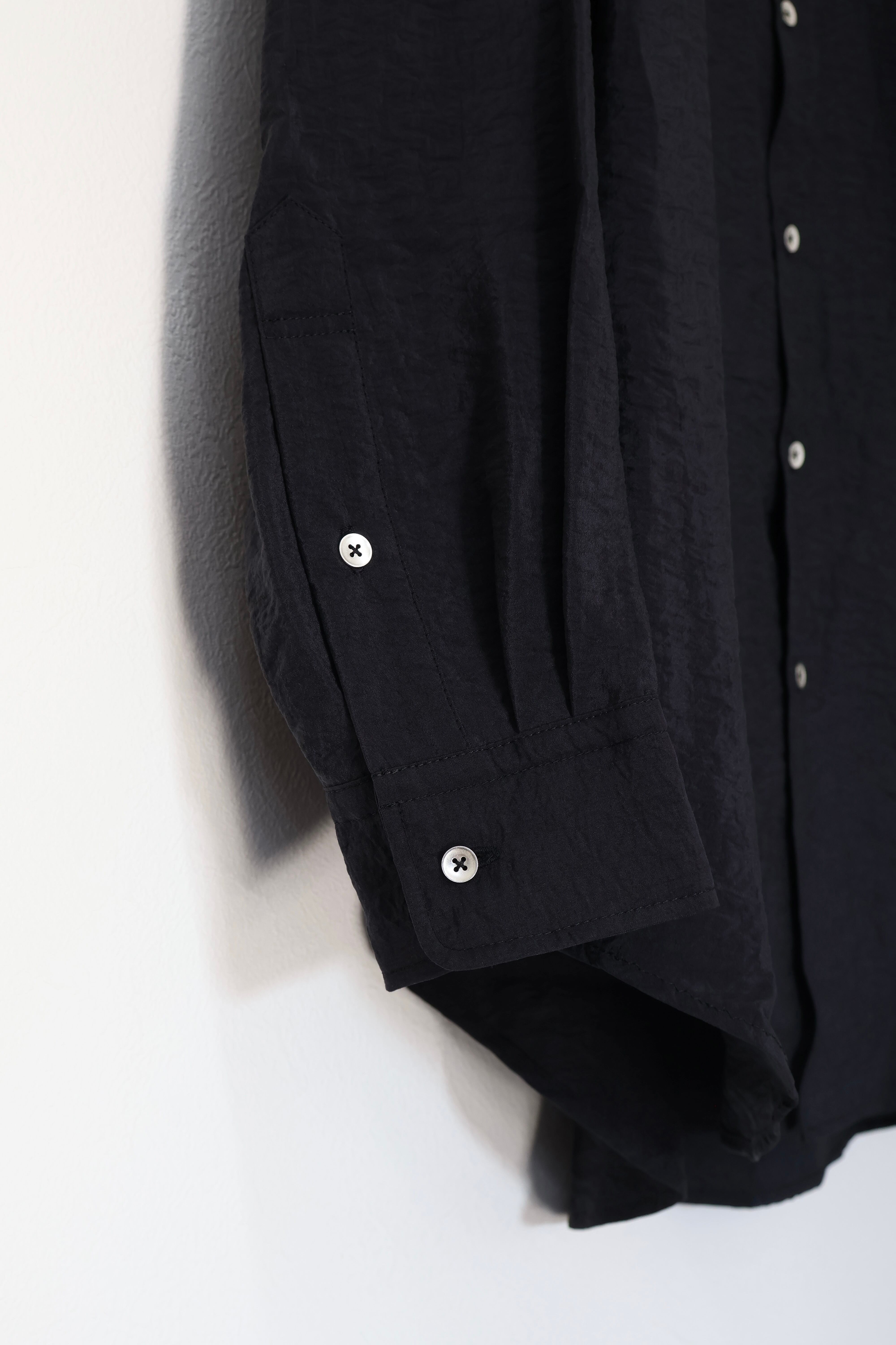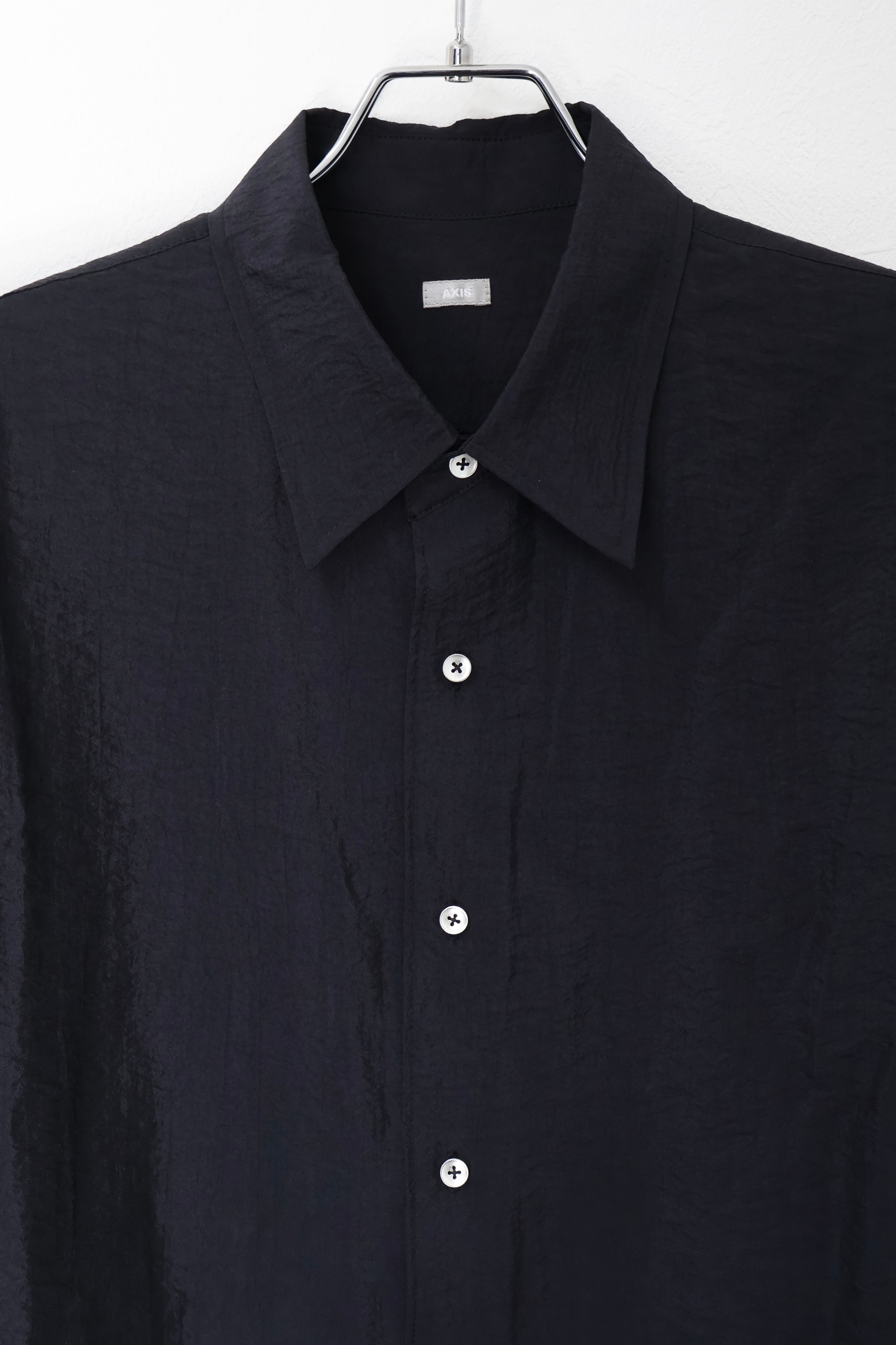 アームホールや身幅にゆとりを持たせたサイズシルエットでありながらわずかにカフス幅を絞りスッキリとした印象に仕上げたAXIS定番のレギュラーカラーシャツ。塩縮加工を施し上質なシルクナイロンのテキスタイルを使用。メタルボタンを合わせています。