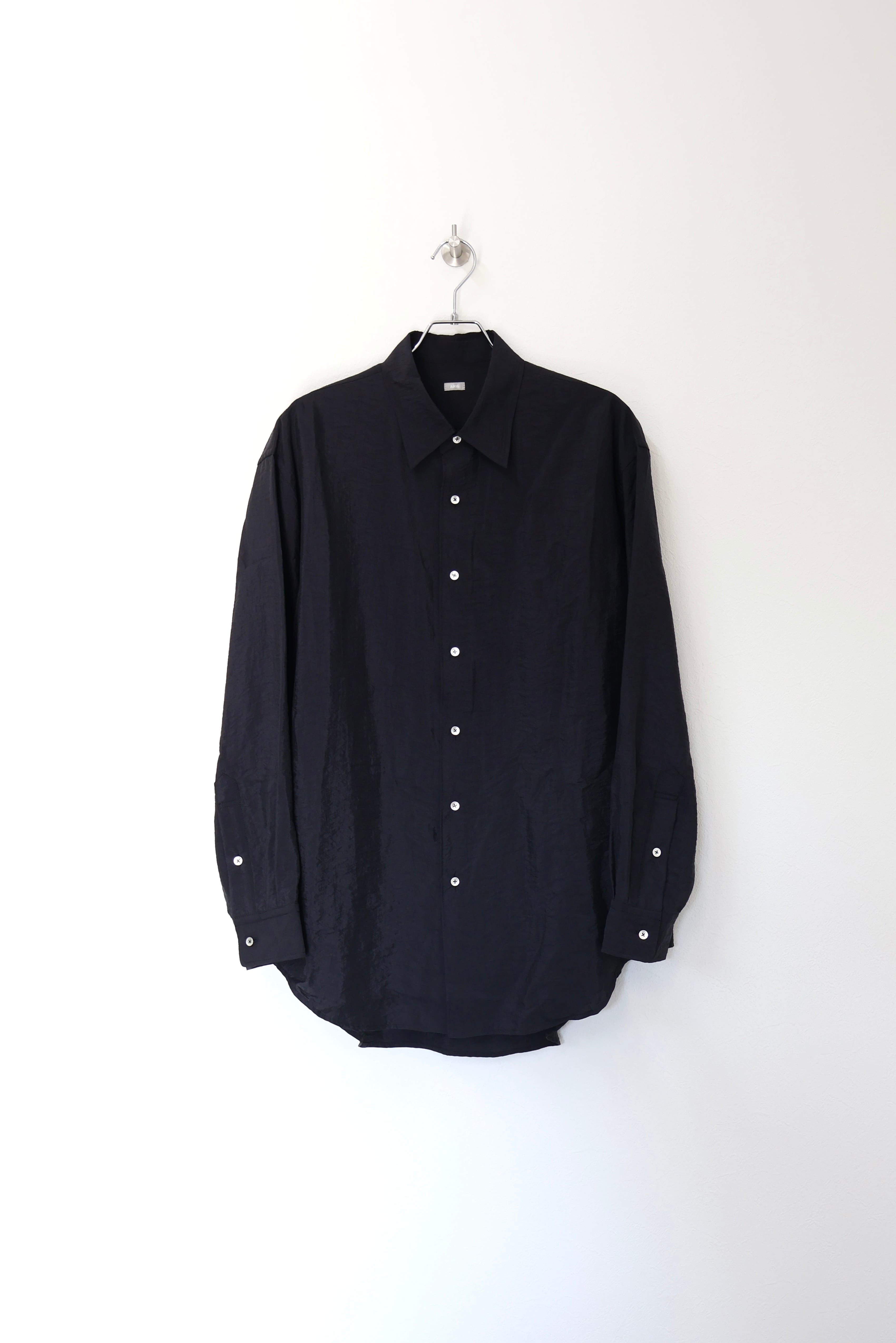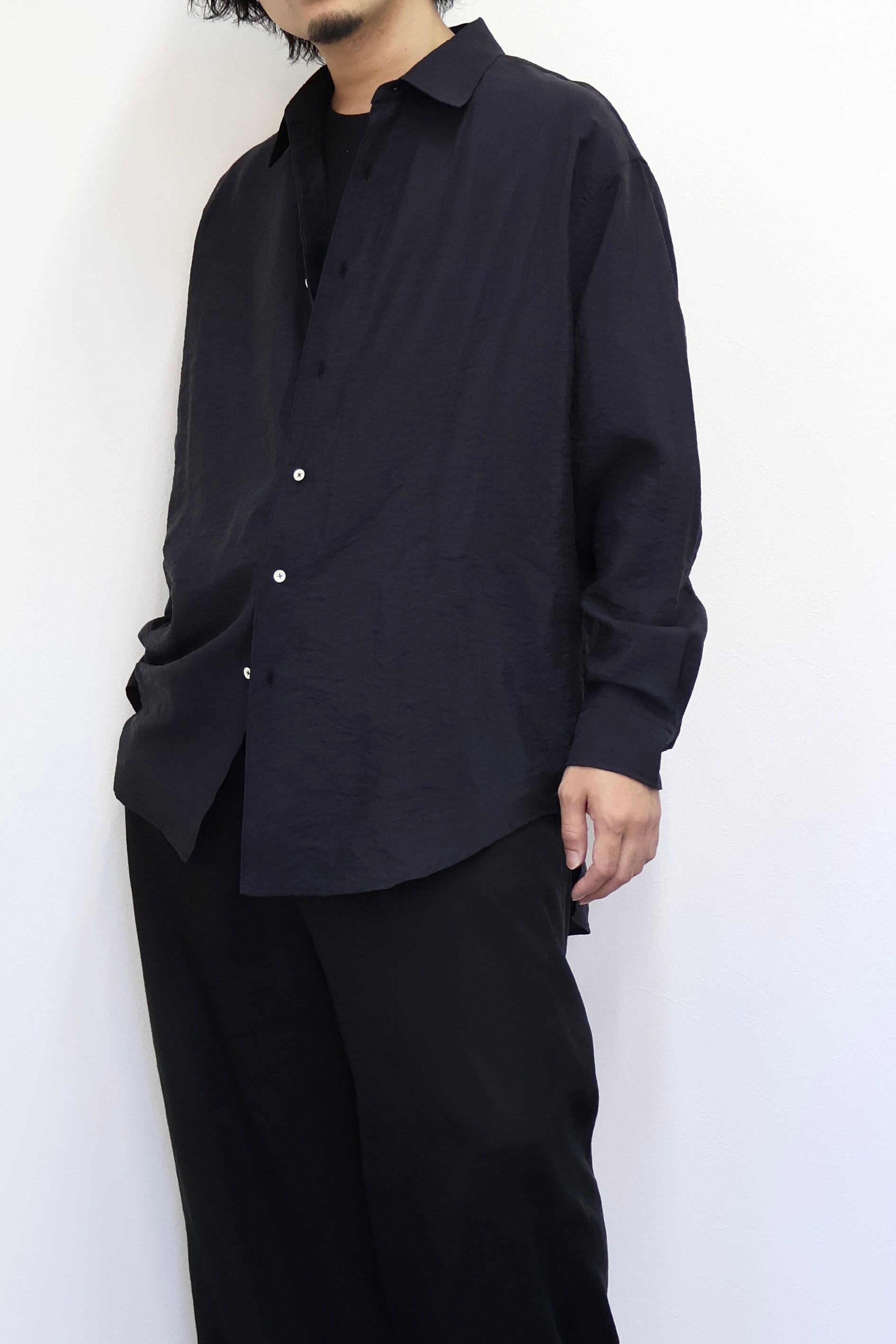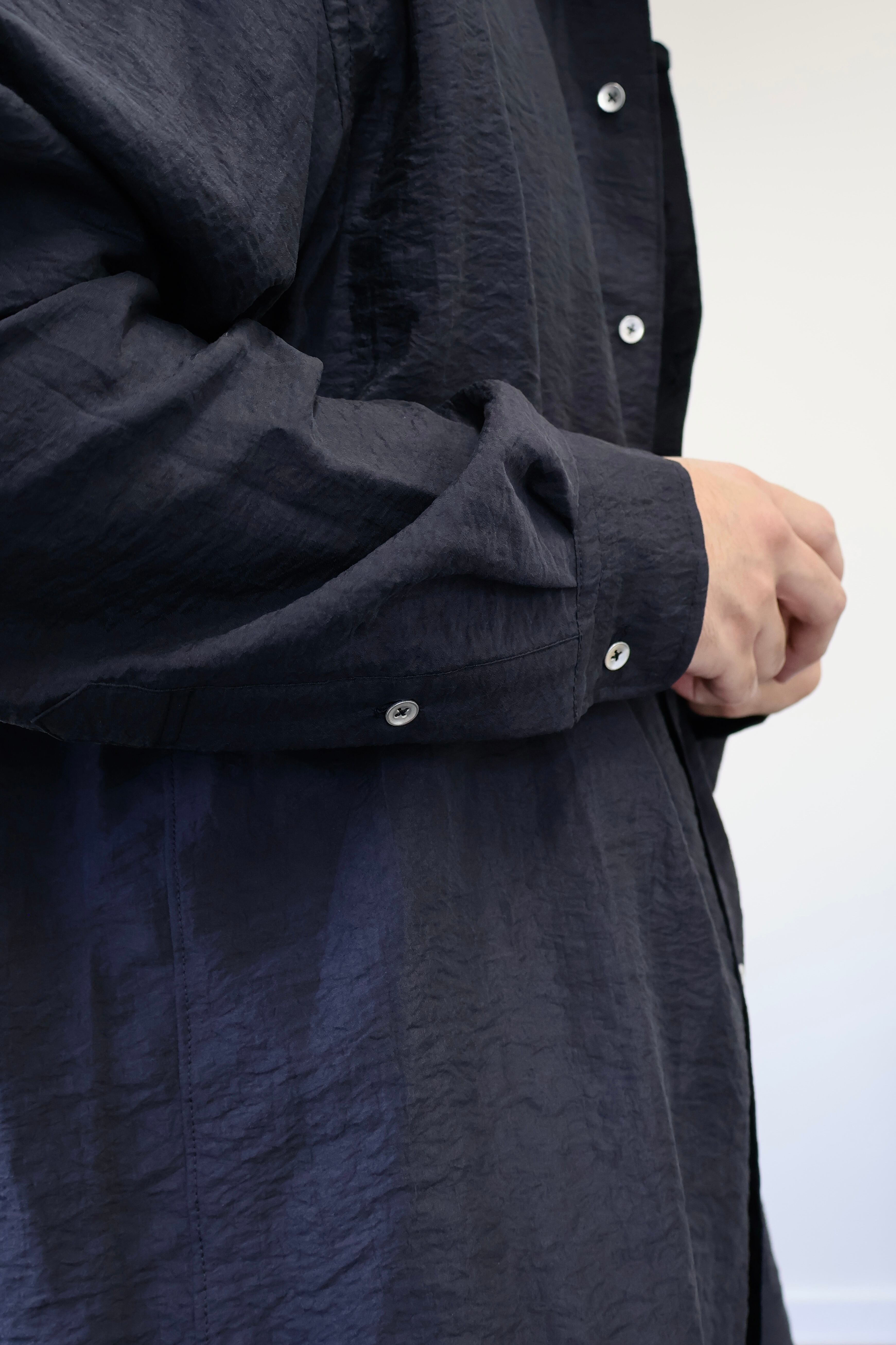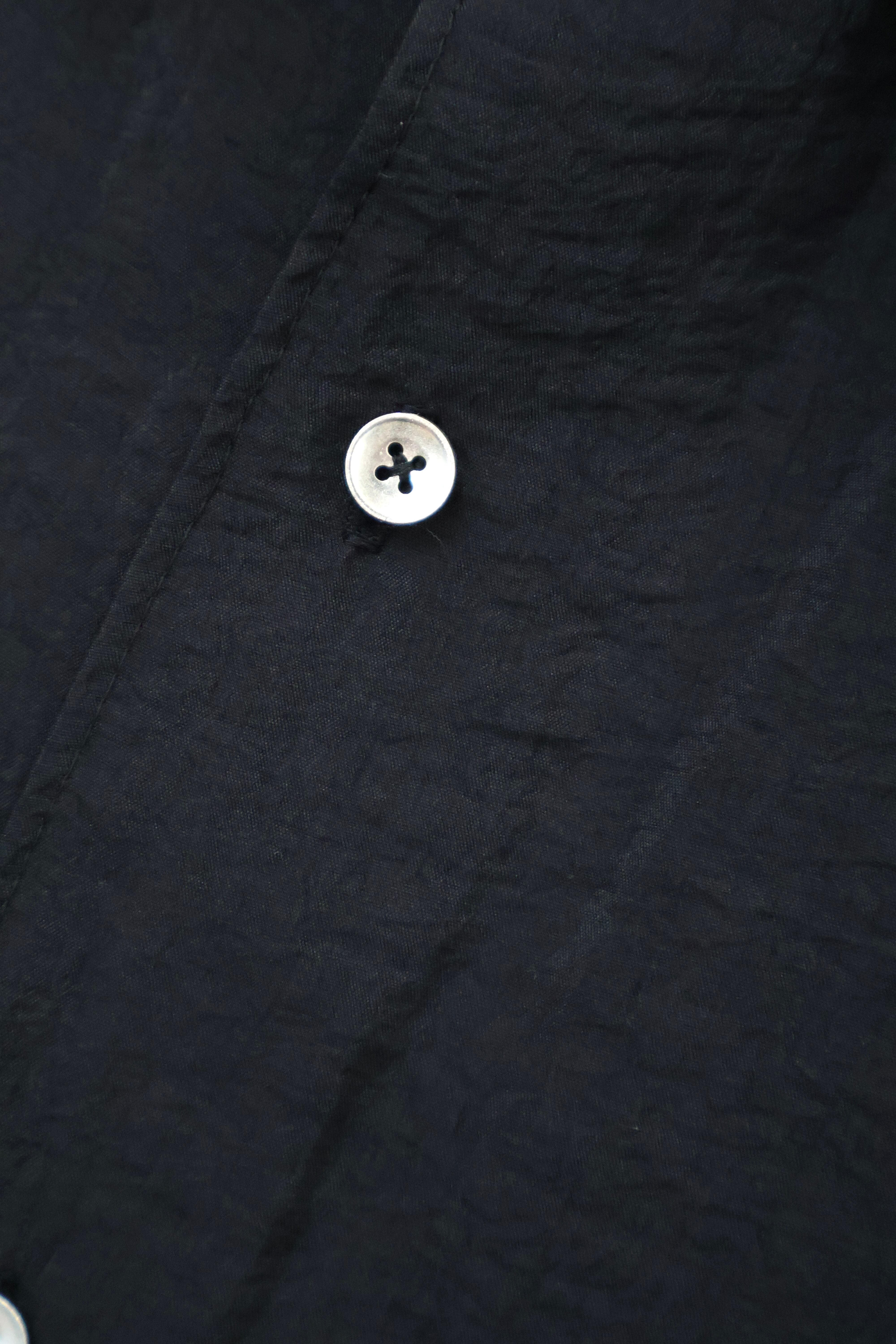 アームホールや身幅にゆとりを持たせたサイズシルエットでありながらわずかにカフス幅を絞りスッキリとした印象に仕上げたAXIS定番のレギュラーカラーシャツ。塩縮加工を施し上質なシルクナイロンのテキスタイルを使用。メタルボタンを合わせています。