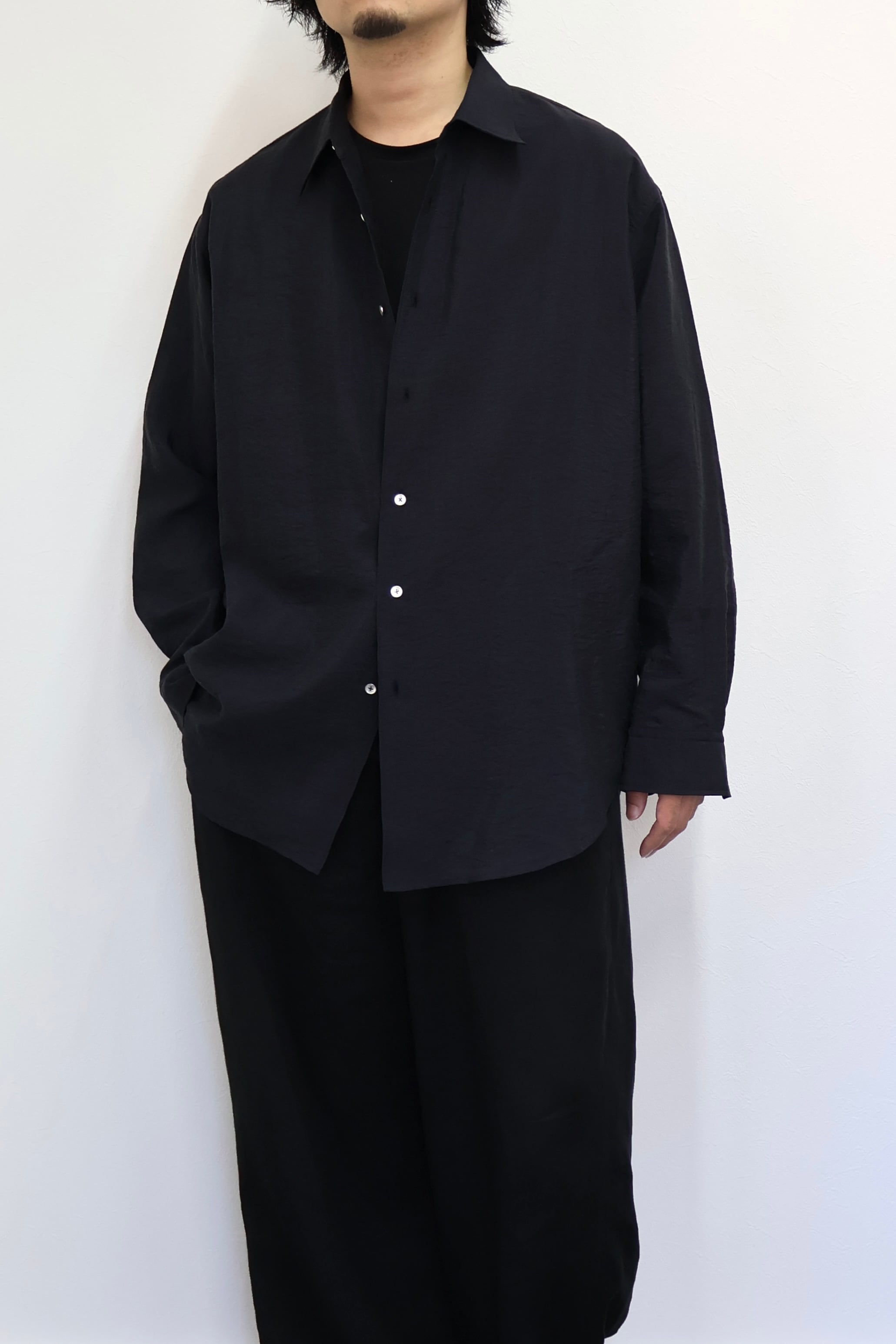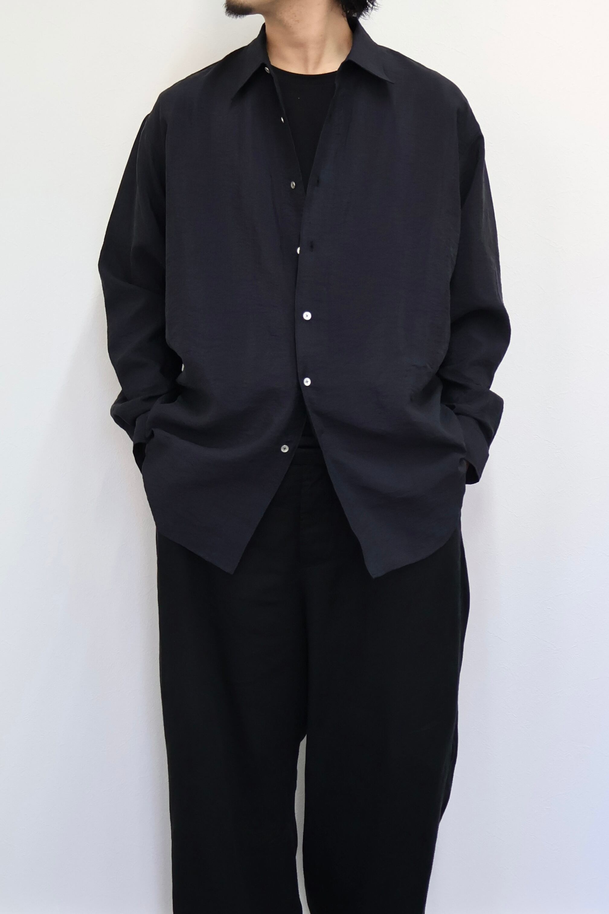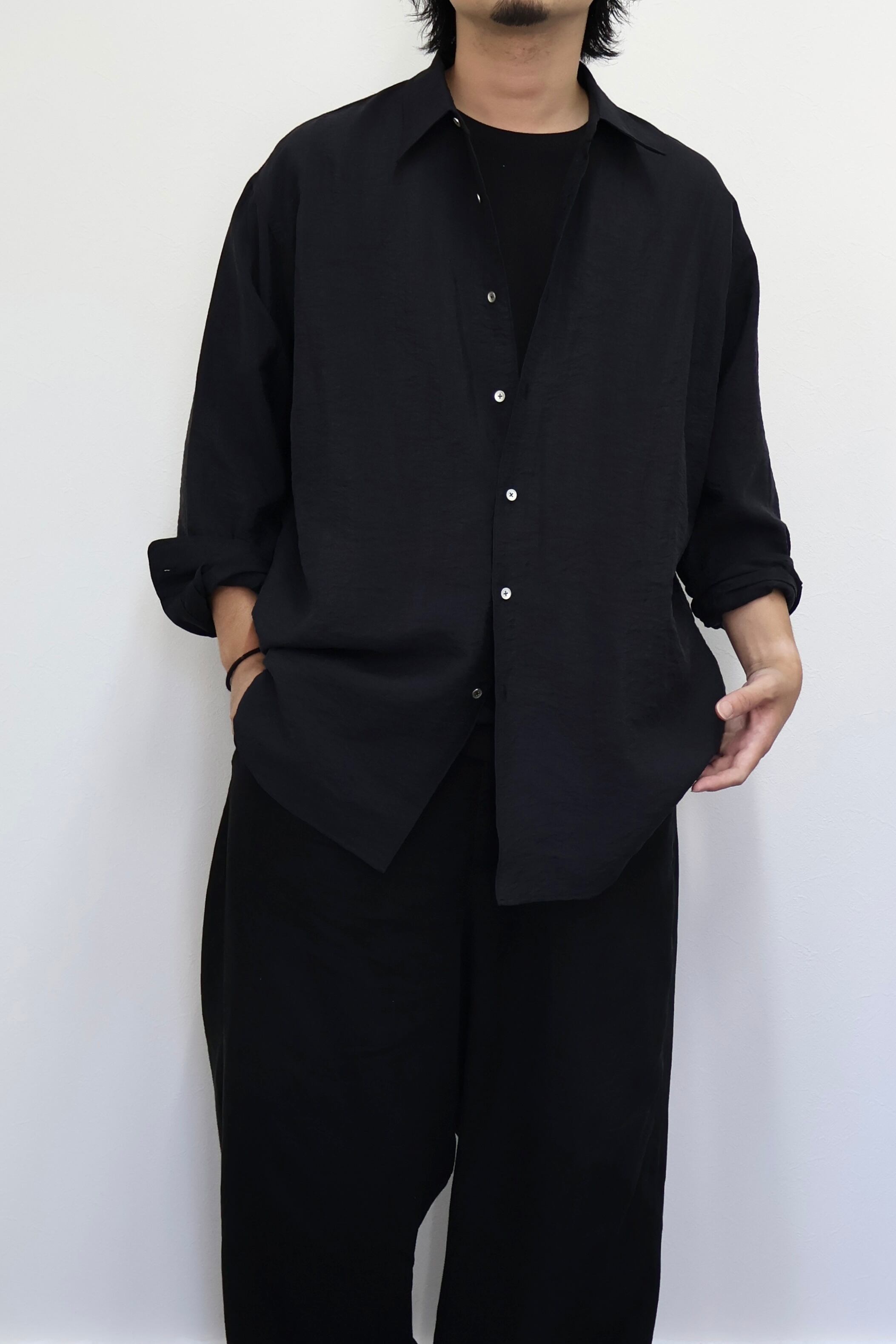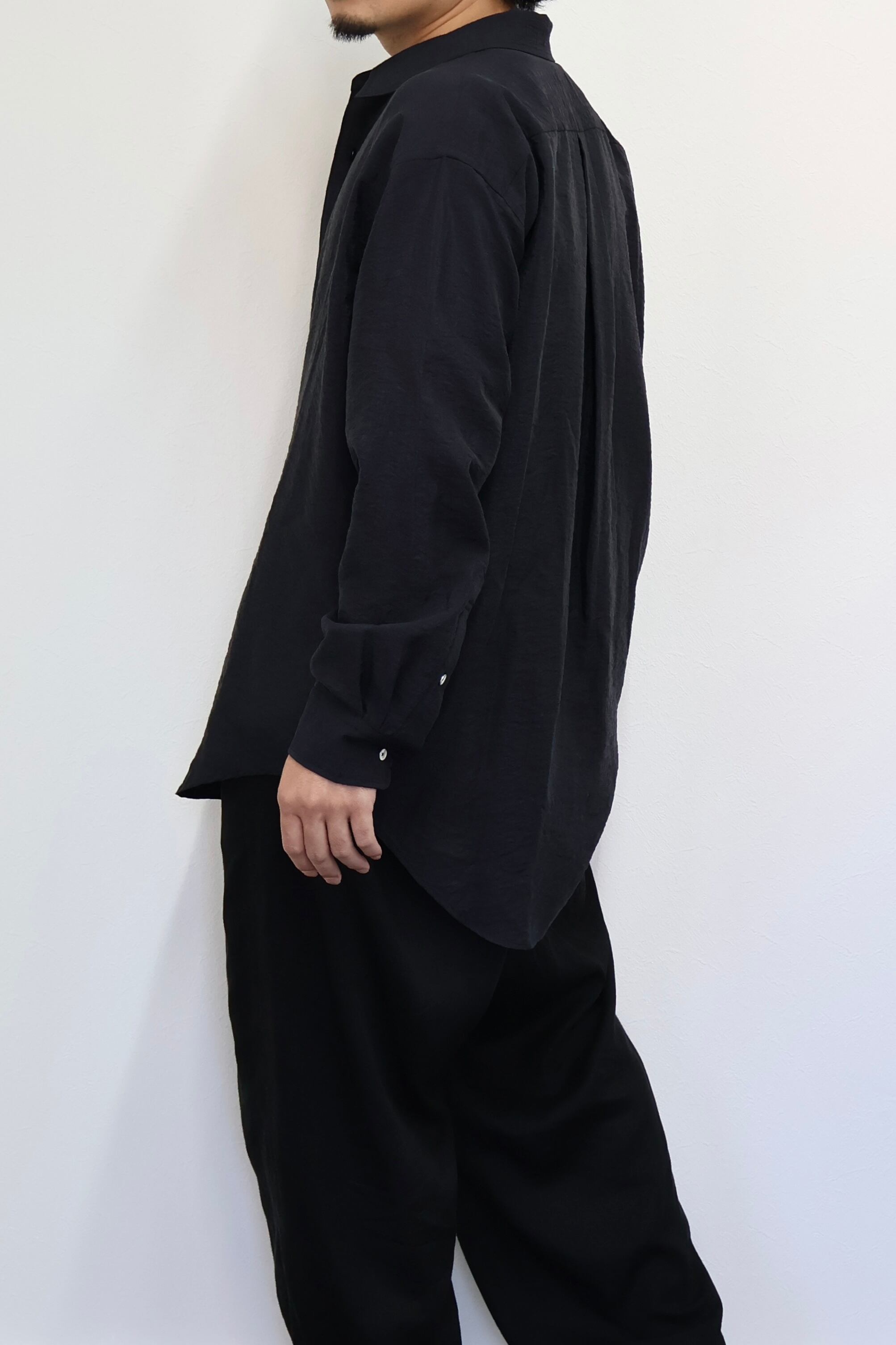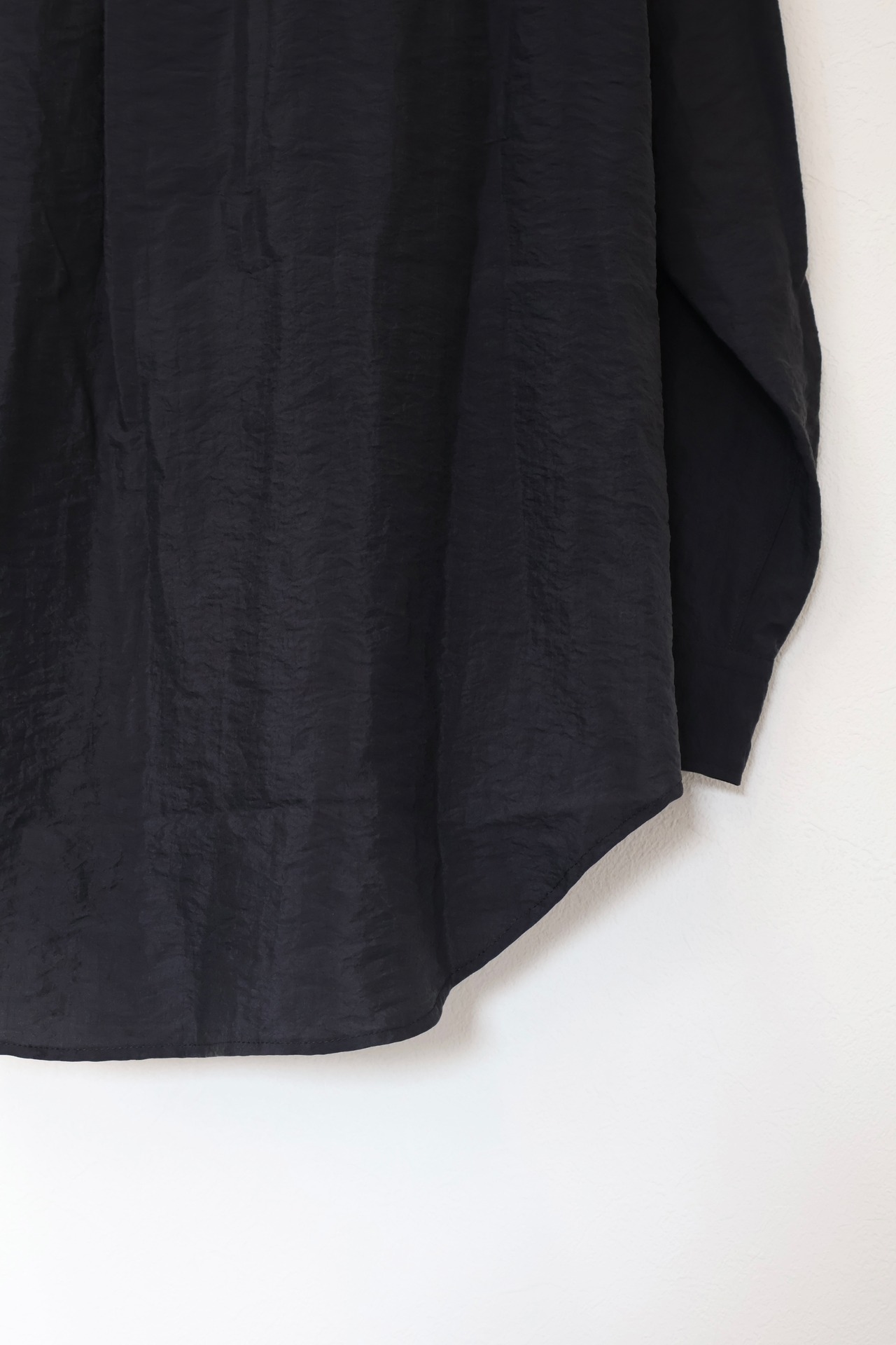 アームホールや身幅にゆとりを持たせたサイズシルエットでありながらわずかにカフス幅を絞りスッキリとした印象に仕上げたAXIS定番のレギュラーカラーシャツ。塩縮加工を施し上質なシルクナイロンのテキスタイルを使用。メタルボタンを合わせています。