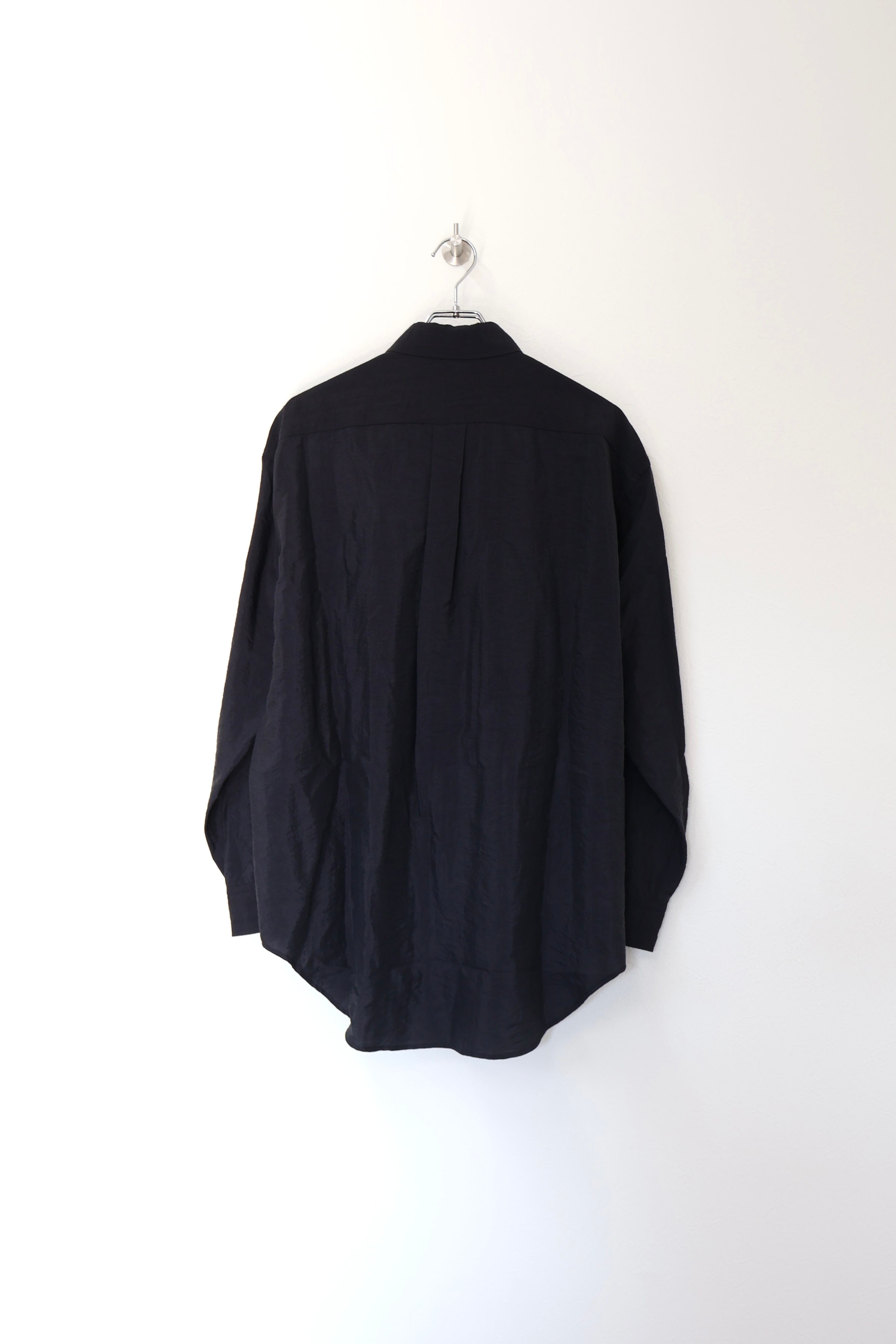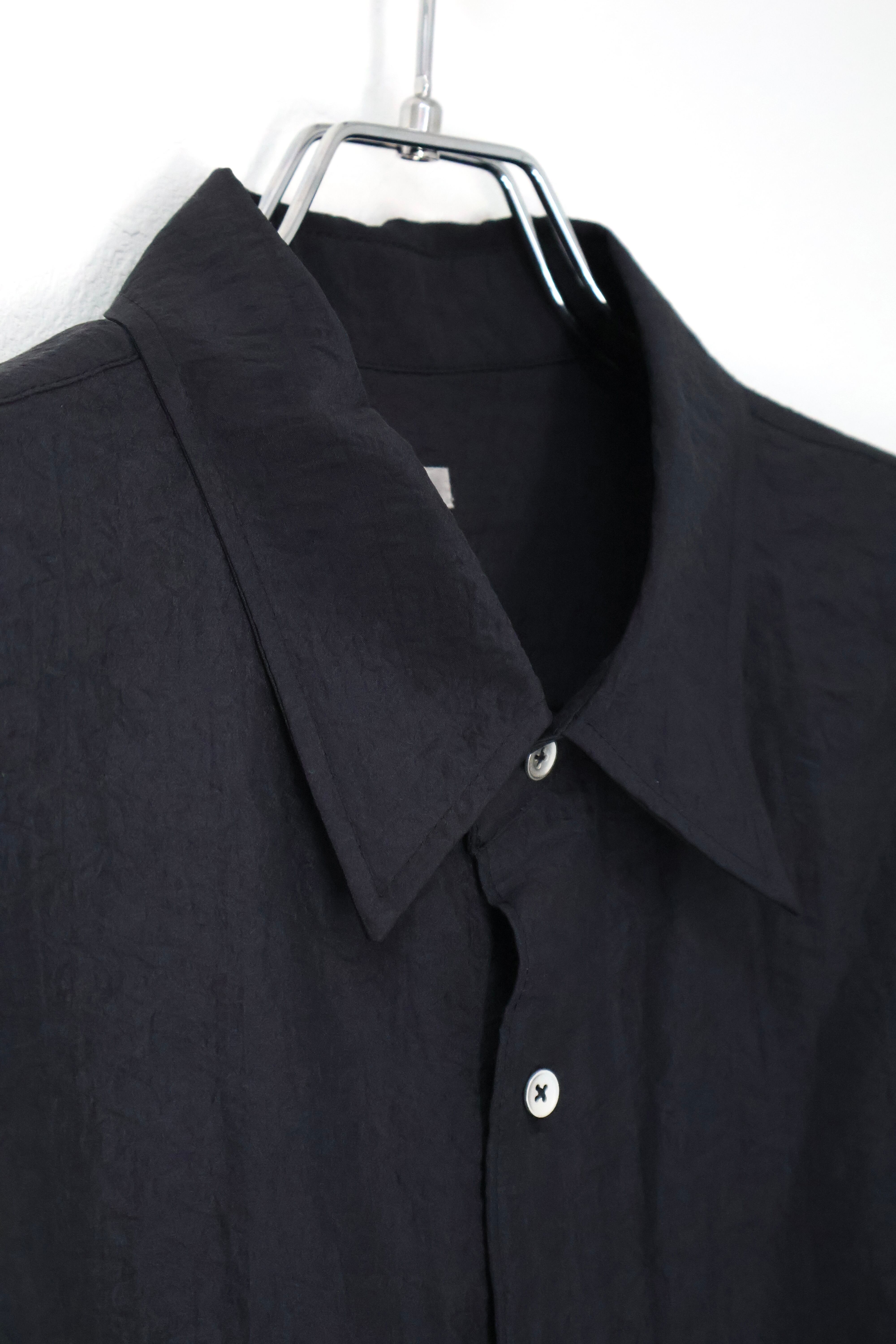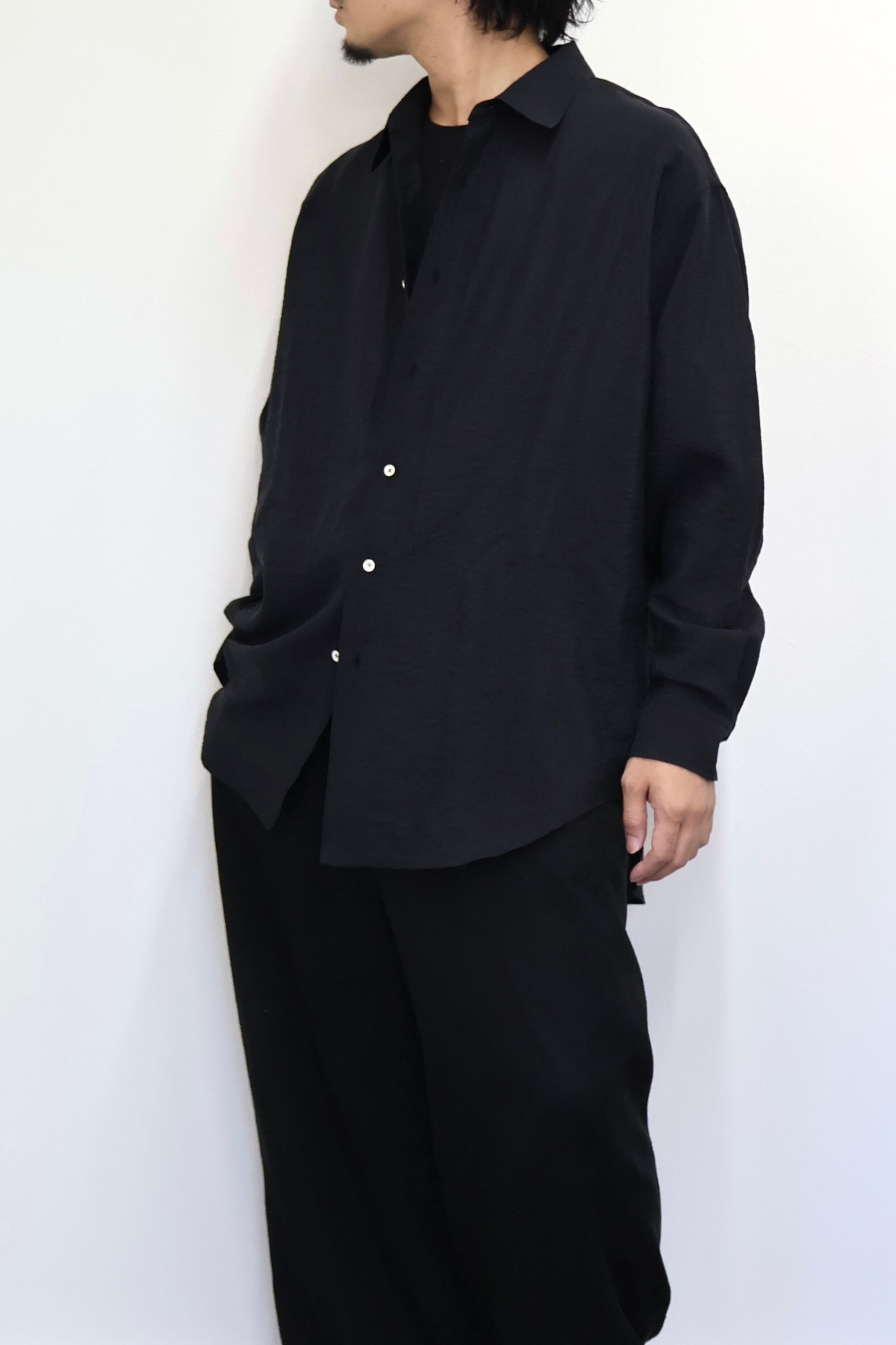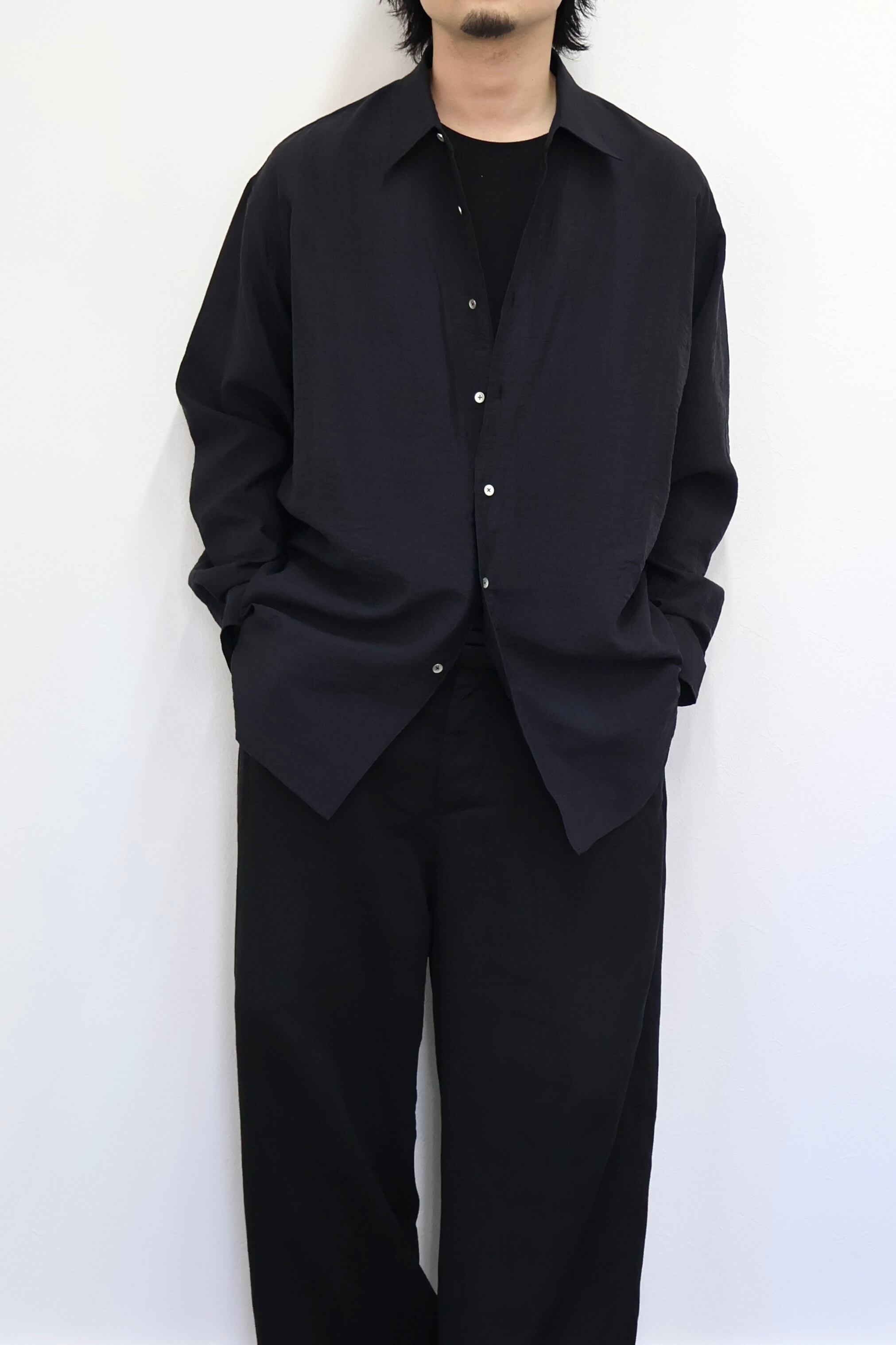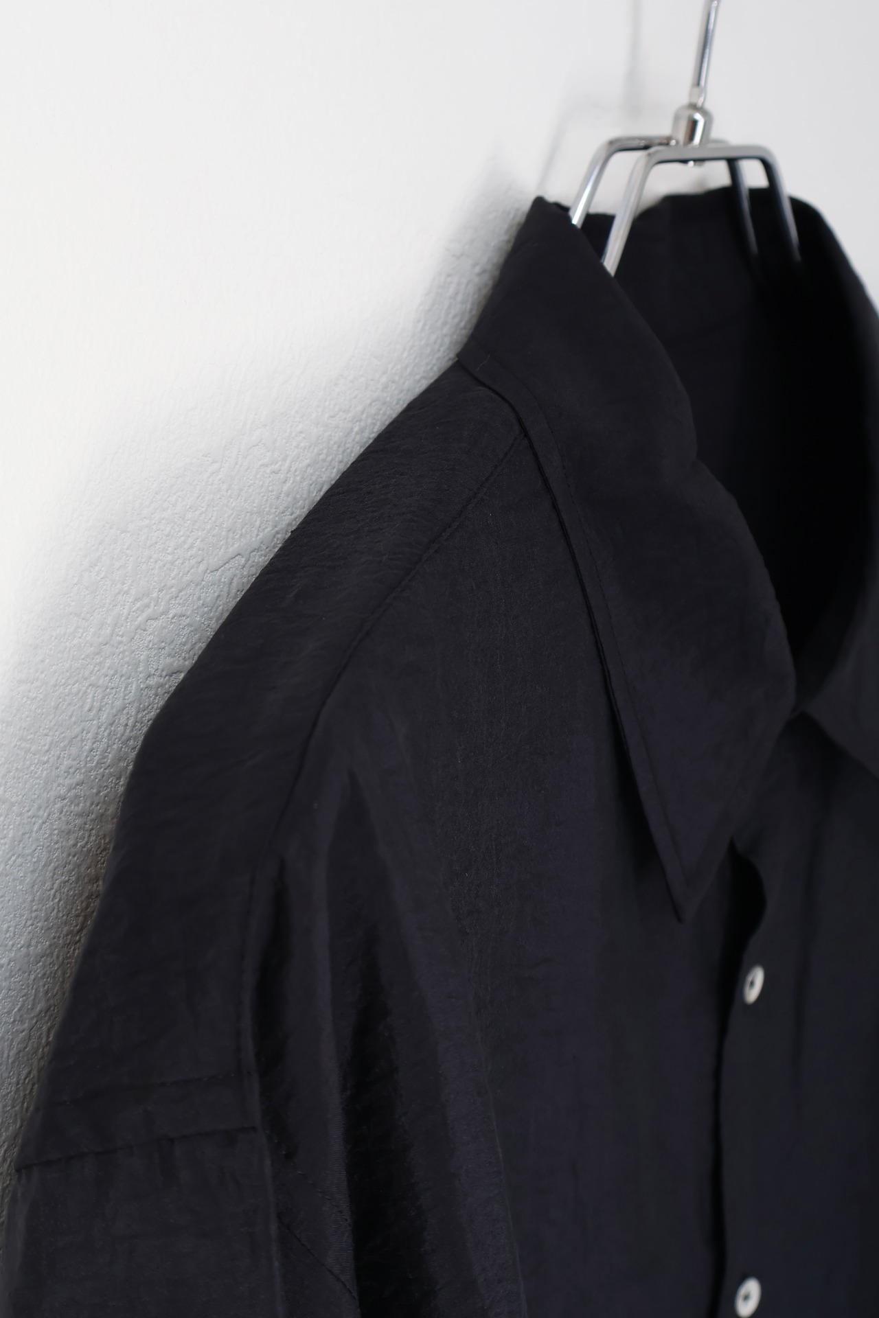 アームホールや身幅にゆとりを持たせたサイズシルエットでありながらわずかにカフス幅を絞りスッキリとした印象に仕上げたAXIS定番のレギュラーカラーシャツ。塩縮加工を施し上質なシルクナイロンのテキスタイルを使用。メタルボタンを合わせています。