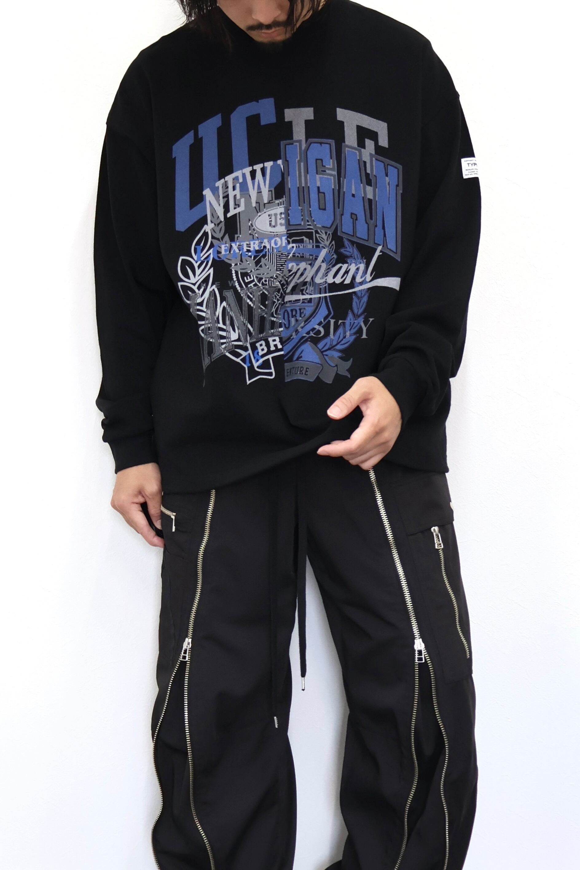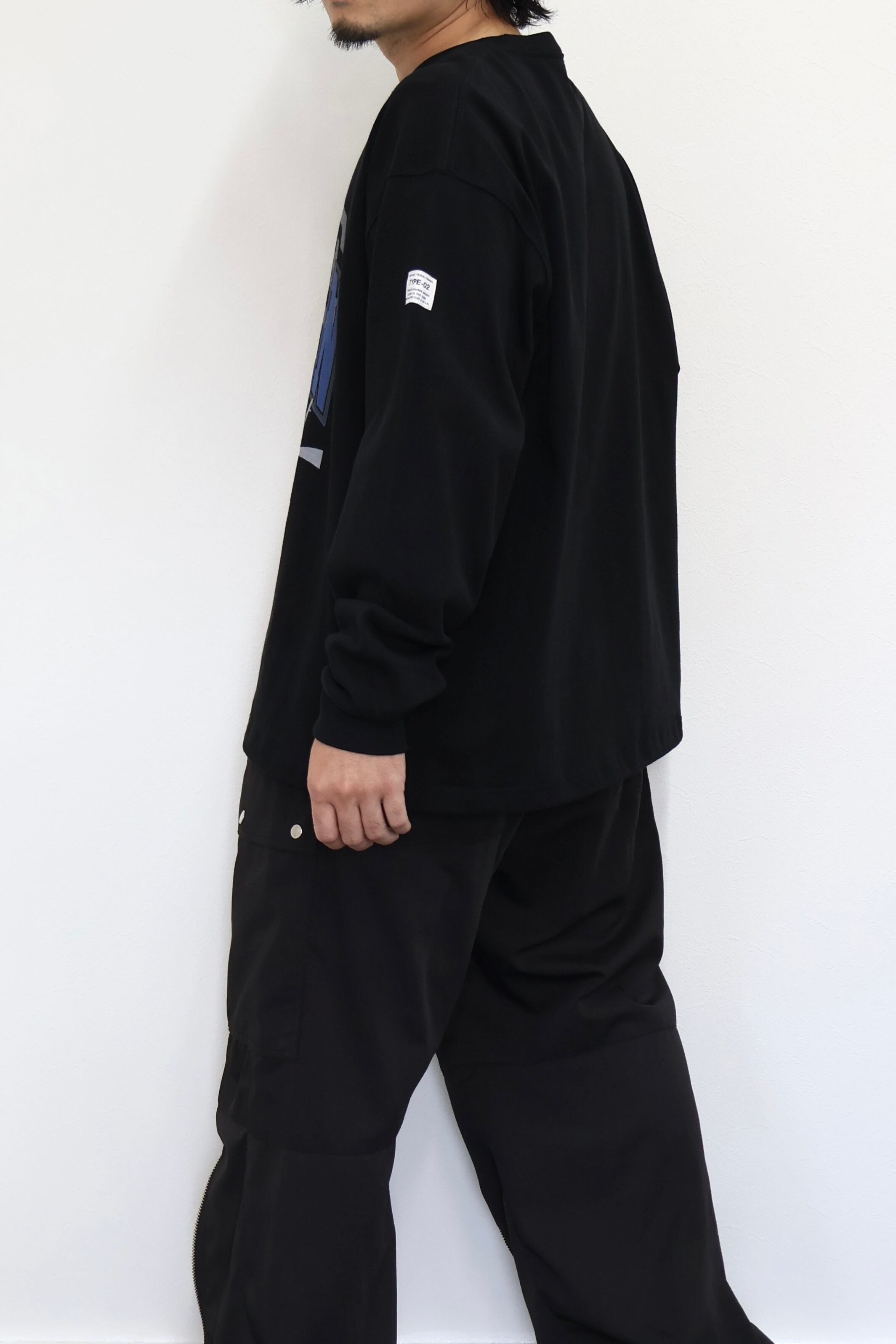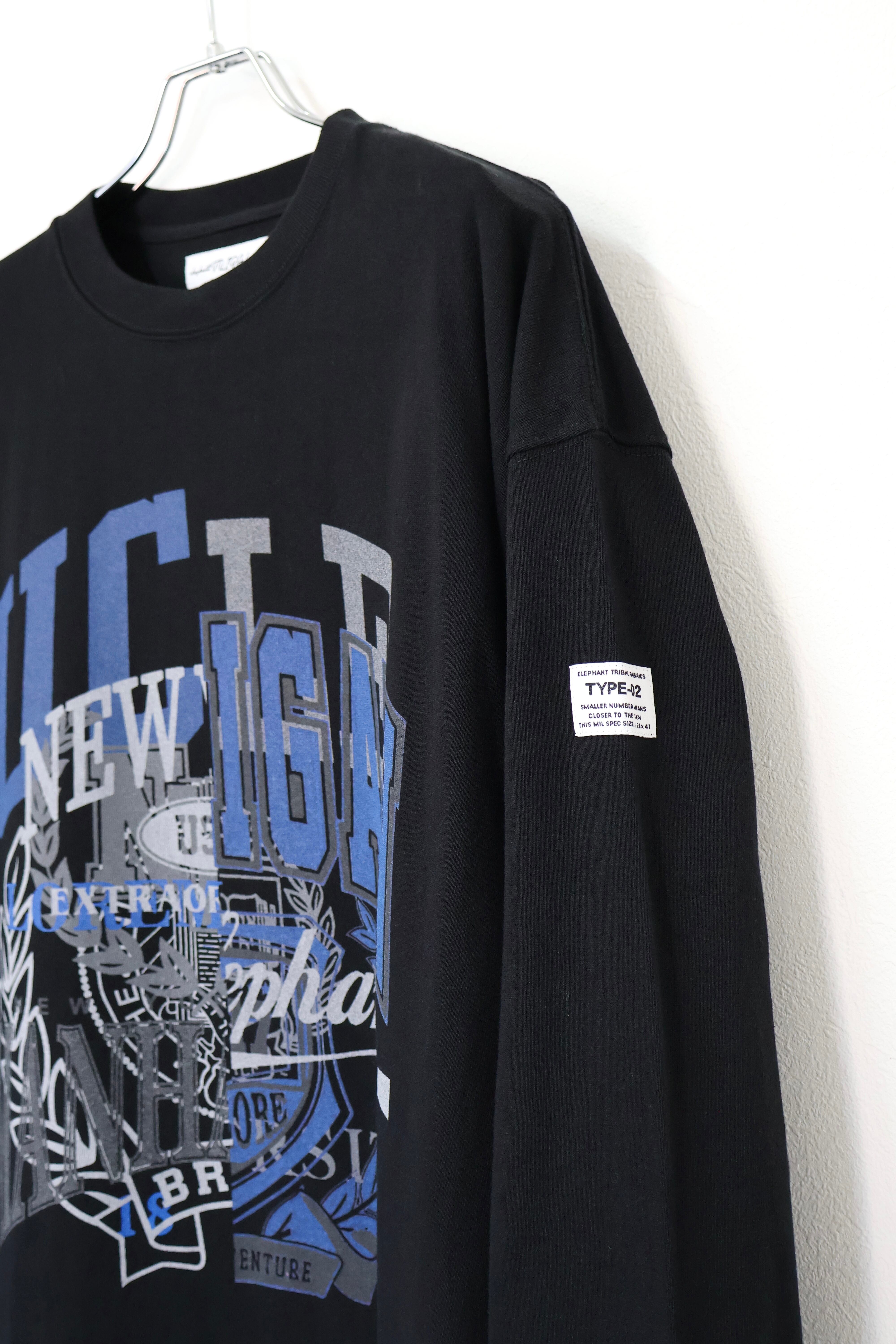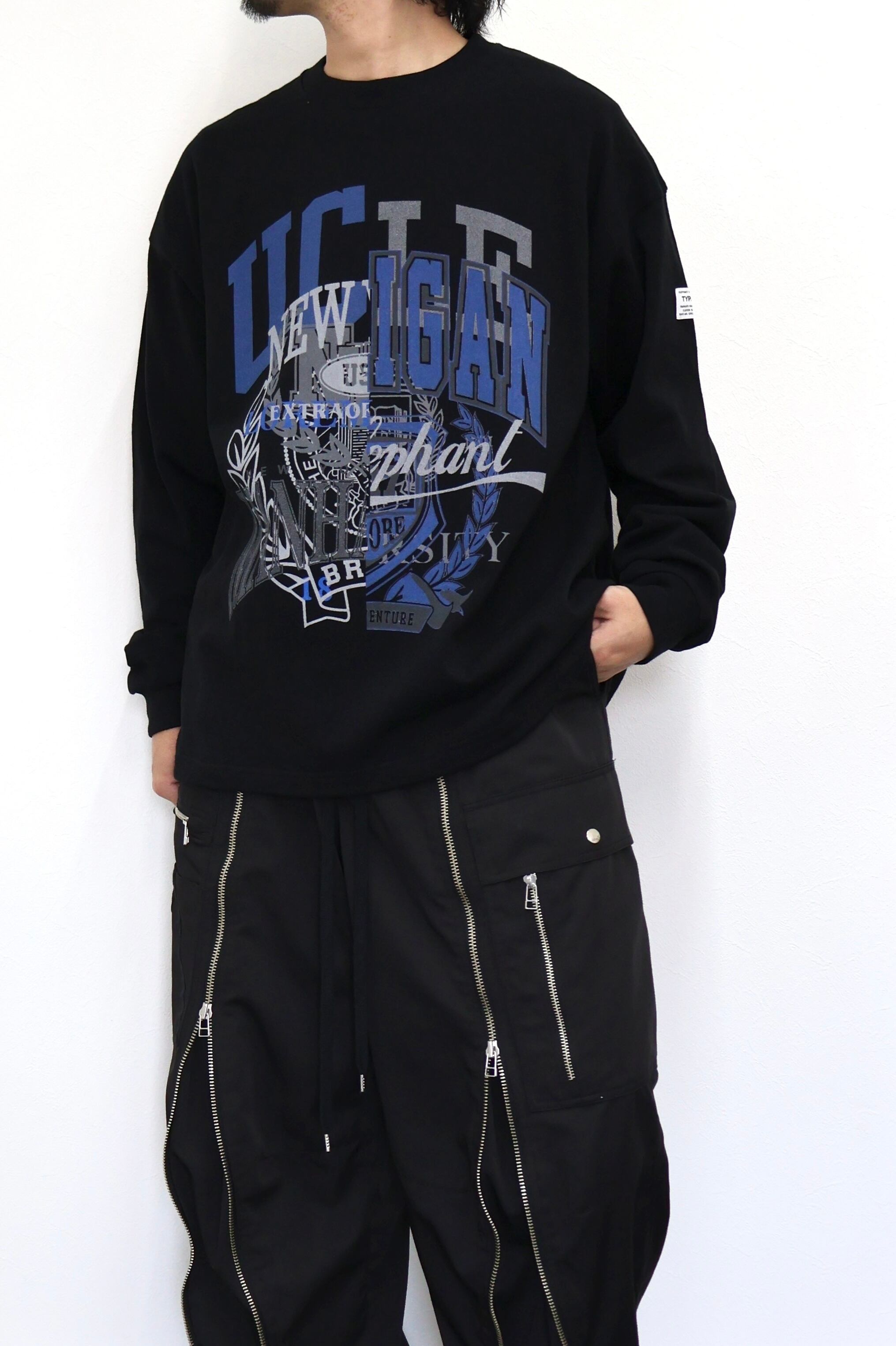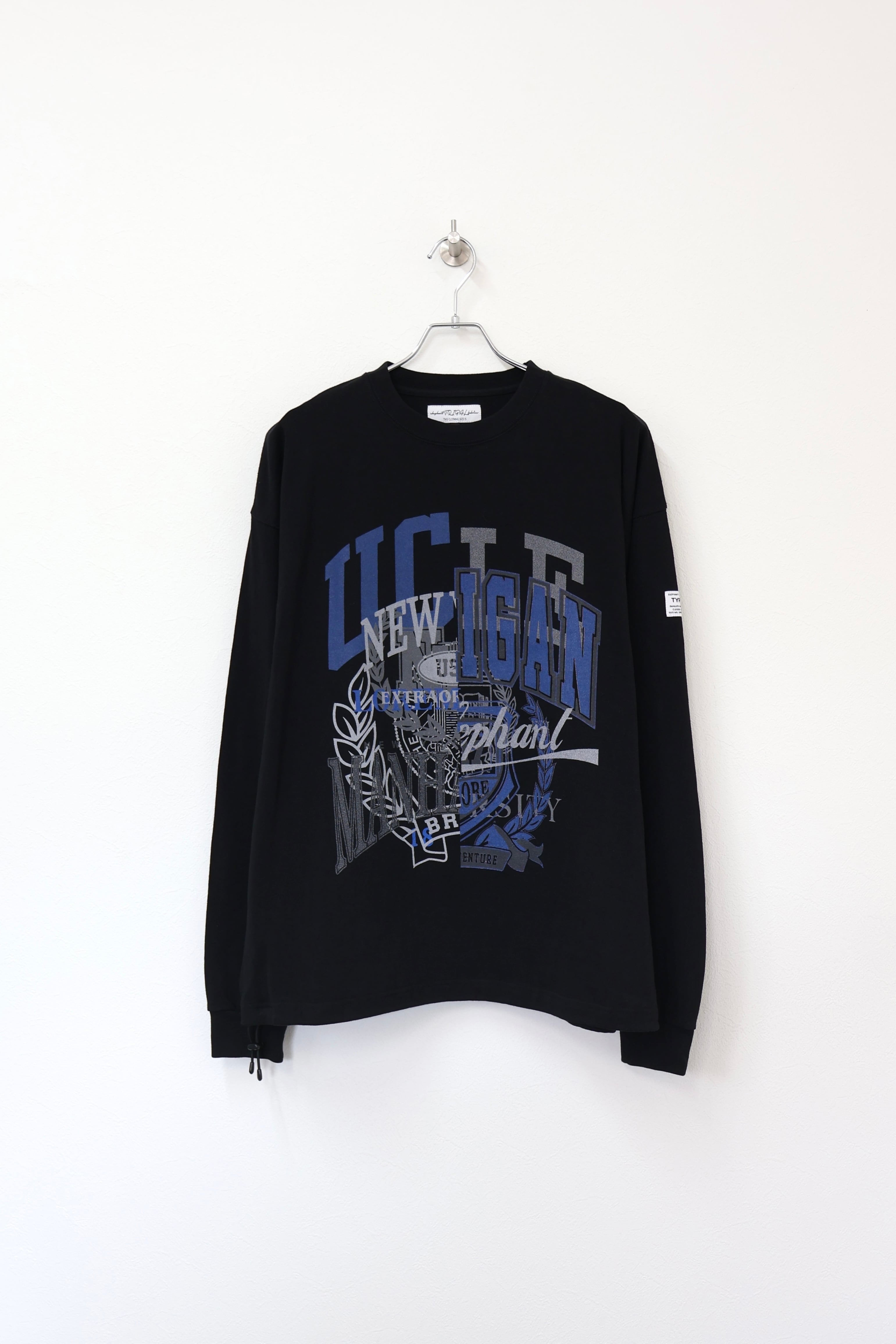 多種類のカレッジグラフィックをのせたグラフィック Long T。ボディには強撚糸を使用したシャリ感のあるヘビーオンスな生地を採用。身幅にゆとりを持たせたボックスシルエット。裾部分にはアジャスター付きドローコードを配置しシルエット変更が可能。