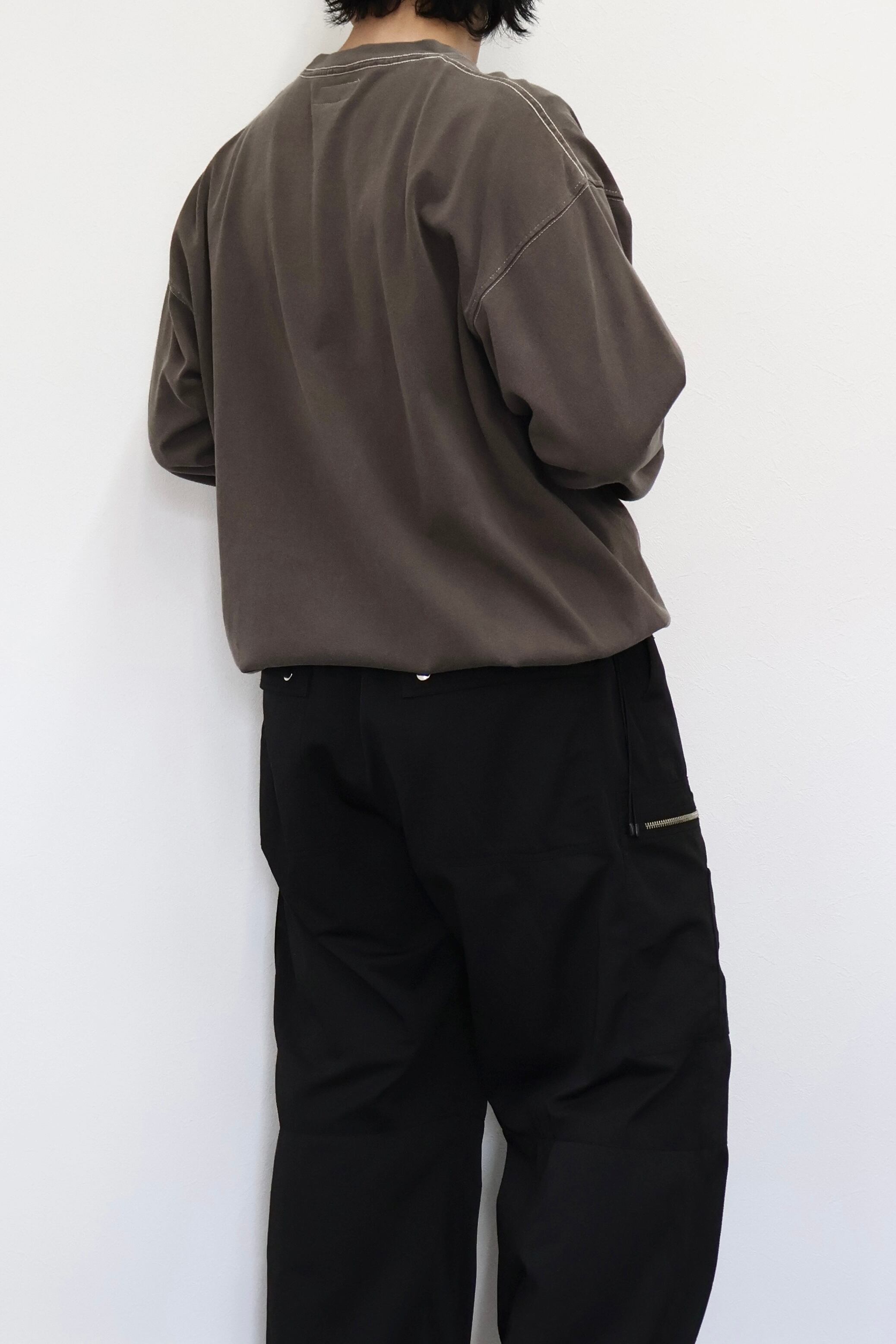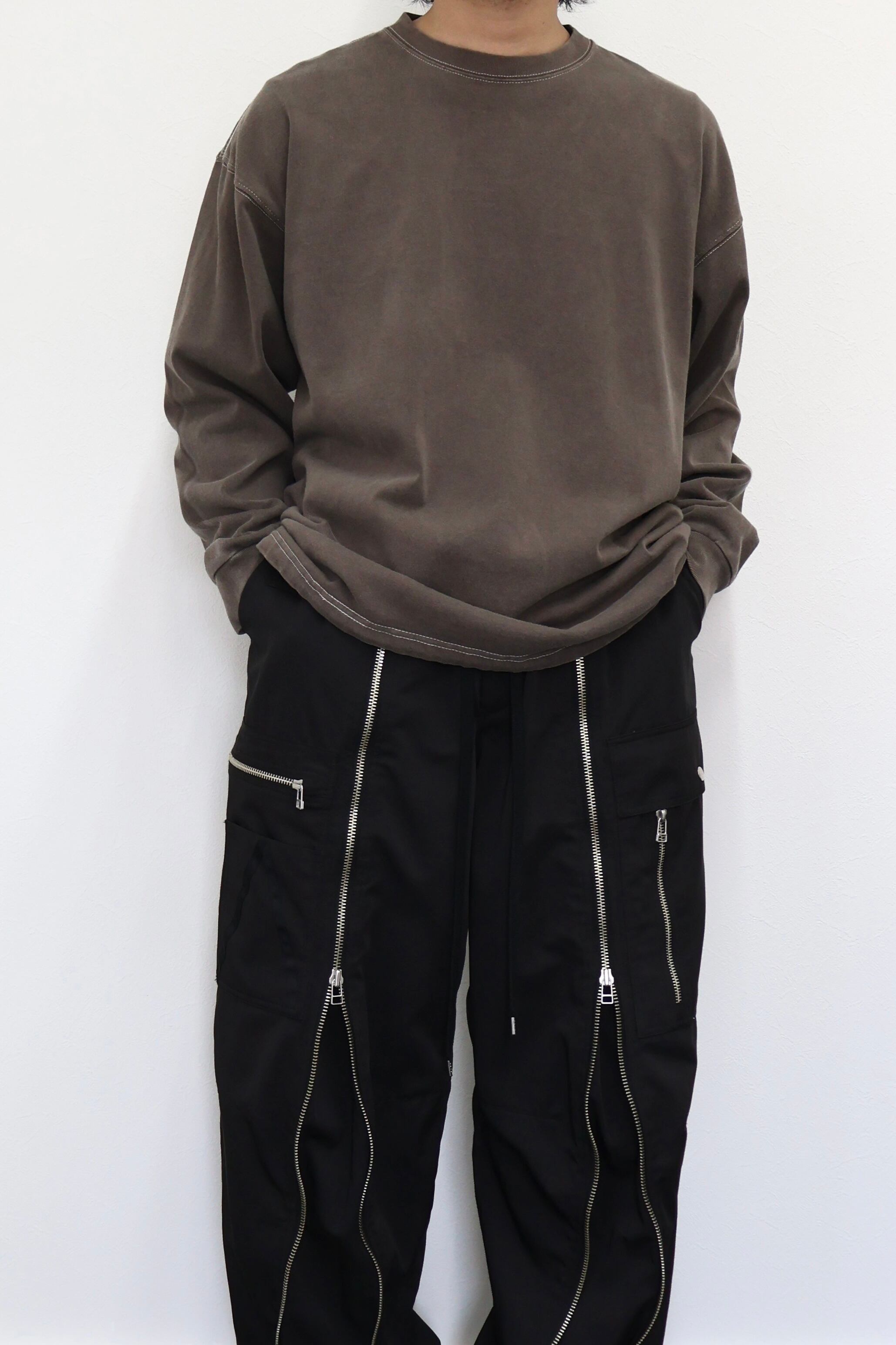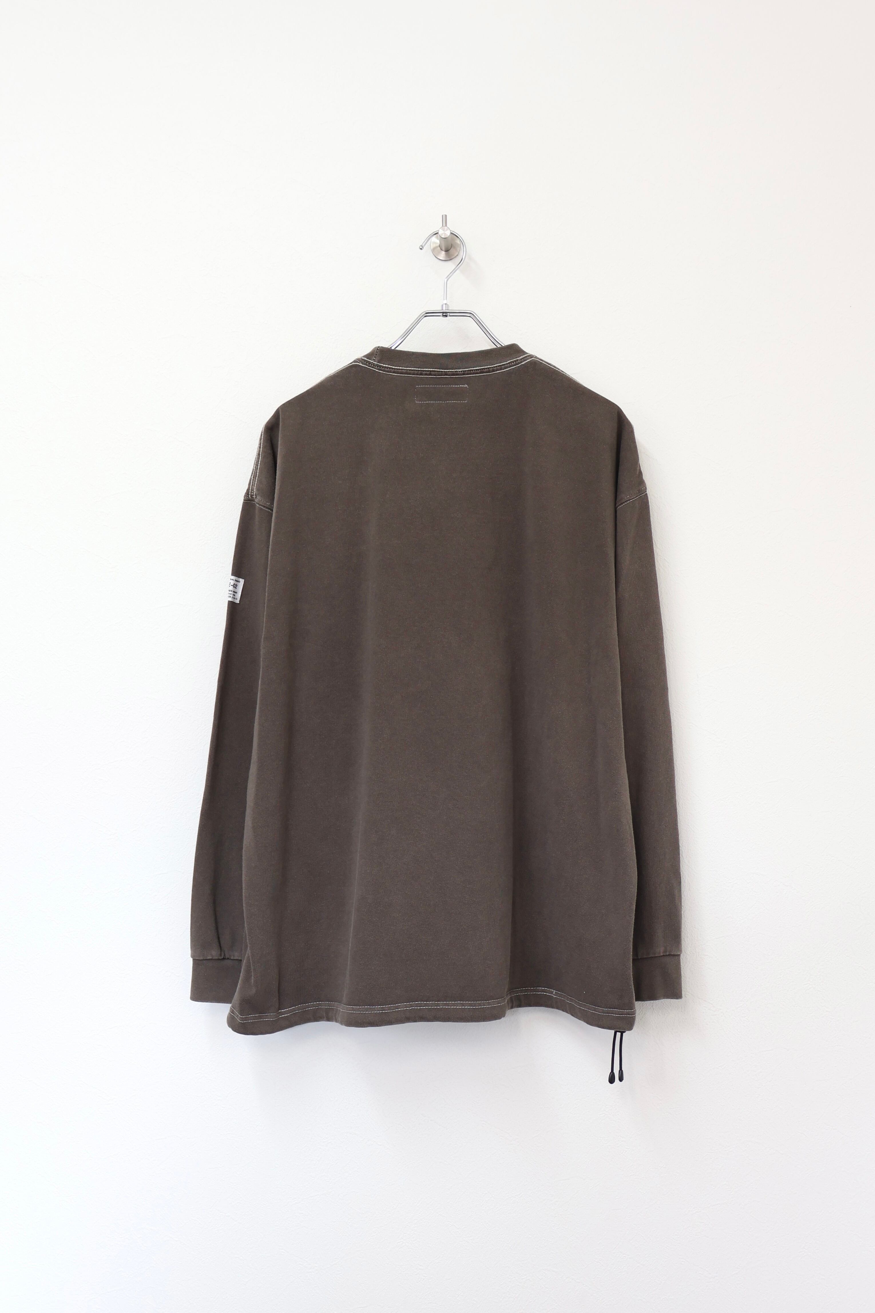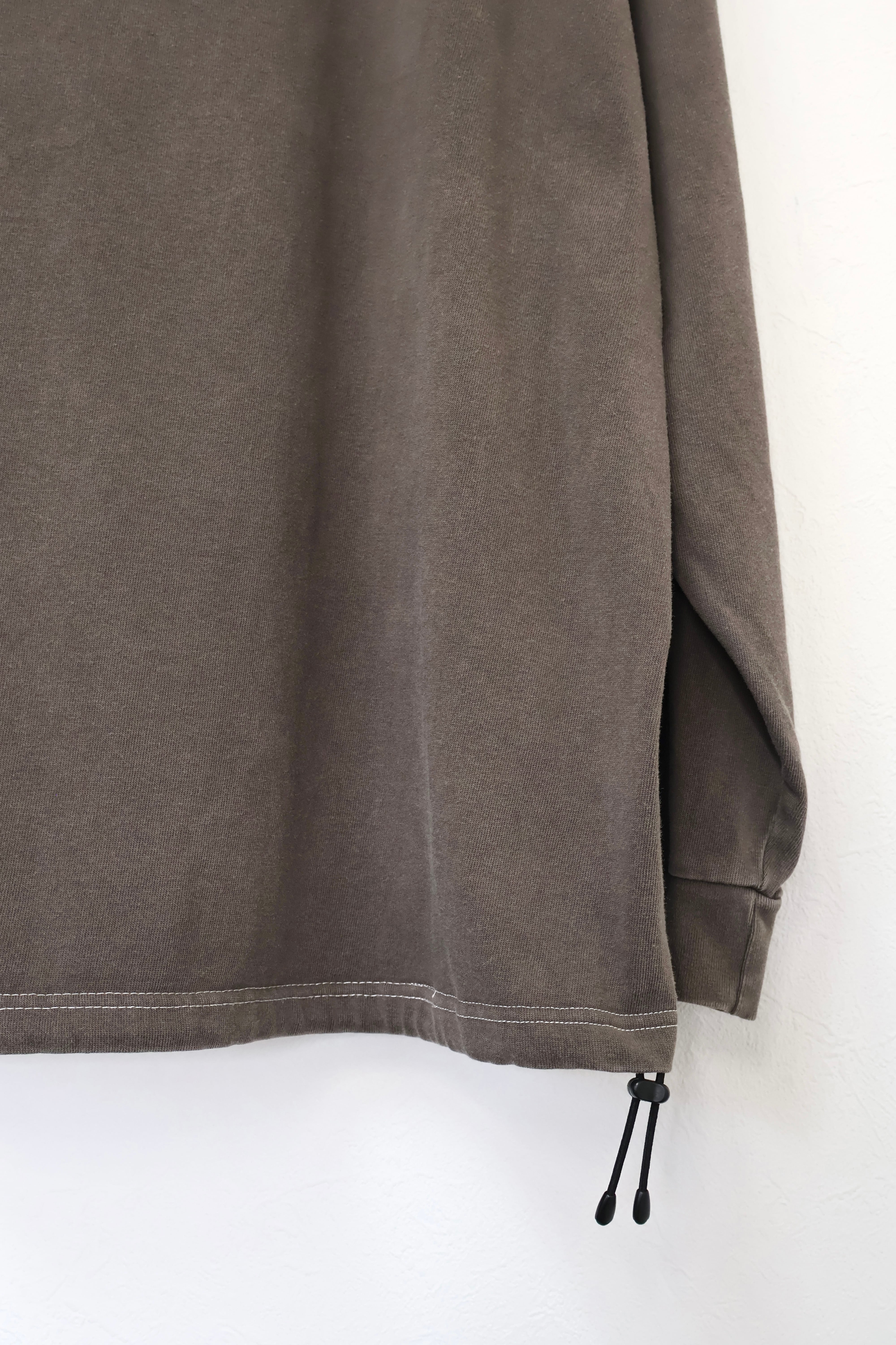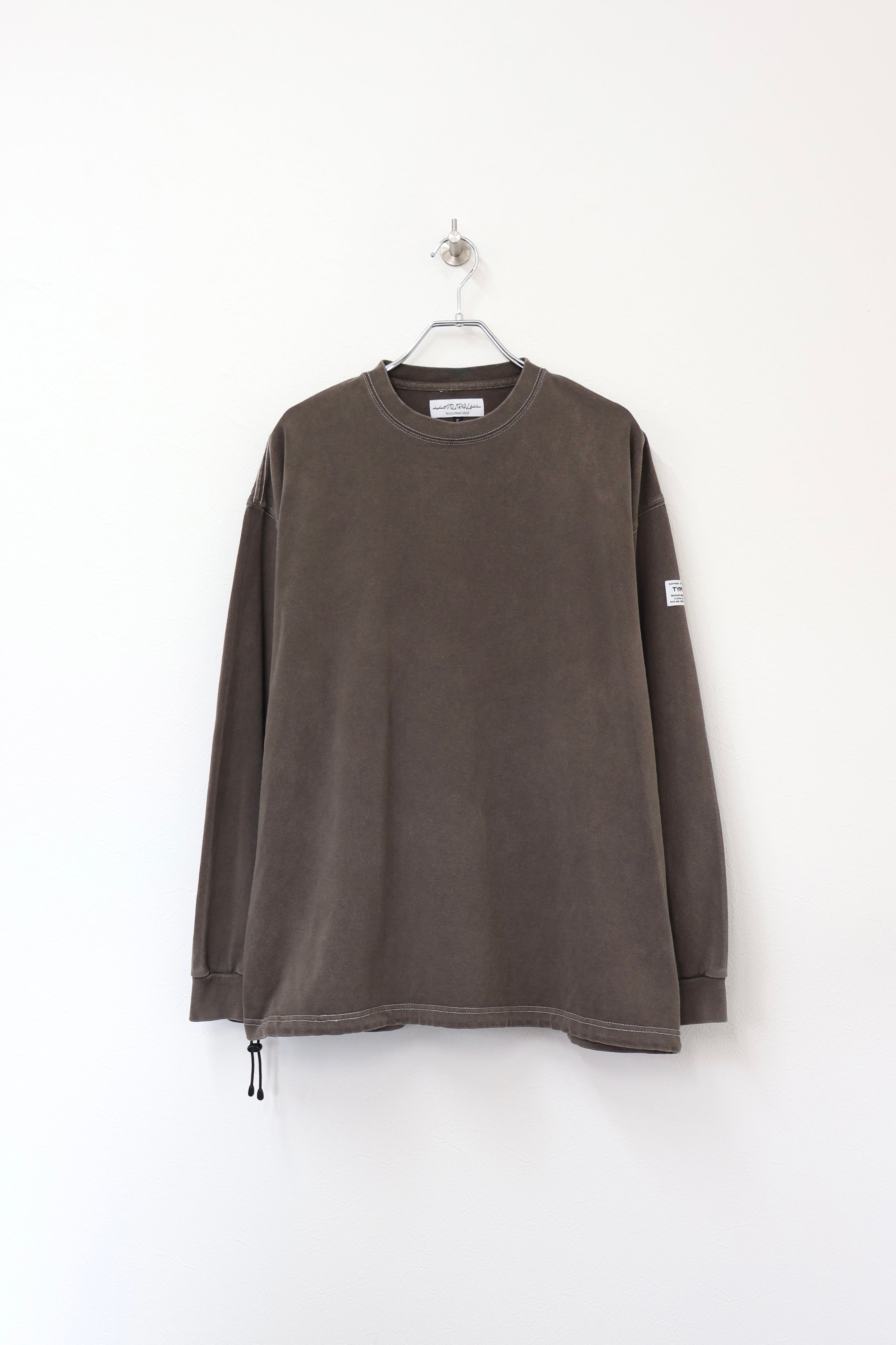 強撚糸を使用したシャリ感のあるヘビーオンスなLong T-SH。身幅にゆとりを持たせたボックスシルエット。製品後、硫化染めを施しさらにブリーチをナノサイズにしたミストで追い加工を施した細かなフェード感のあるアイテム。裾部分にはアジャスター付きドローコードを配置しシルエット変更が可能。