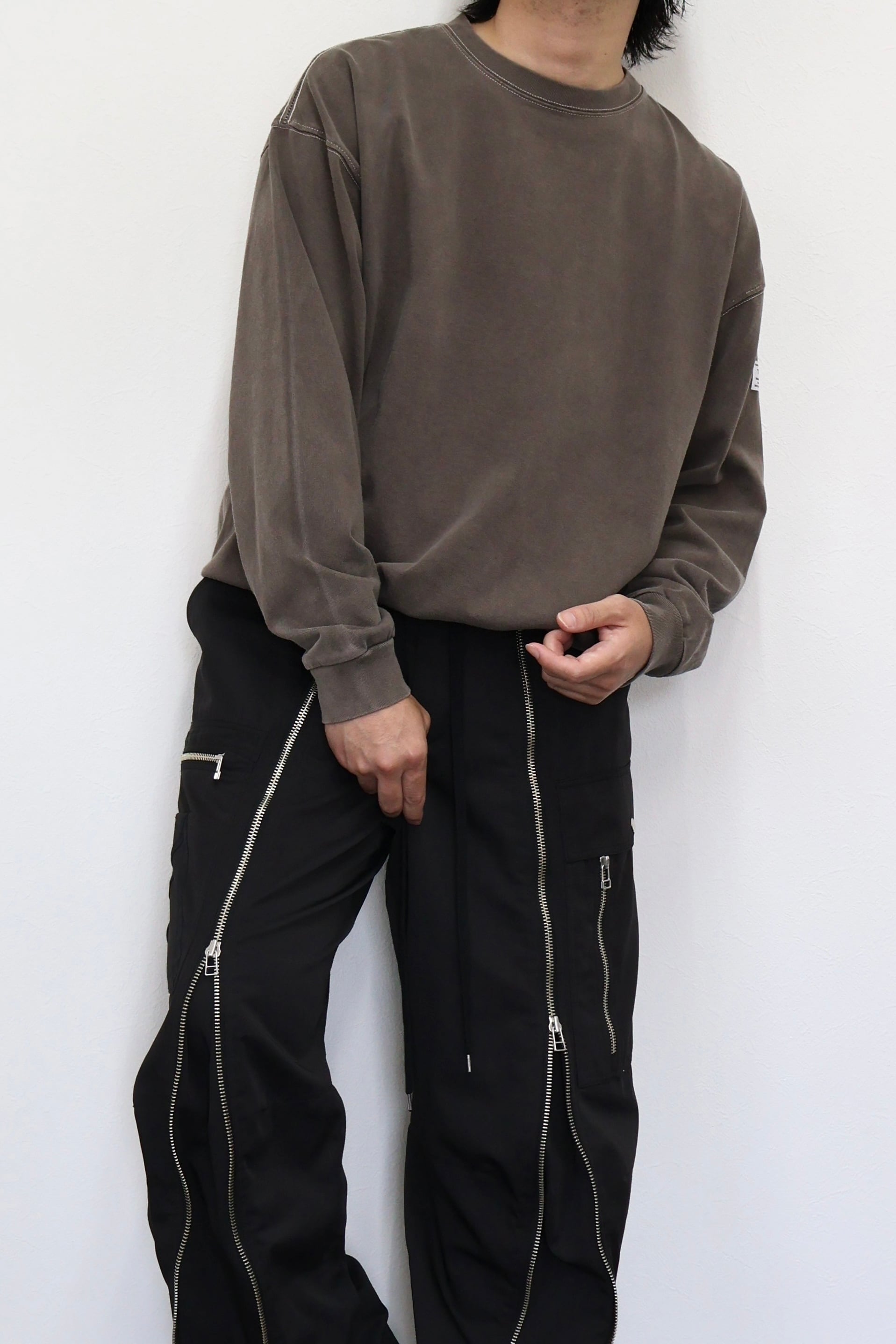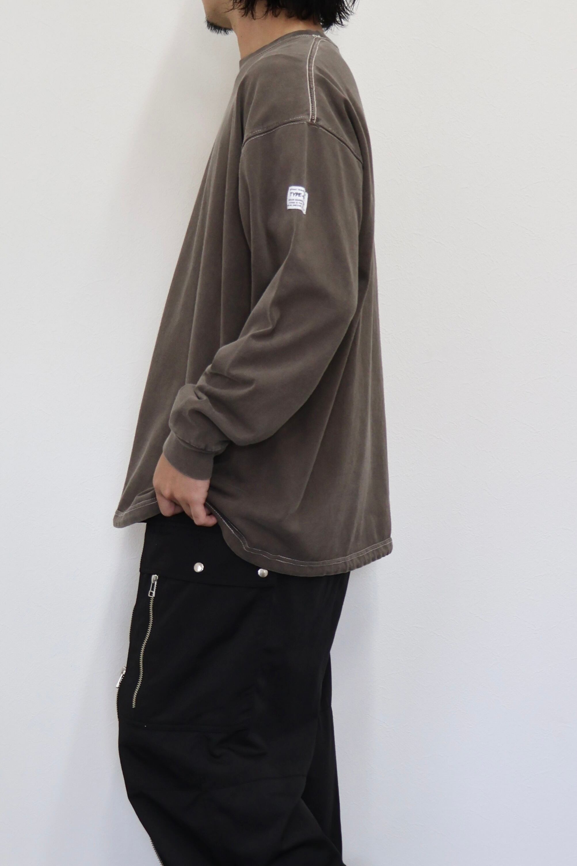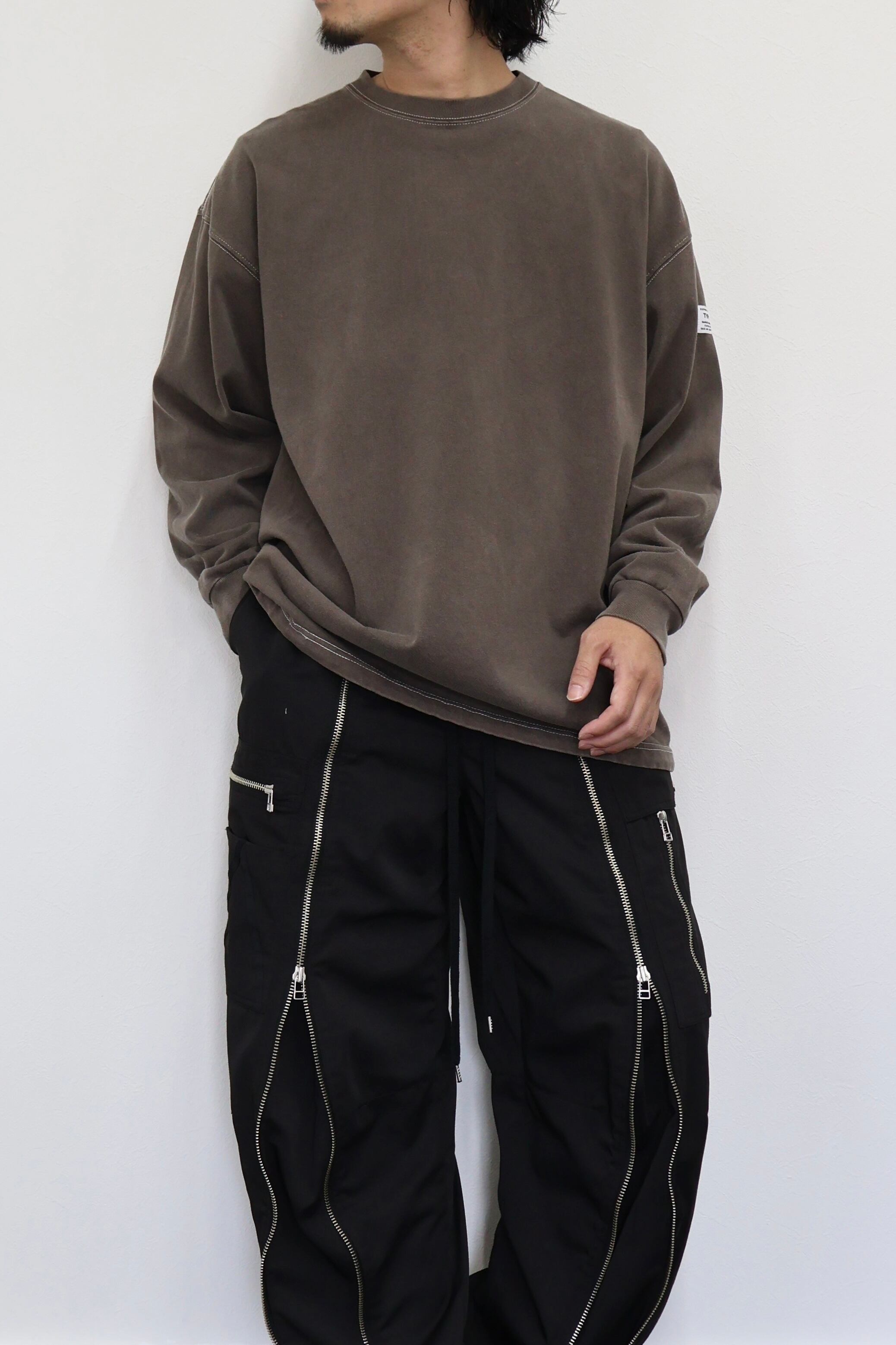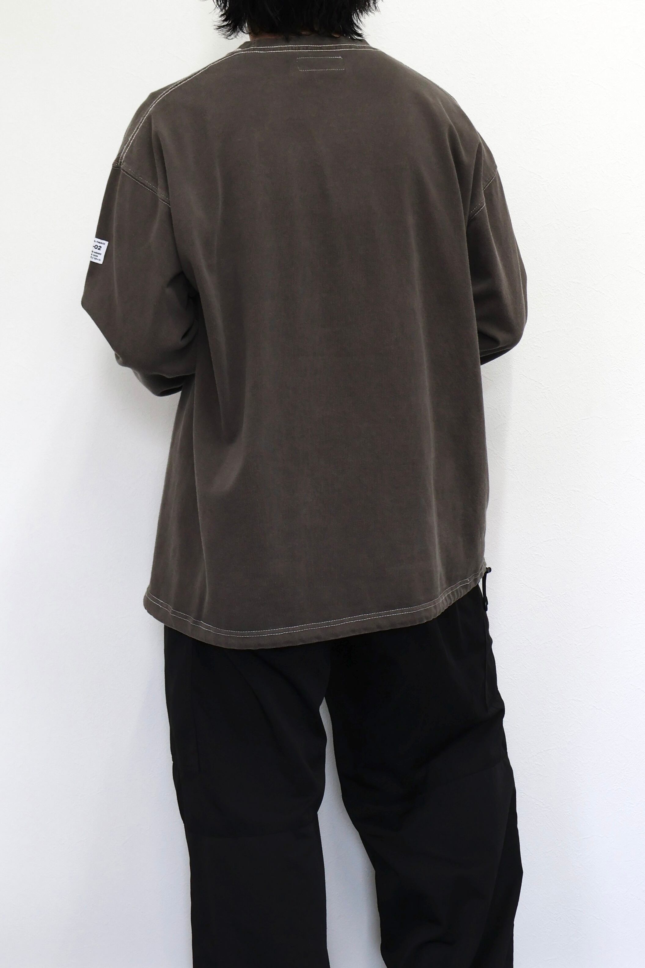 強撚糸を使用したシャリ感のあるヘビーオンスなLong T-SH。身幅にゆとりを持たせたボックスシルエット。製品後、硫化染めを施しさらにブリーチをナノサイズにしたミストで追い加工を施した細かなフェード感のあるアイテム。裾部分にはアジャスター付きドローコードを配置しシルエット変更が可能。