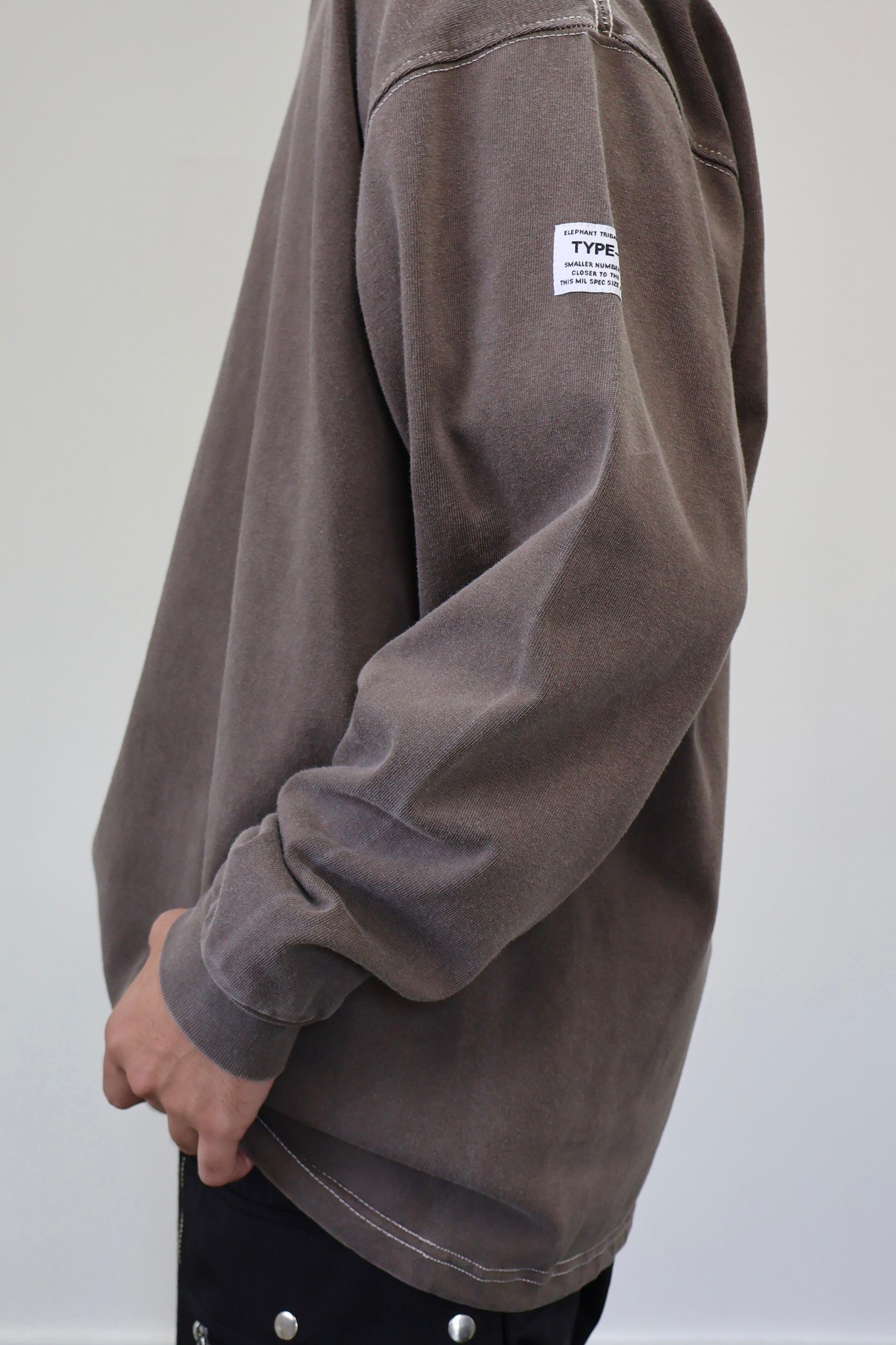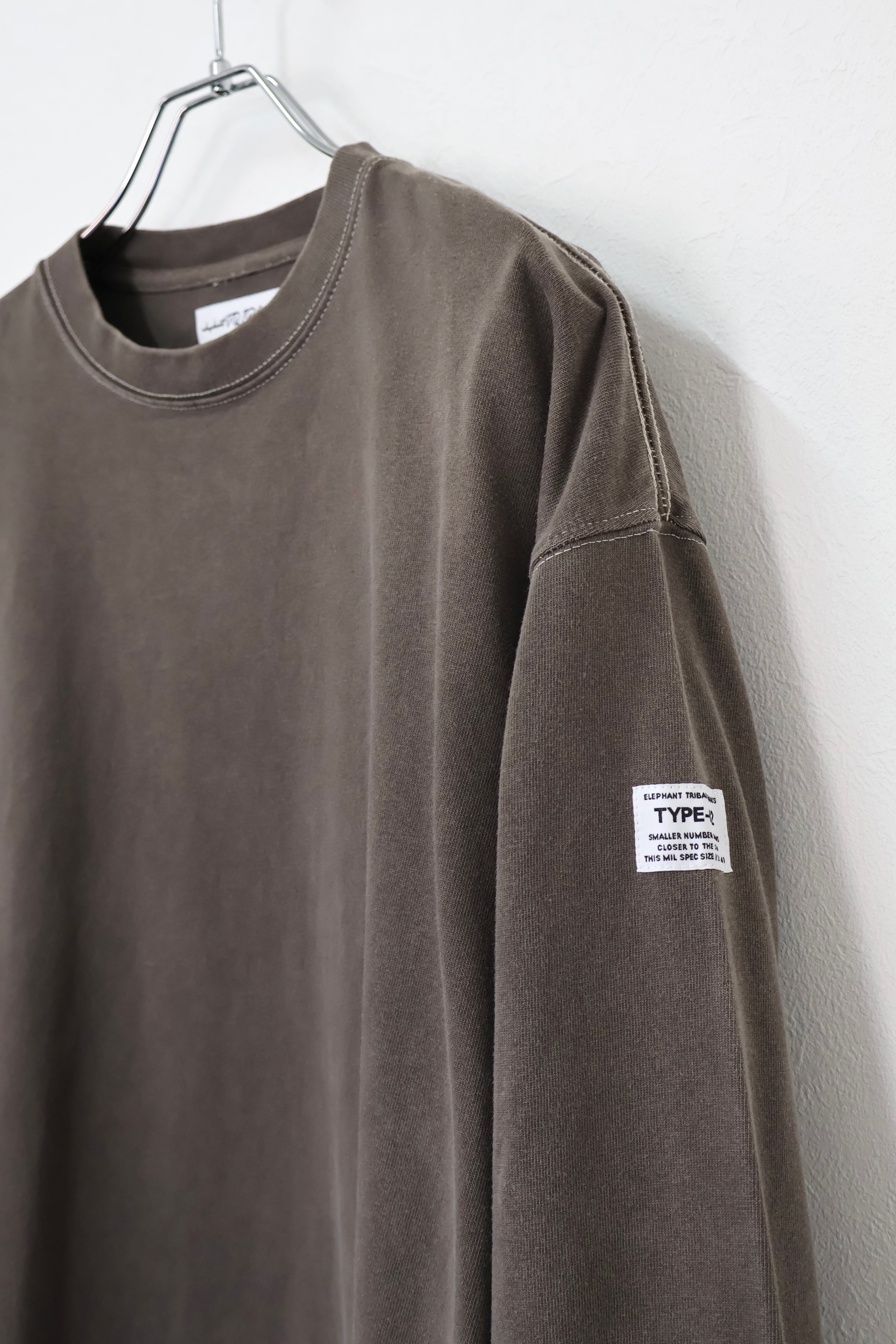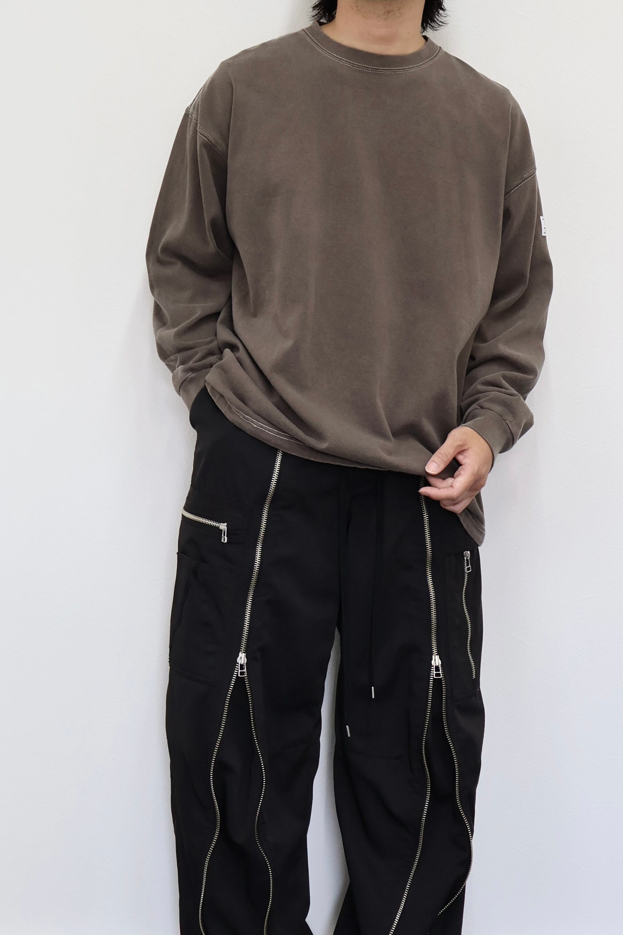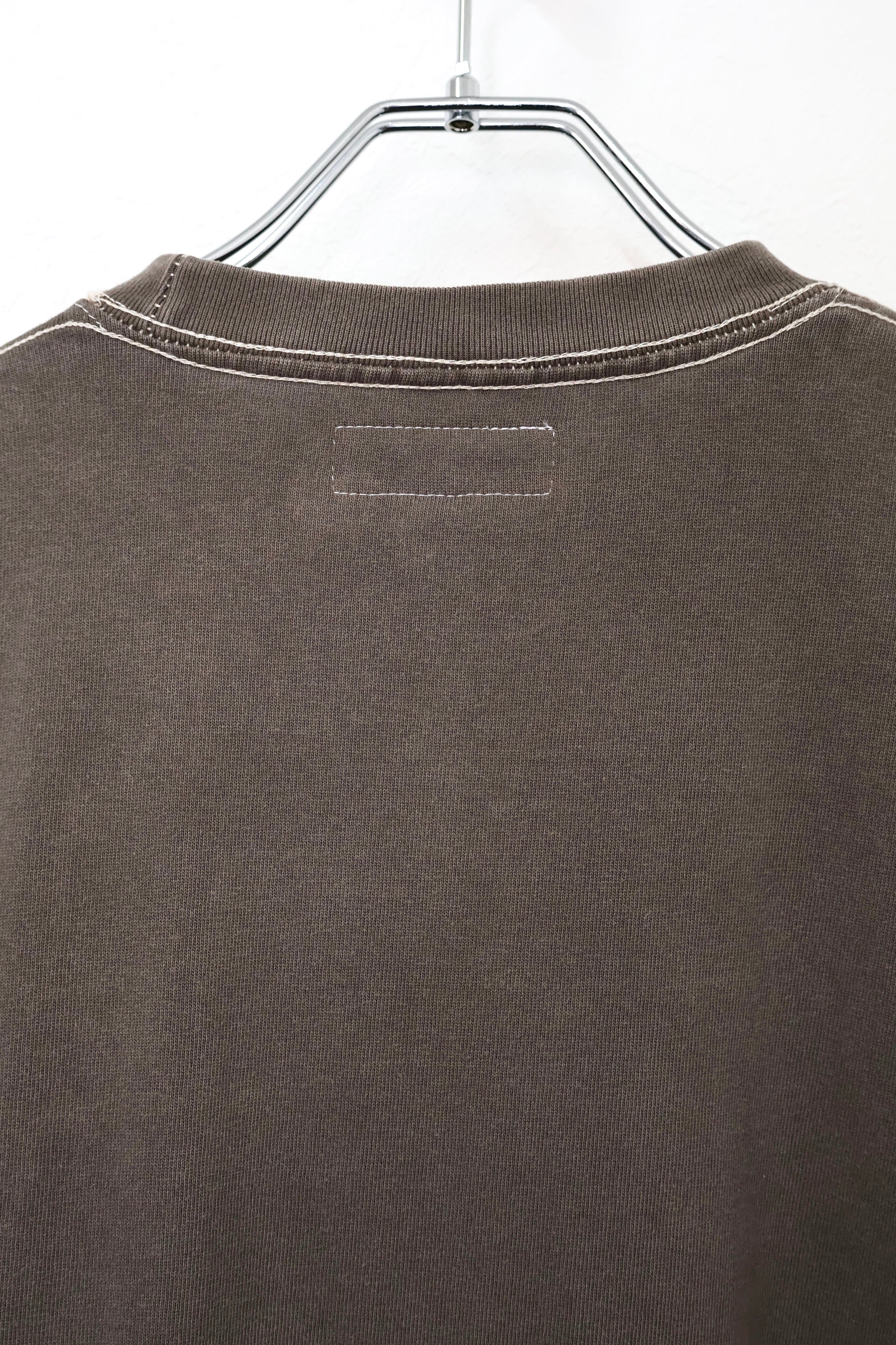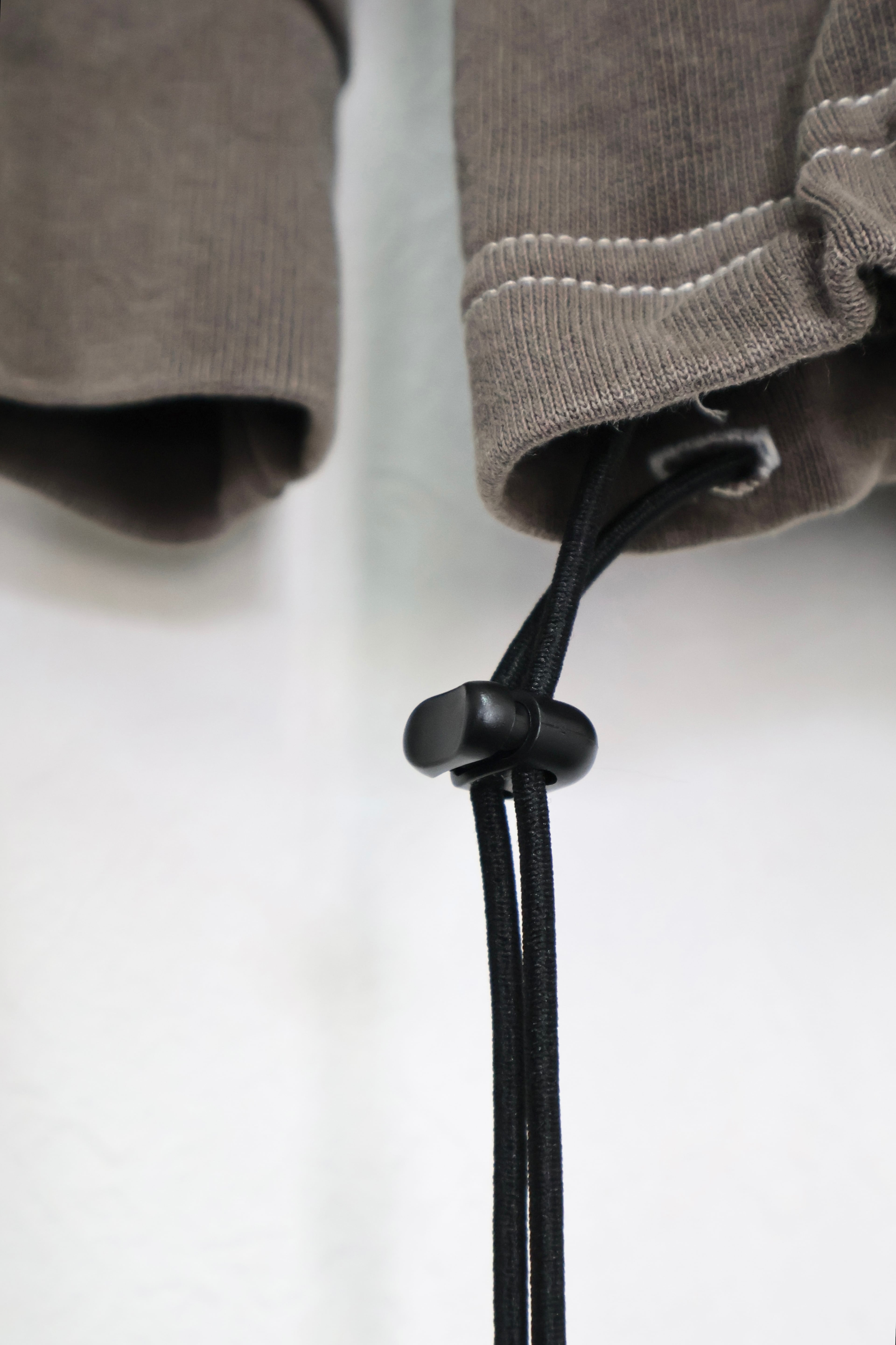 強撚糸を使用したシャリ感のあるヘビーオンスなLong T-SH。身幅にゆとりを持たせたボックスシルエット。製品後、硫化染めを施しさらにブリーチをナノサイズにしたミストで追い加工を施した細かなフェード感のあるアイテム。裾部分にはアジャスター付きドローコードを配置しシルエット変更が可能。