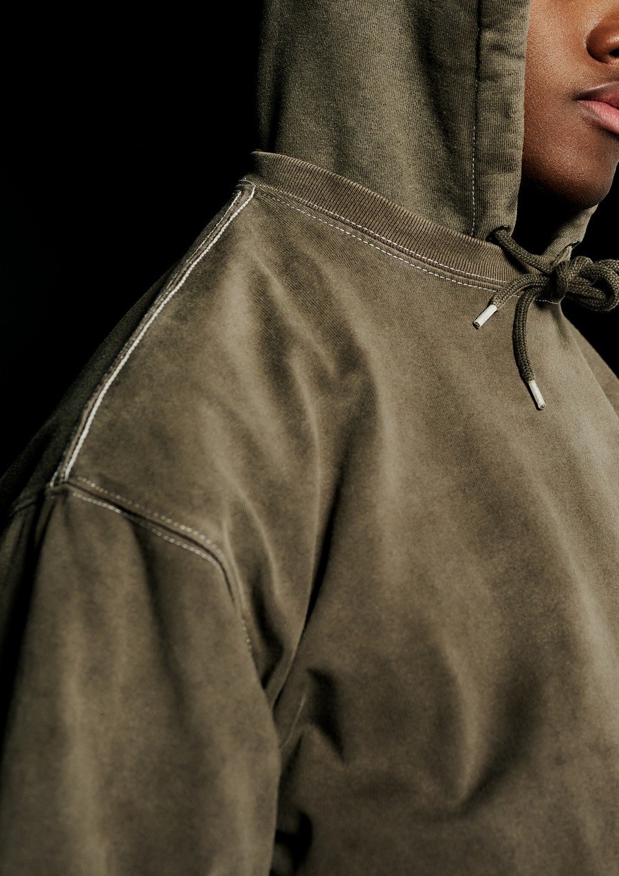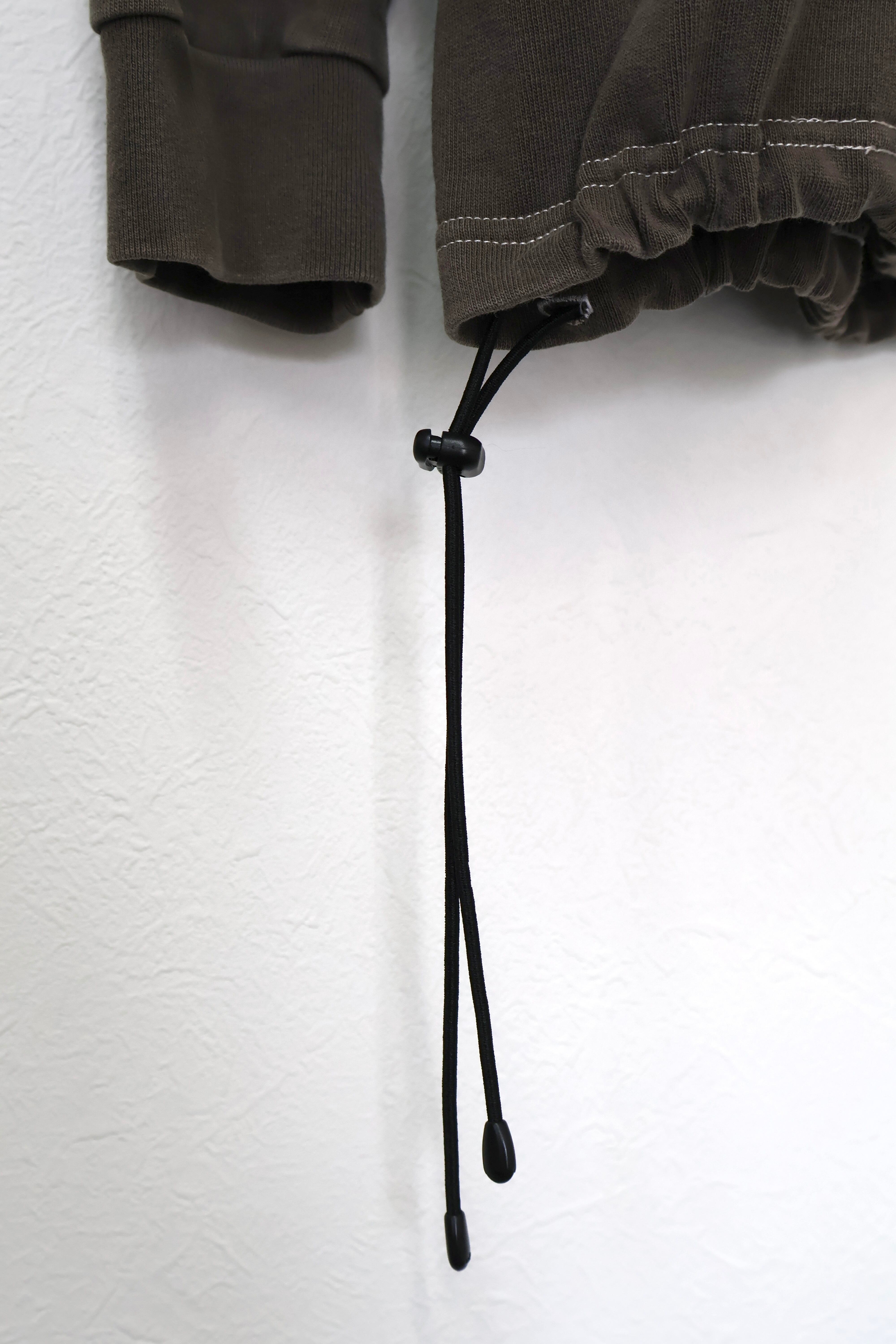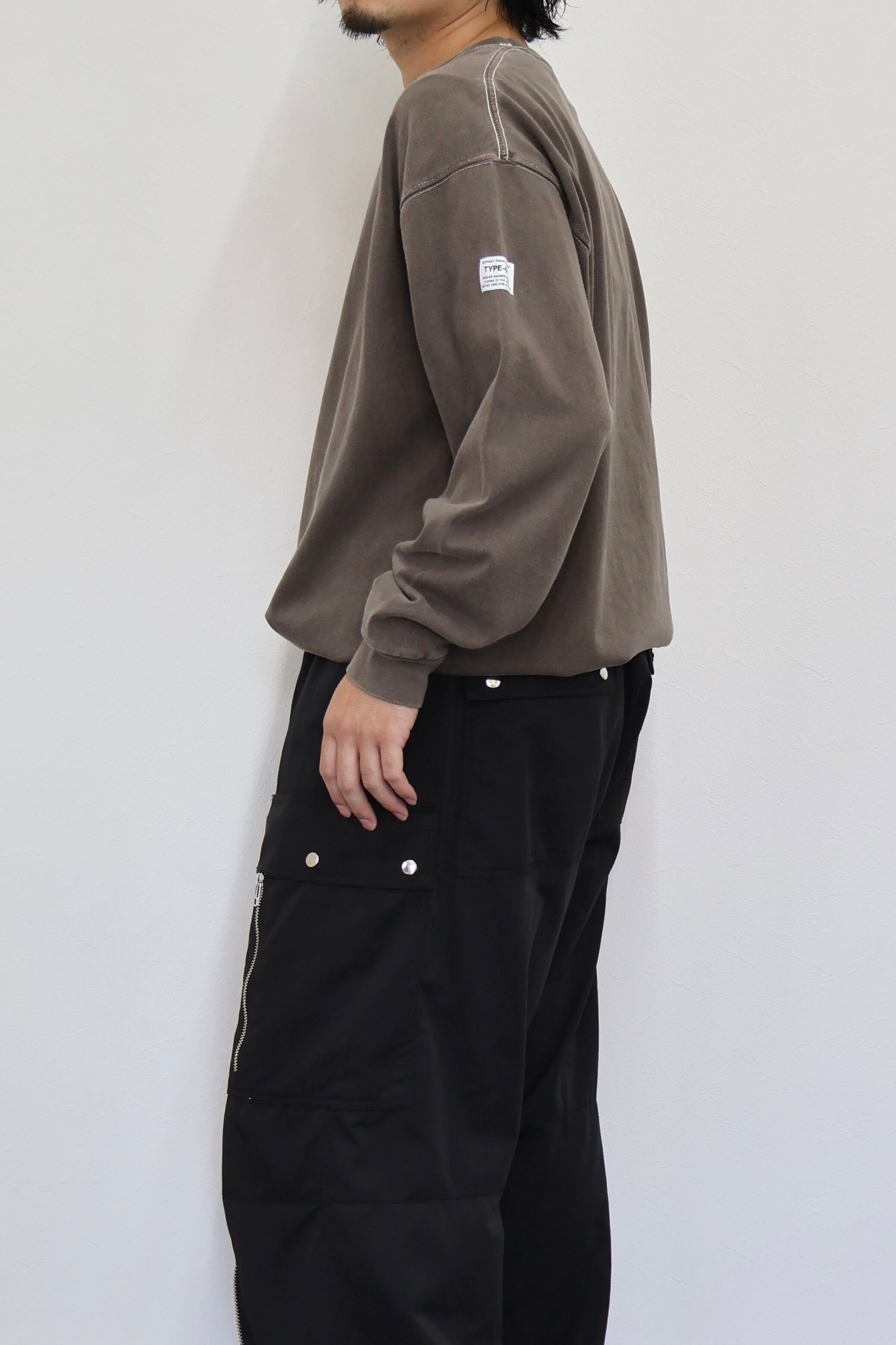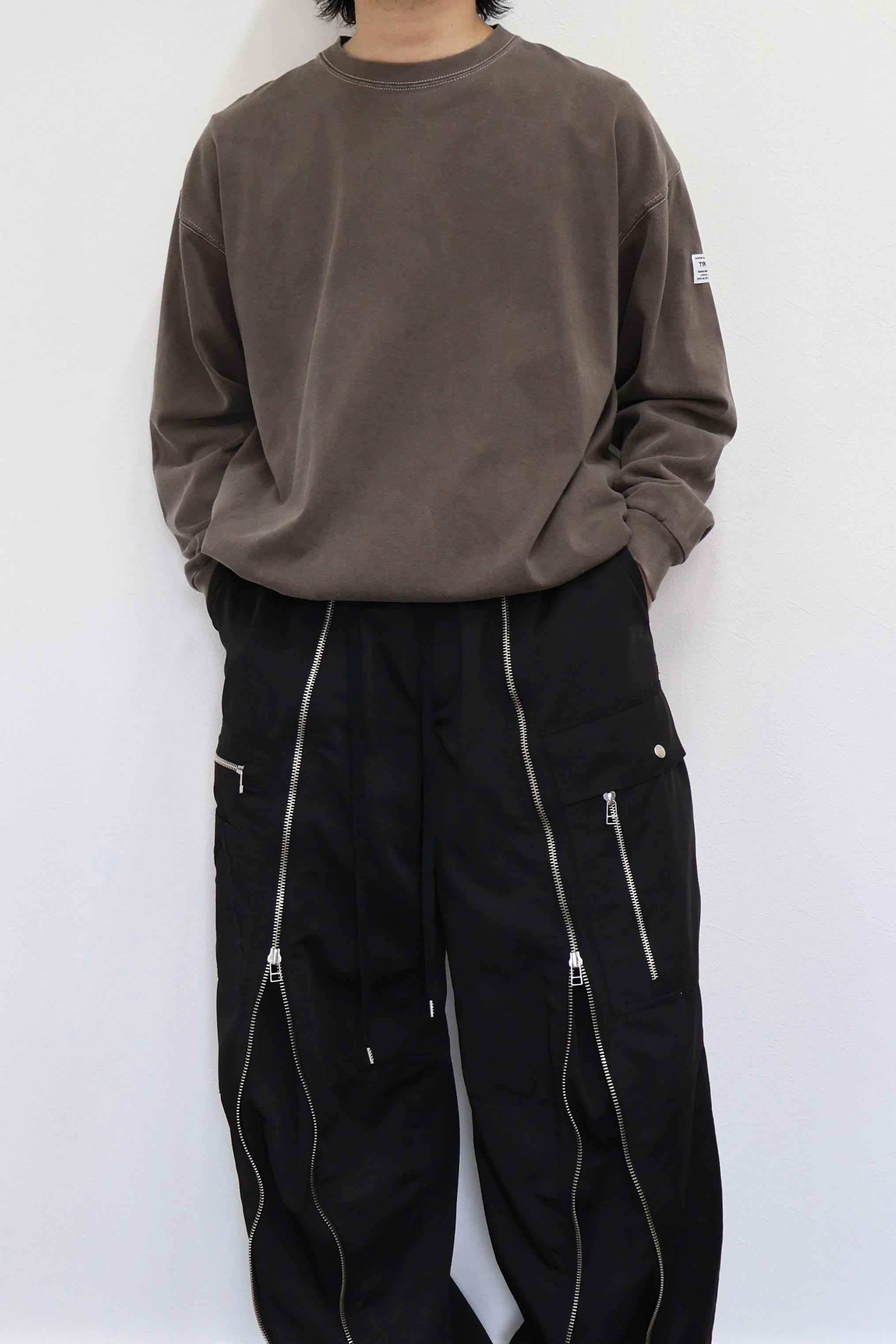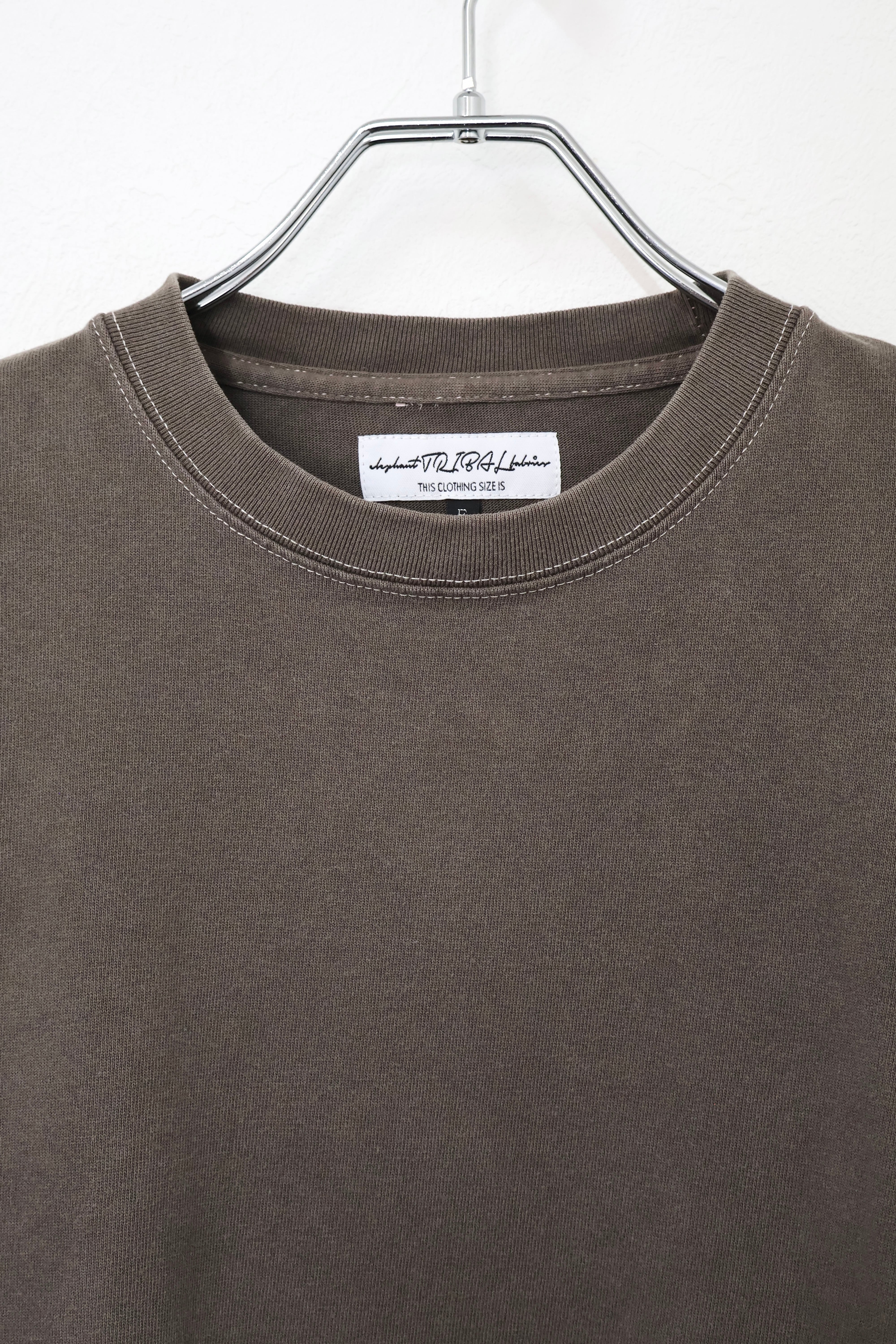 強撚糸を使用したシャリ感のあるヘビーオンスなLong T-SH。身幅にゆとりを持たせたボックスシルエット。製品後、硫化染めを施しさらにブリーチをナノサイズにしたミストで追い加工を施した細かなフェード感のあるアイテム。裾部分にはアジャスター付きドローコードを配置しシルエット変更が可能。