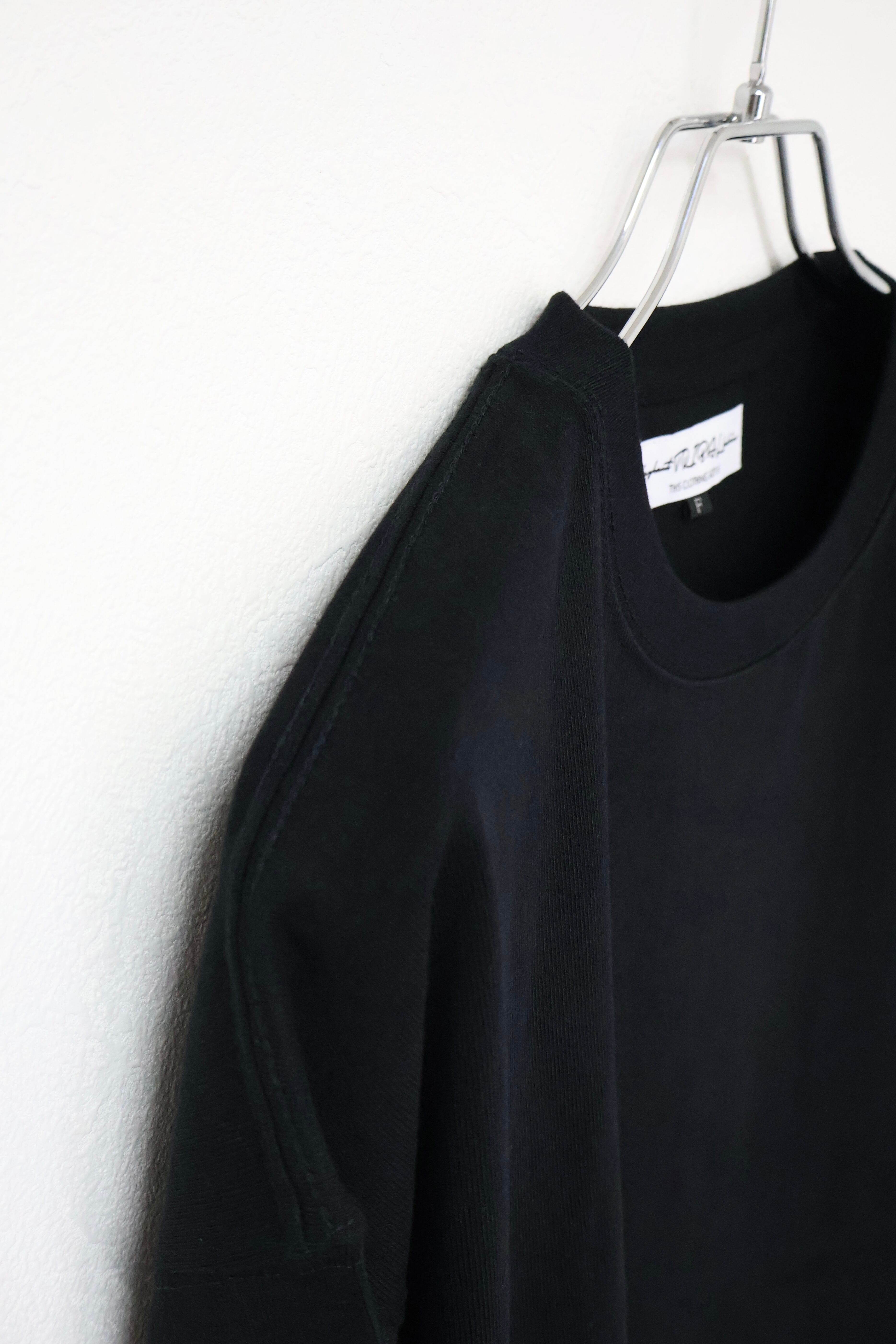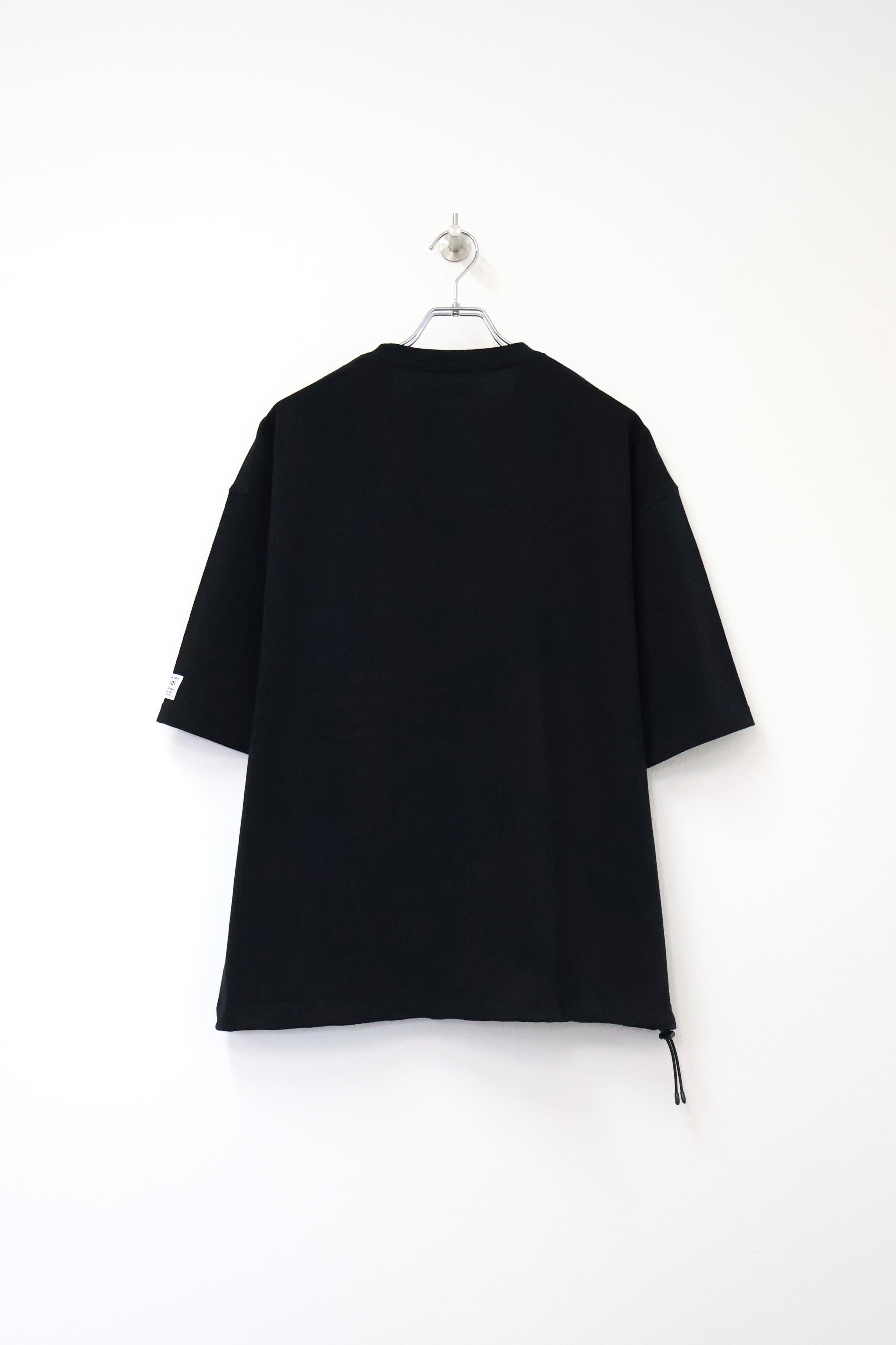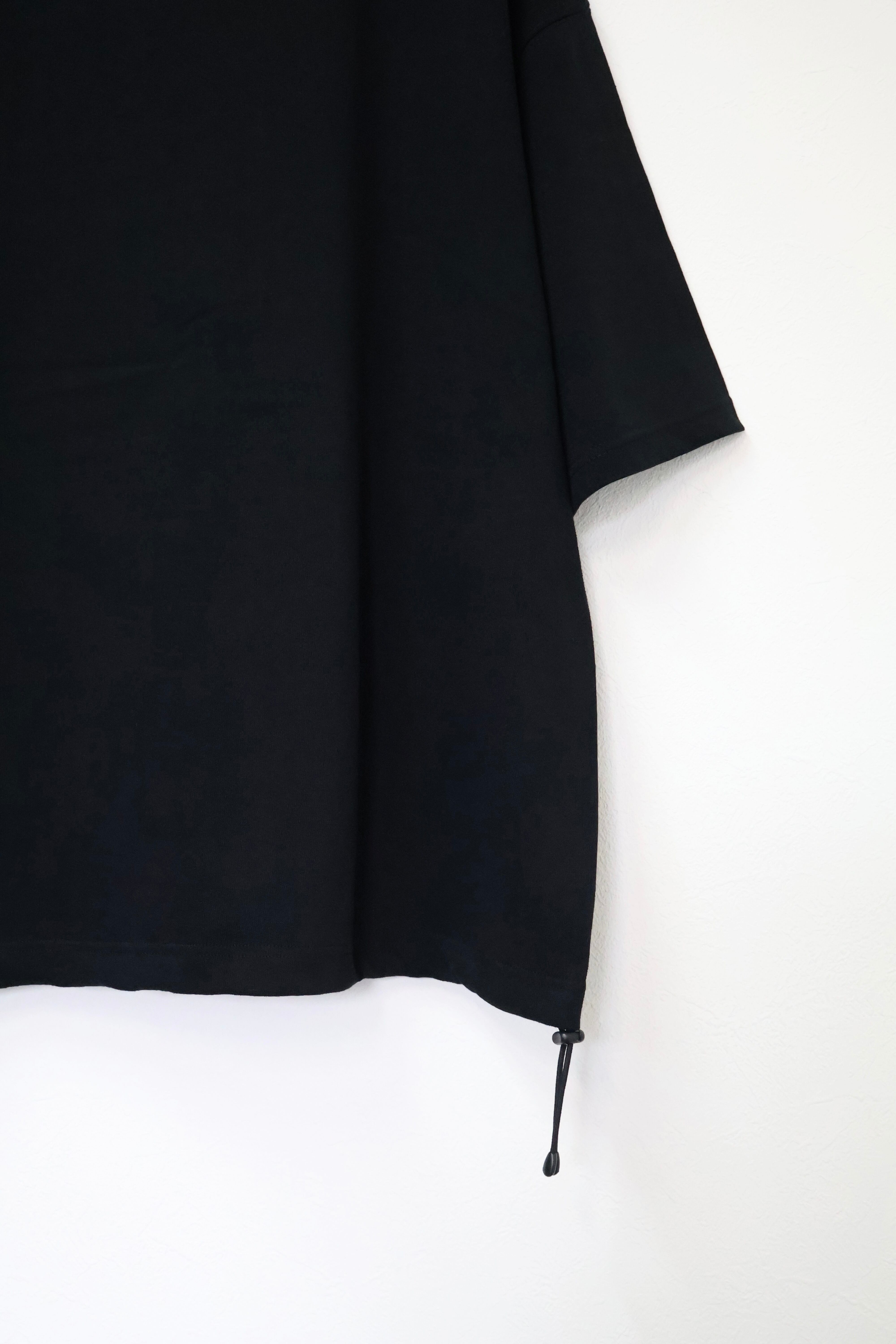 定番で展開している身幅にゆとりをもたせたボックスシルエットのアイテム。素材には強撚糸を使用したシャリ感のあるヘビーオンスコットン天竺を使用。裾部分にはアジャスター付きドローコードを配置しシルエット変更が可能。