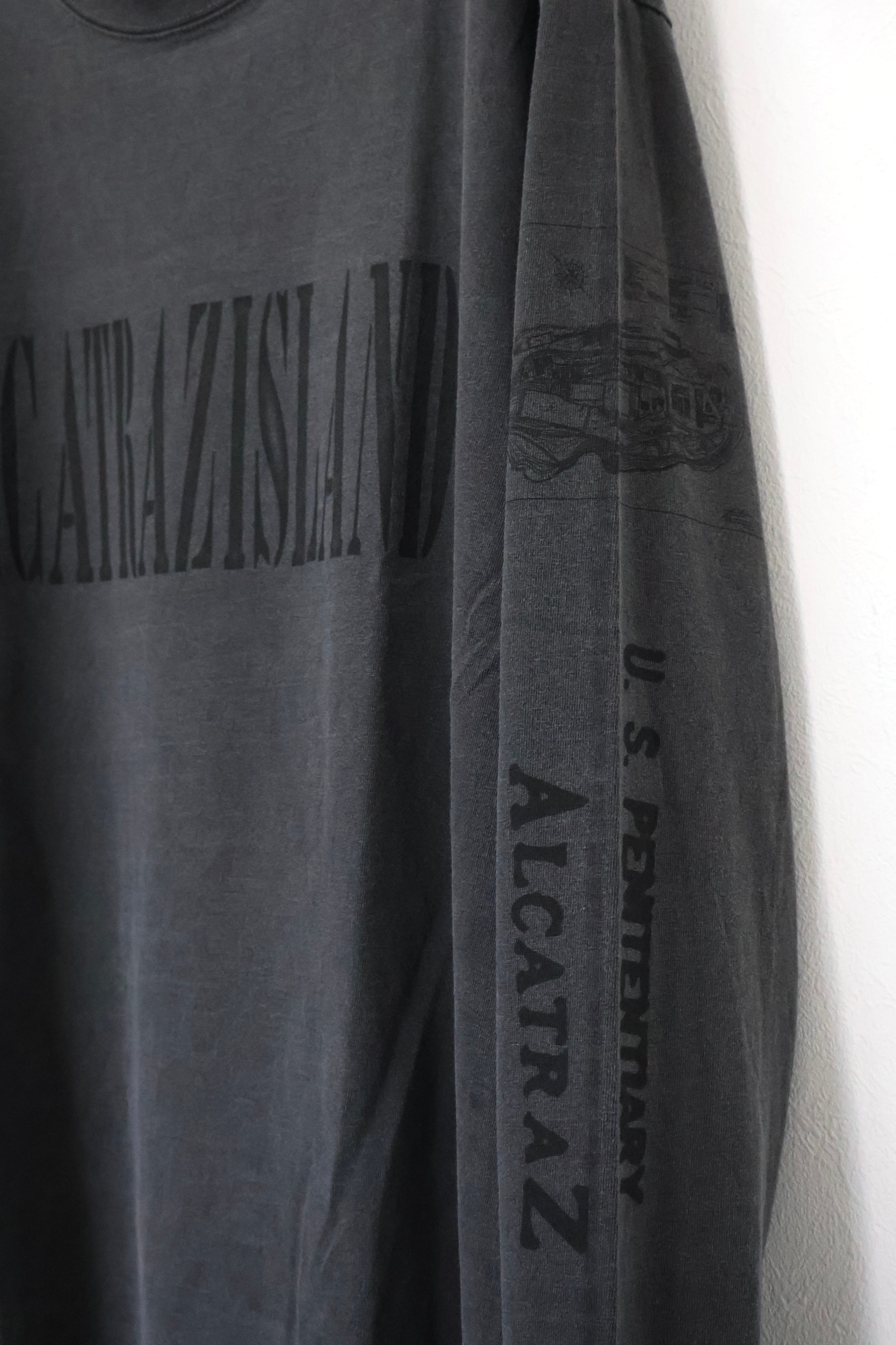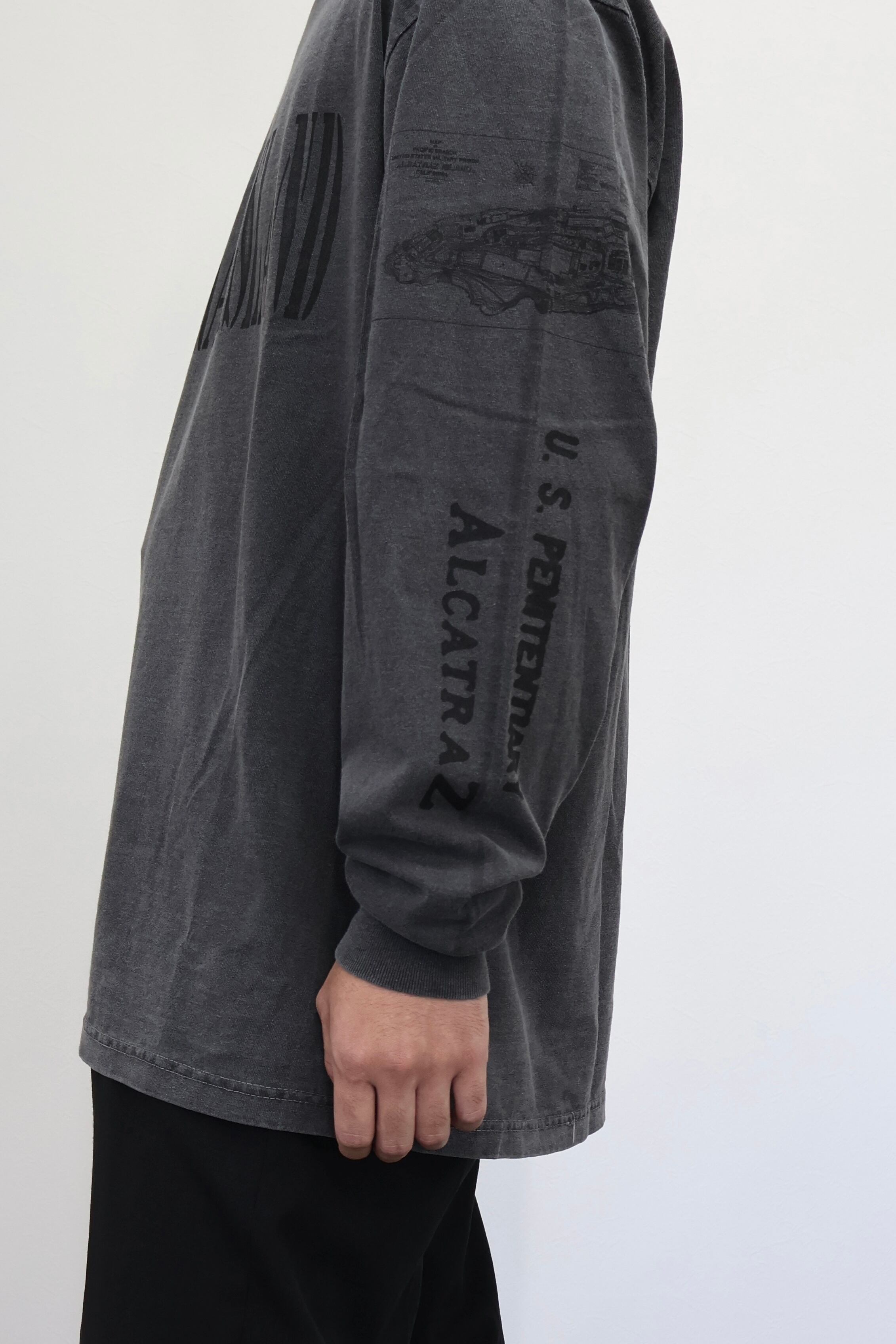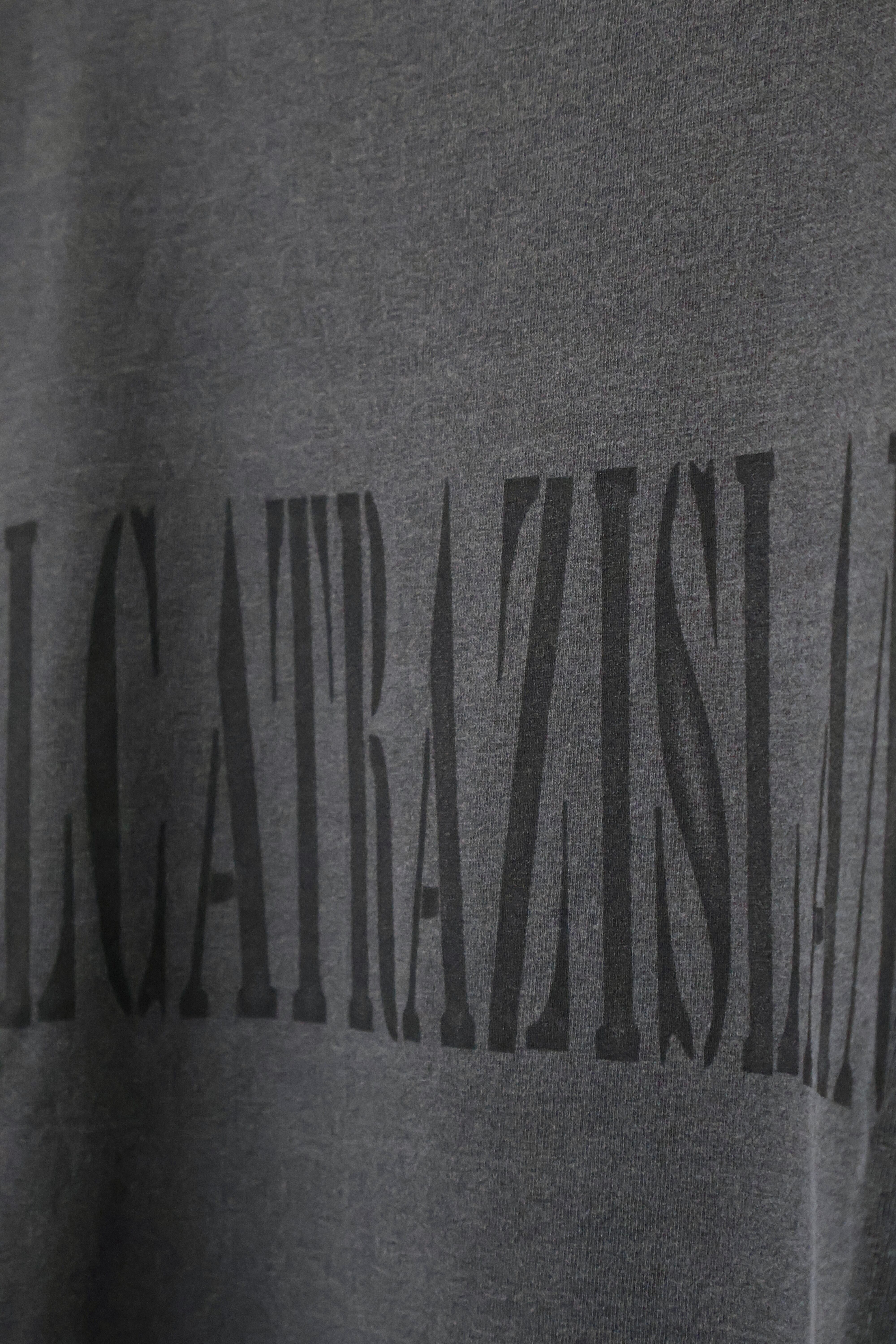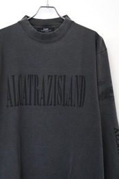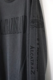 ALCATRAZ(アルカトラズ)アルカトラズ島はアメリカ合衆国カリフォルニア州のサンフランシスコ湾内に浮かぶ小島である。昔は灯台、軍事要塞、軍事監獄、そして1963年まで連邦刑務所として使用され、ザ・ロック、囚人島、監獄島とも呼ばれていた。アルカトラズのスーヴェニアTシャツをモチーフにデザイン。フロントはアルカトラズ島のステンシル、袖には地図とセキュリティ施設の文字をプリントしている。
