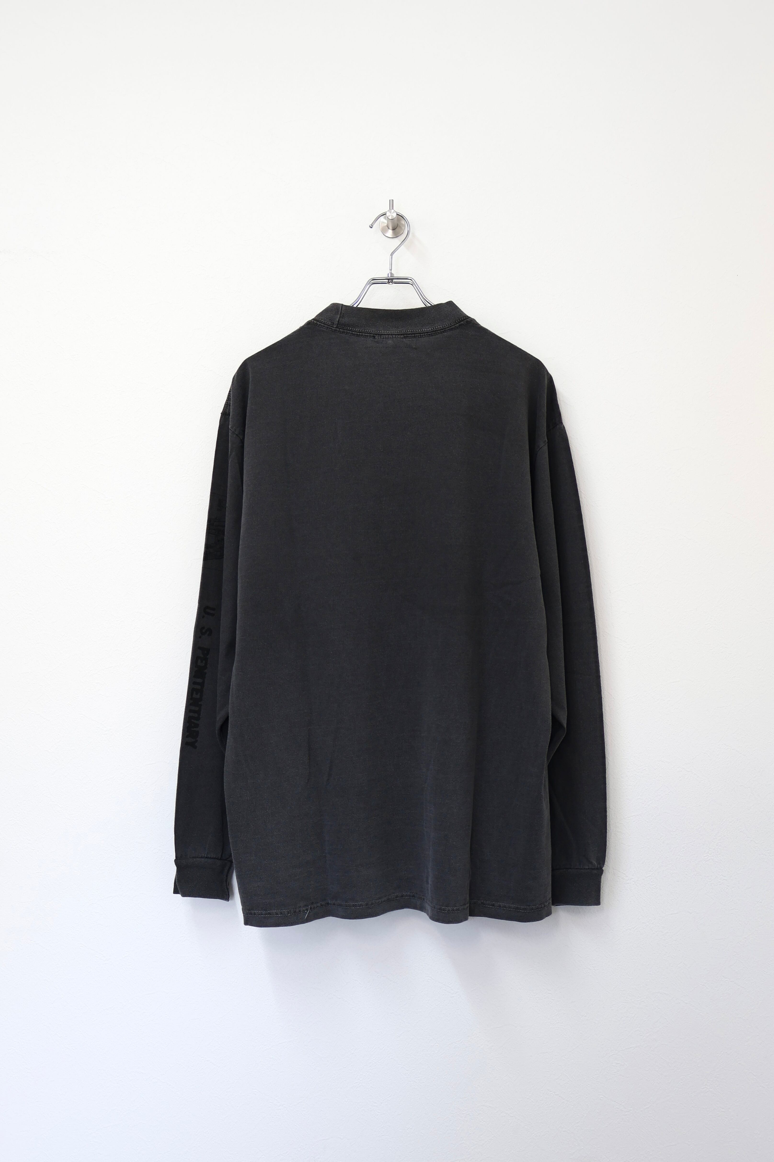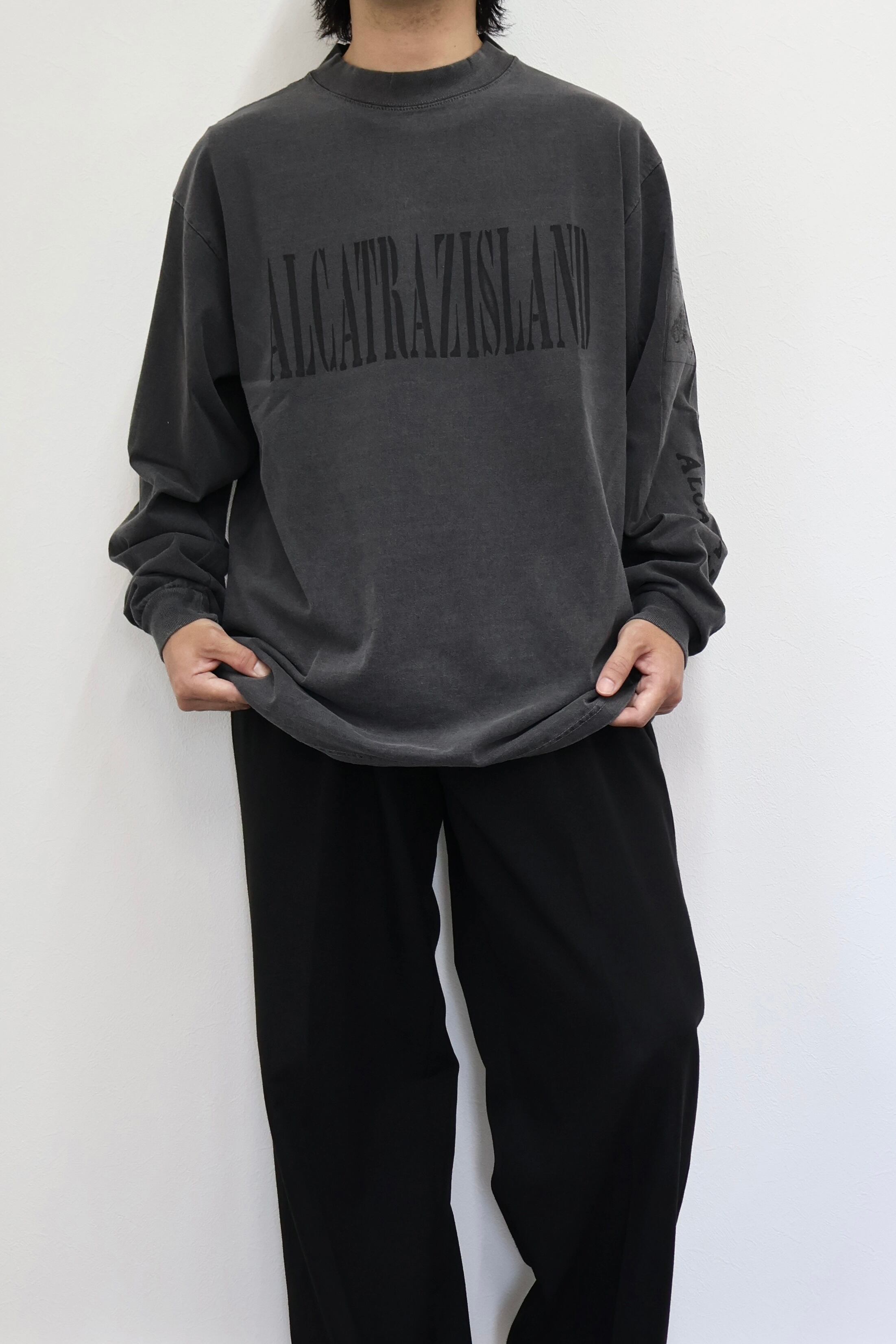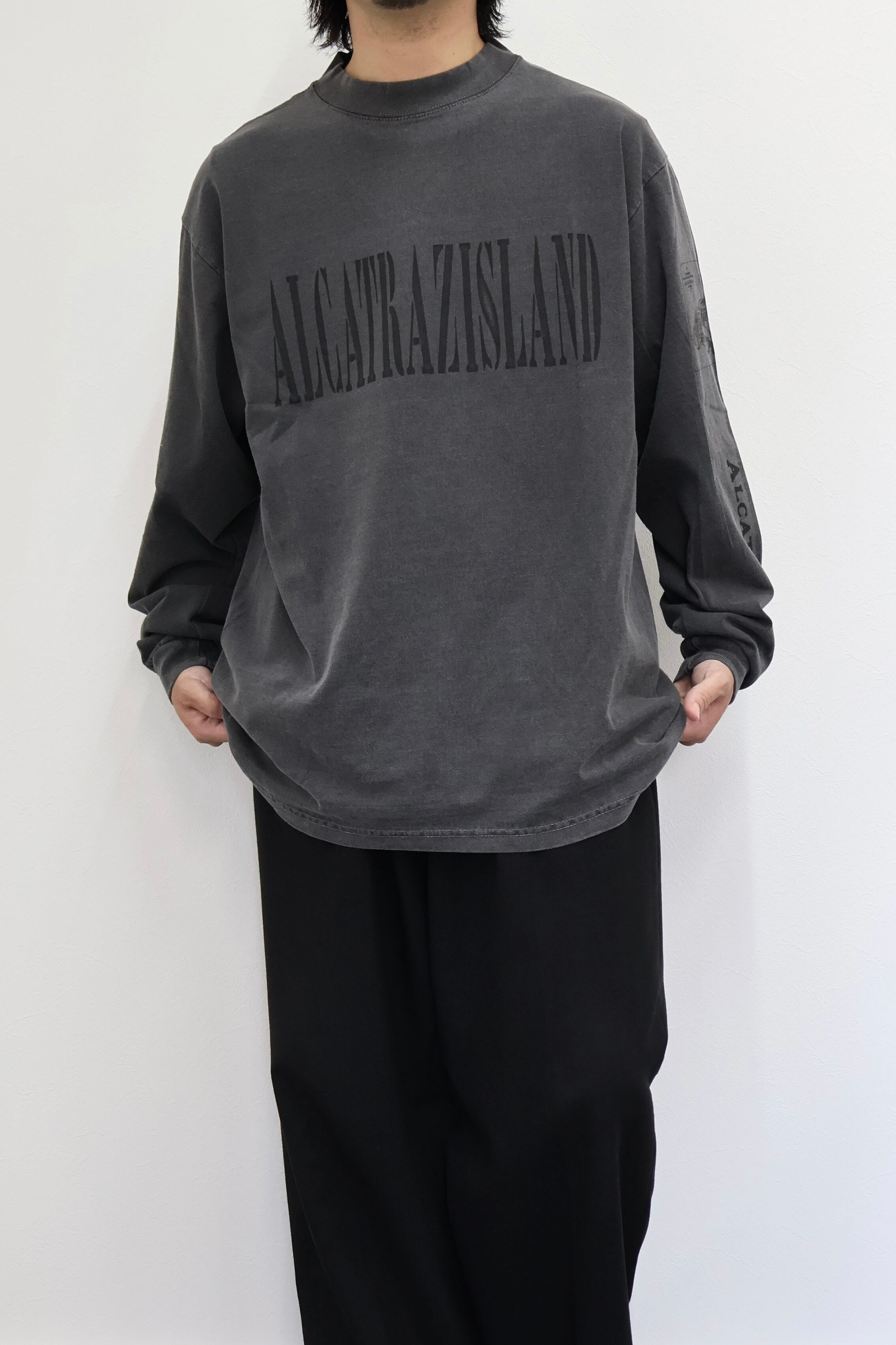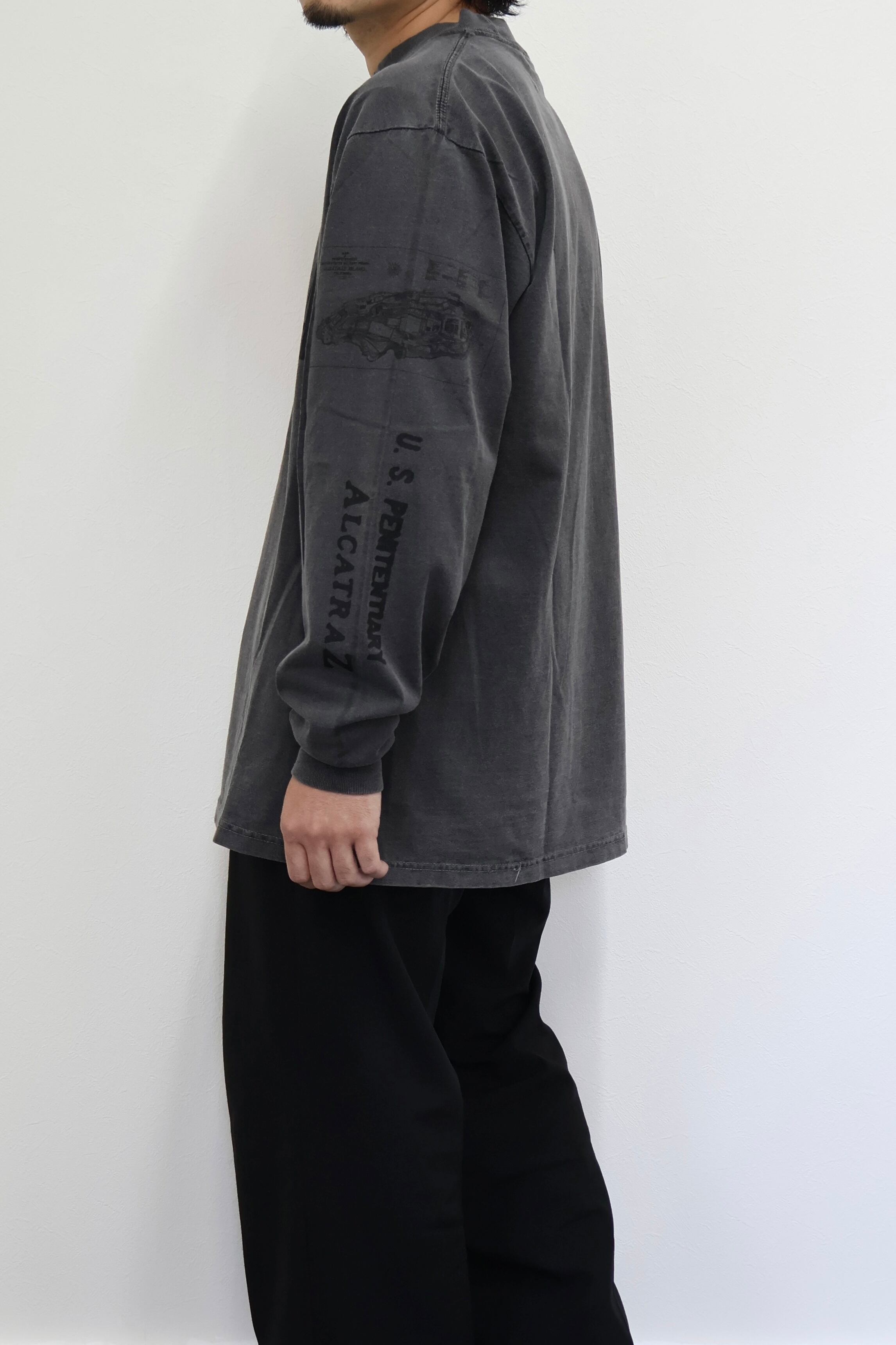 ALCATRAZ(アルカトラズ)アルカトラズ島はアメリカ合衆国カリフォルニア州のサンフランシスコ湾内に浮かぶ小島である。昔は灯台、軍事要塞、軍事監獄、そして1963年まで連邦刑務所として使用され、ザ・ロック、囚人島、監獄島とも呼ばれていた。アルカトラズのスーヴェニアTシャツをモチーフにデザイン。フロントはアルカトラズ島のステンシル、袖には地図とセキュリティ施設の文字をプリントしている。