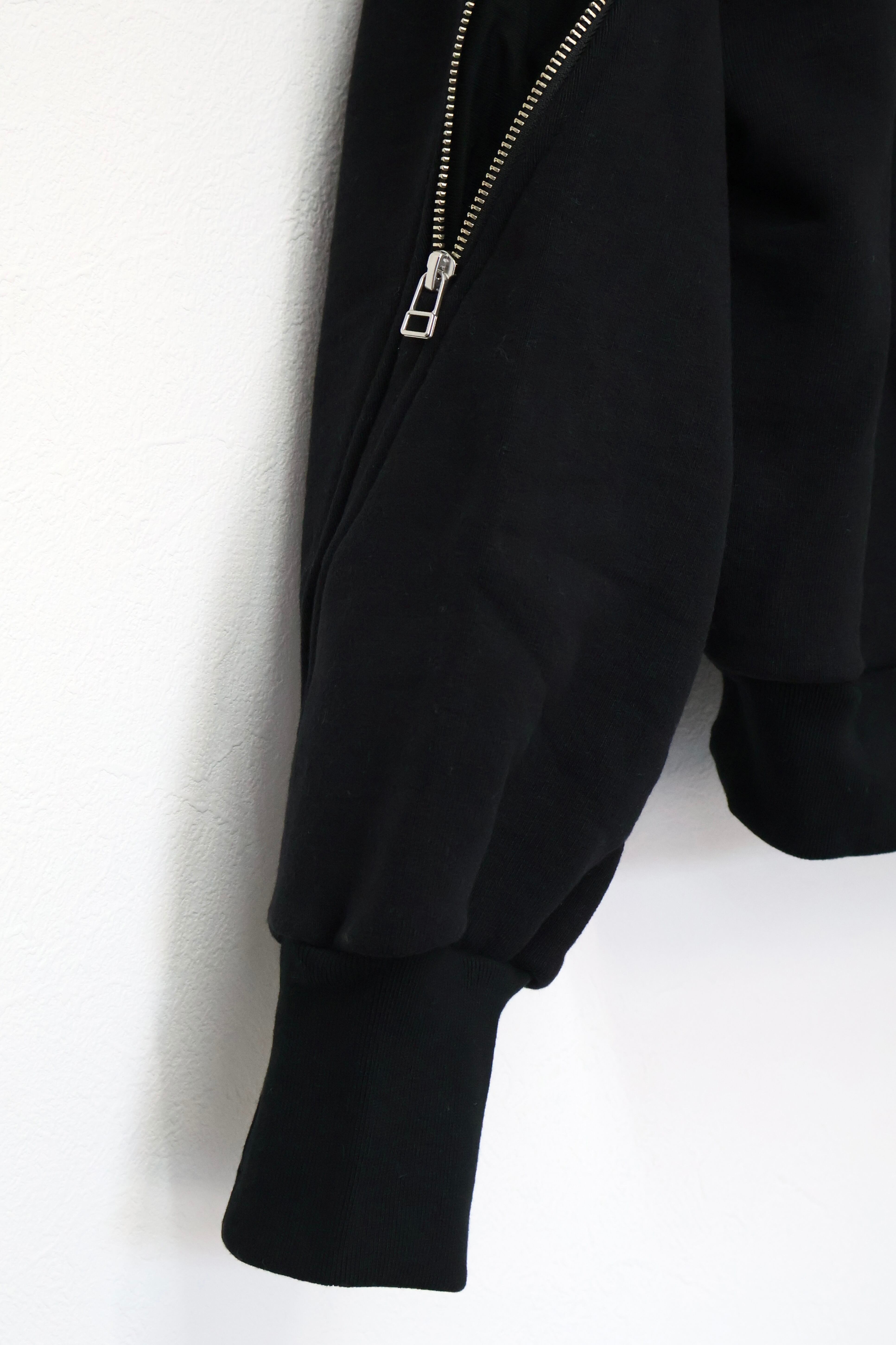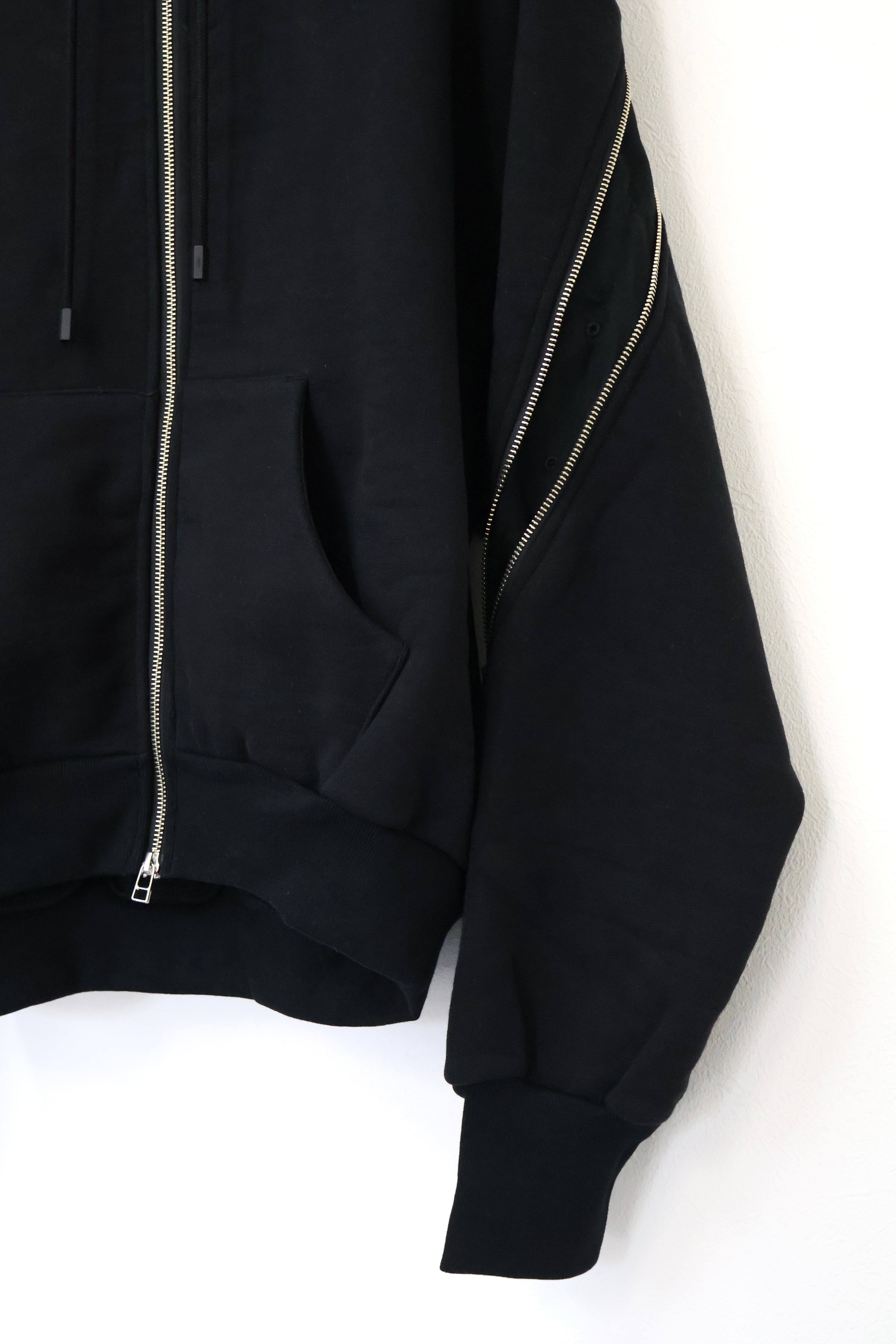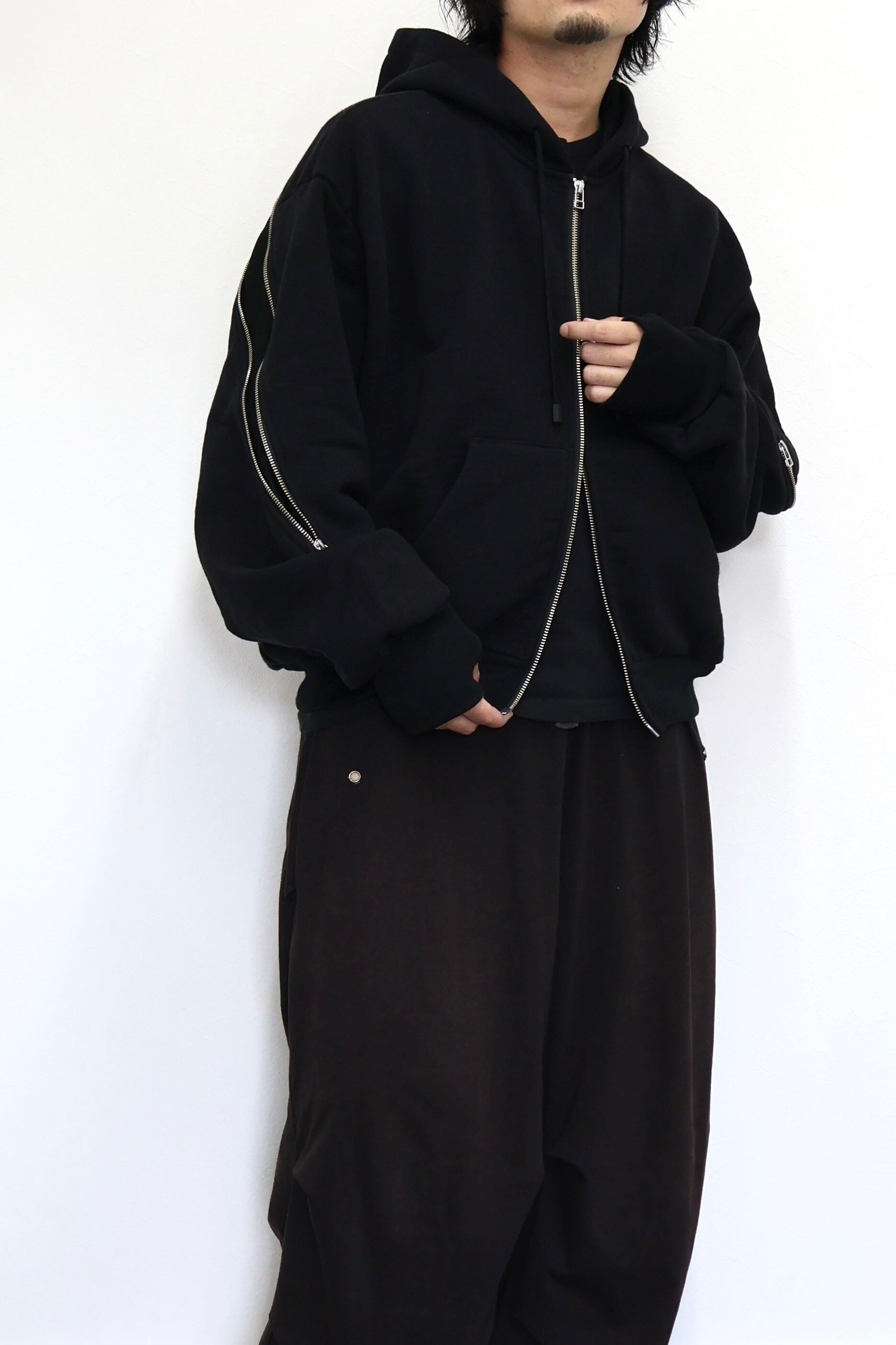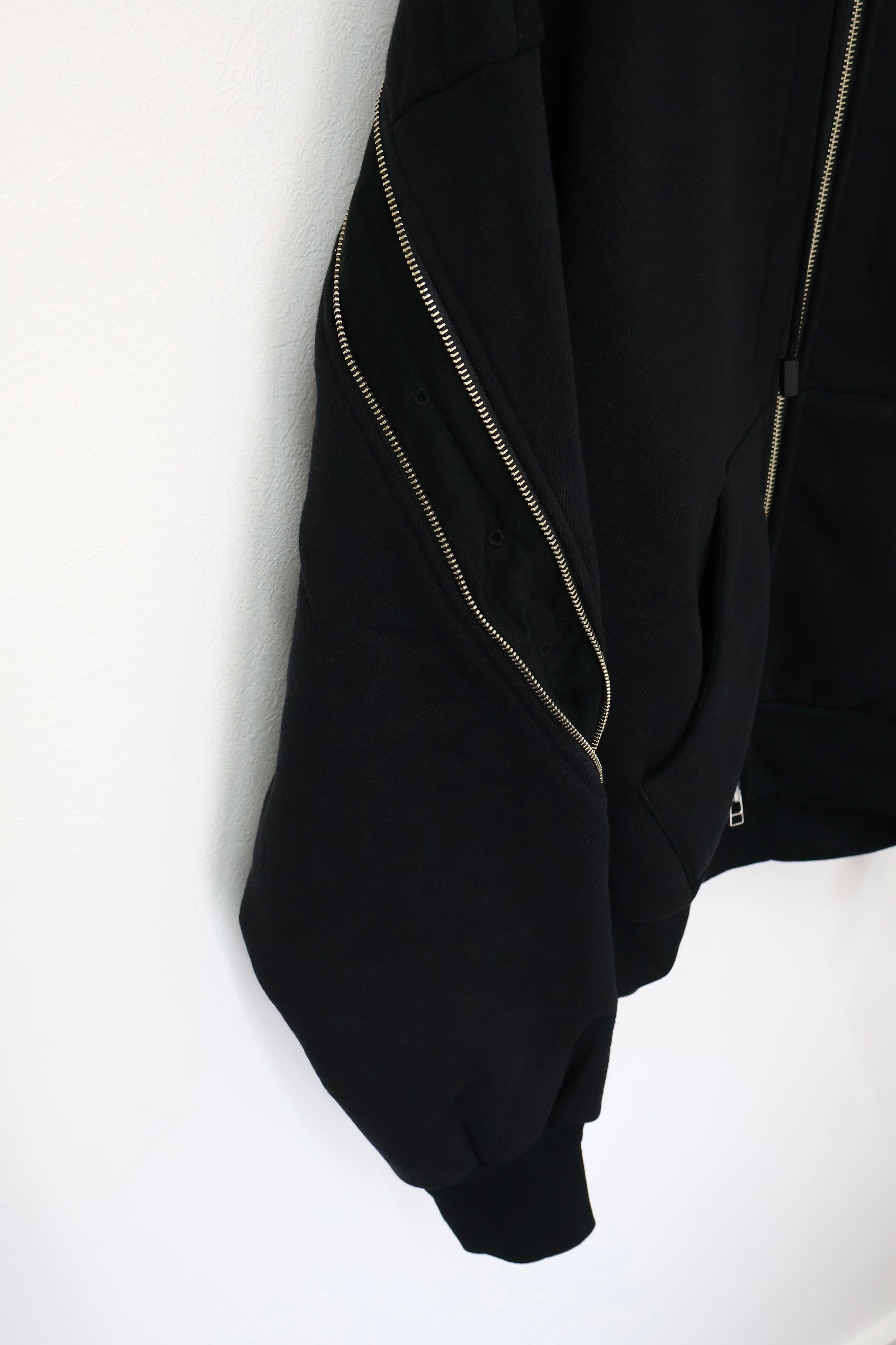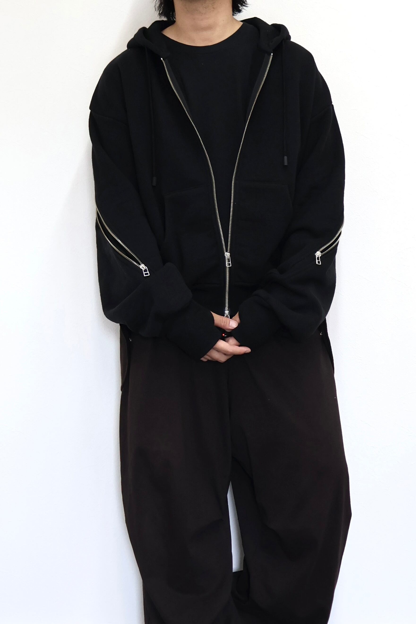 袖から背中まで繋がったジップが特徴のフルジップパーカー。 FOAMORA というクッションのような柔らかさと肉厚で心地よい着心地を持つオリジナル素材を使用。 背中のジップを開閉することでシルエットを調整可能。 身幅は広め、着丈は短めのシルエット。 袖口のリブには指抜きを配している。