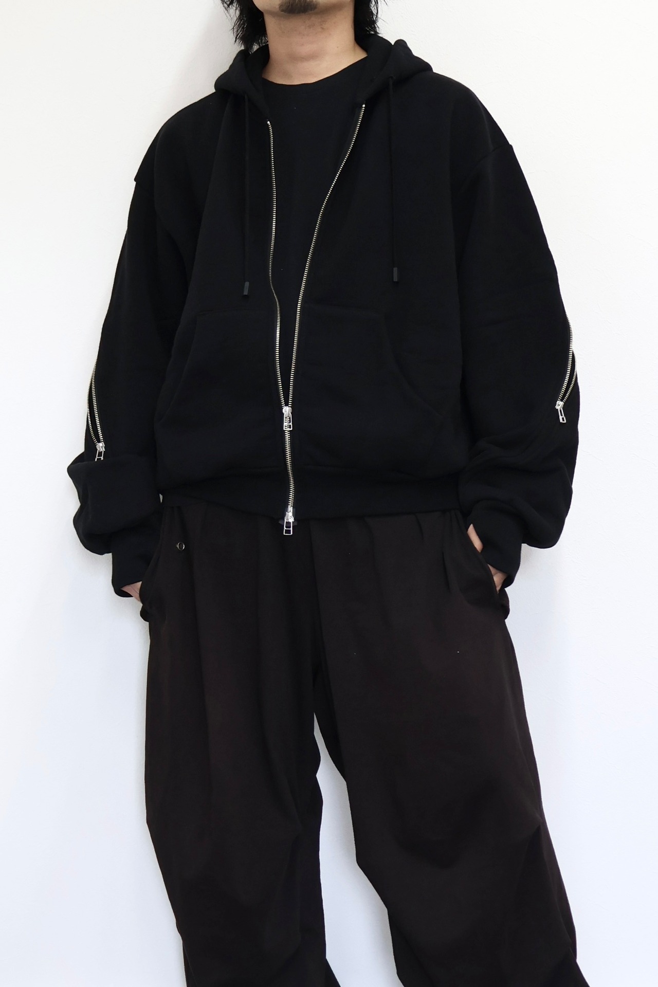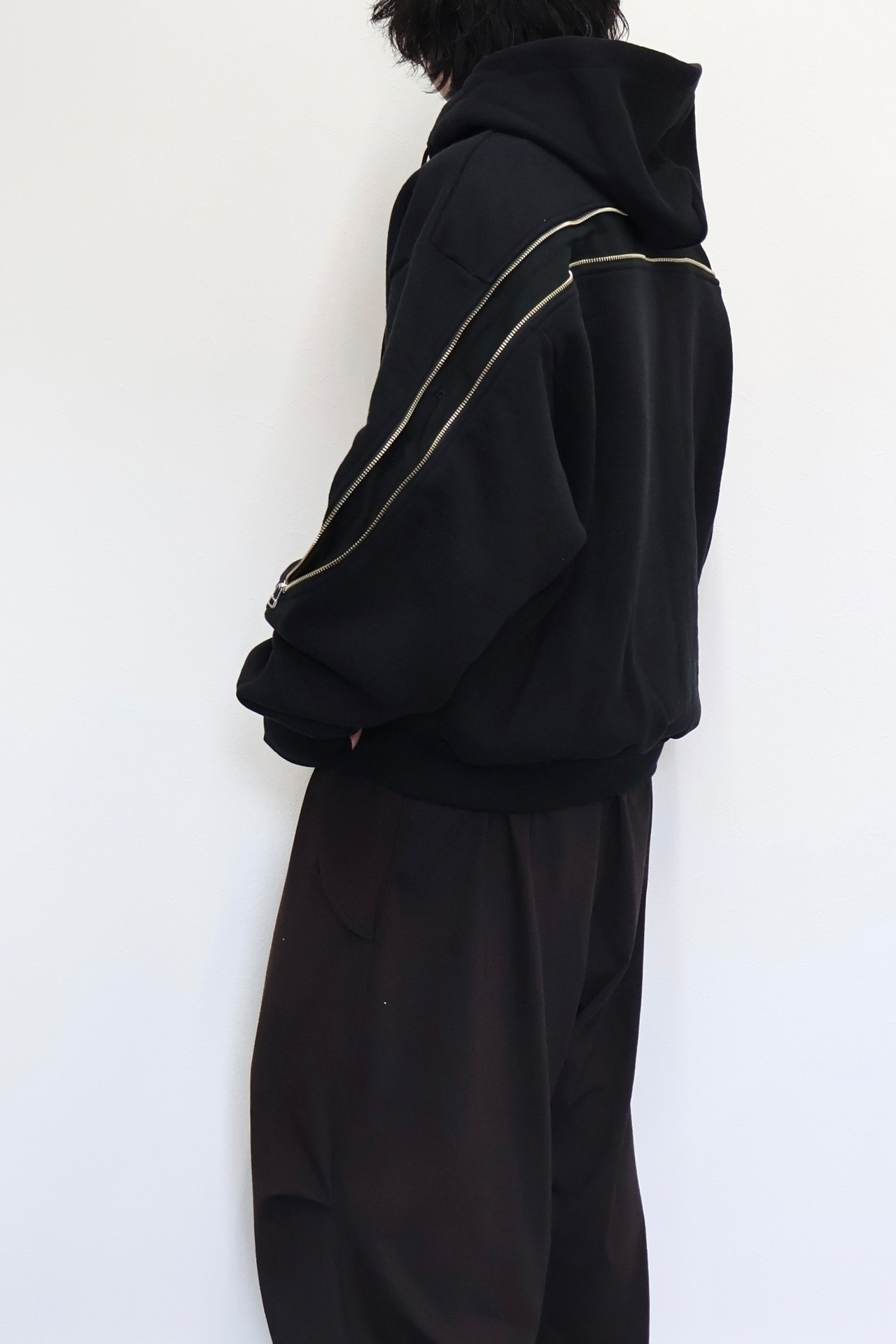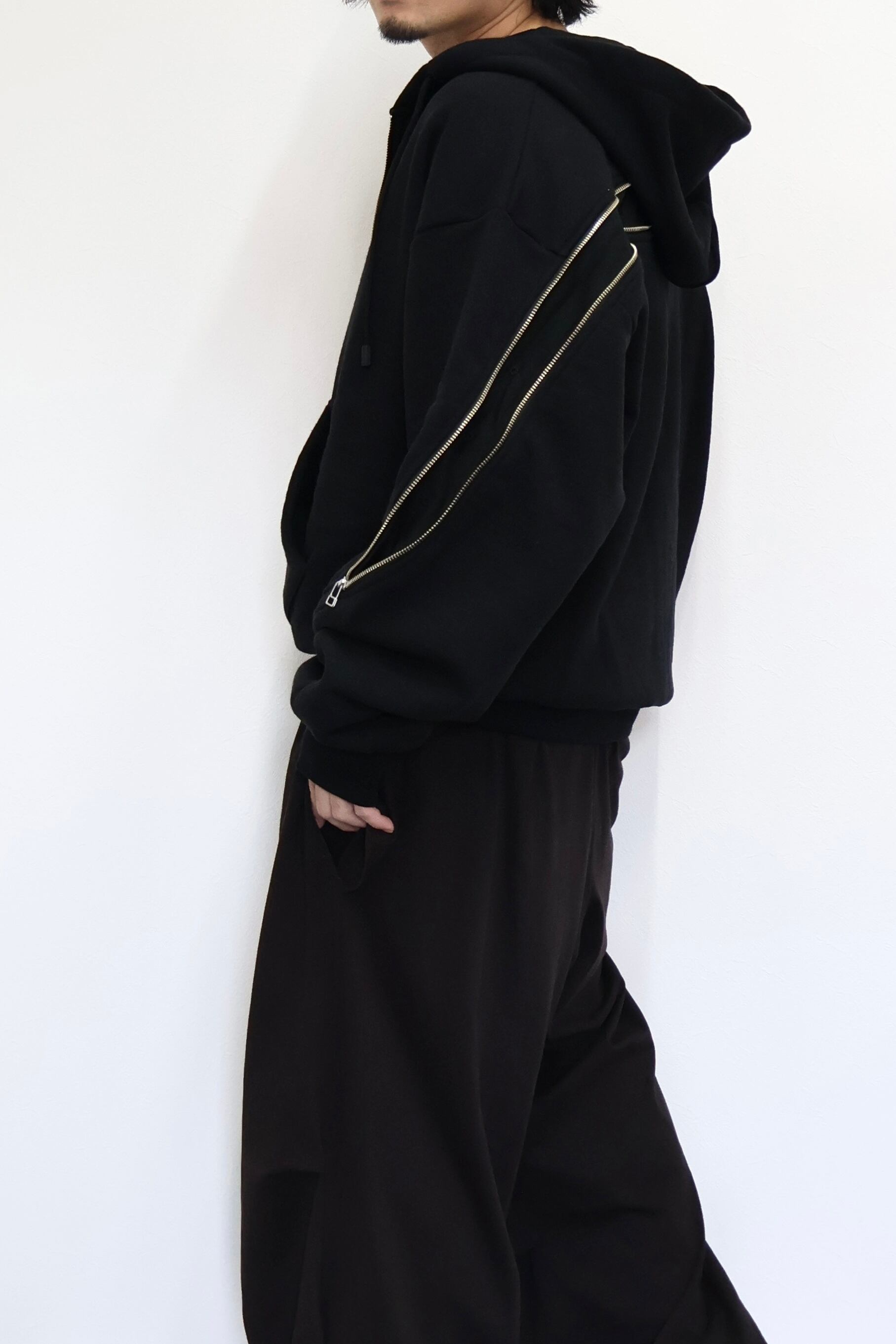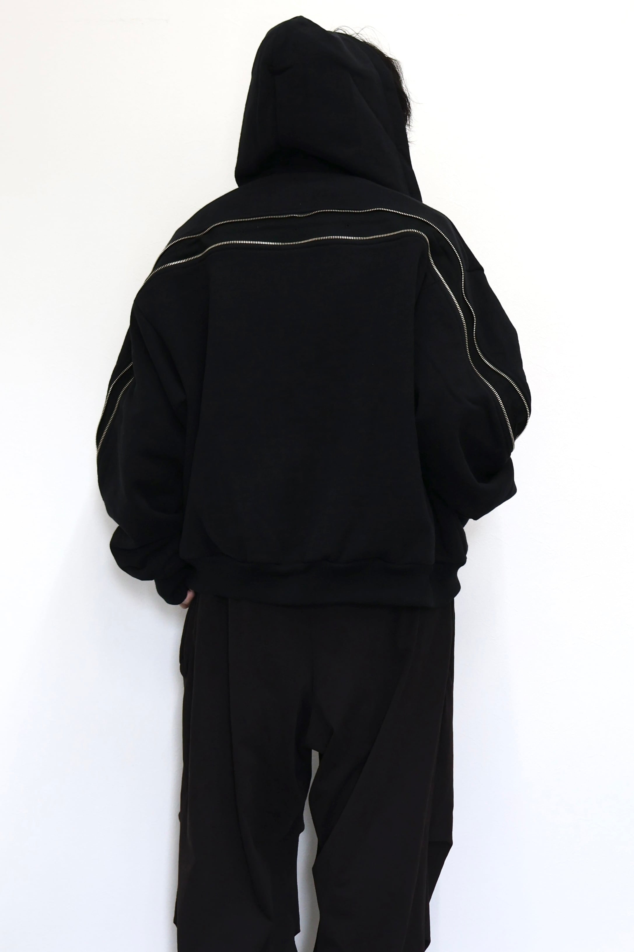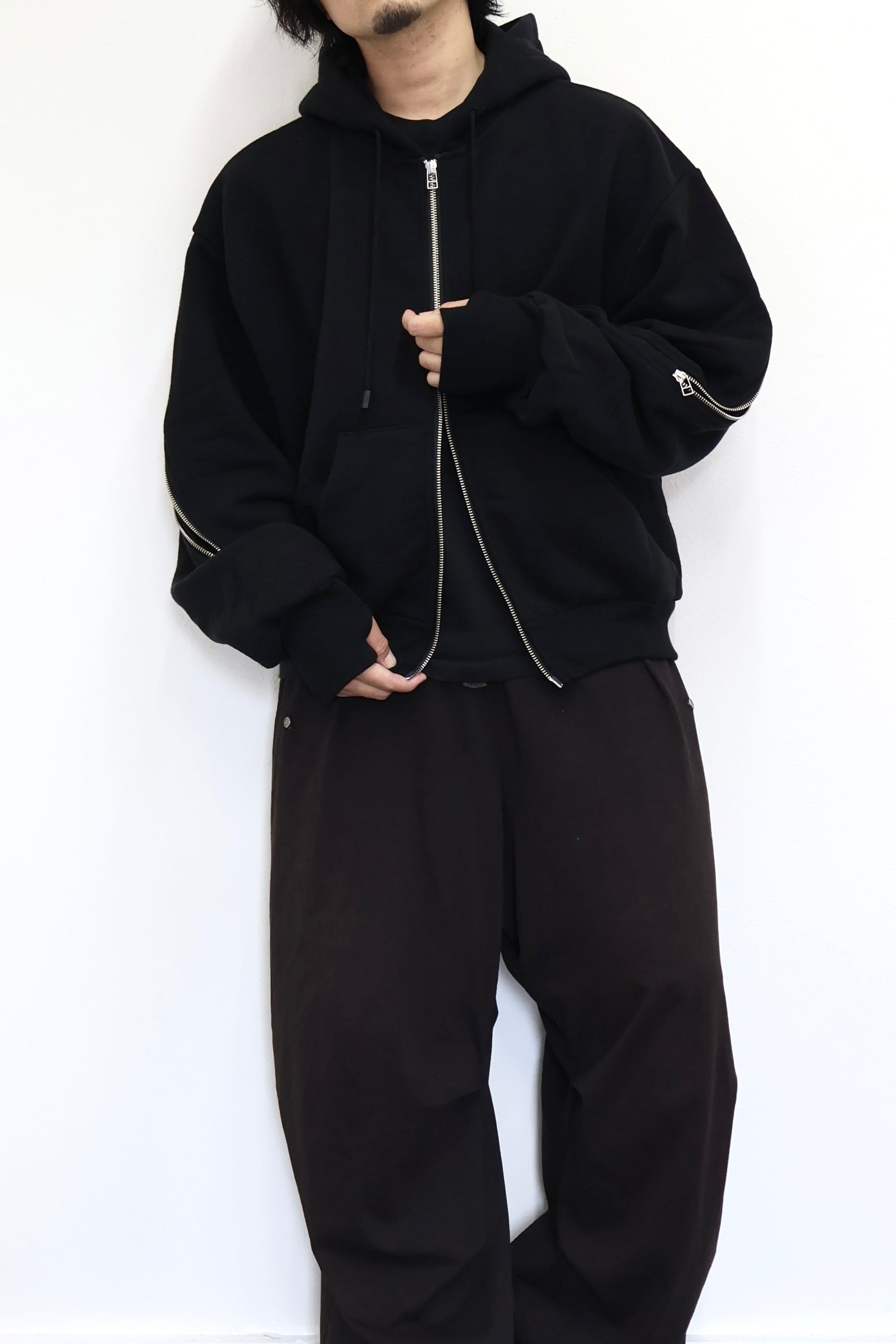 袖から背中まで繋がったジップが特徴のフルジップパーカー。 FOAMORA というクッションのような柔らかさと肉厚で心地よい着心地を持つオリジナル素材を使用。 背中のジップを開閉することでシルエットを調整可能。 身幅は広め、着丈は短めのシルエット。 袖口のリブには指抜きを配している。