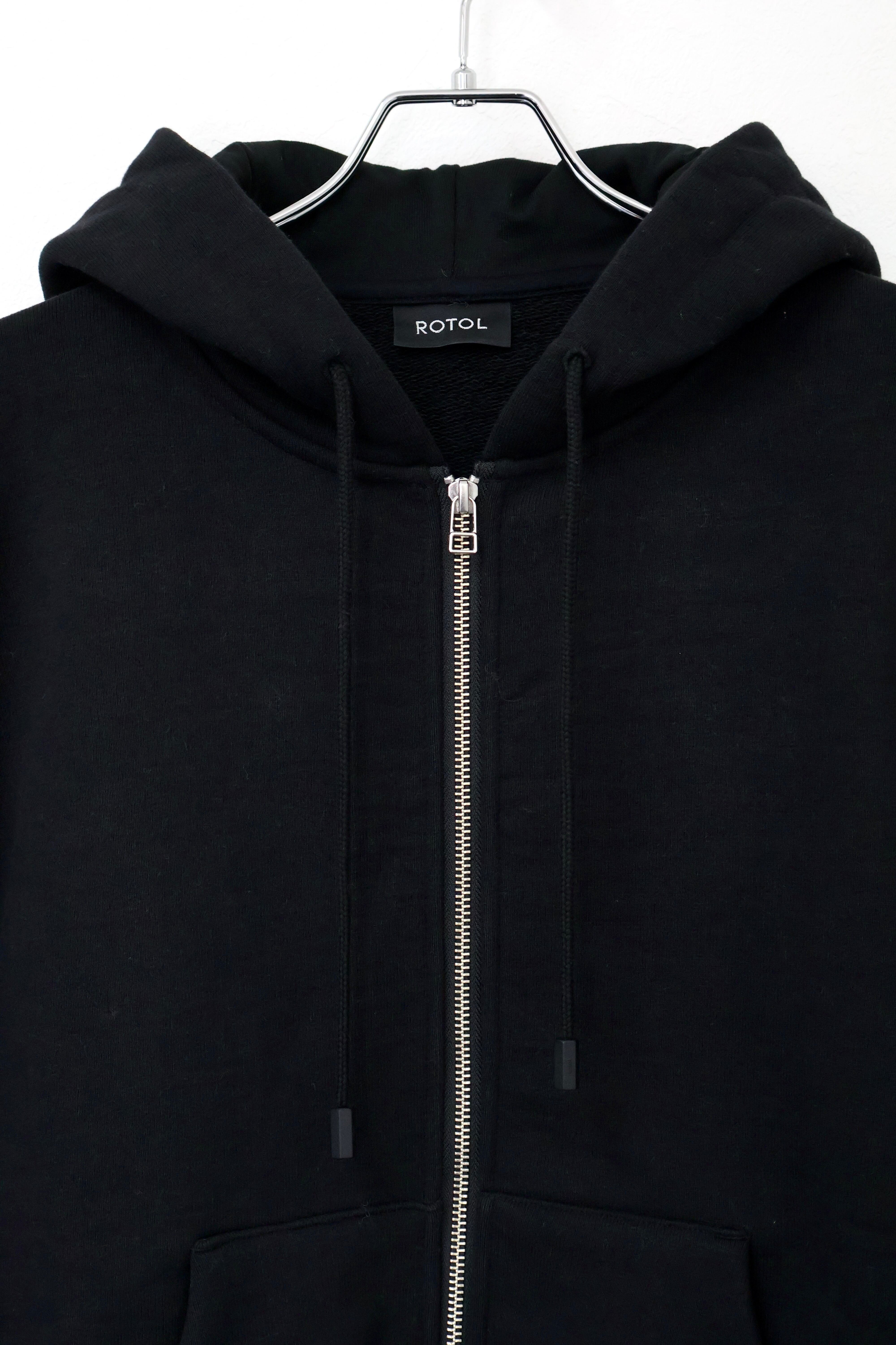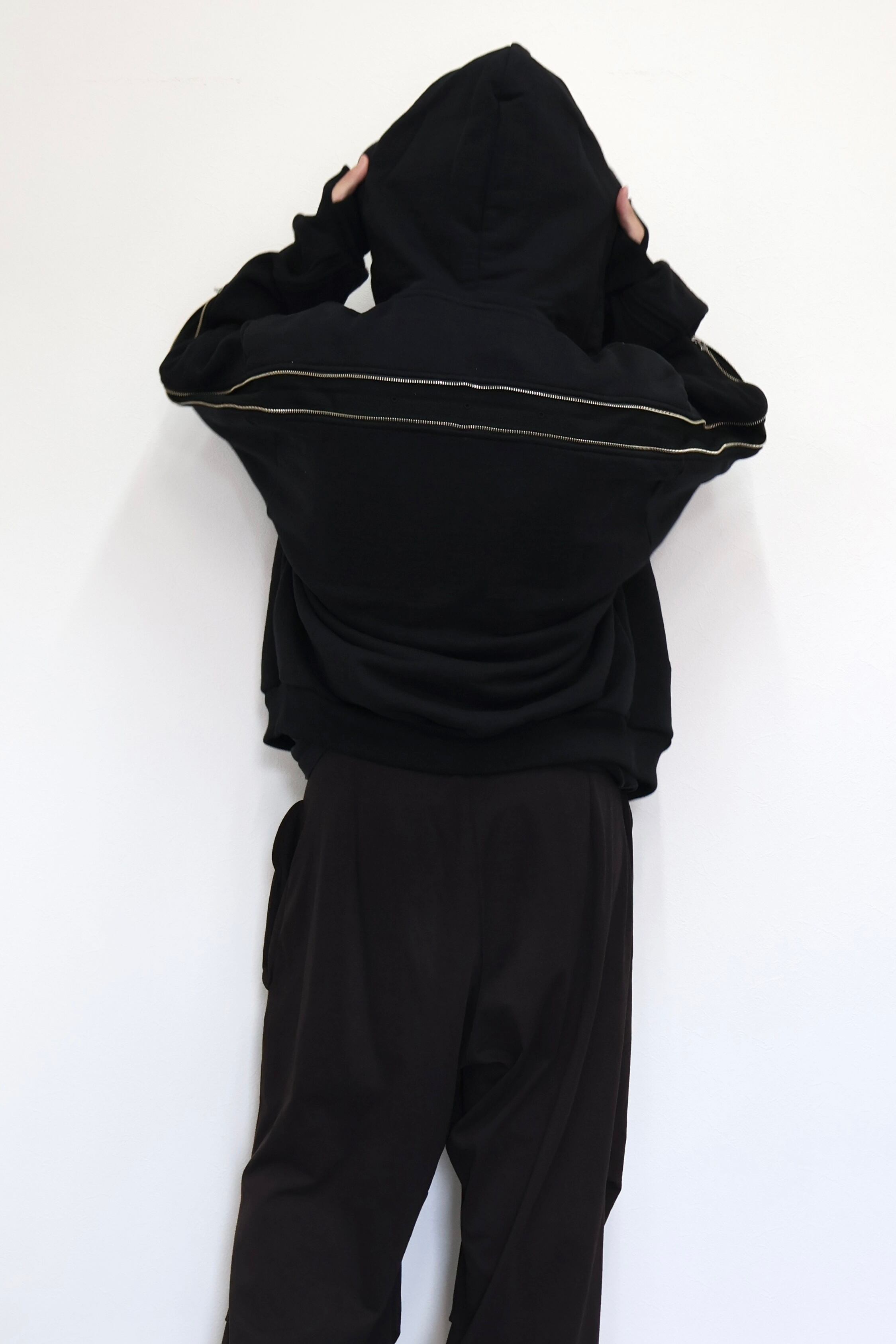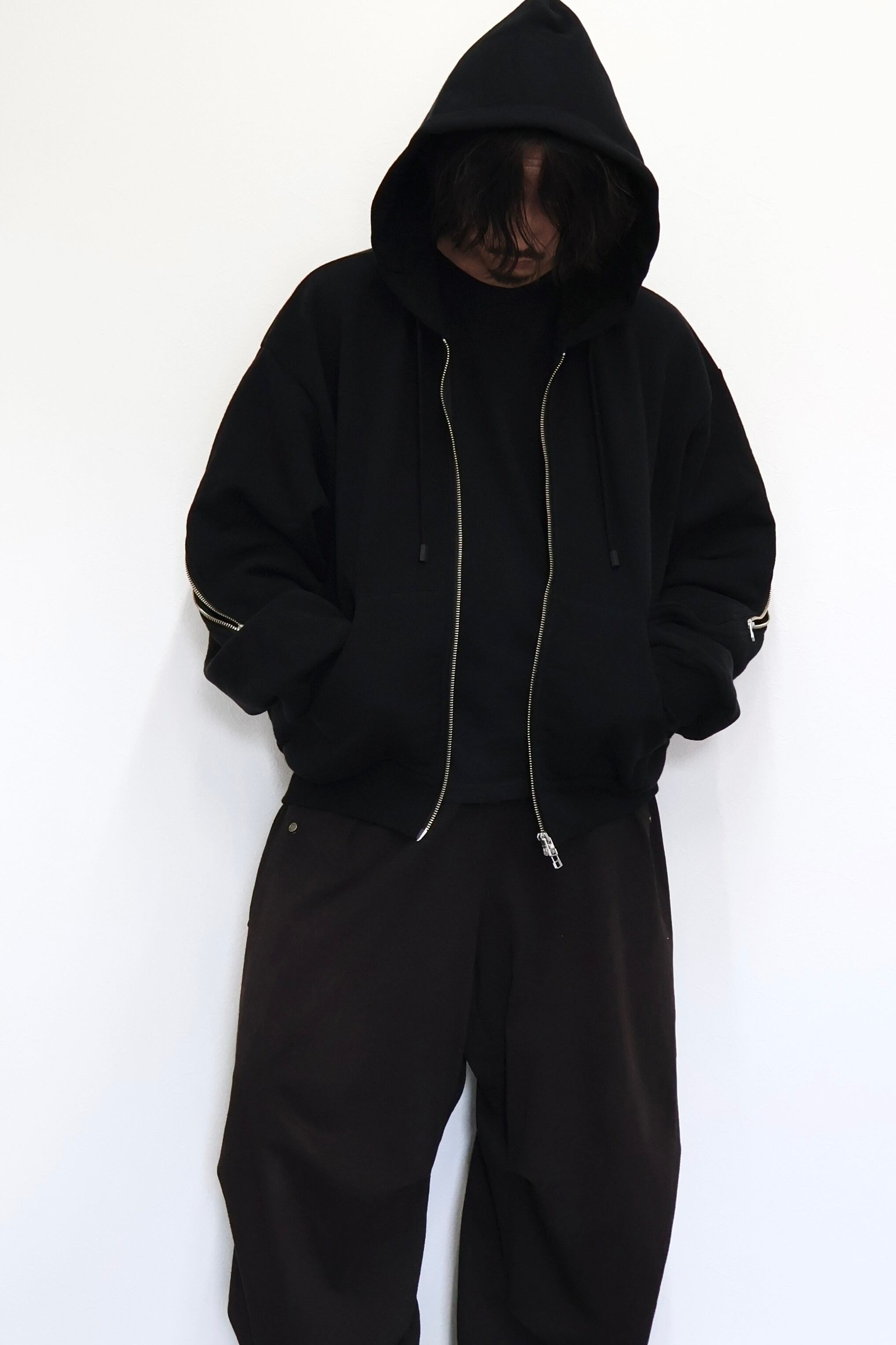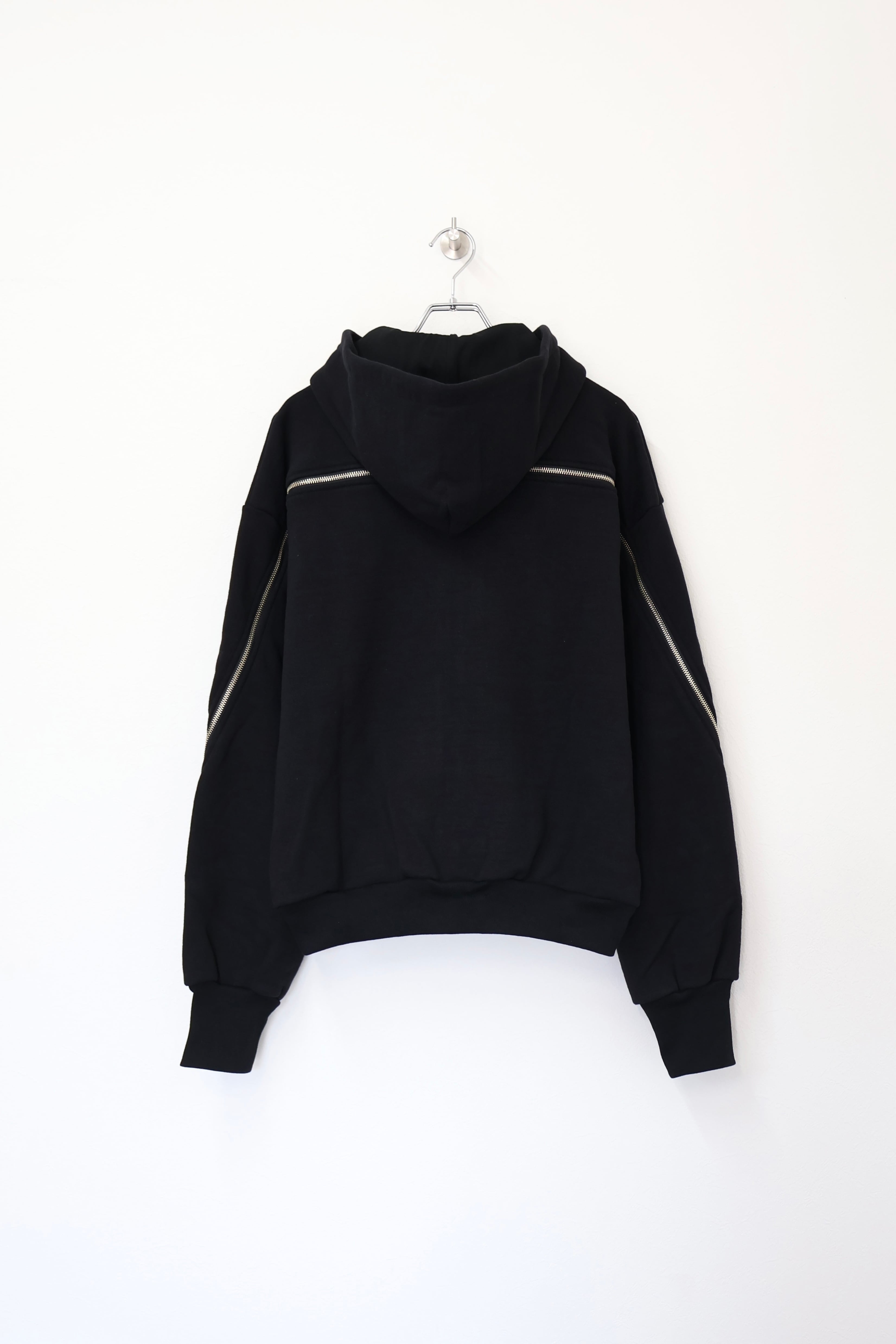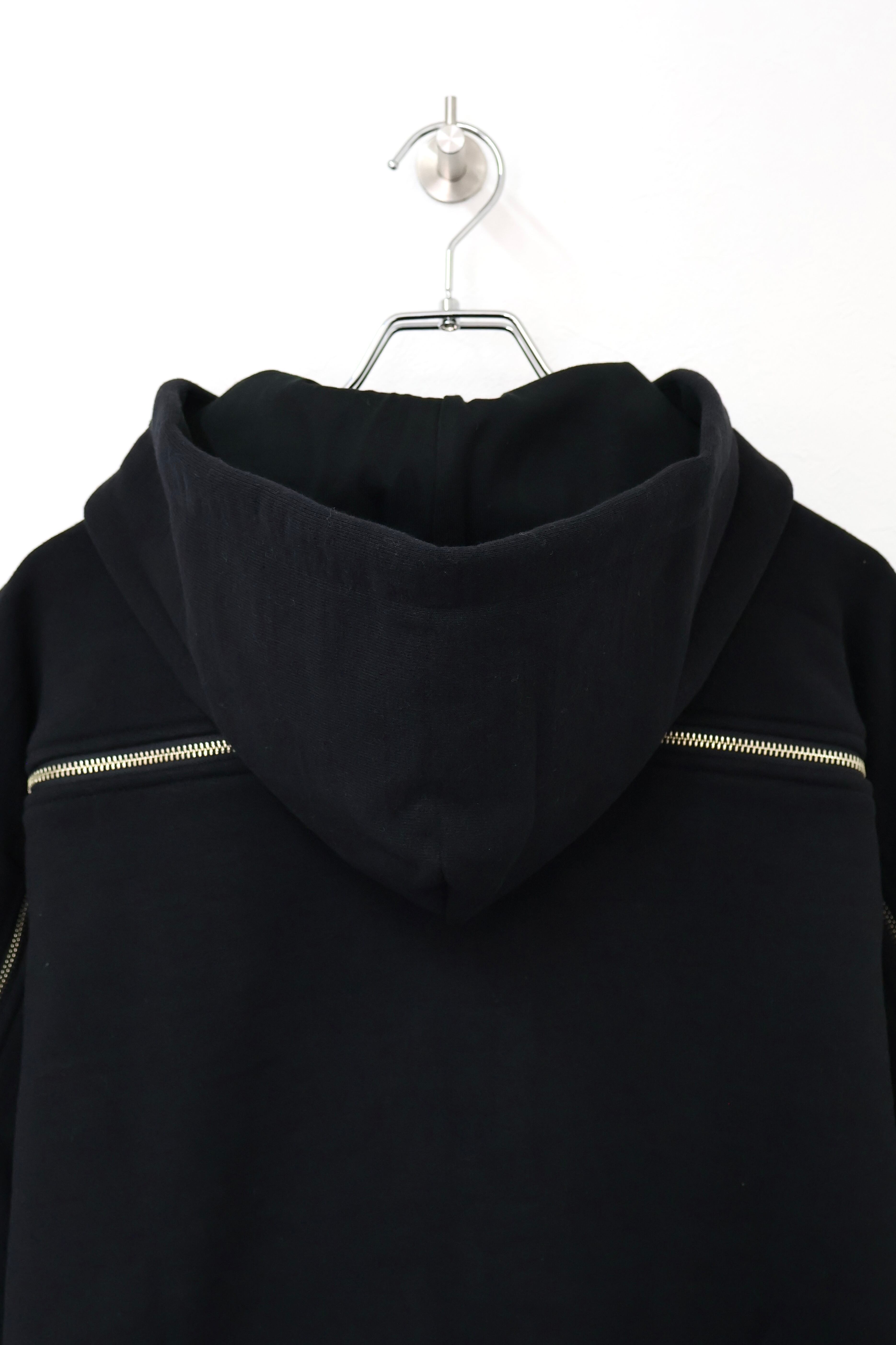 袖から背中まで繋がったジップが特徴のフルジップパーカー。 FOAMORA というクッションのような柔らかさと肉厚で心地よい着心地を持つオリジナル素材を使用。 背中のジップを開閉することでシルエットを調整可能。 身幅は広め、着丈は短めのシルエット。 袖口のリブには指抜きを配している。