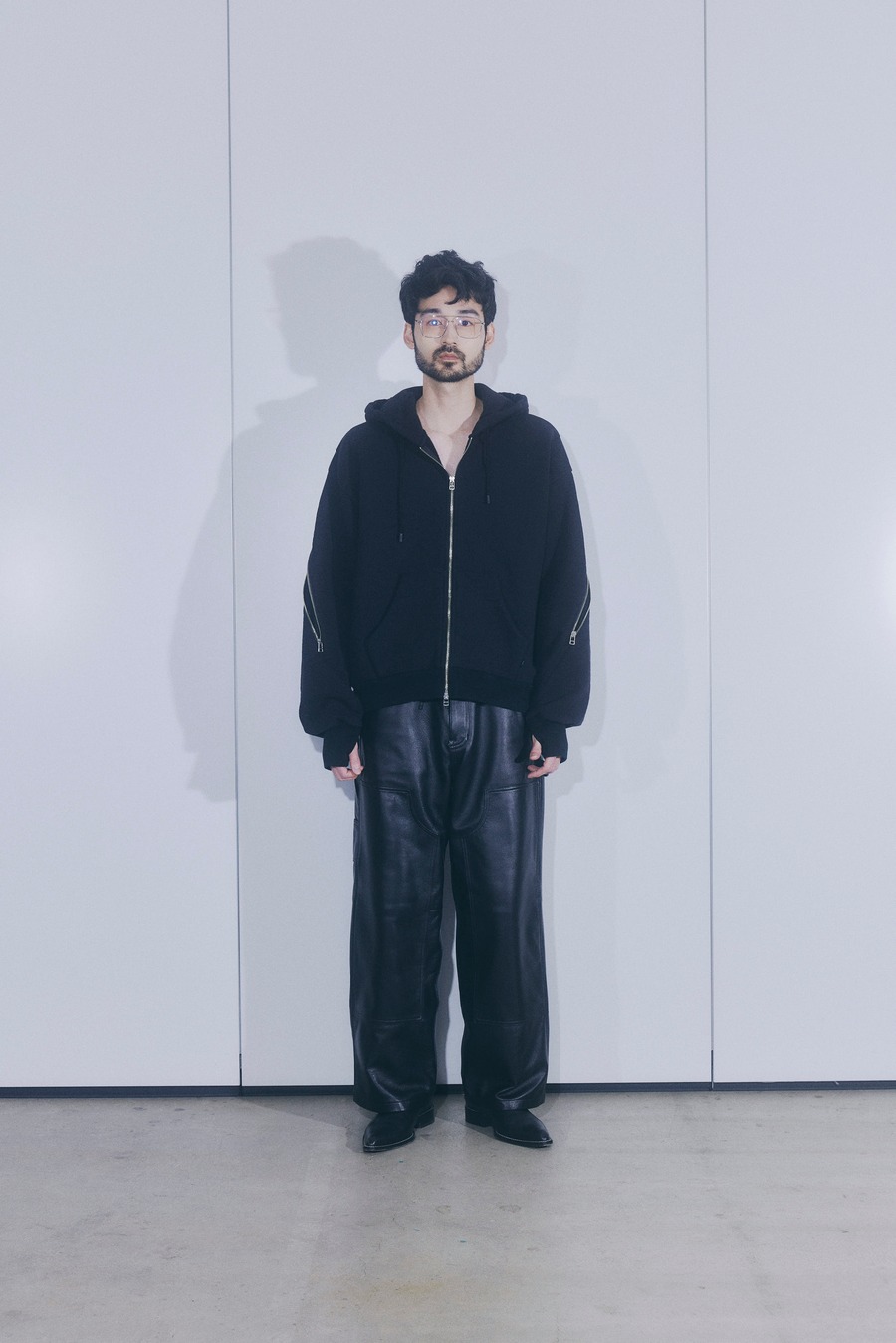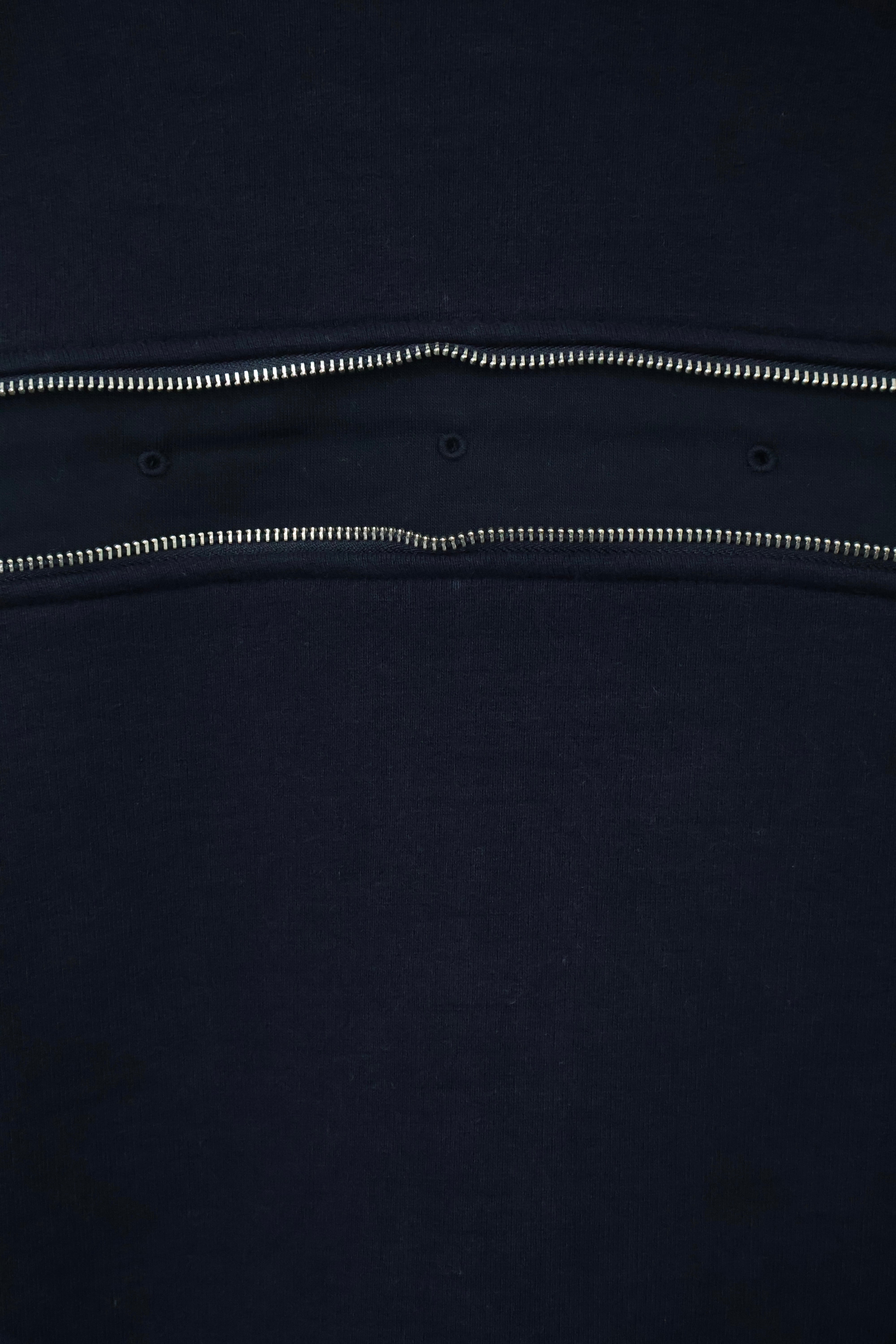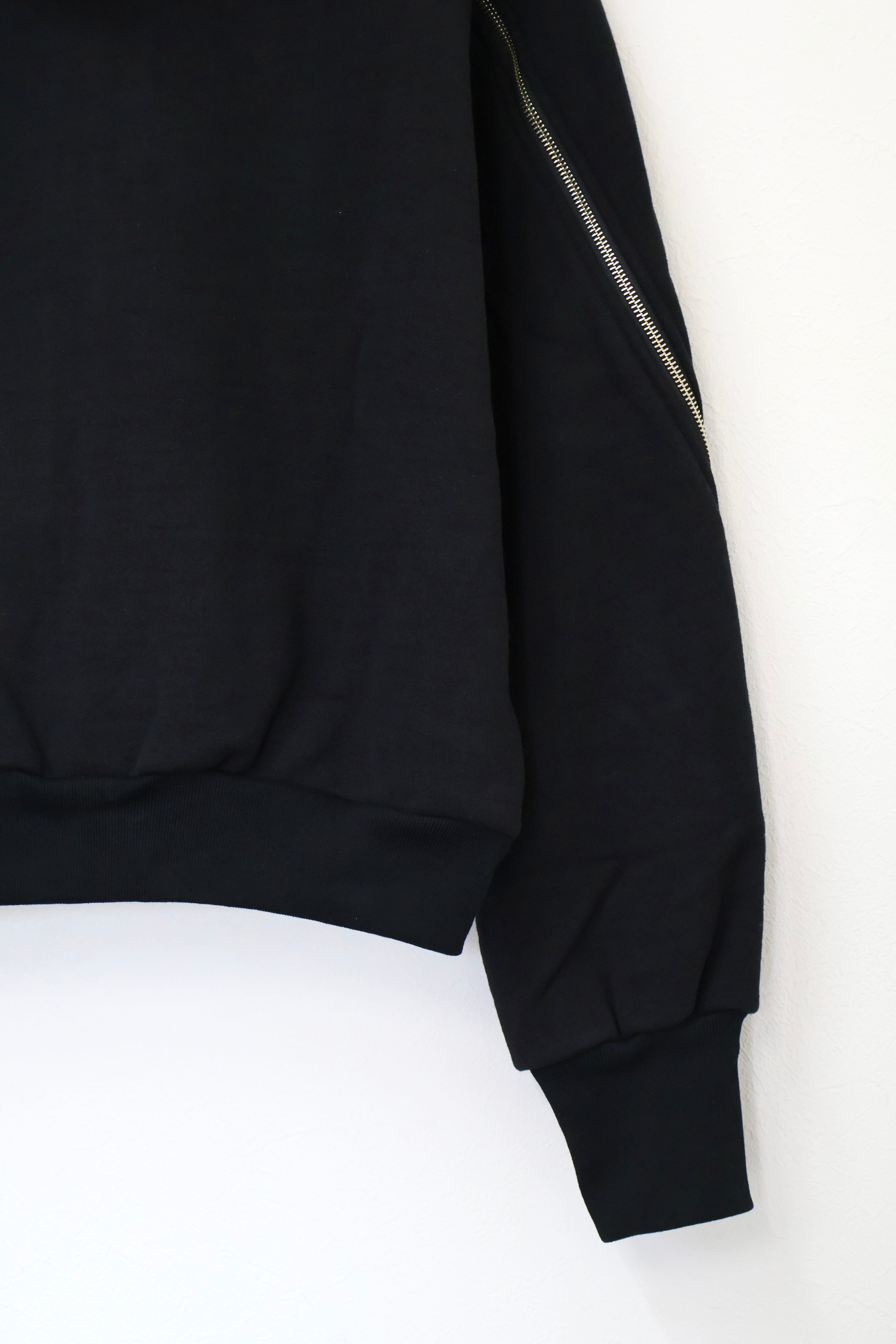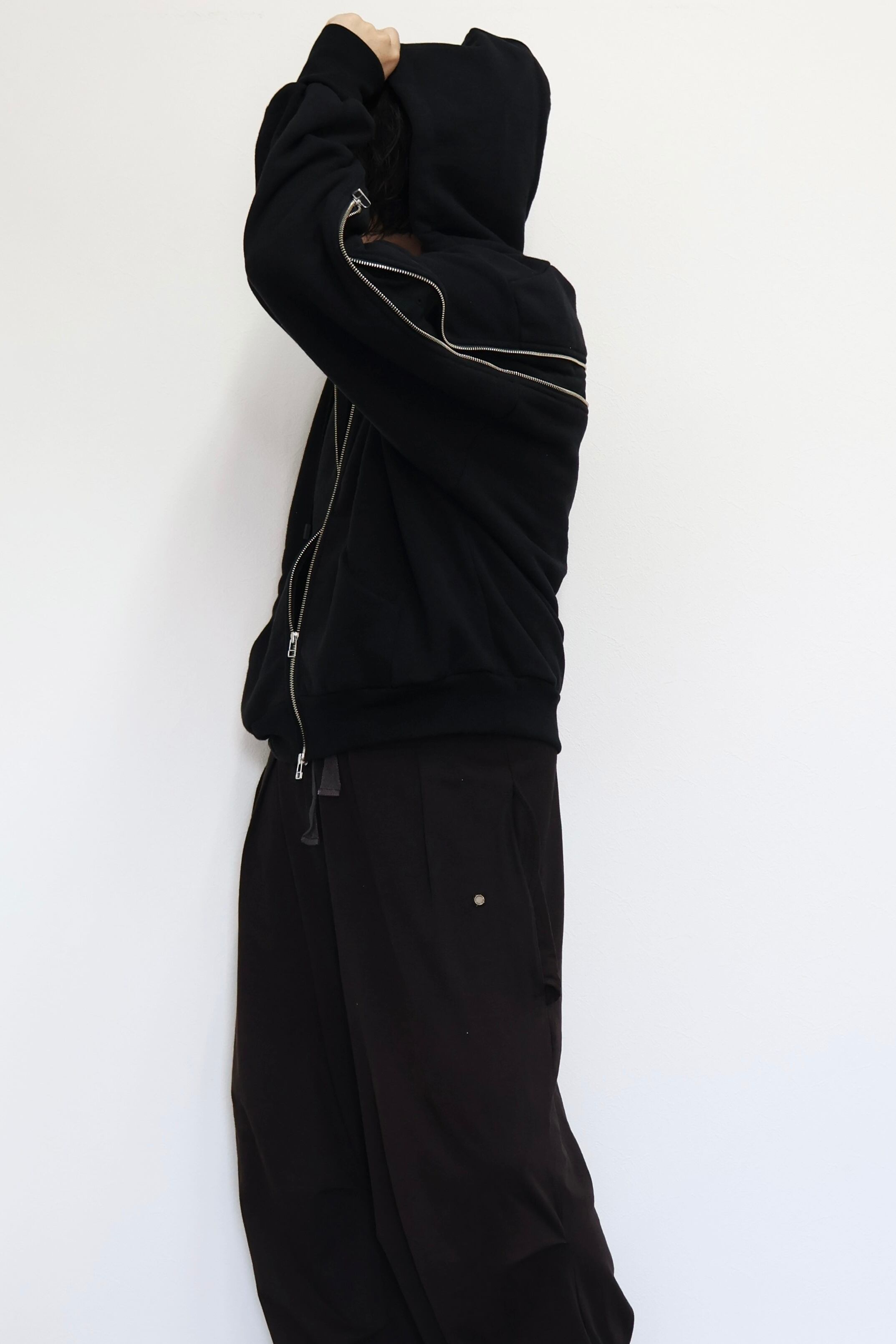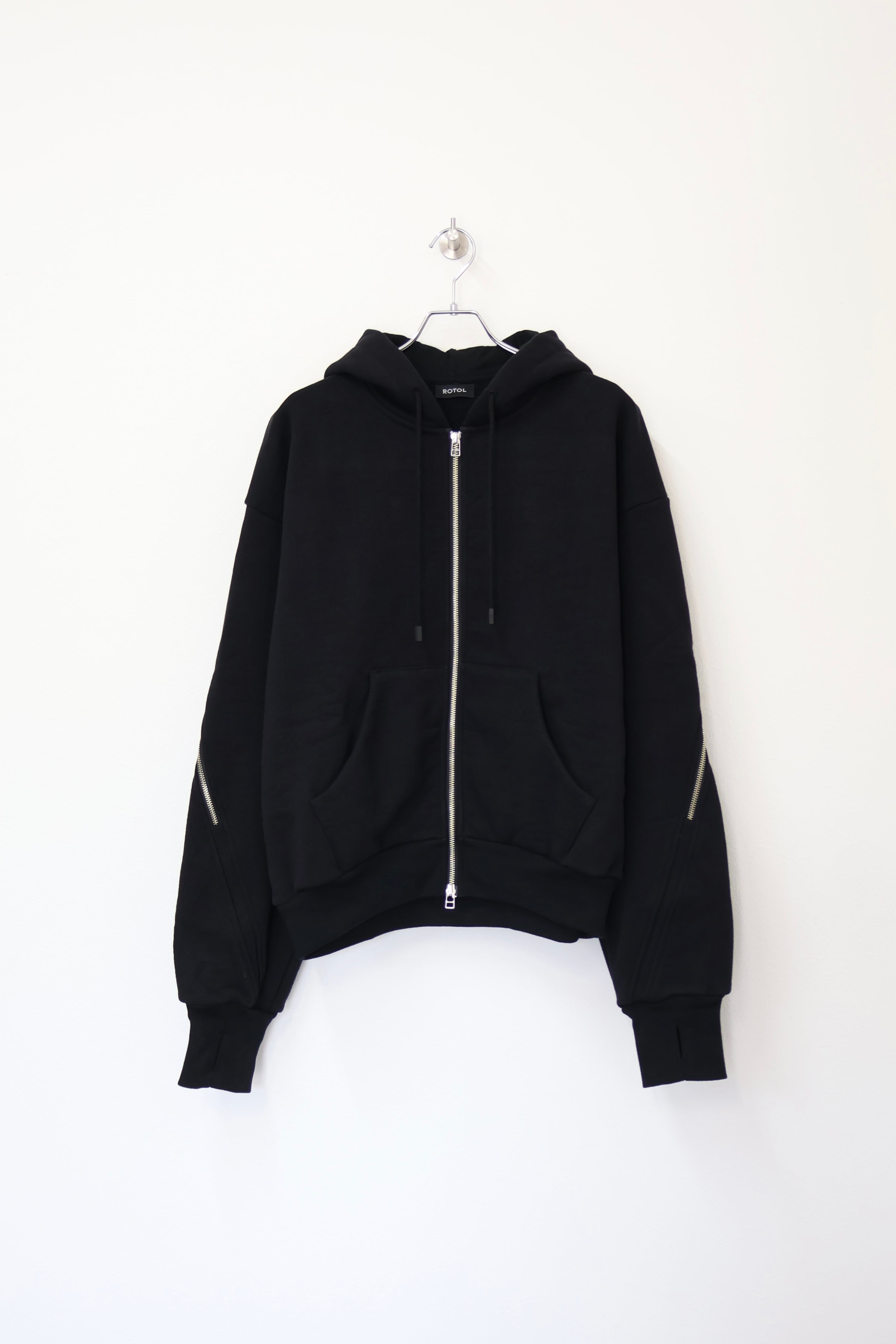 袖から背中まで繋がったジップが特徴のフルジップパーカー。 FOAMORA というクッションのような柔らかさと肉厚で心地よい着心地を持つオリジナル素材を使用。 背中のジップを開閉することでシルエットを調整可能。 身幅は広め、着丈は短めのシルエット。 袖口のリブには指抜きを配している。