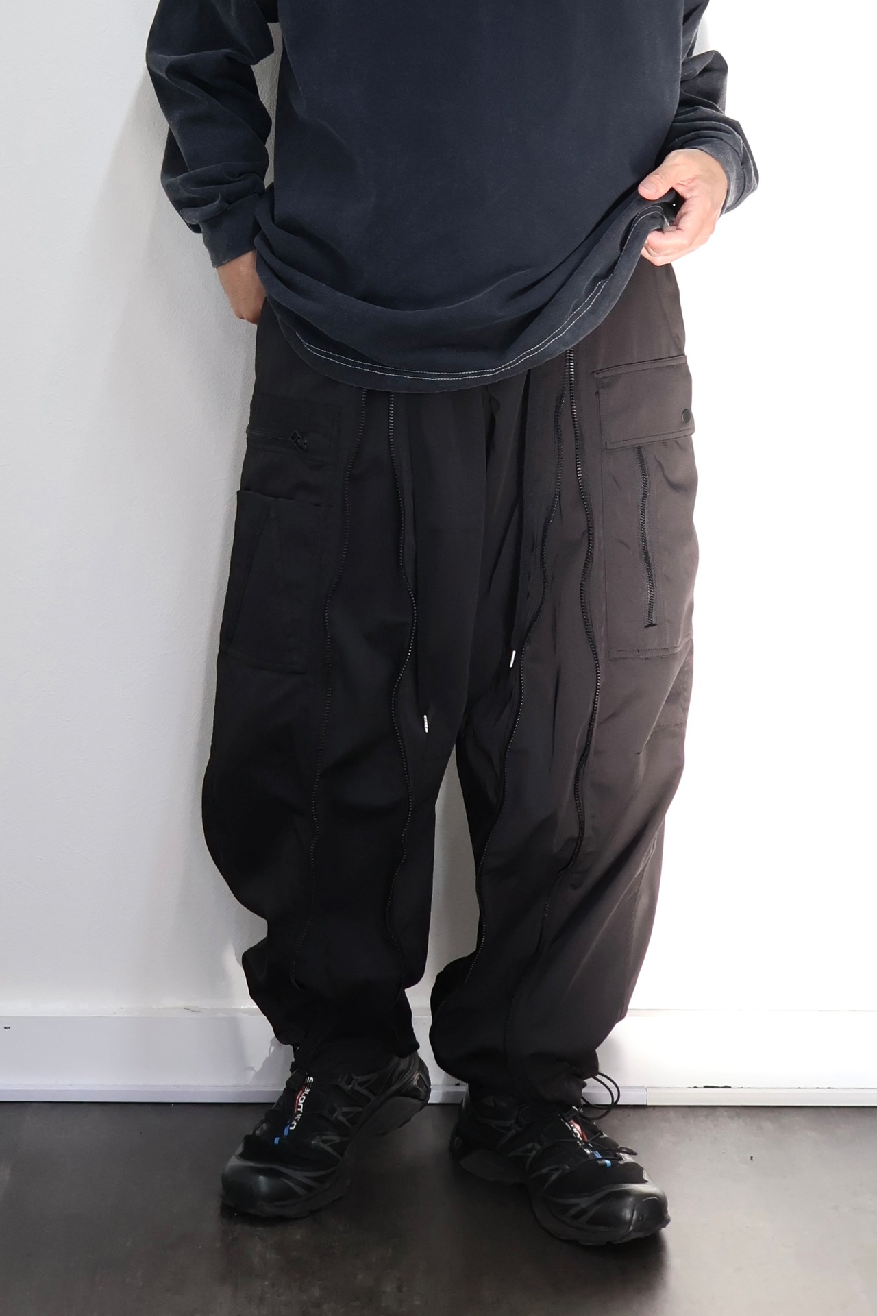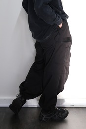 定番展開している立体構造フライトパンツ。"US ARMY A-11"タイプのパイロットパンツをベースに一重仕様にアレンジ。前見頃のファスナー下にマチを配置しておりシルエットのアレンジが可能。また裾もスピンドルにて調整可能。形状はボリュームのあるバギーテーパードフィットでフルレングス仕様。特徴的なパターンワークにより立体的な構造に。素材はANEI定番のハイブリットテクニカルギャバジンを採用。ドライタッチな風合いと速乾性をもち高い強度を誇る高密度綾織物。