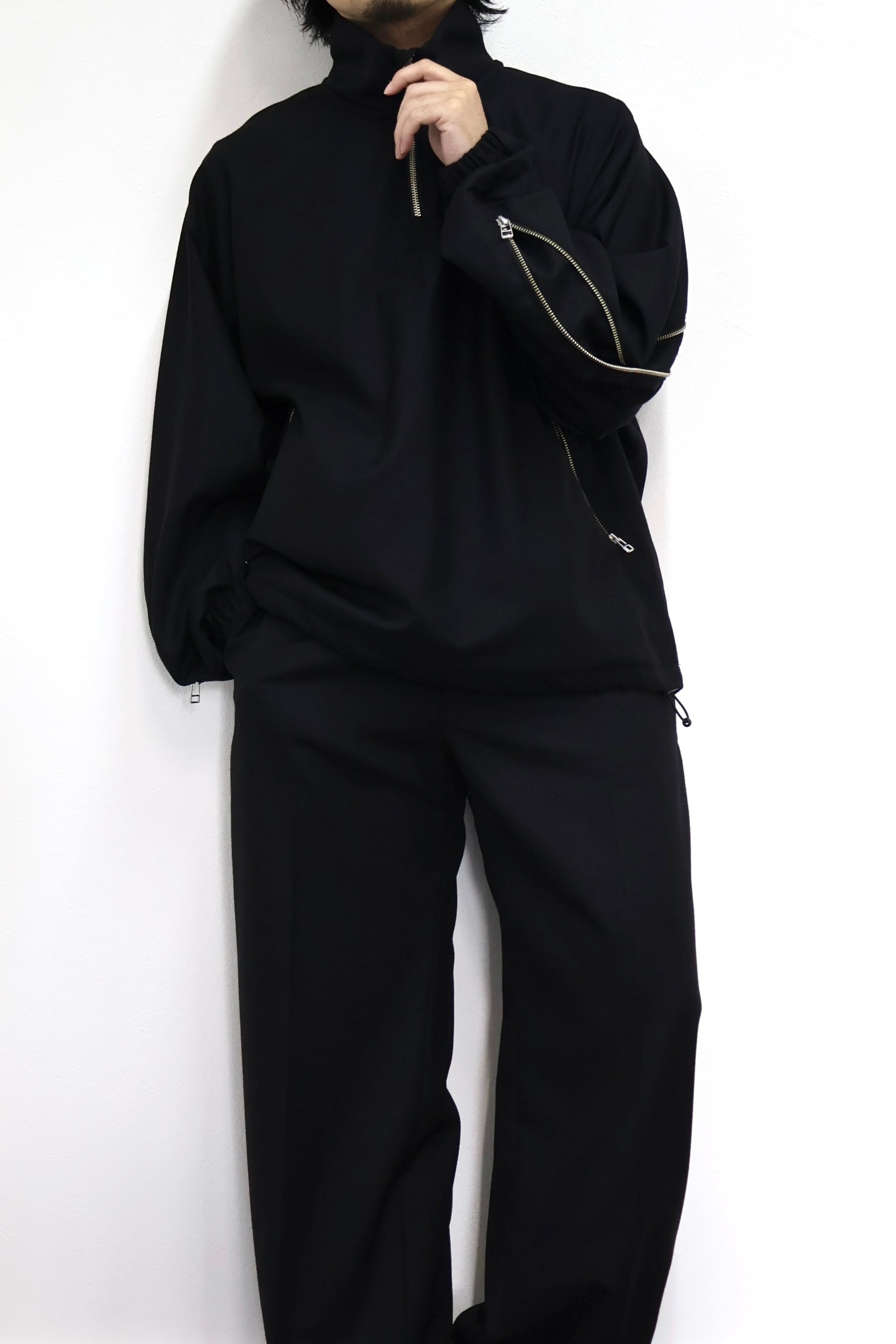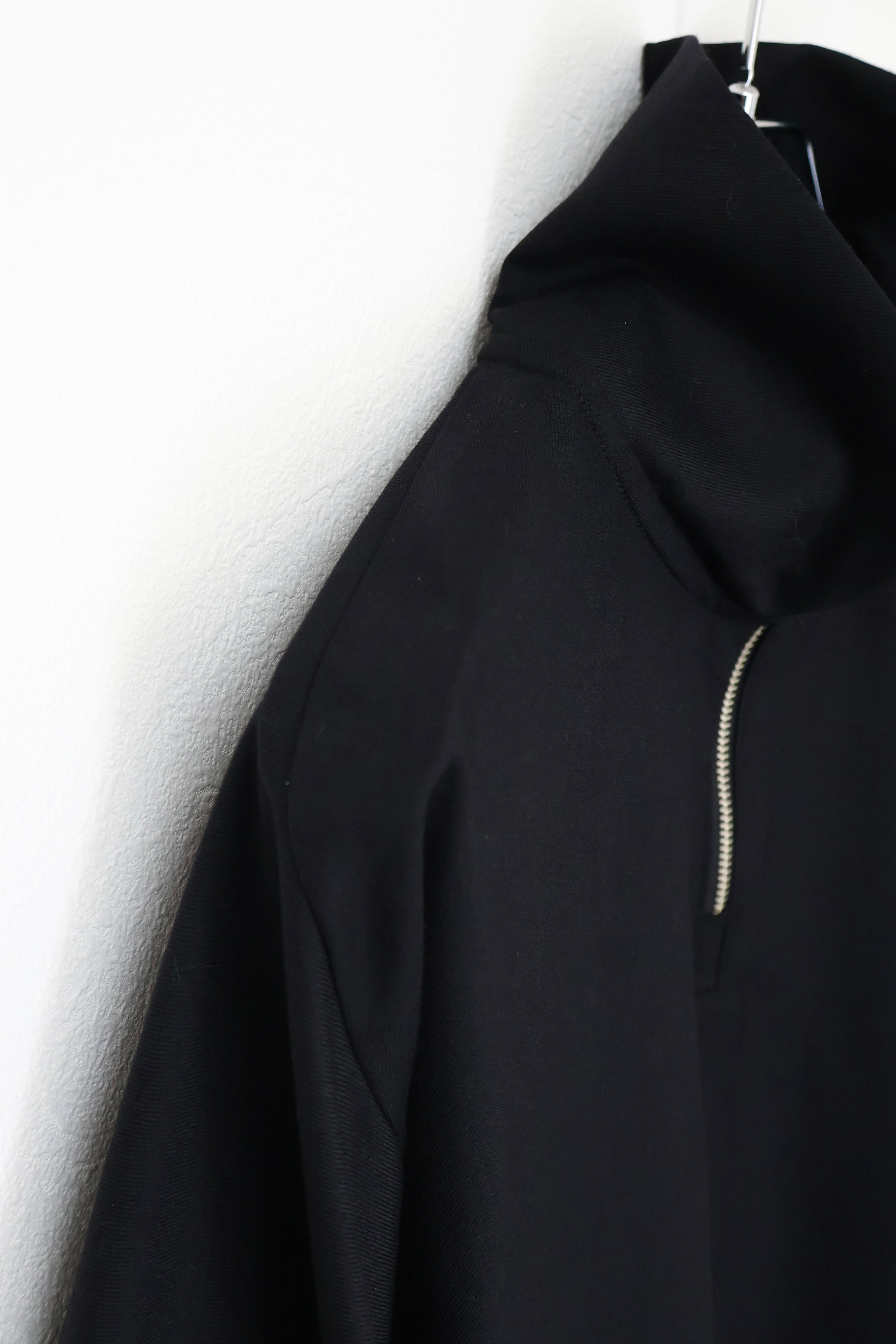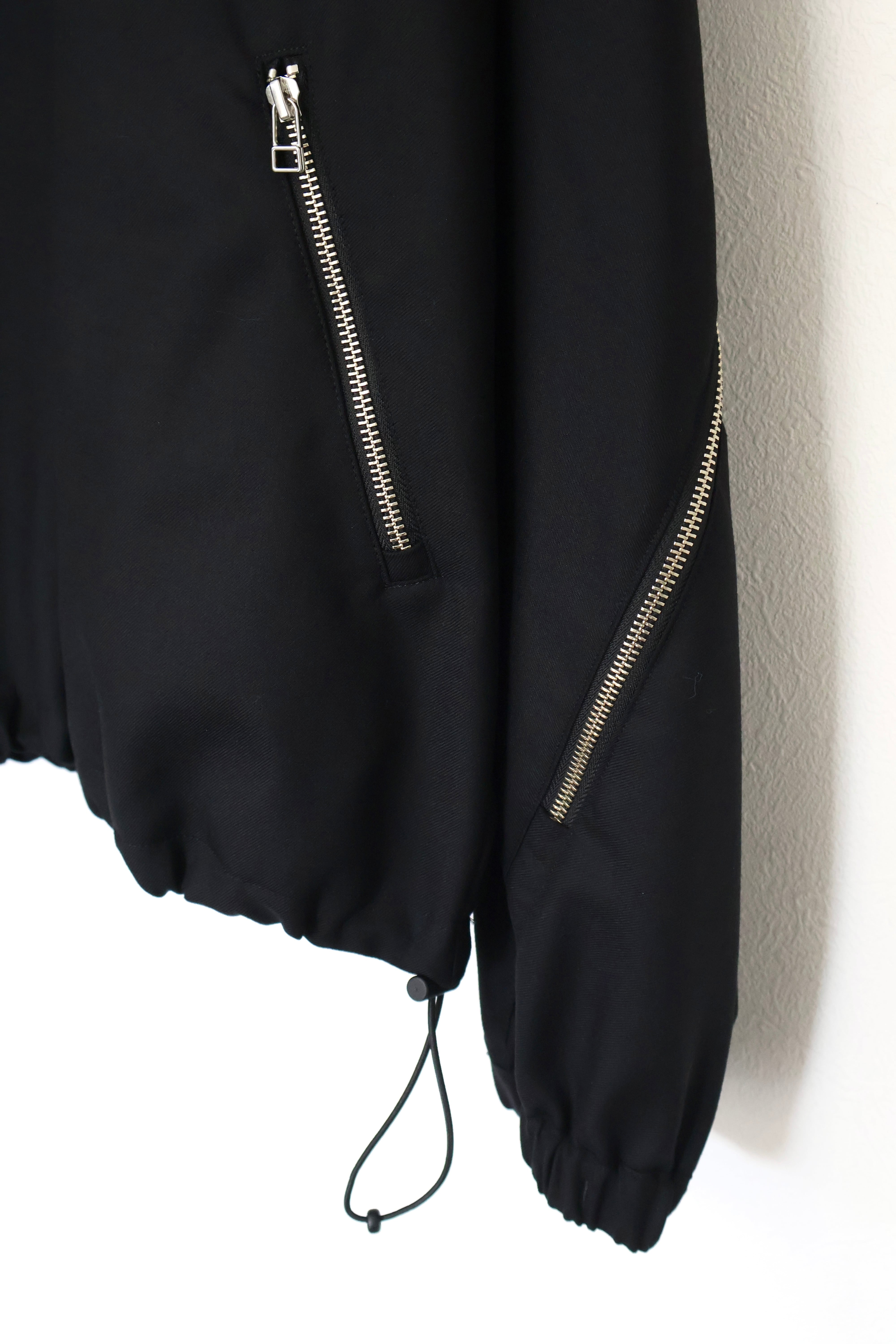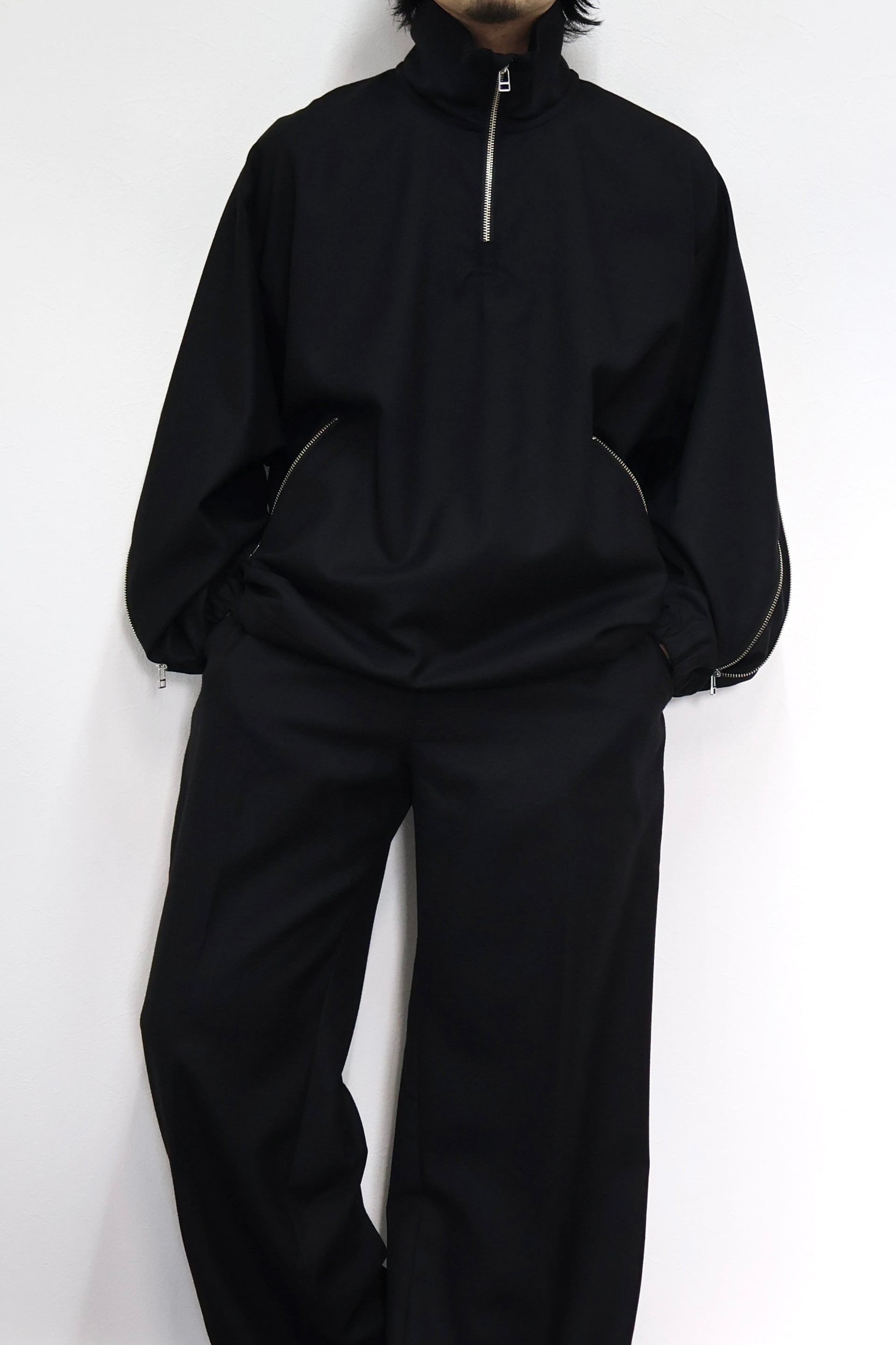 SUPER100S のウールサージを使用したリラックスフィットのハーフジップブルゾン。 背中にはシルエットを変化させるジップを配し腰にはジップポケットを設置。 裾にはドローコードを備えている。