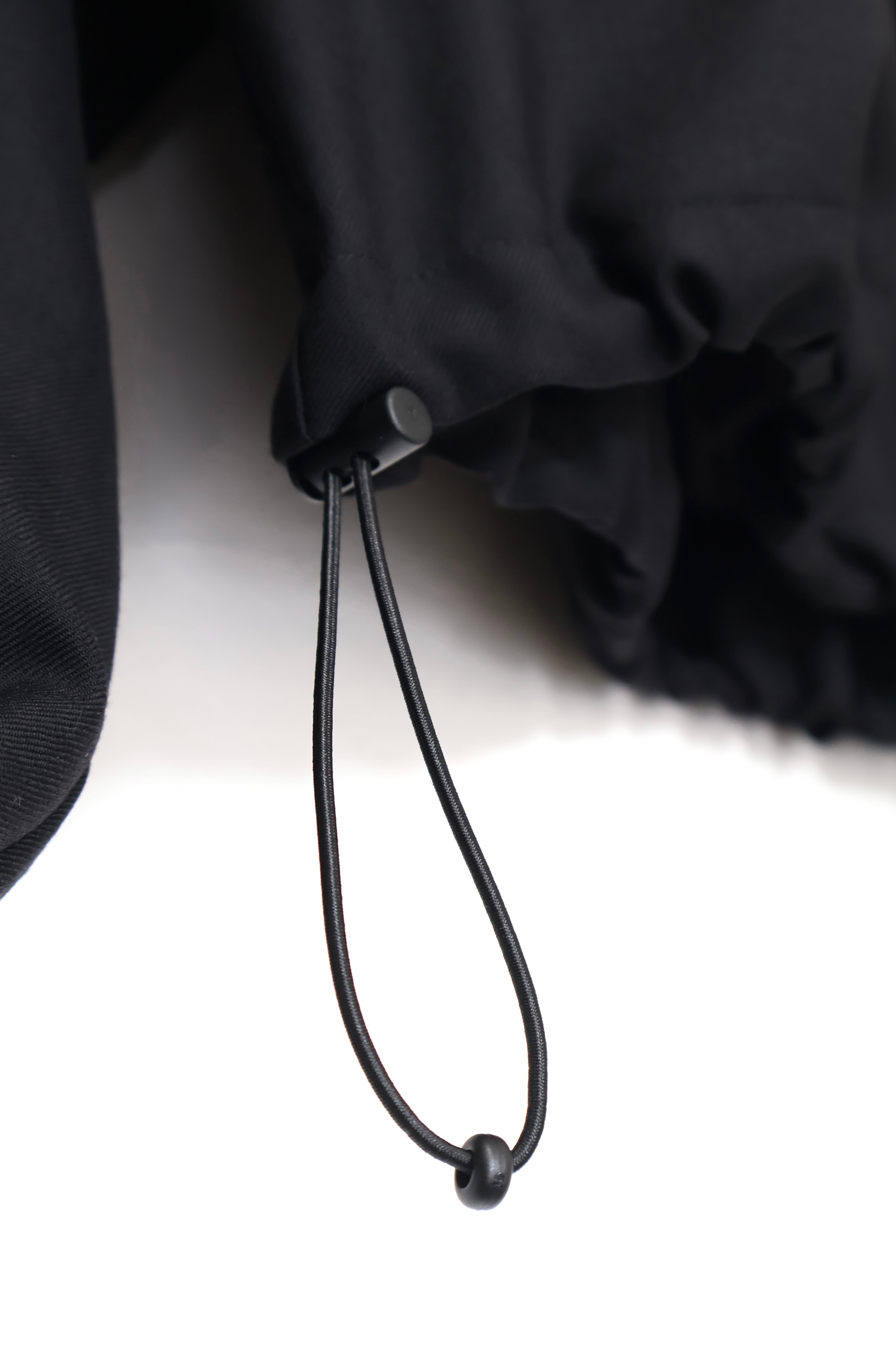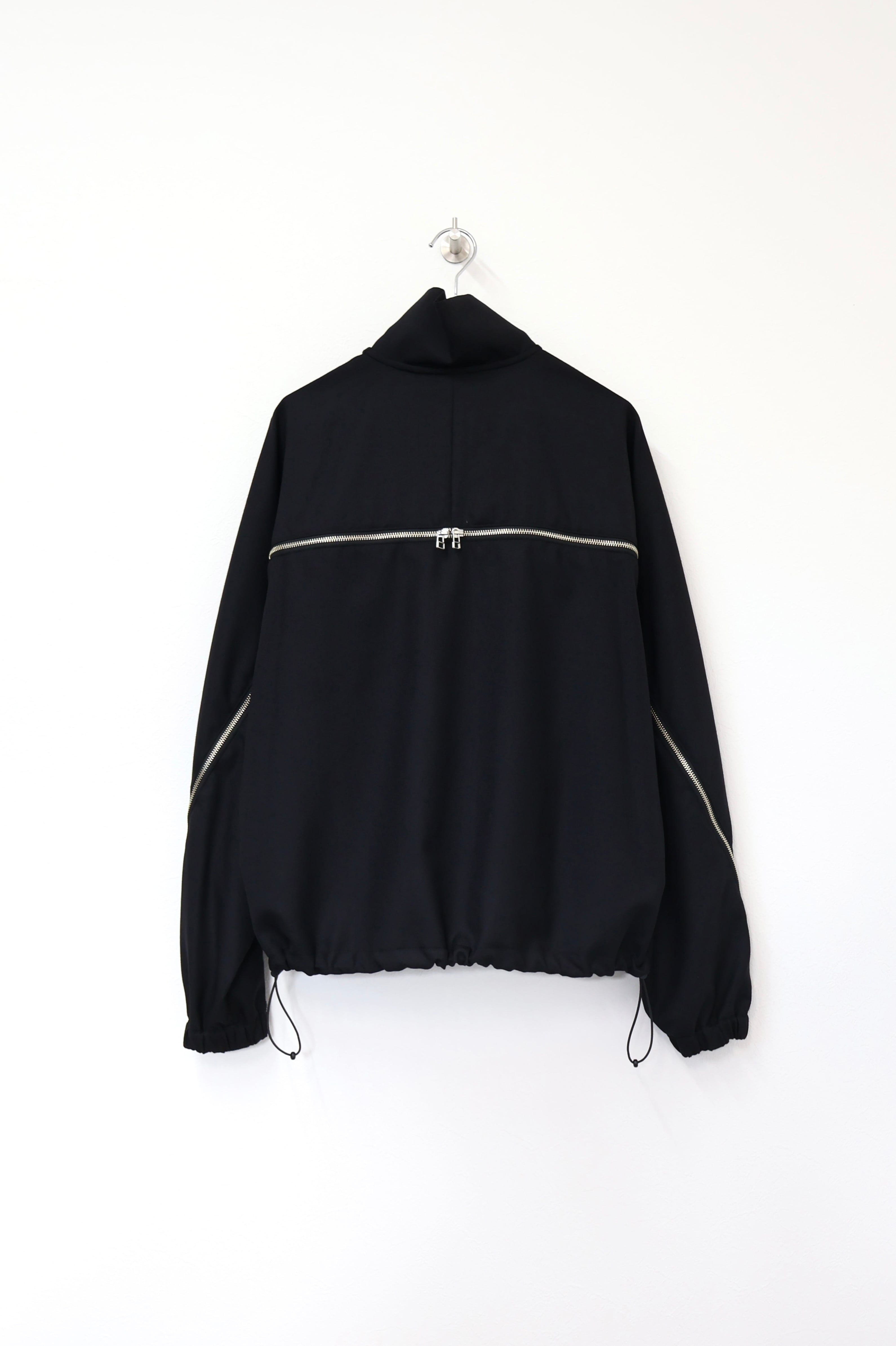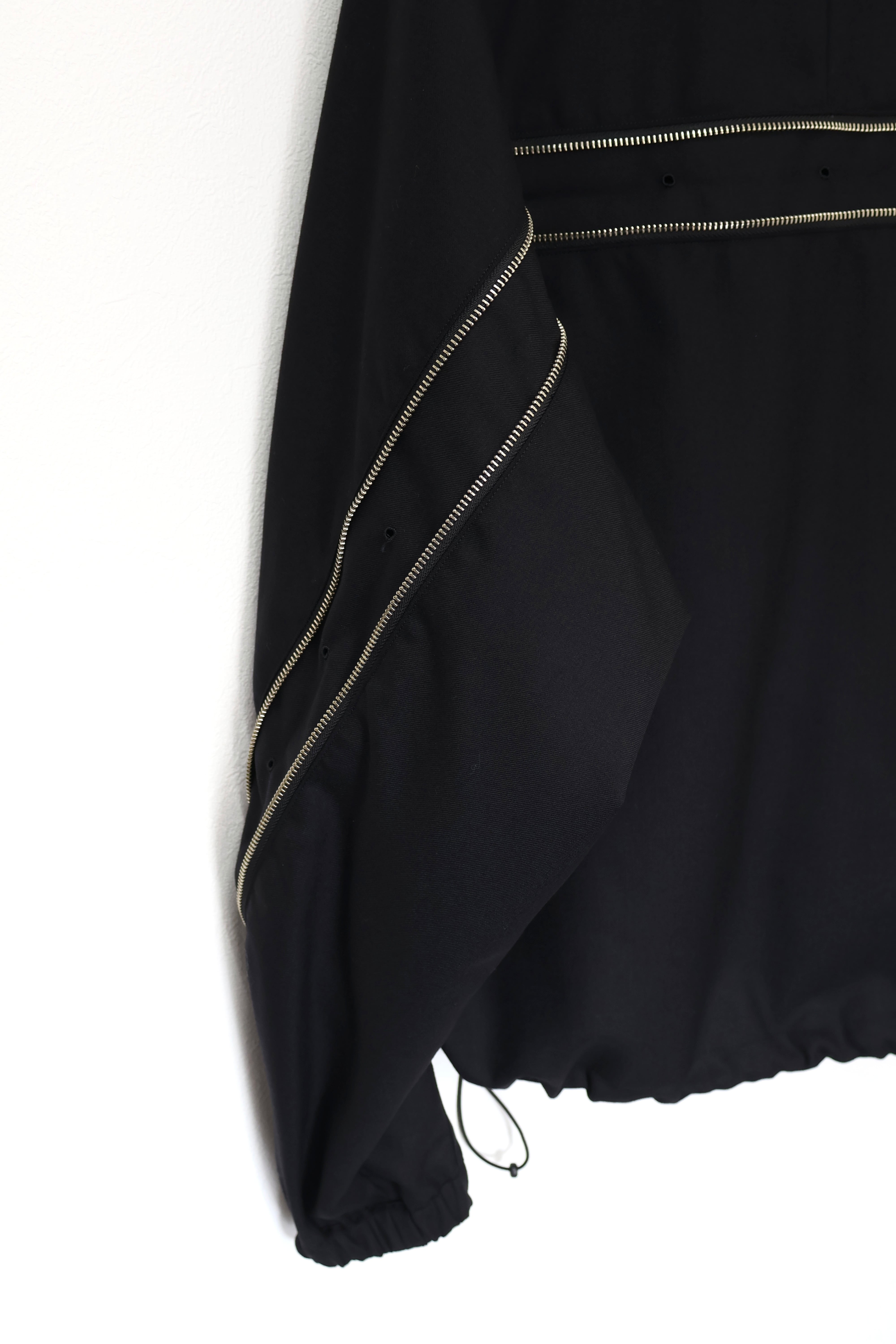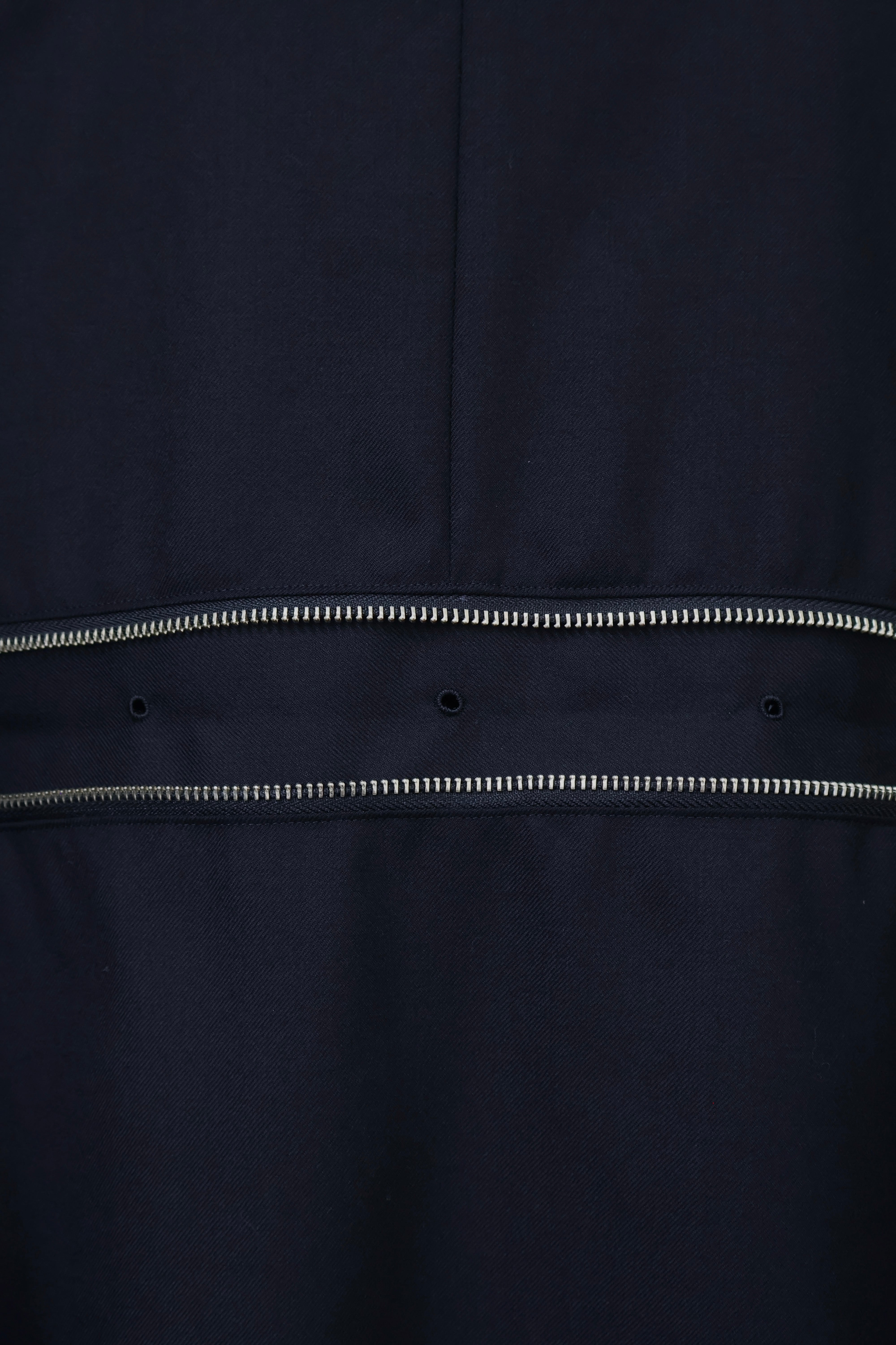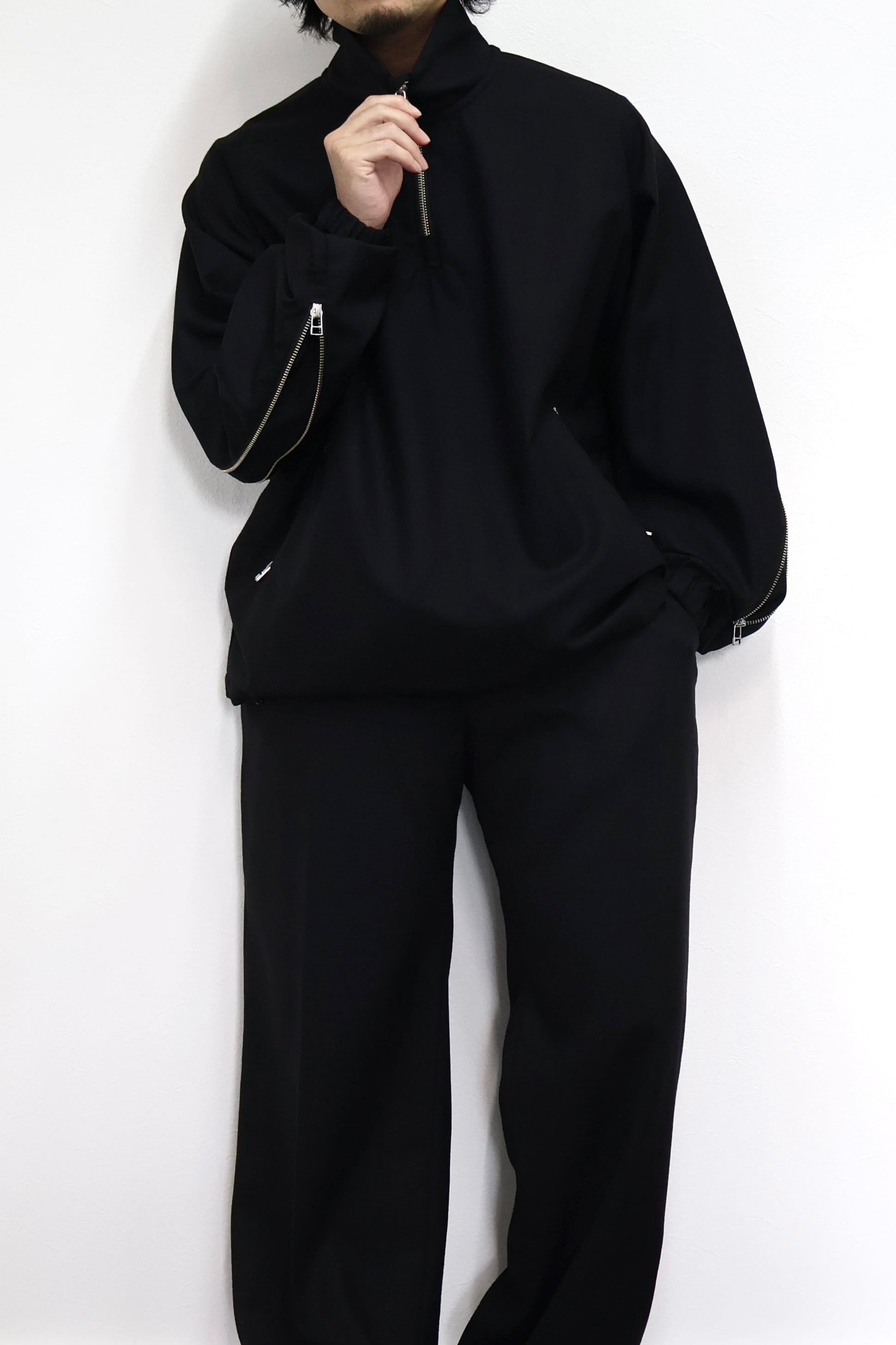 SUPER100S のウールサージを使用したリラックスフィットのハーフジップブルゾン。 背中にはシルエットを変化させるジップを配し腰にはジップポケットを設置。 裾にはドローコードを備えている。