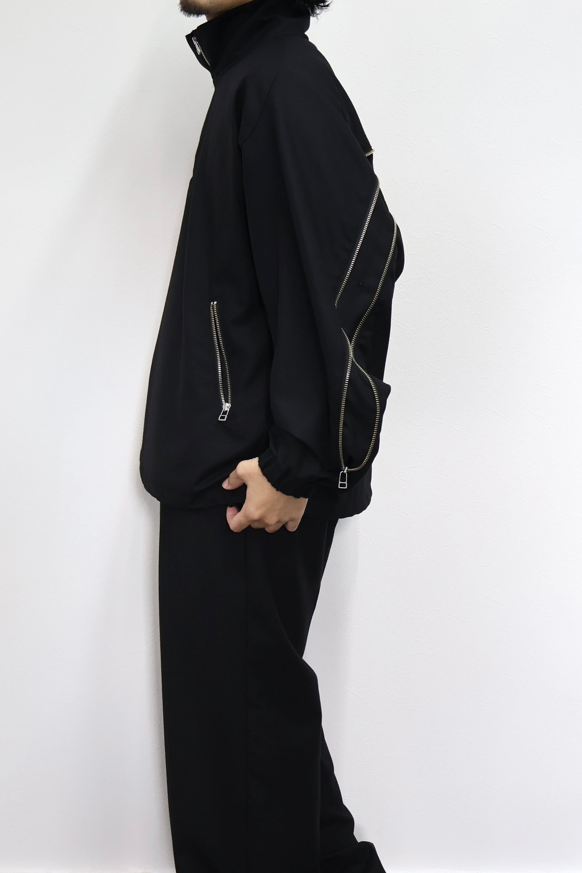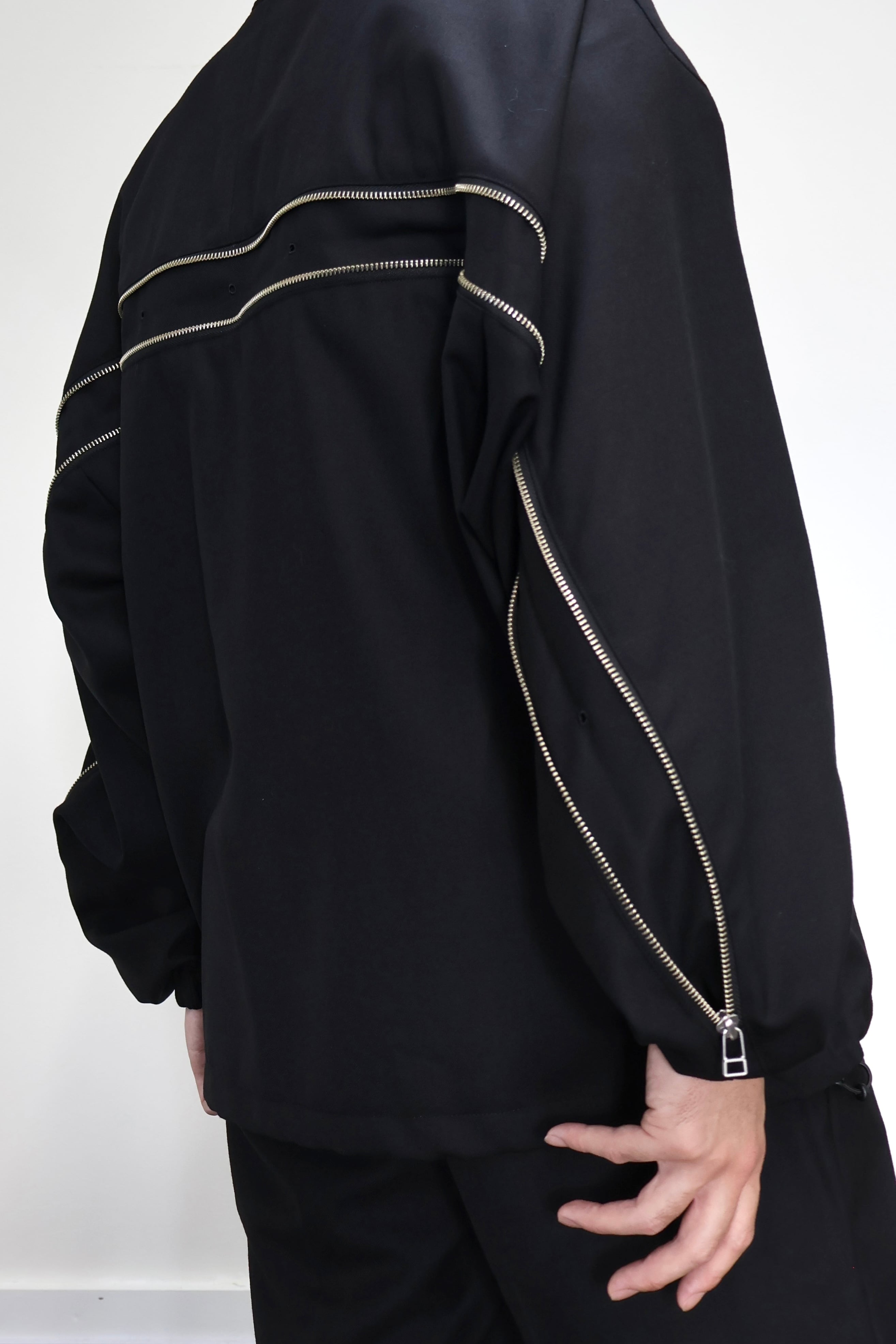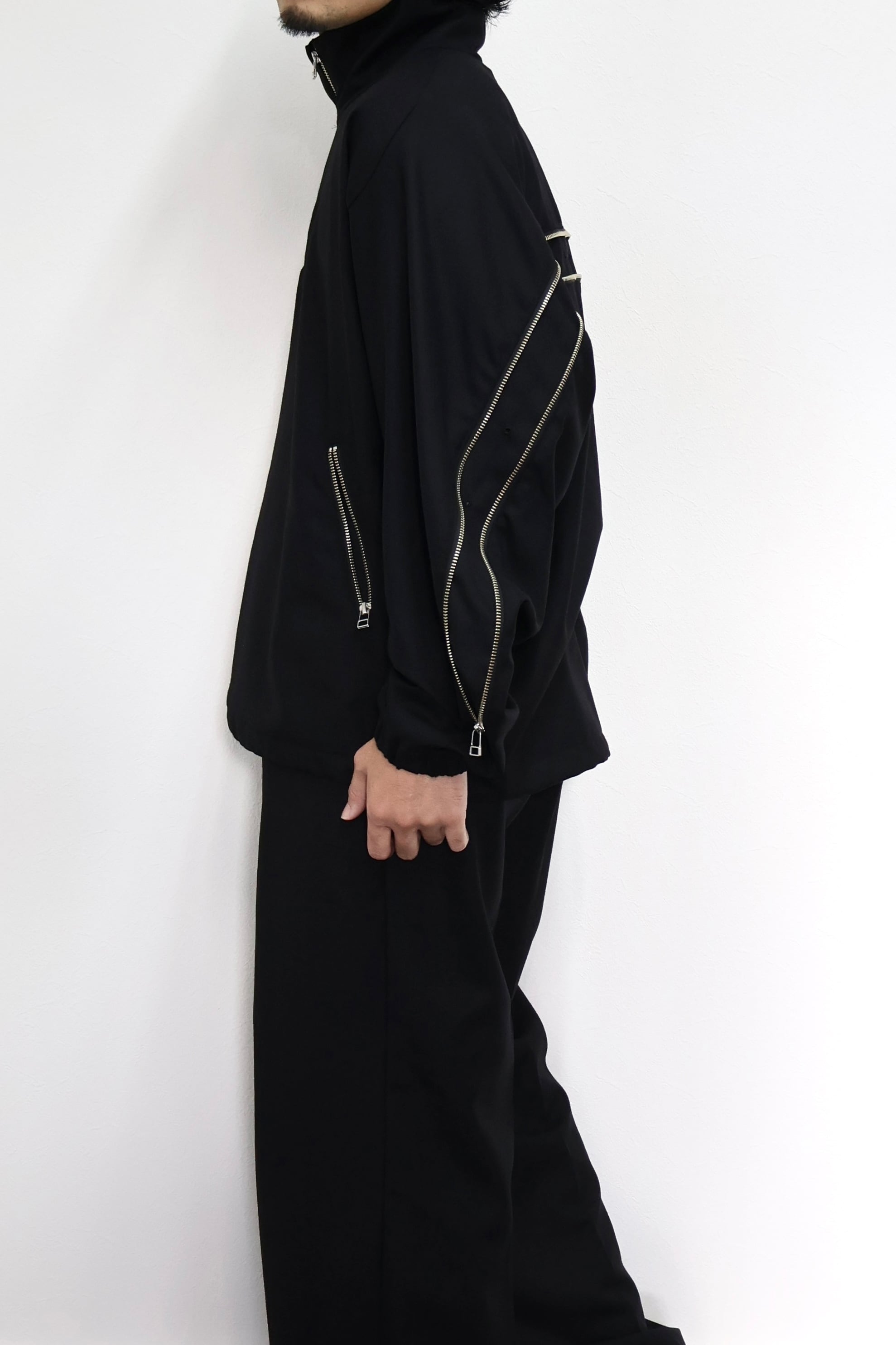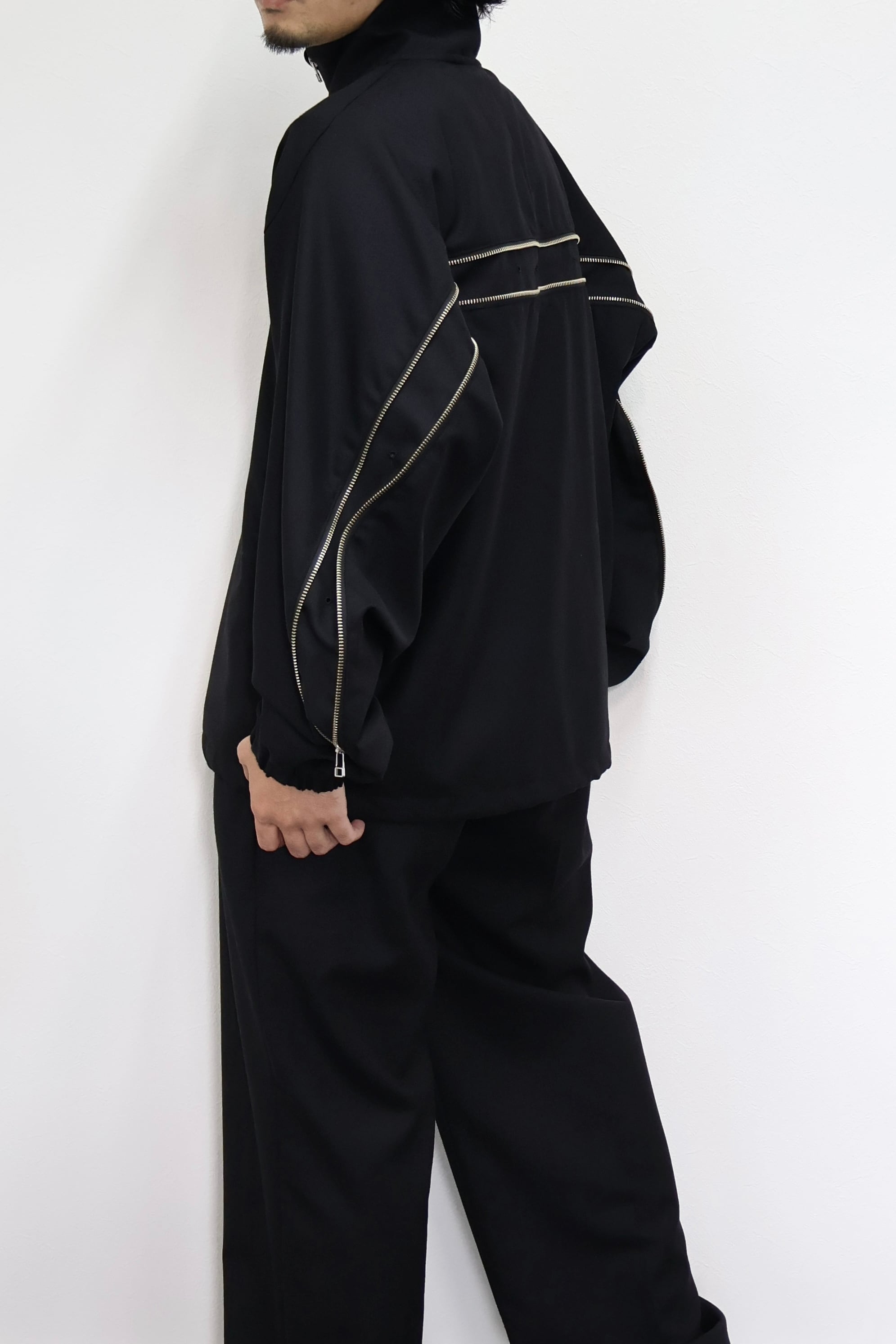 SUPER100S のウールサージを使用したリラックスフィットのハーフジップブルゾン。 背中にはシルエットを変化させるジップを配し腰にはジップポケットを設置。 裾にはドローコードを備えている。