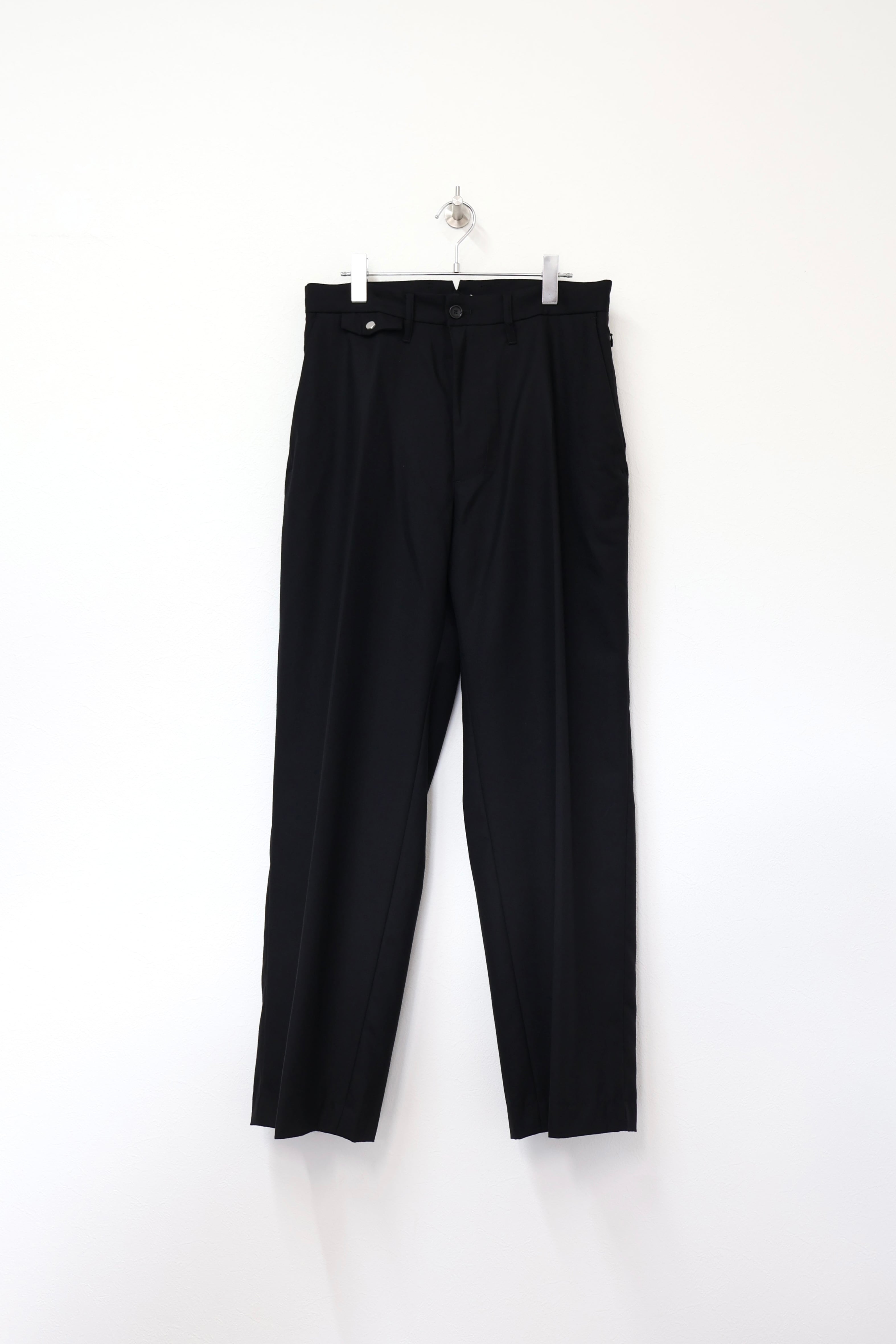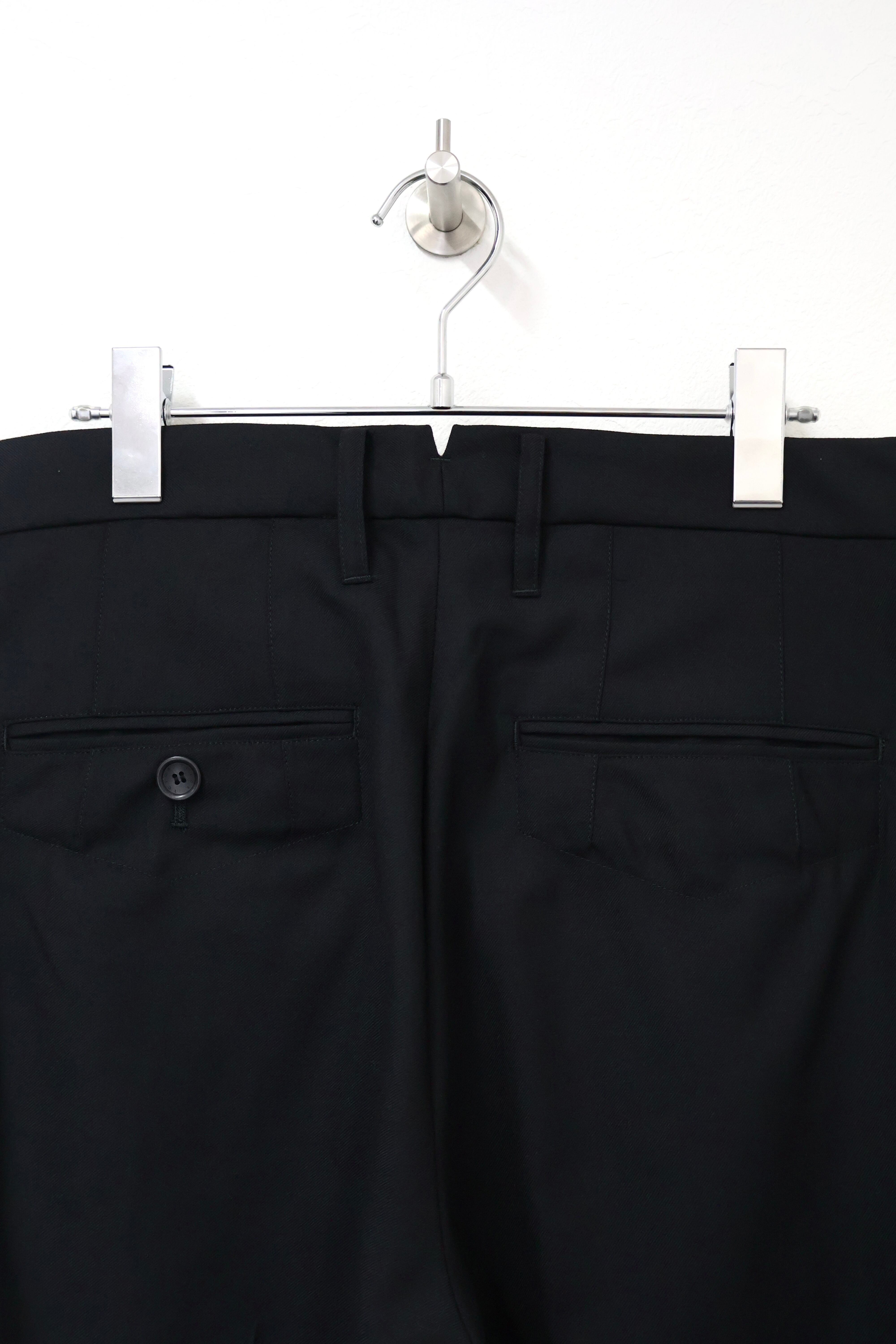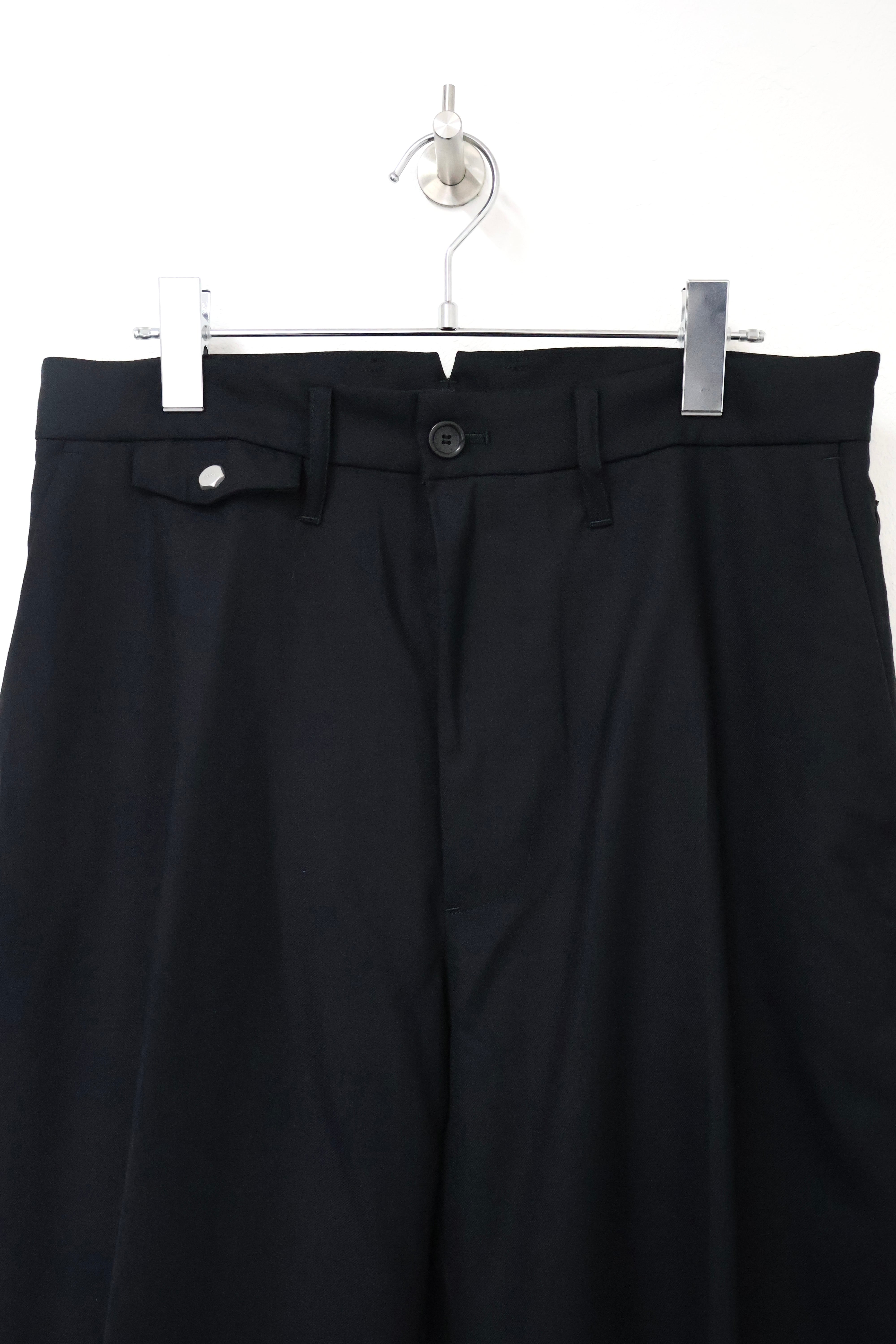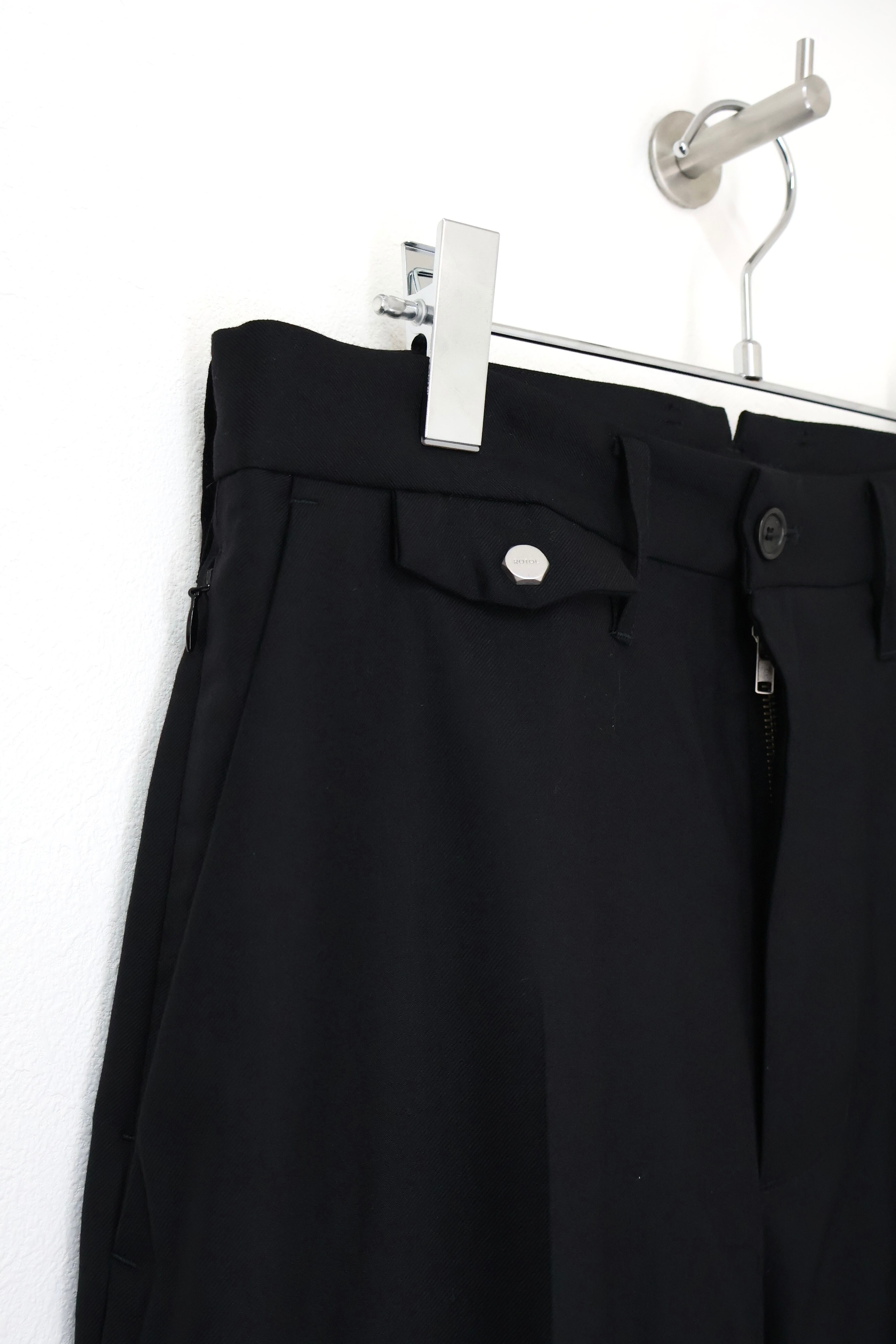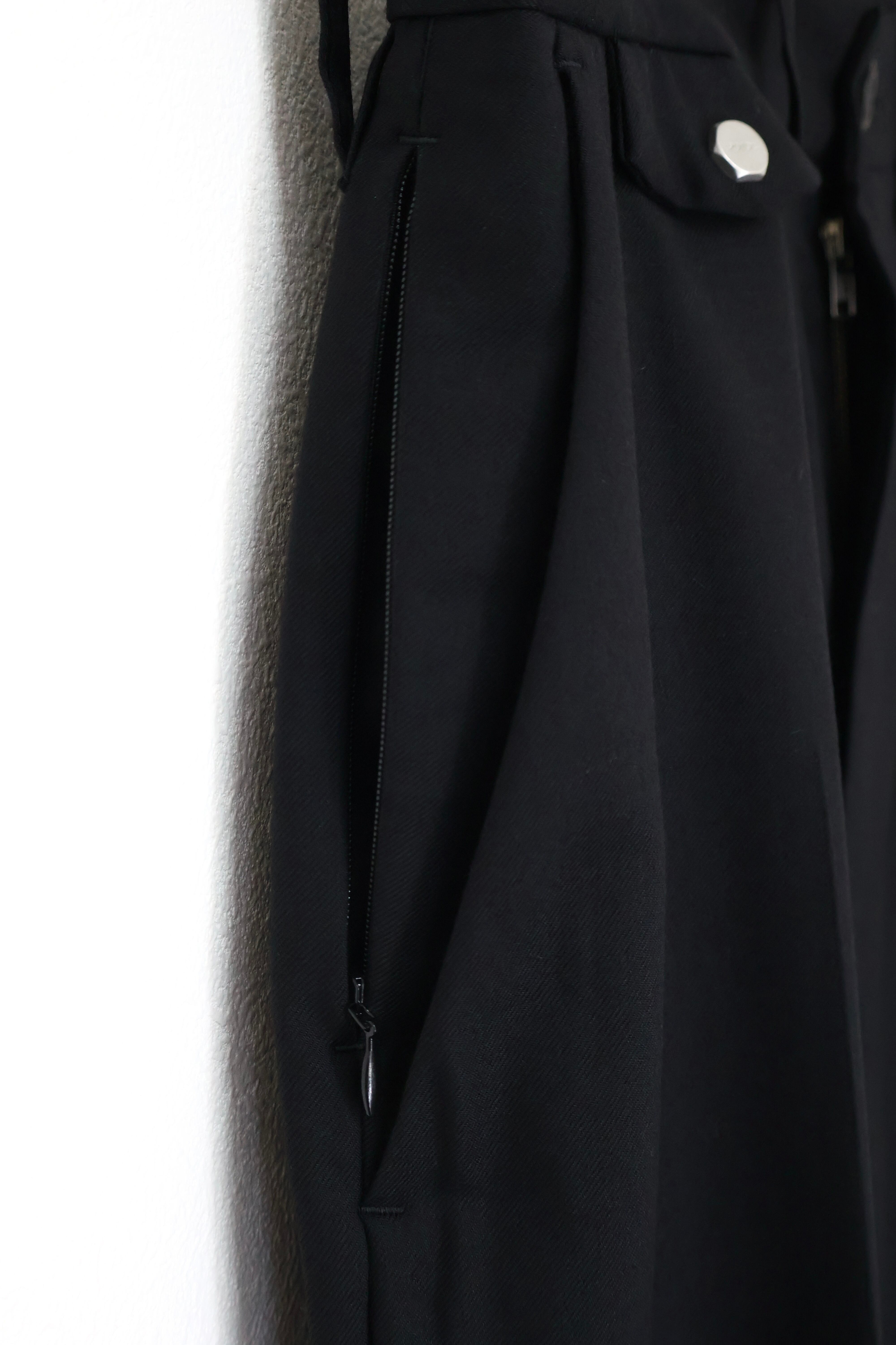 SUPER100S のウールサージを使用したワイドスラックス。 腰回りをすっきりと見せるノータック仕様。 腰ポケットにはジップポケットとスラッシュポケットを組み込み、 コインポケットのフラップにはアイコンのドットボタンを配置。