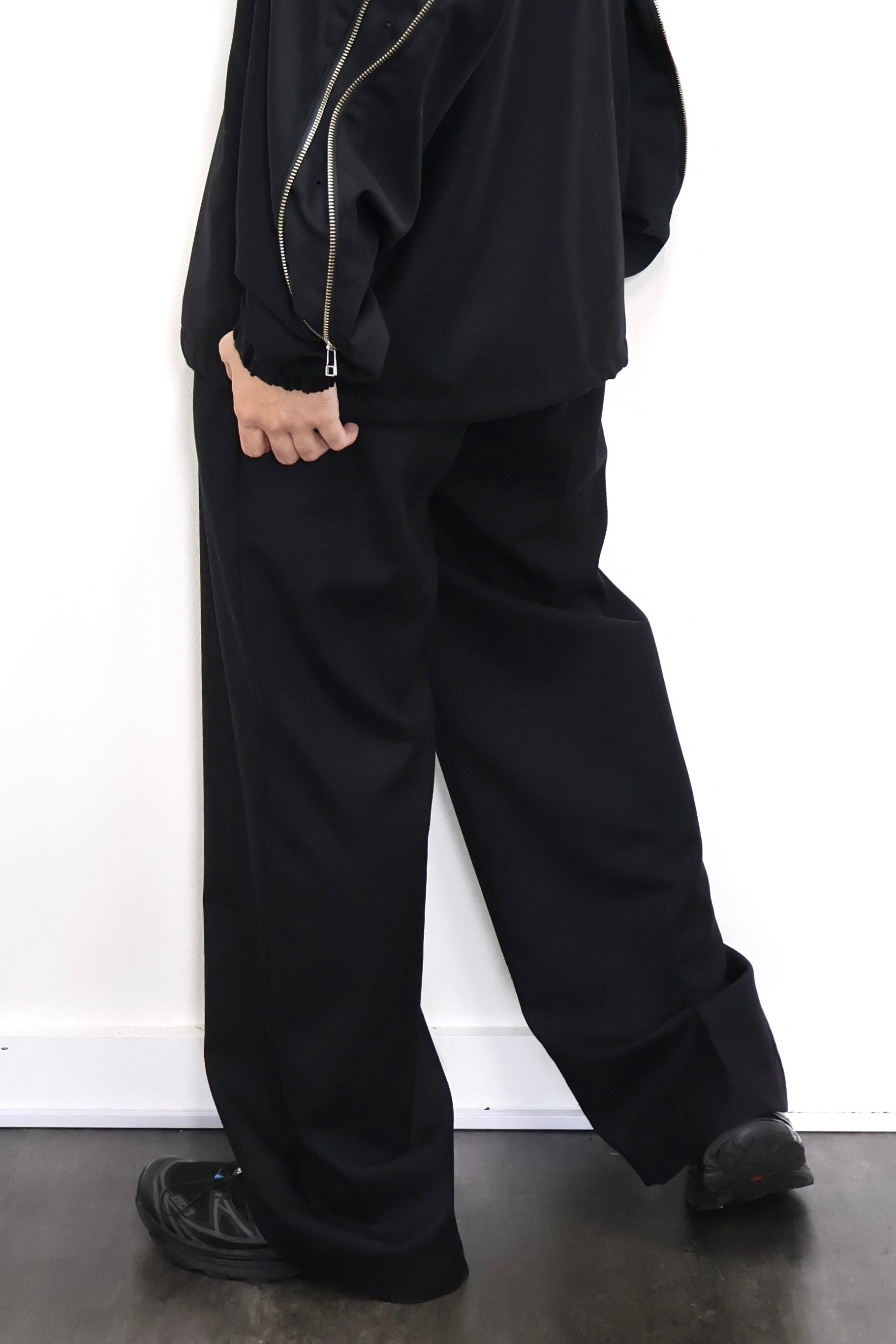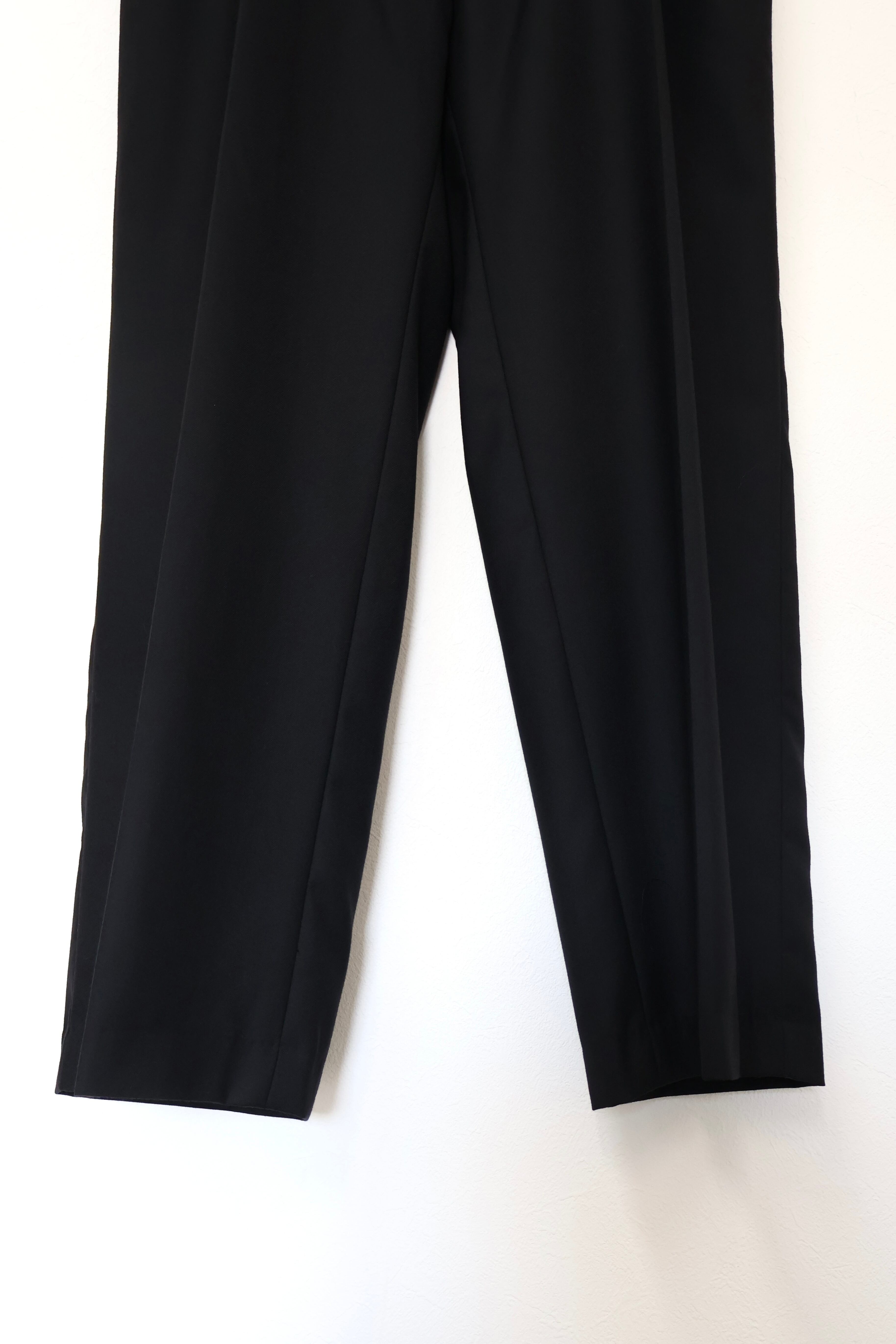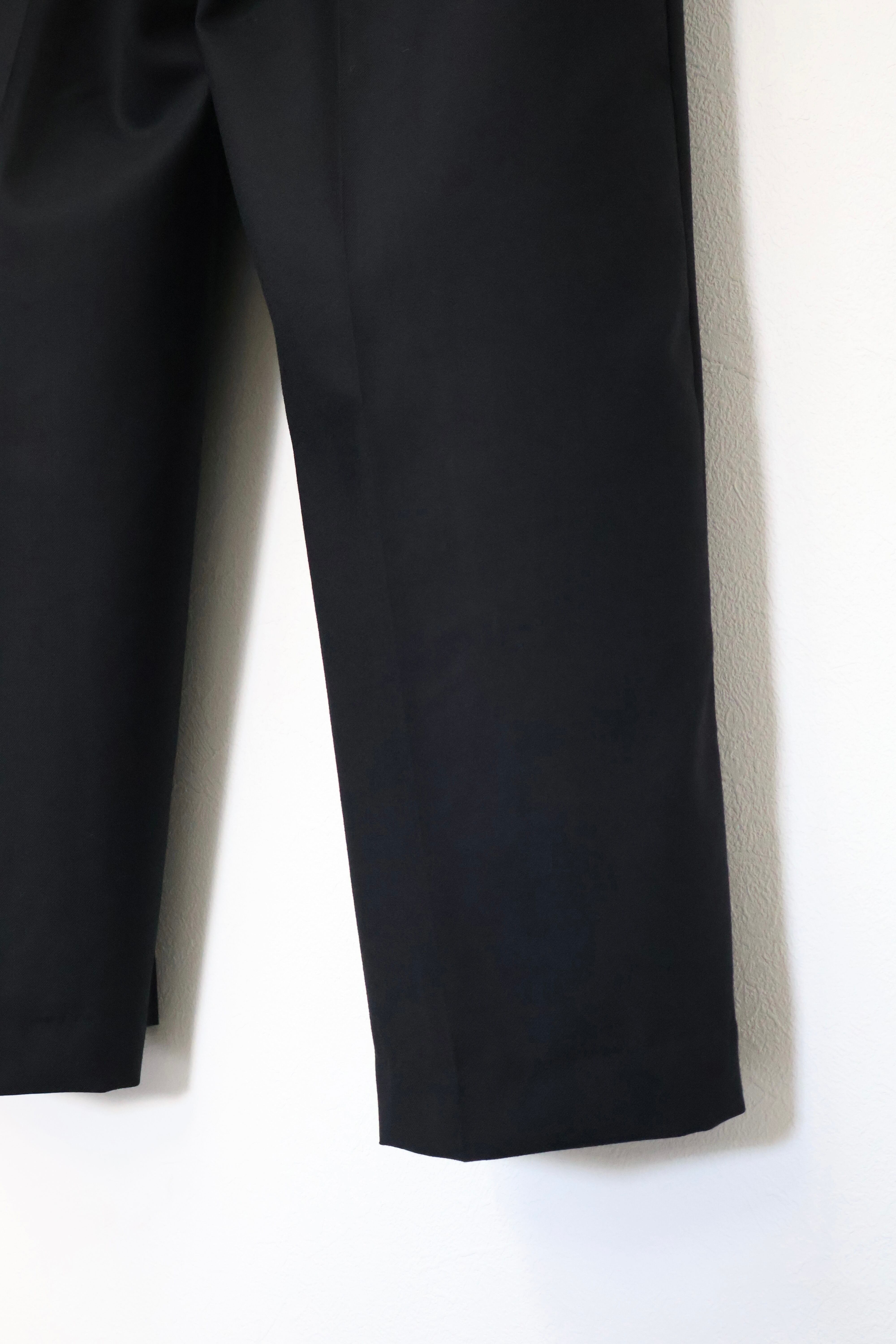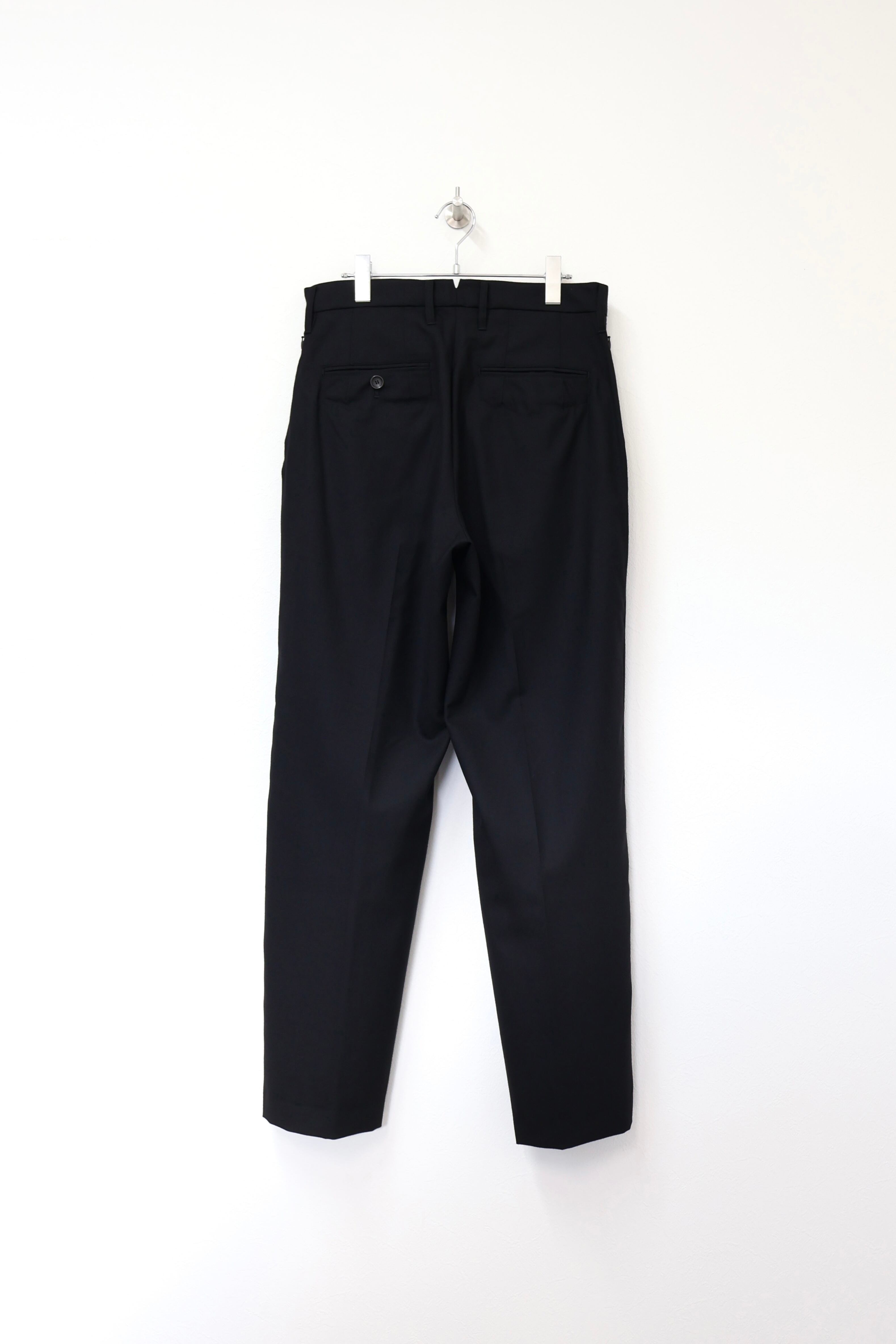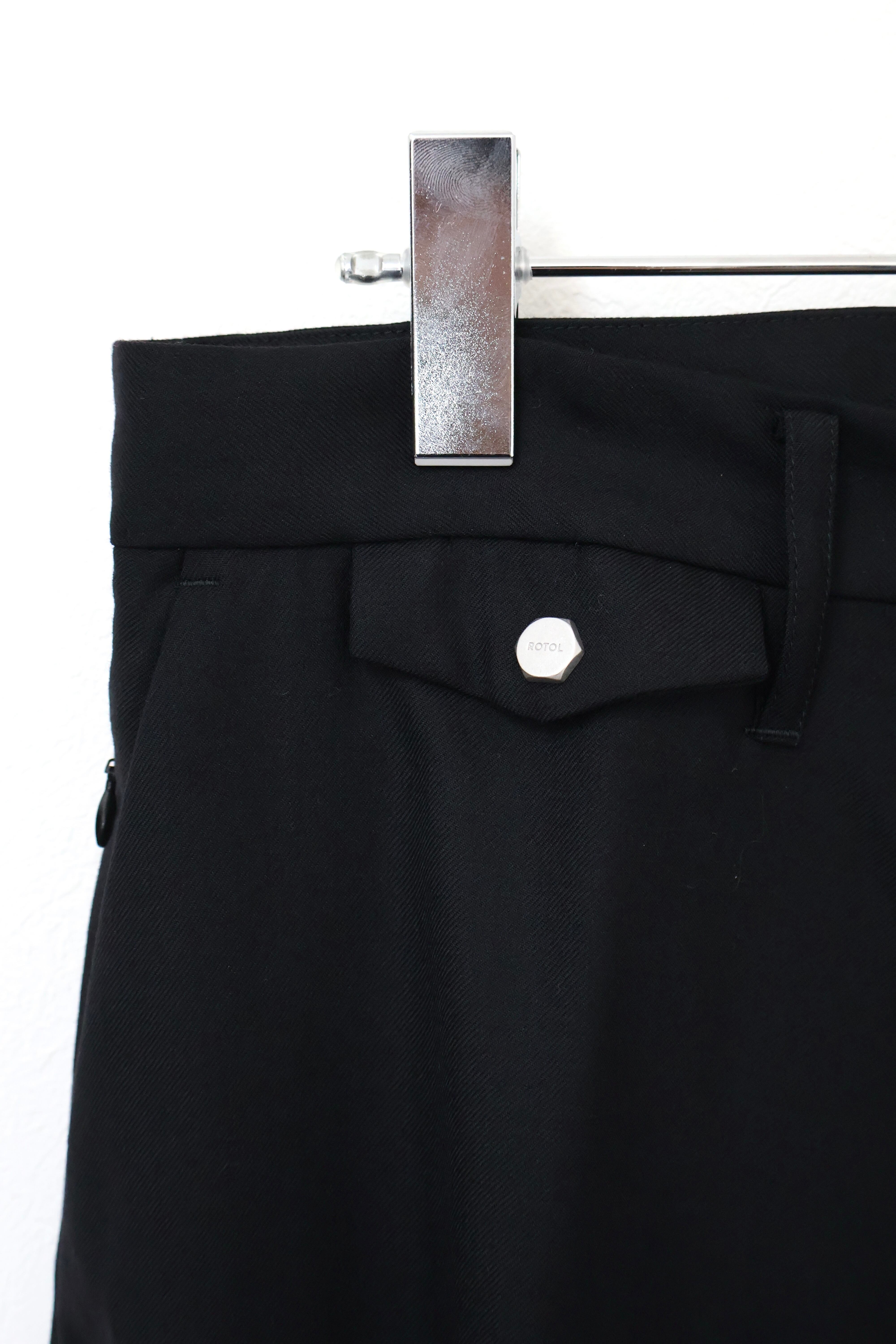 SUPER100S のウールサージを使用したワイドスラックス。 腰回りをすっきりと見せるノータック仕様。 腰ポケットにはジップポケットとスラッシュポケットを組み込み、 コインポケットのフラップにはアイコンのドットボタンを配置。