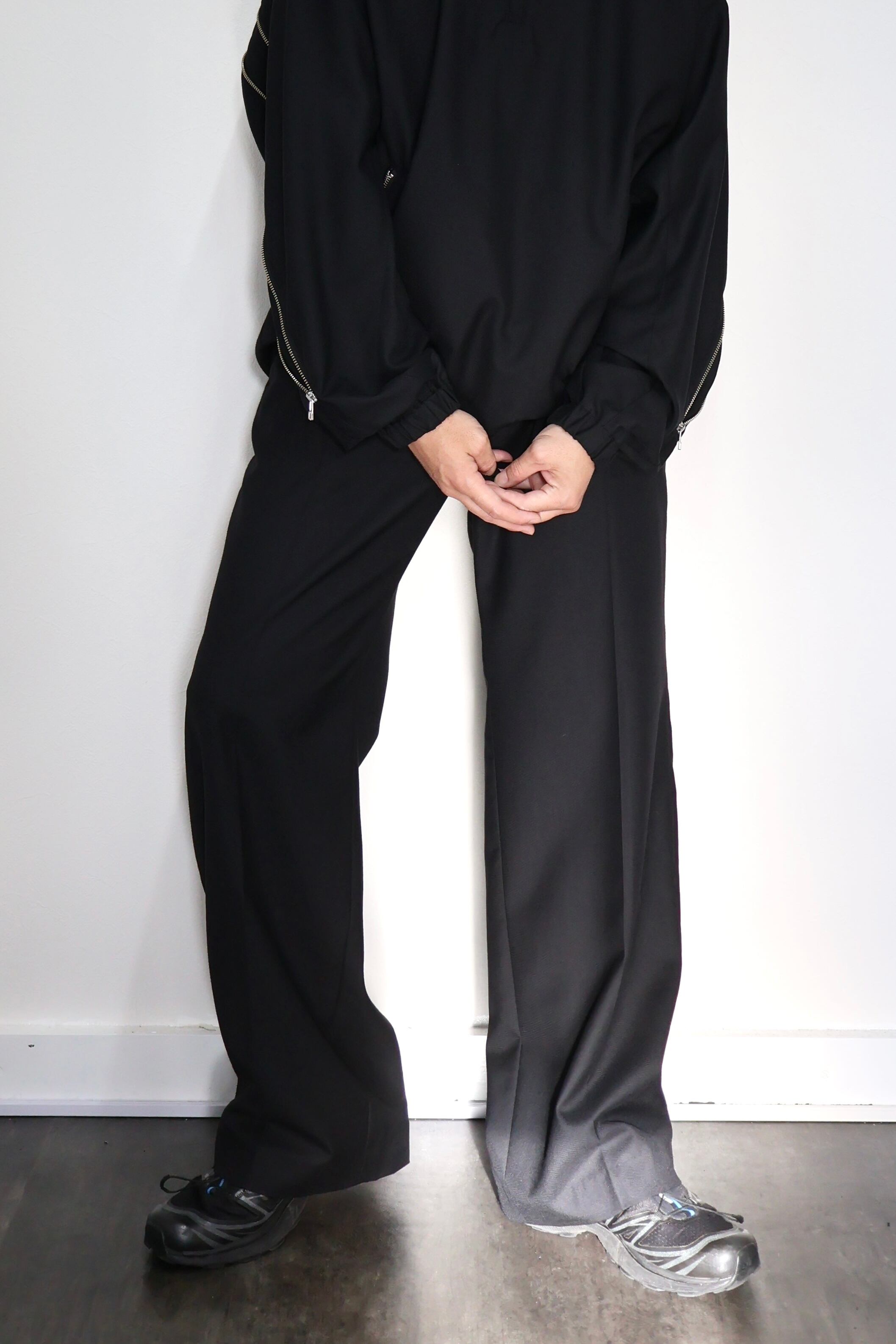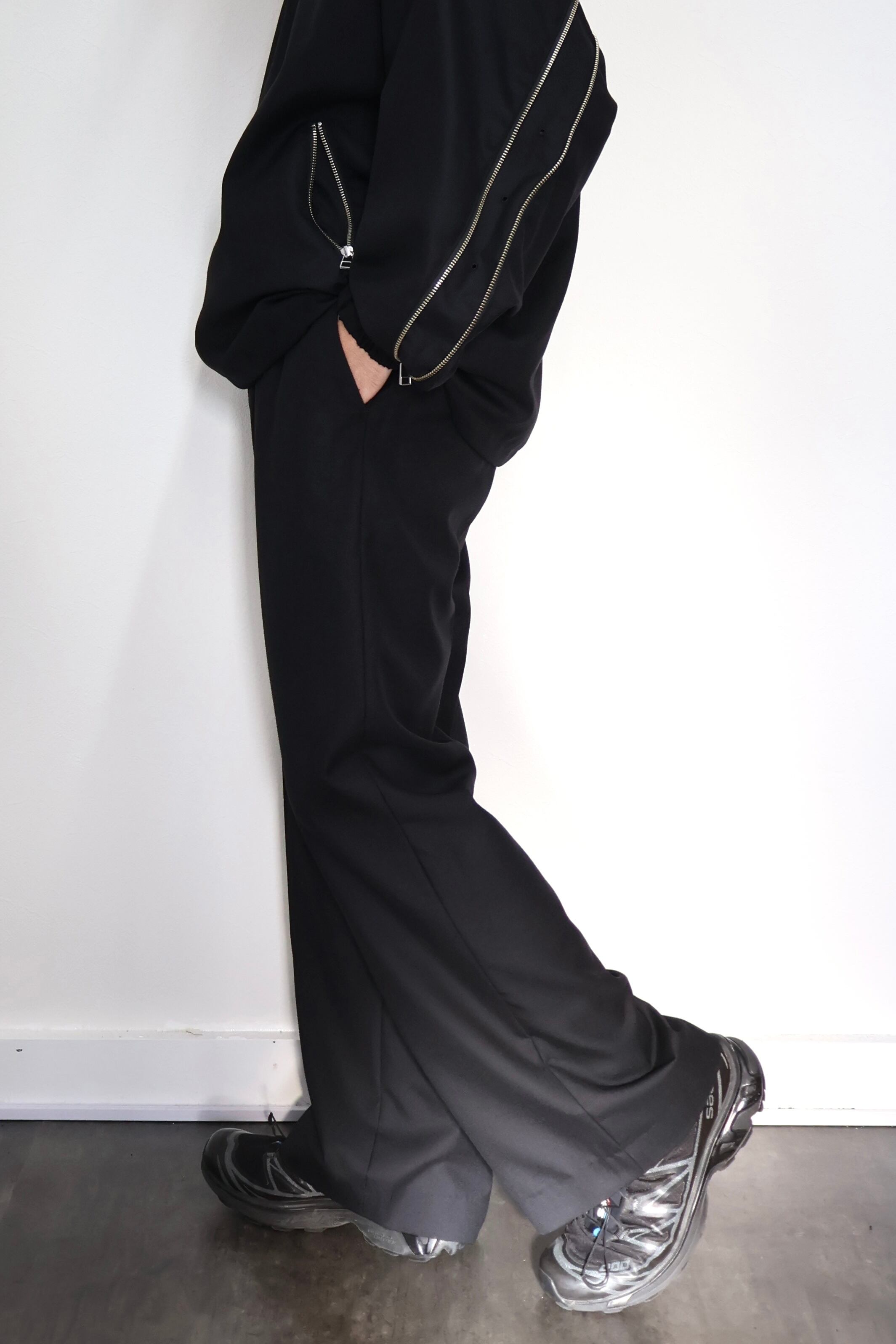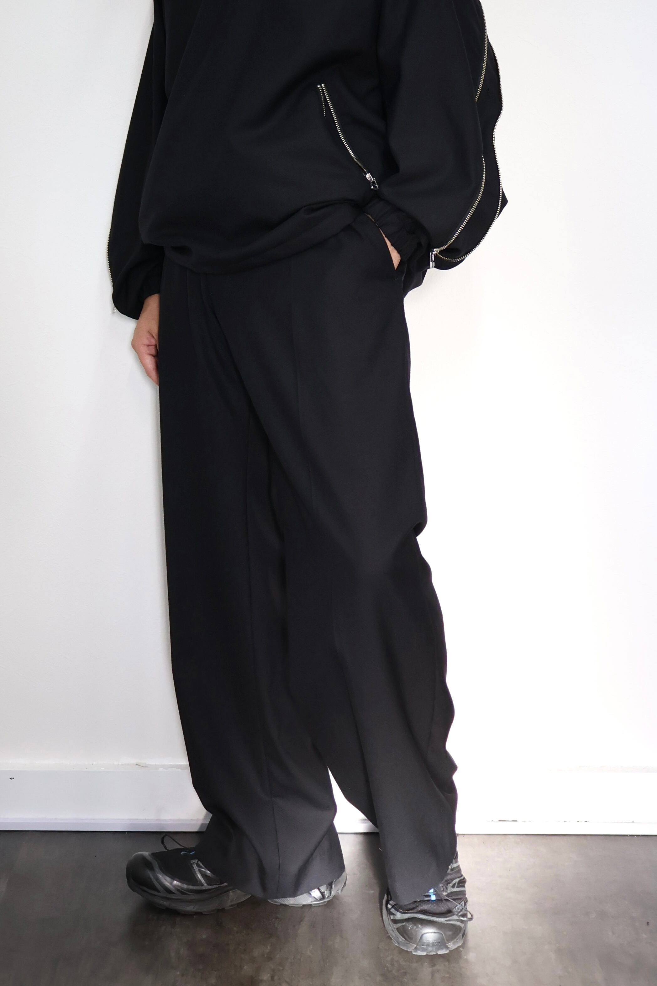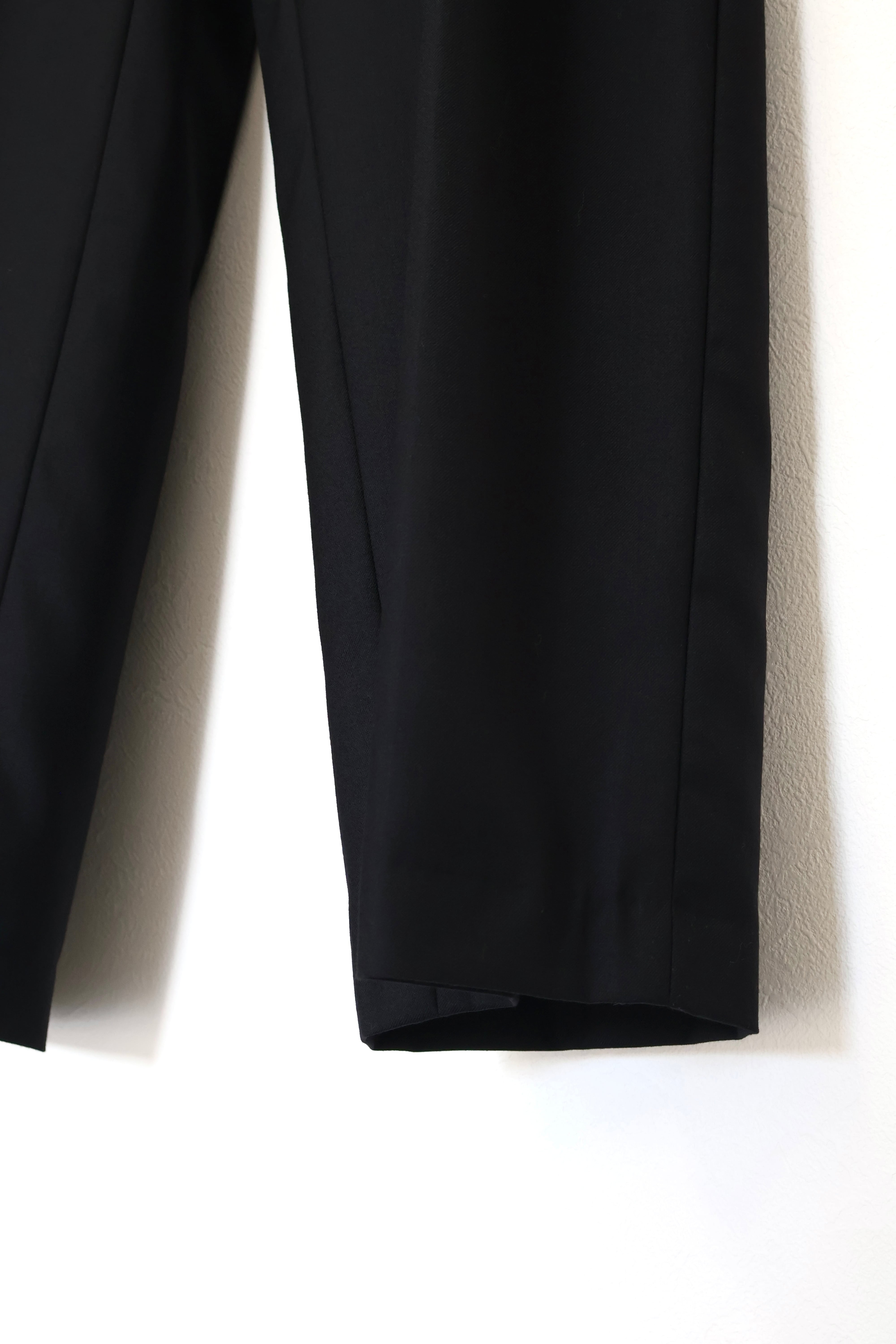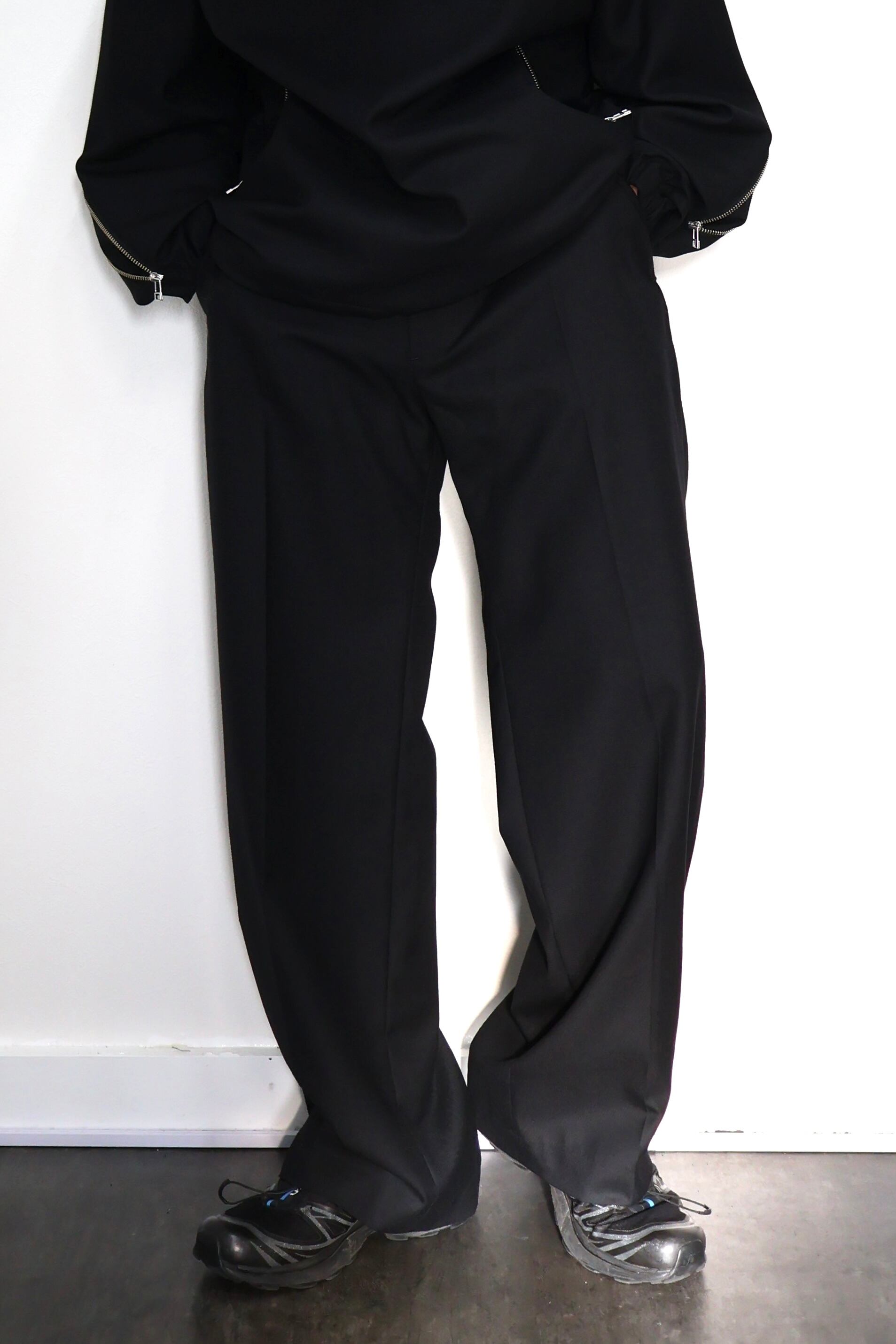 SUPER100S のウールサージを使用したワイドスラックス。 腰回りをすっきりと見せるノータック仕様。 腰ポケットにはジップポケットとスラッシュポケットを組み込み、 コインポケットのフラップにはアイコンのドットボタンを配置。