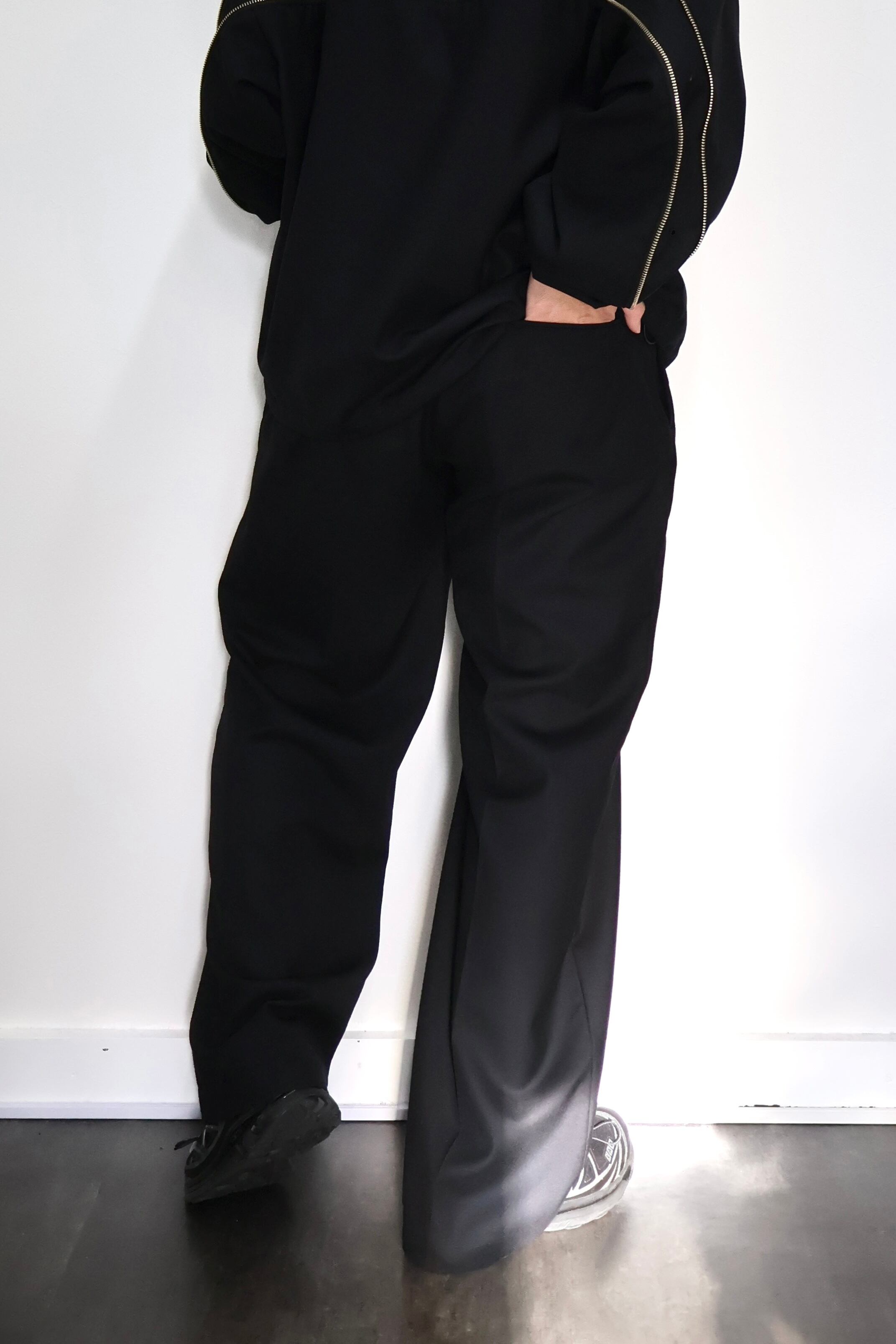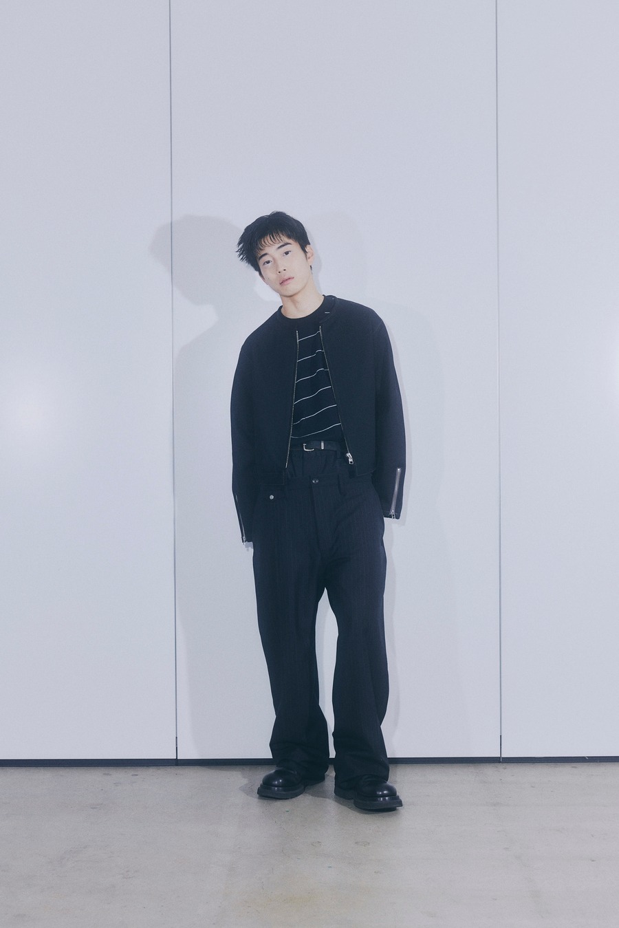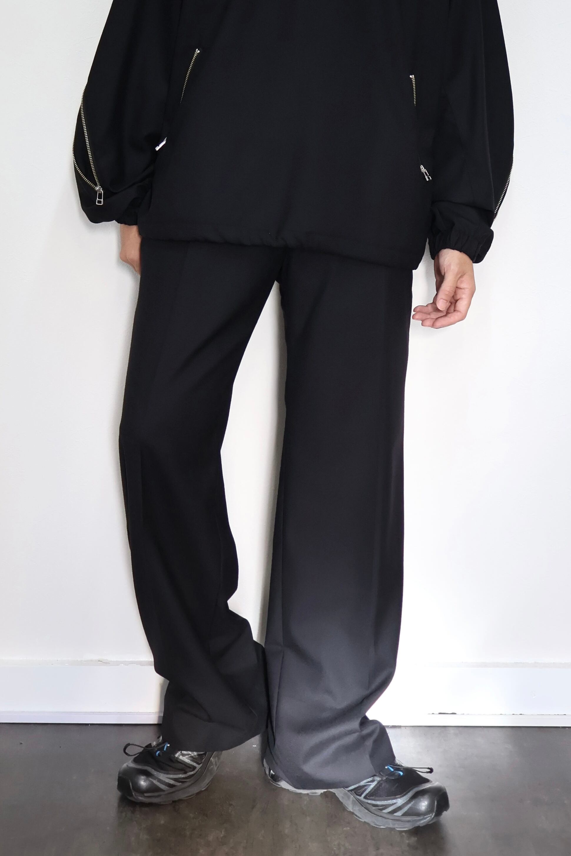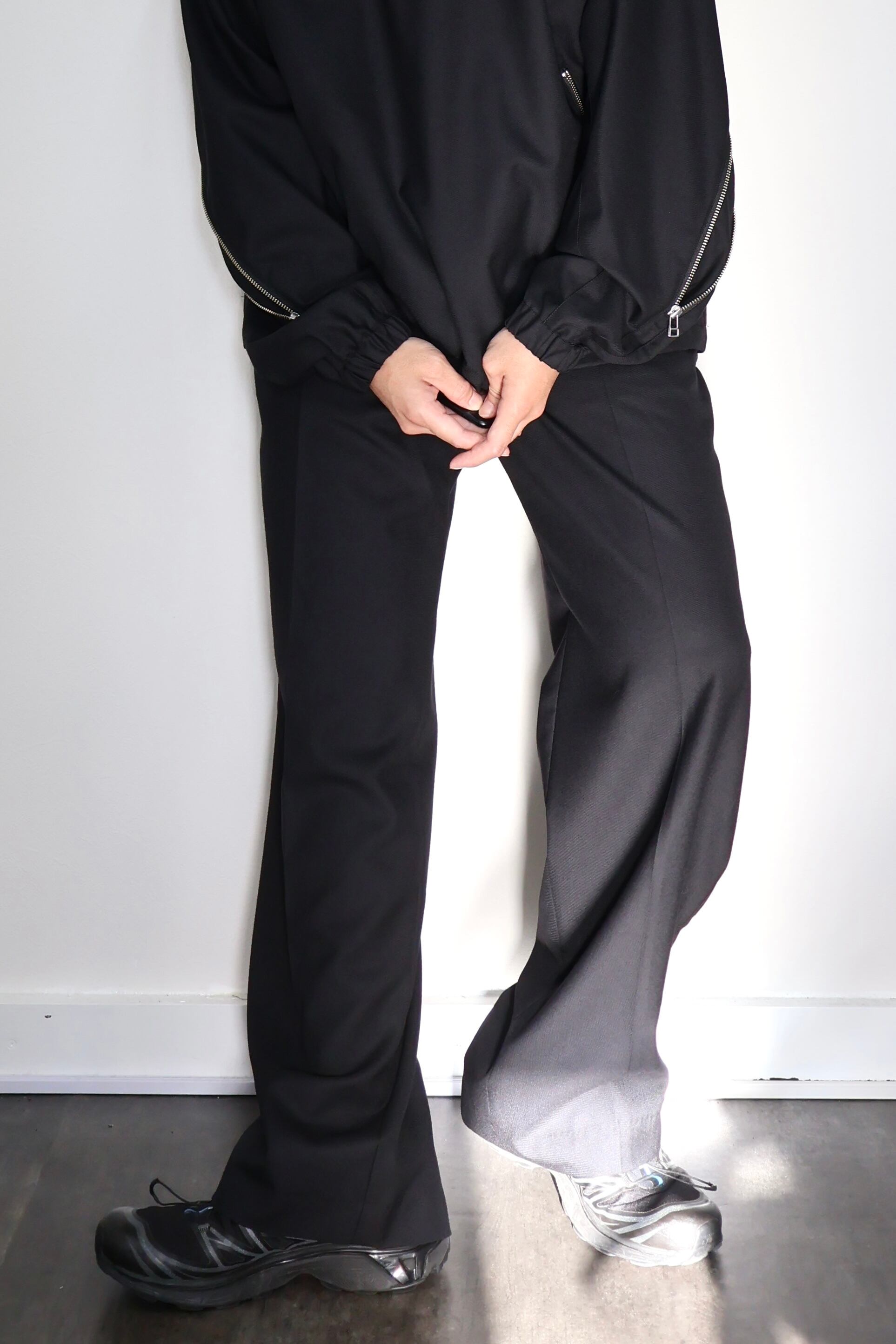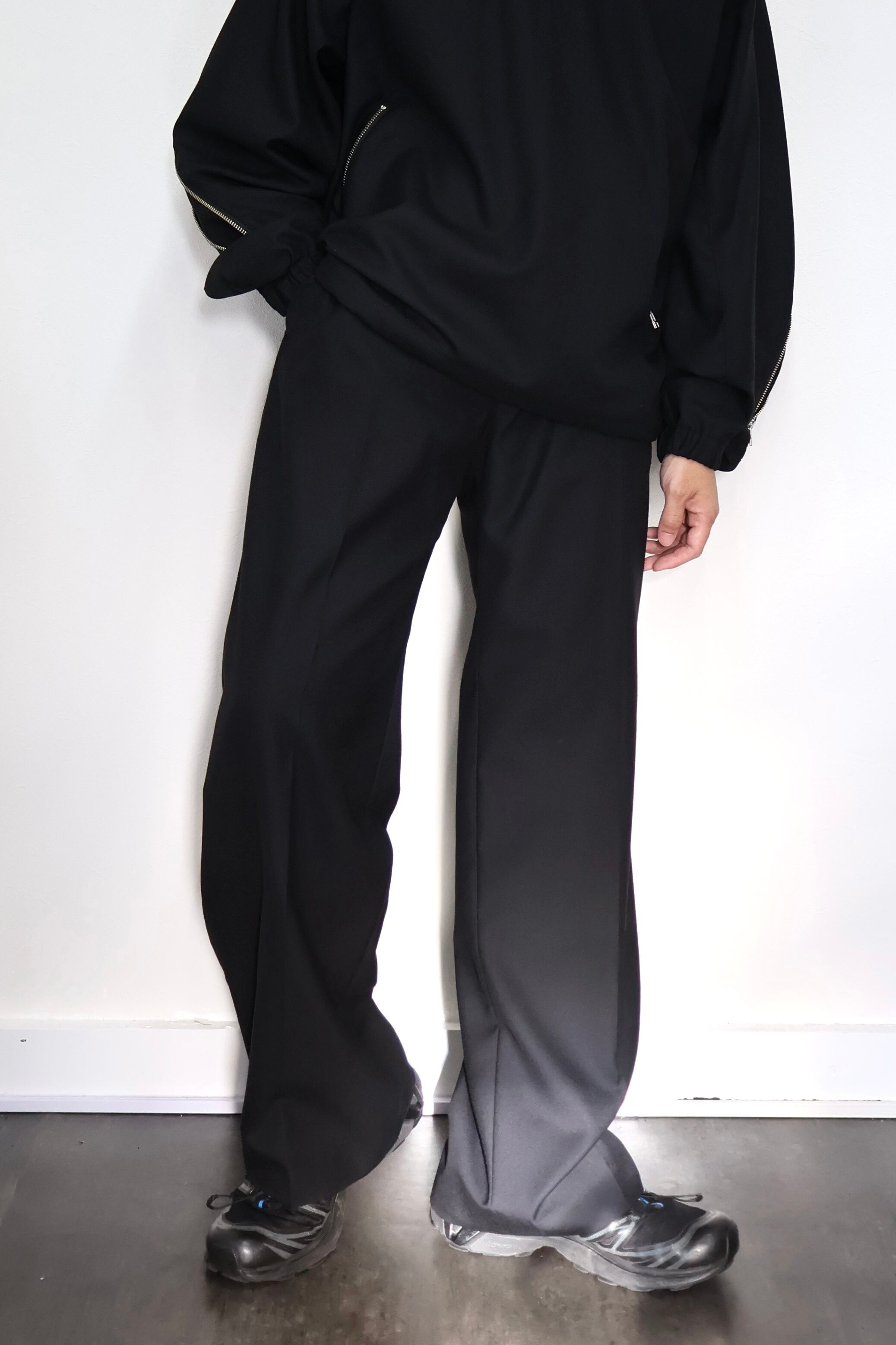 SUPER100S のウールサージを使用したワイドスラックス。 腰回りをすっきりと見せるノータック仕様。 腰ポケットにはジップポケットとスラッシュポケットを組み込み、 コインポケットのフラップにはアイコンのドットボタンを配置。