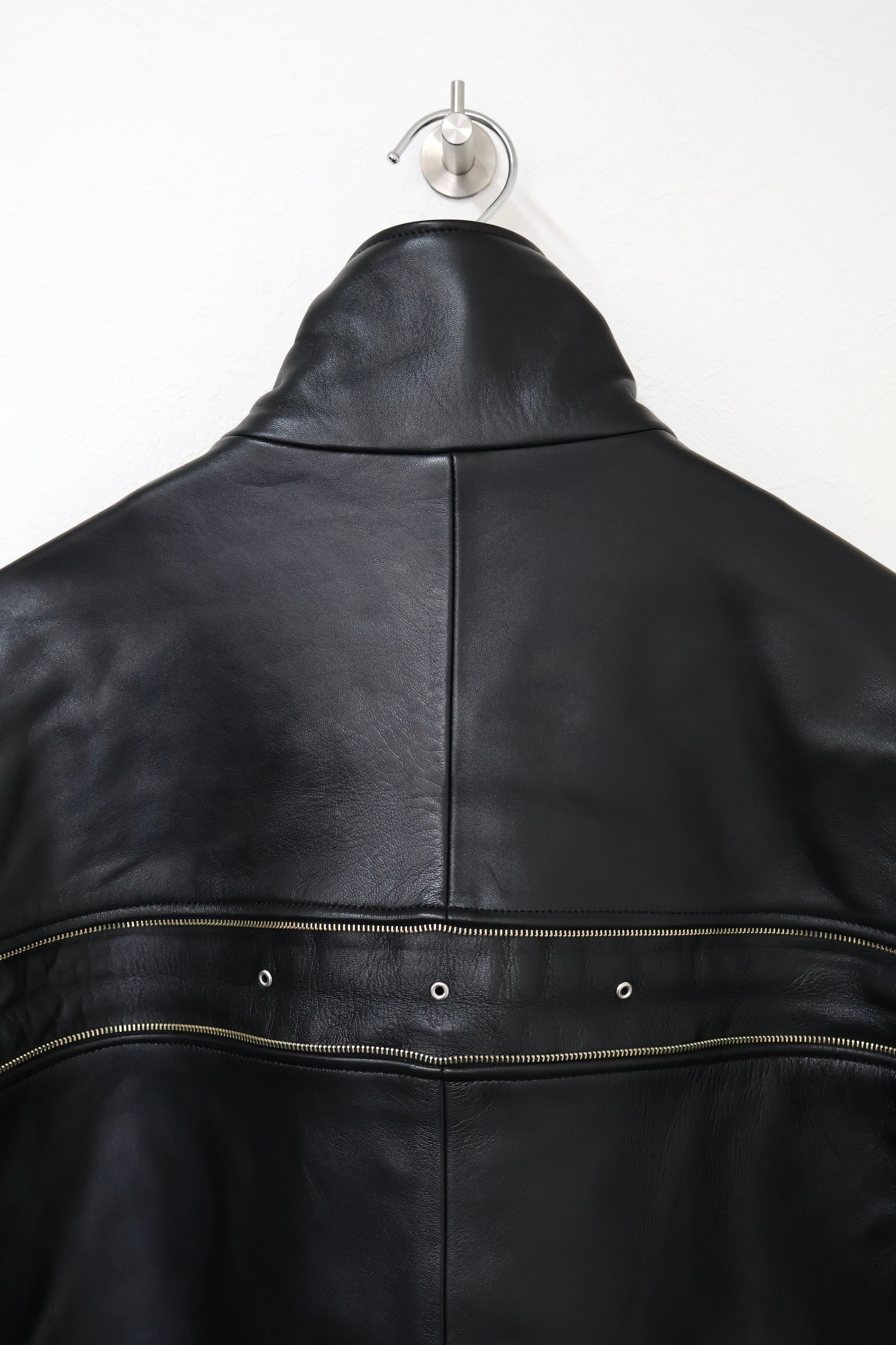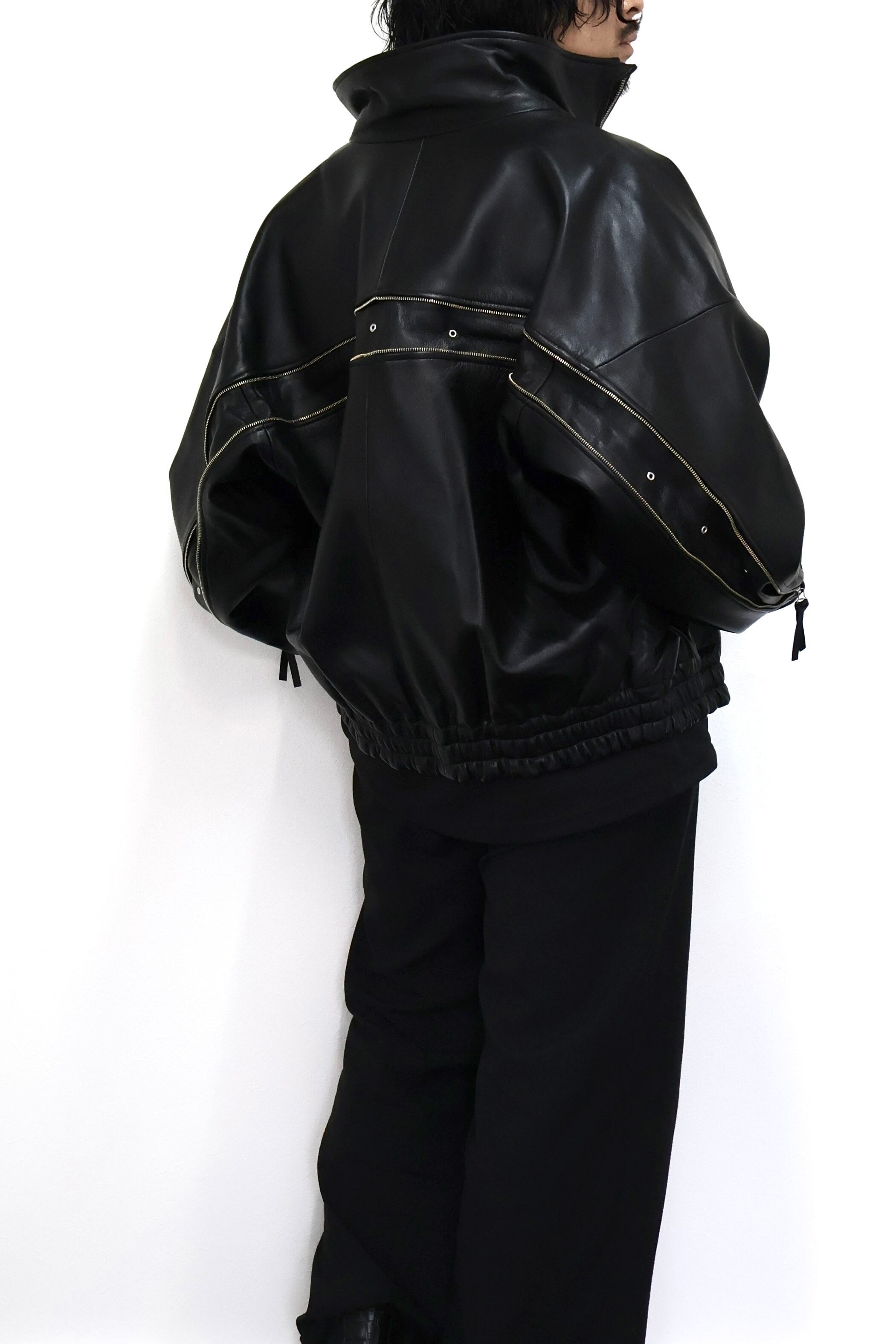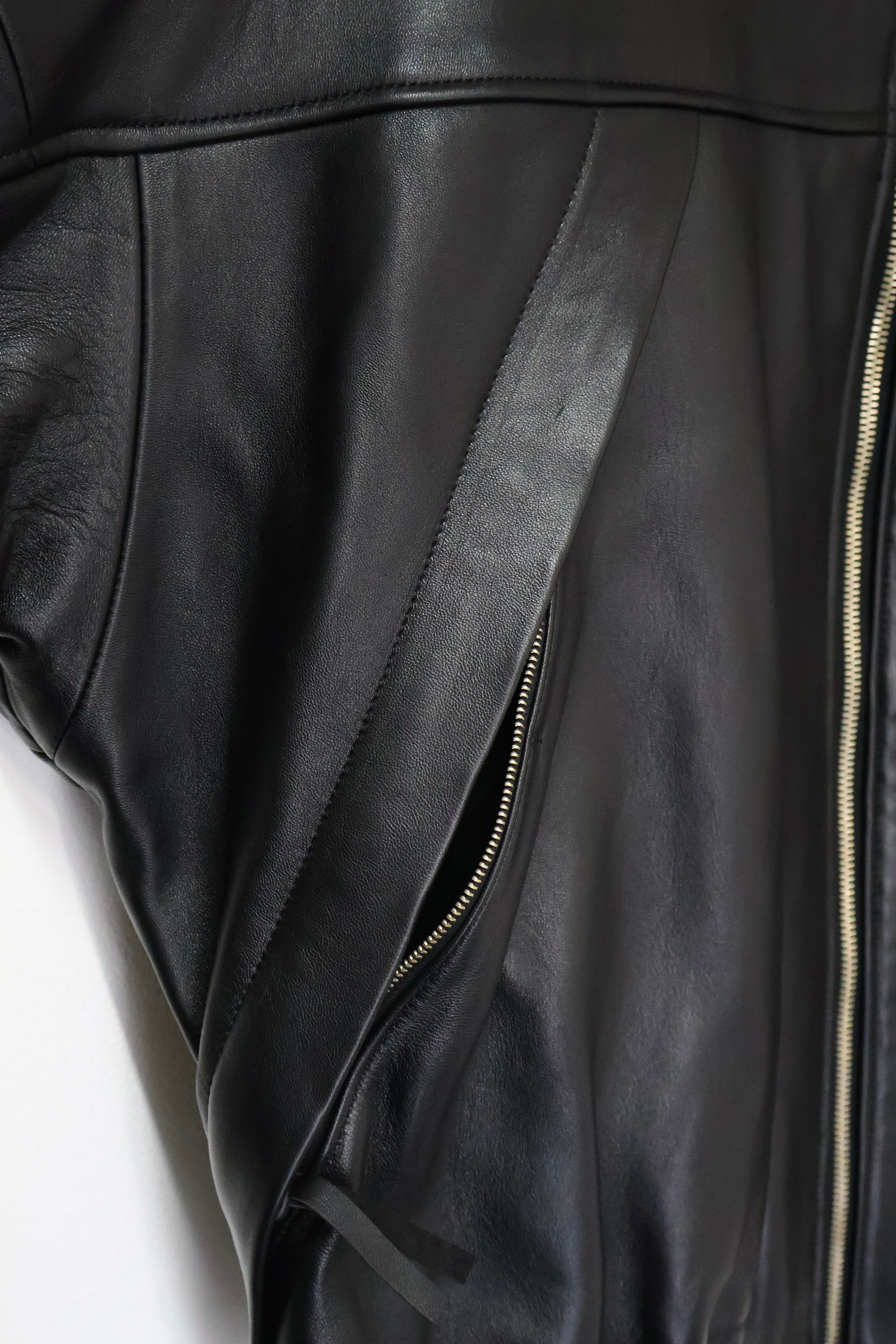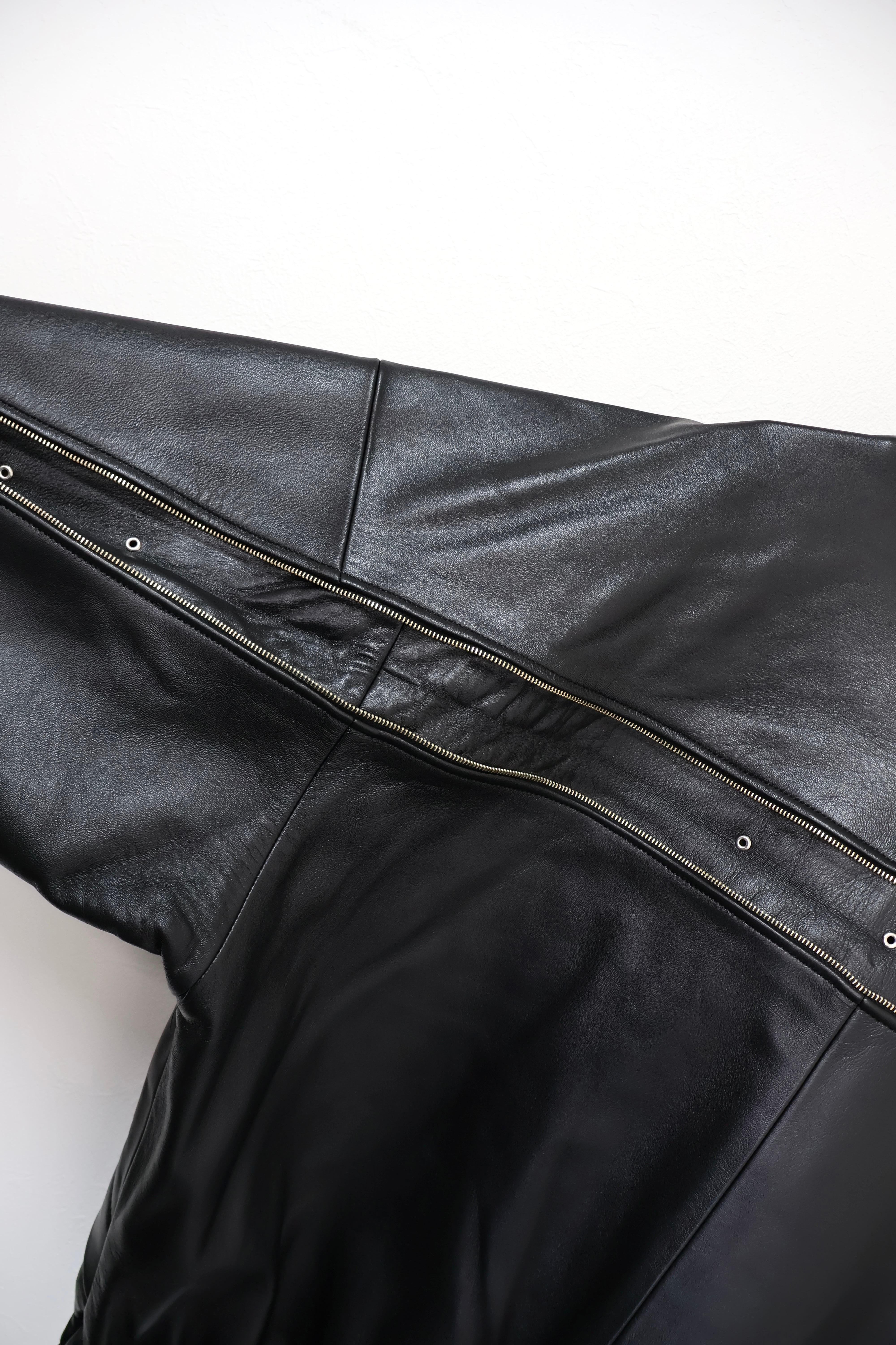 ブラックのシープレザーを使用したフルジップブルゾン。 背中のジップは開閉することでシルエットを変化させるだけでなくベンチレーションとしての機能も備えている。 袖口と裾はゴム仕様。 ハの字のジップ内は上下で仕切られており使い勝手の良い収納システムとなっている。