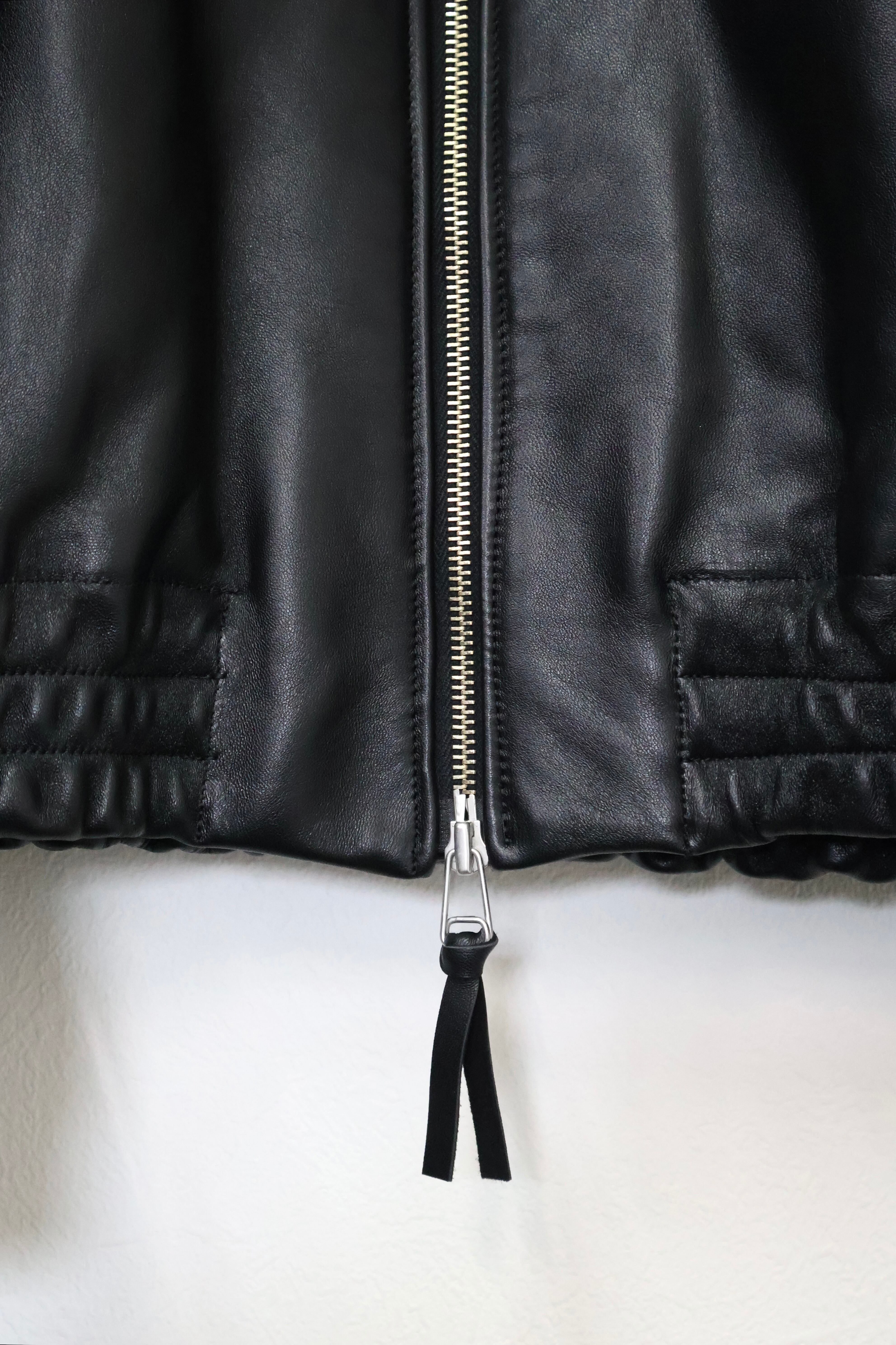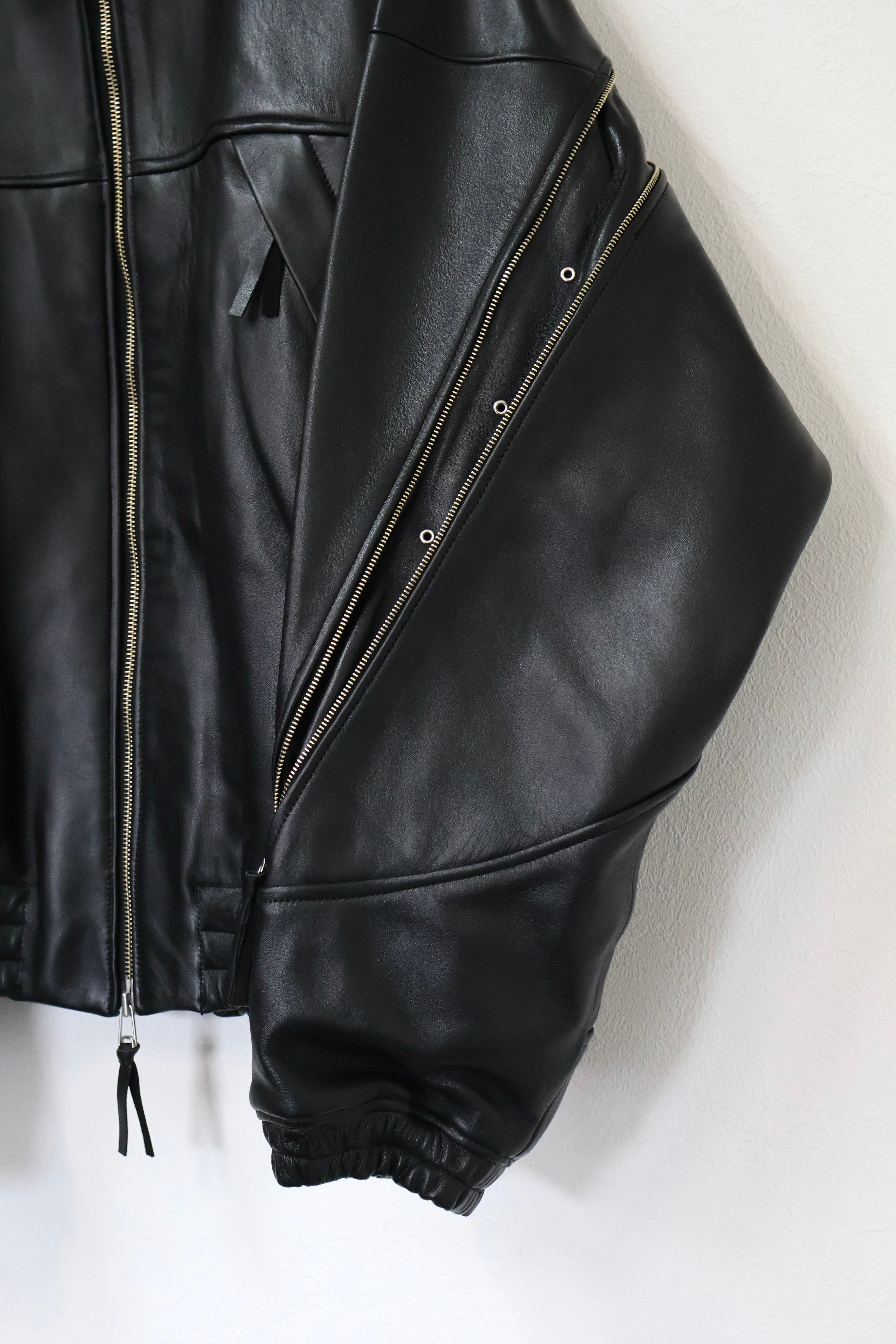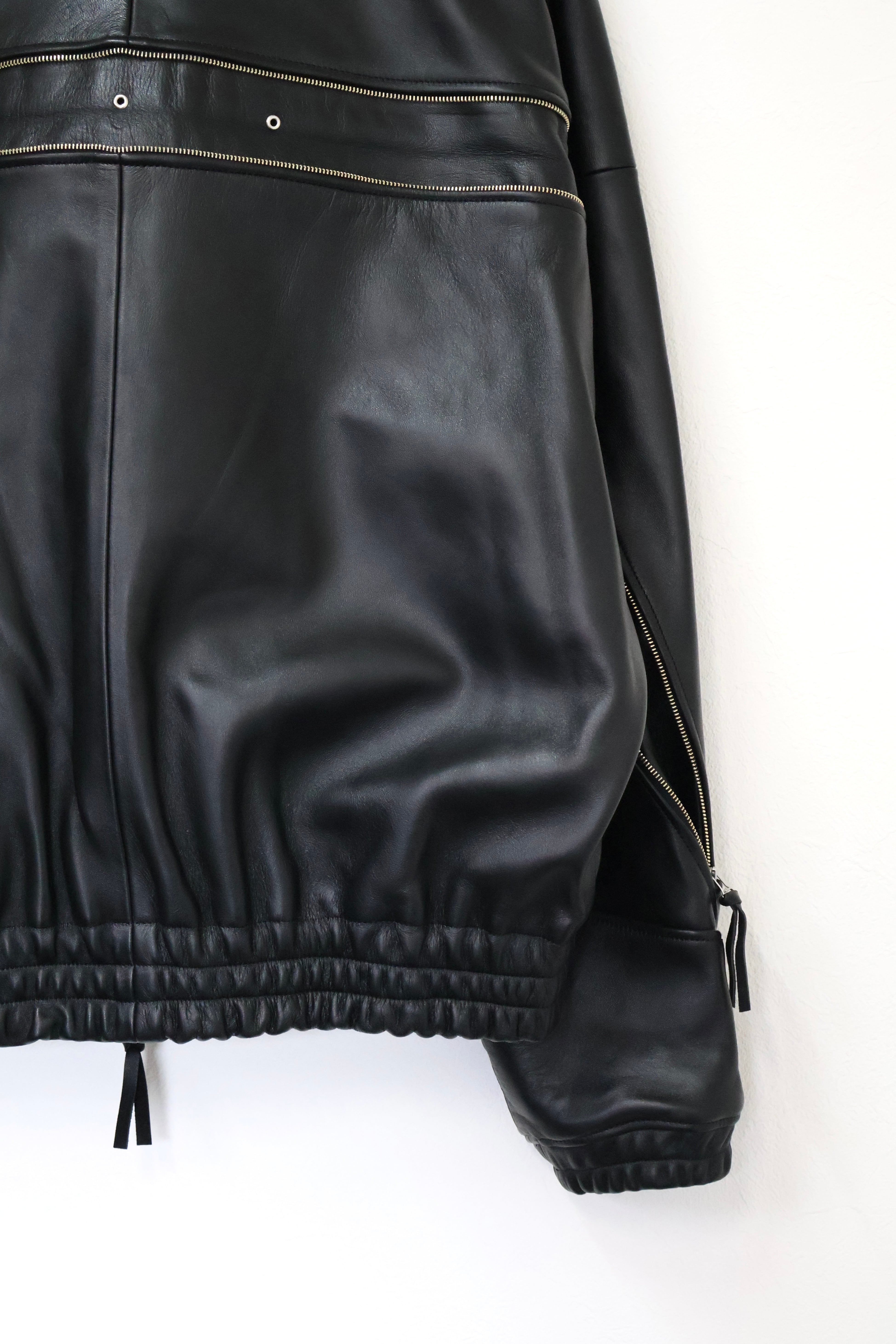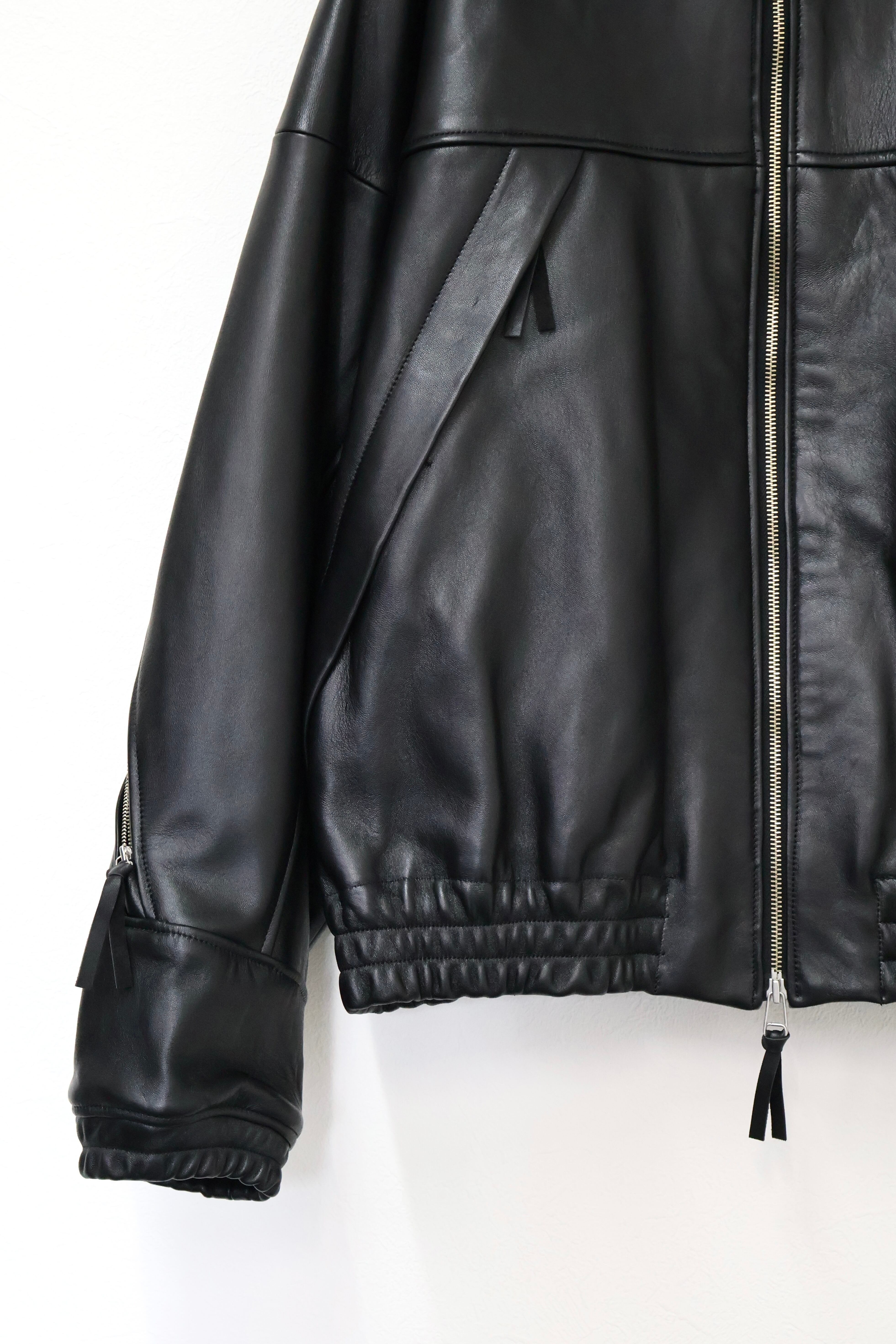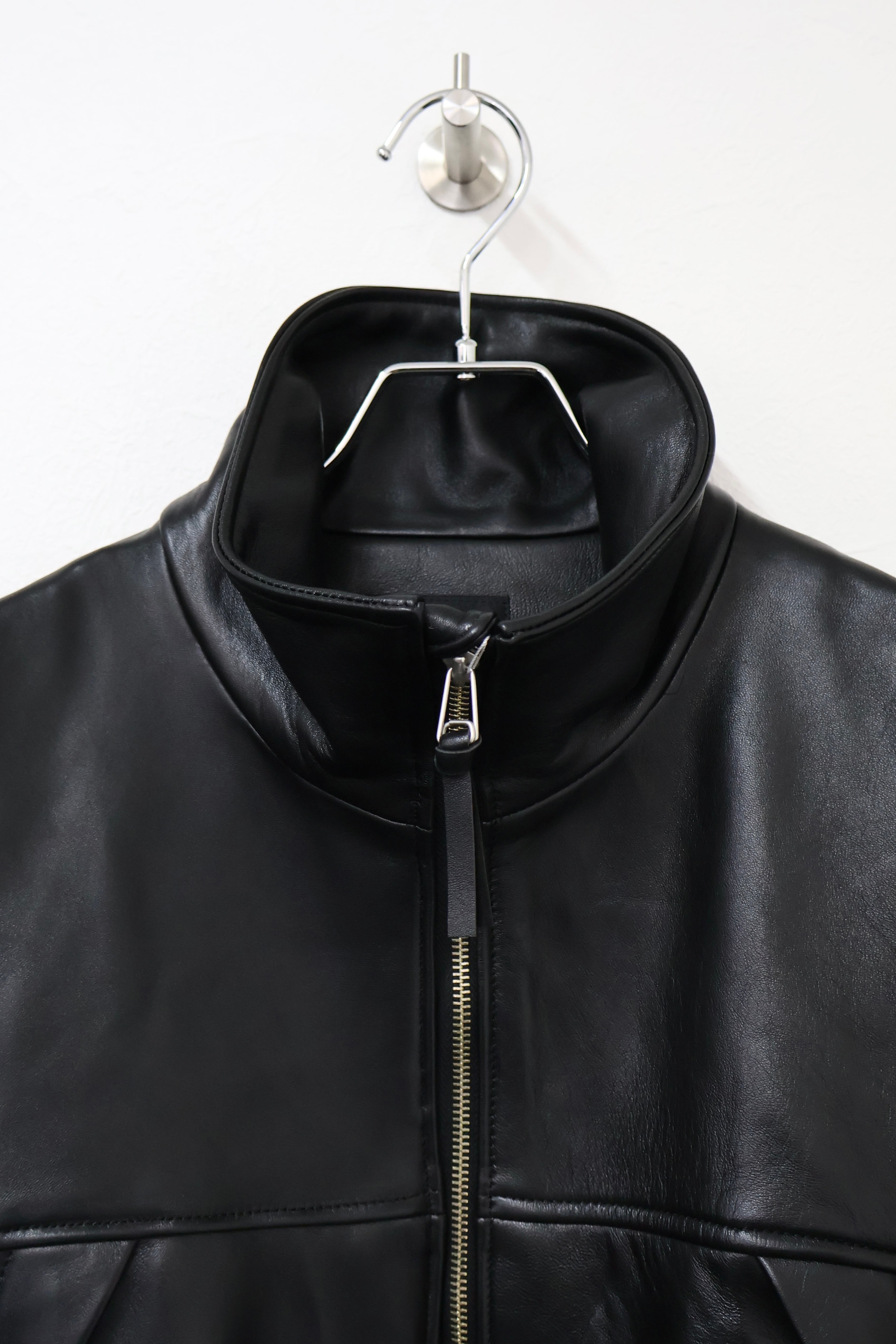 ブラックのシープレザーを使用したフルジップブルゾン。 背中のジップは開閉することでシルエットを変化させるだけでなくベンチレーションとしての機能も備えている。 袖口と裾はゴム仕様。 ハの字のジップ内は上下で仕切られており使い勝手の良い収納システムとなっている。