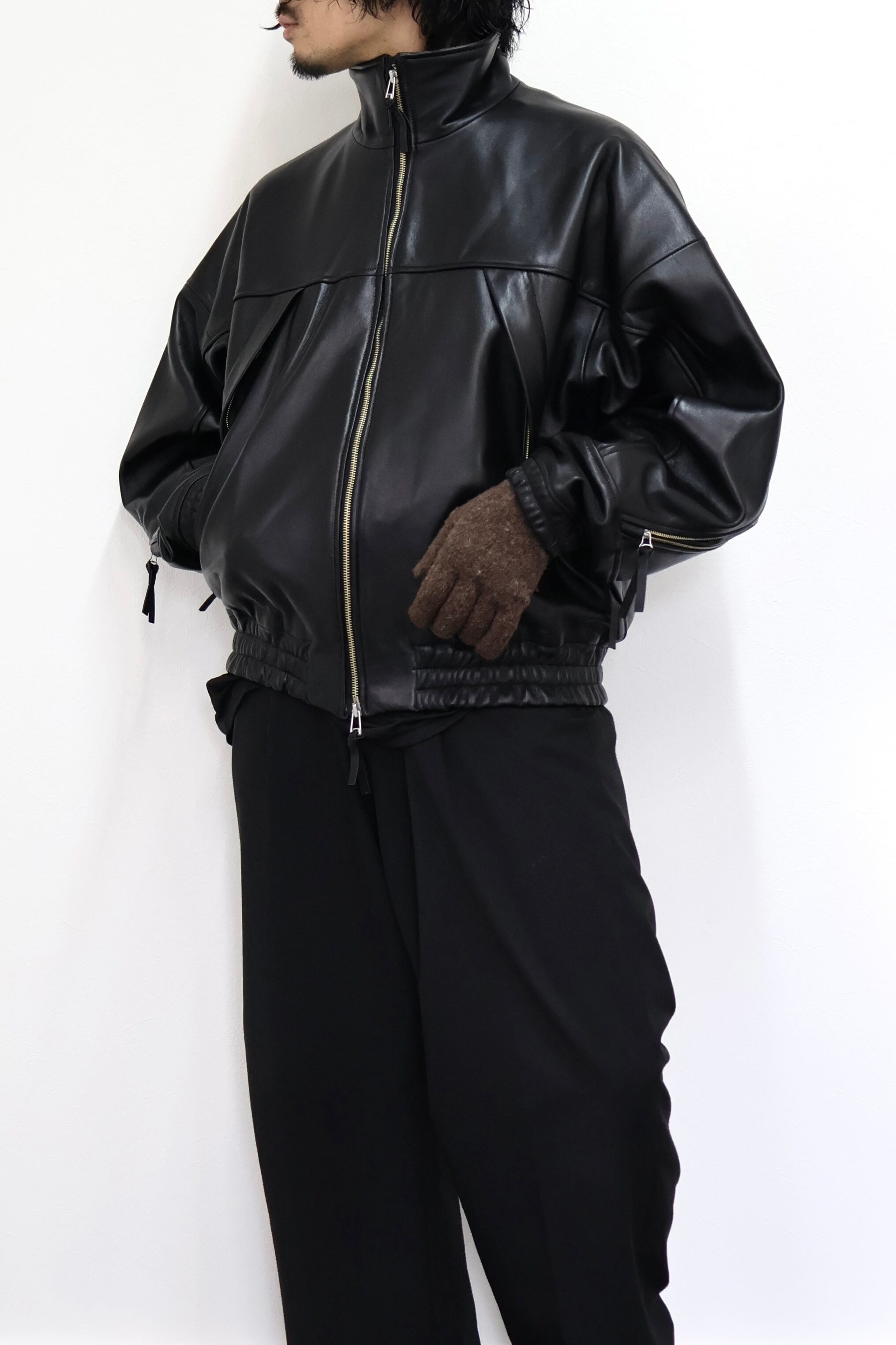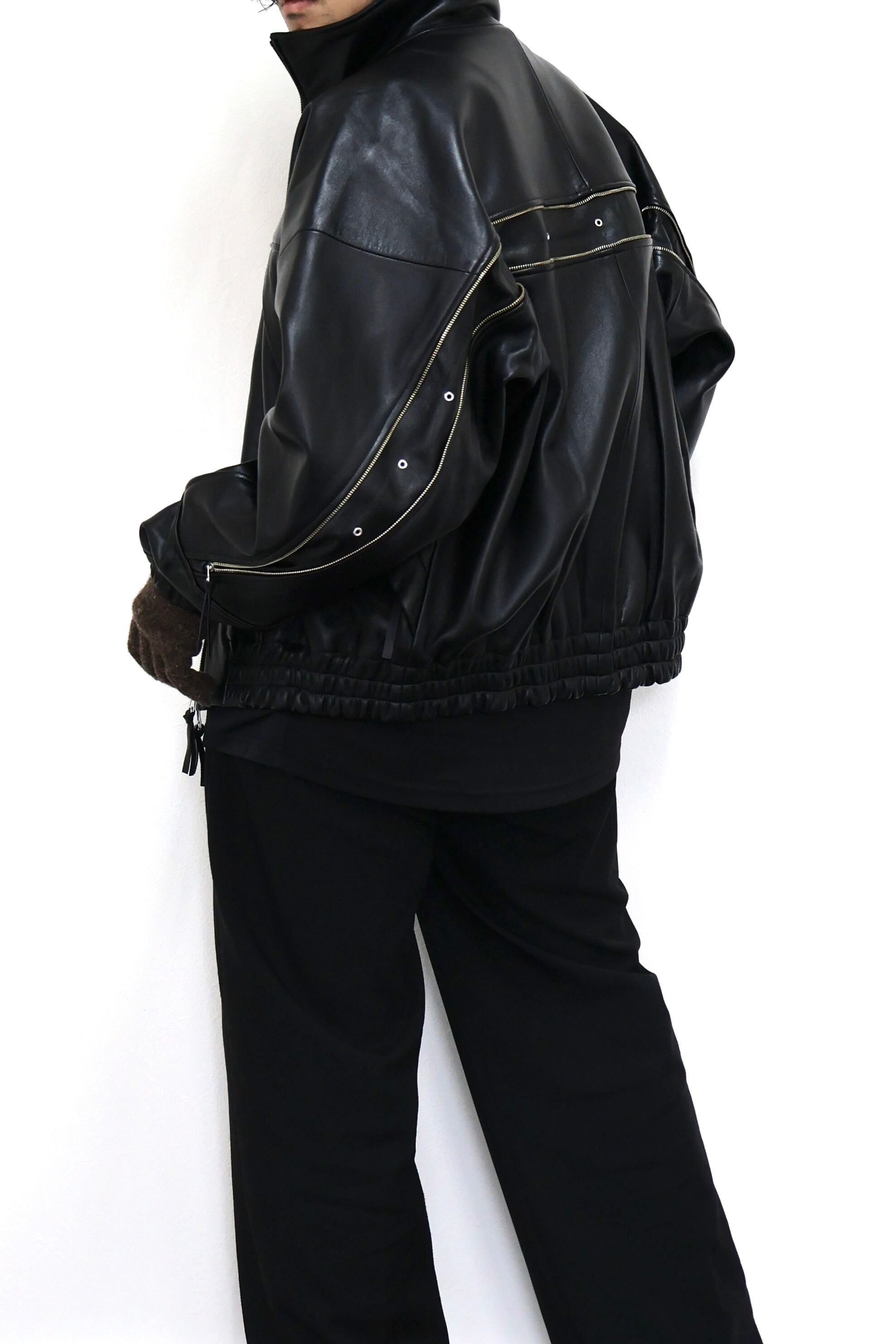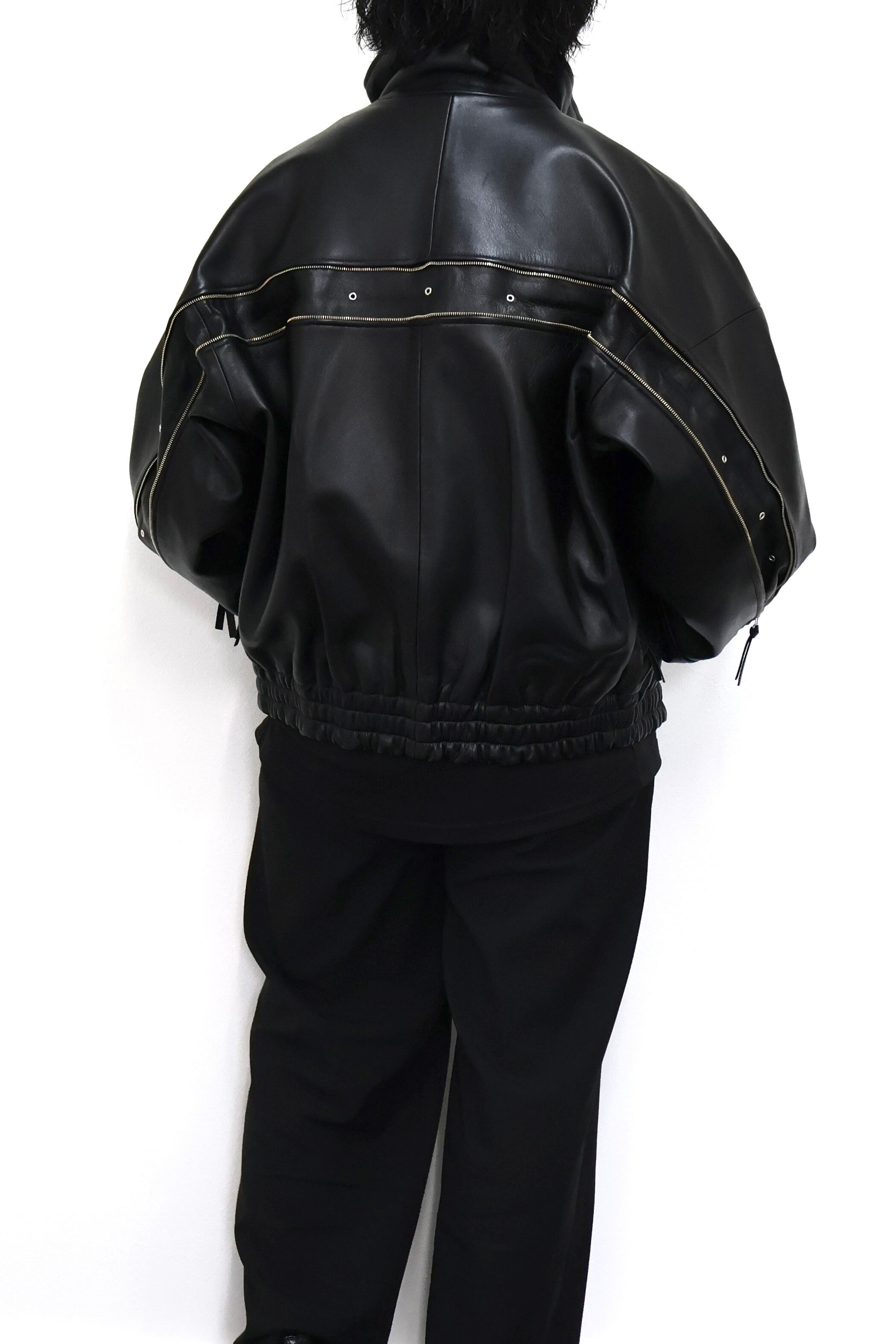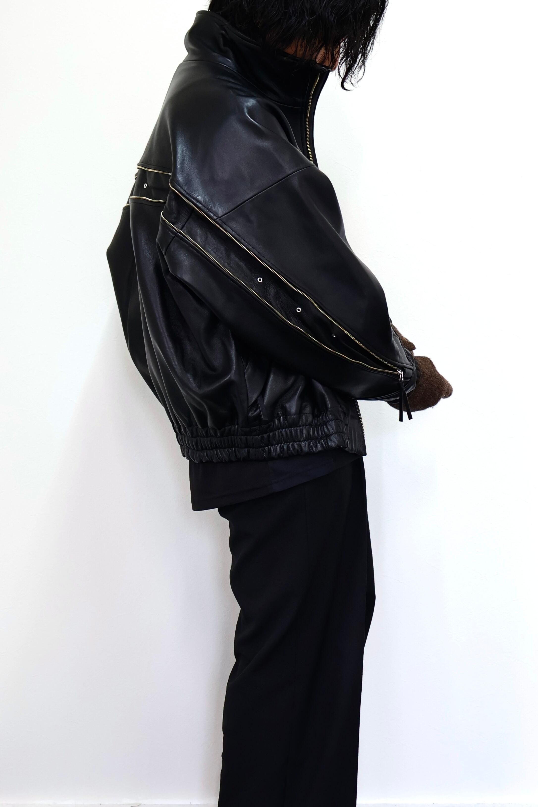 ブラックのシープレザーを使用したフルジップブルゾン。 背中のジップは開閉することでシルエットを変化させるだけでなくベンチレーションとしての機能も備えている。 袖口と裾はゴム仕様。 ハの字のジップ内は上下で仕切られており使い勝手の良い収納システムとなっている。