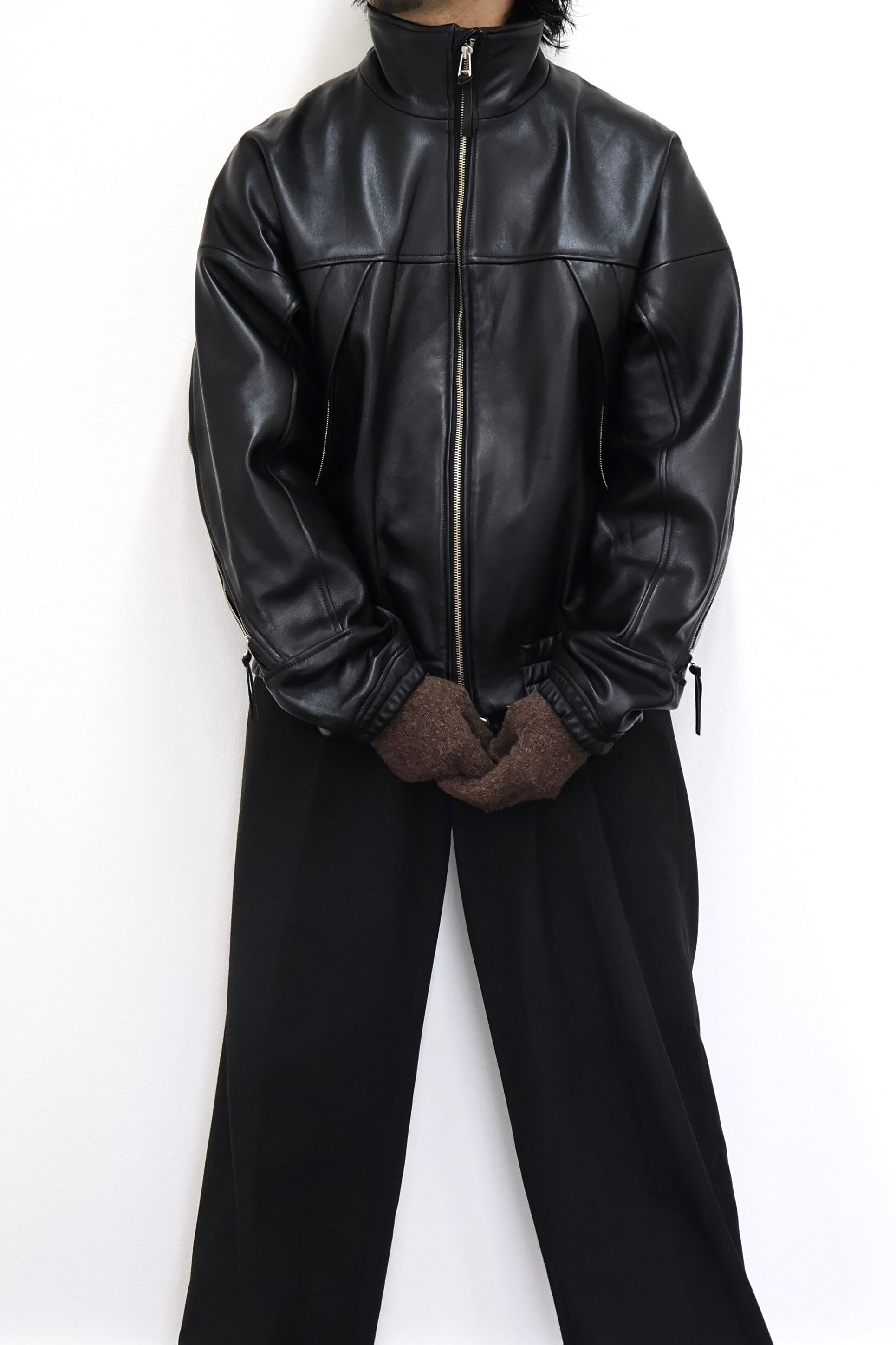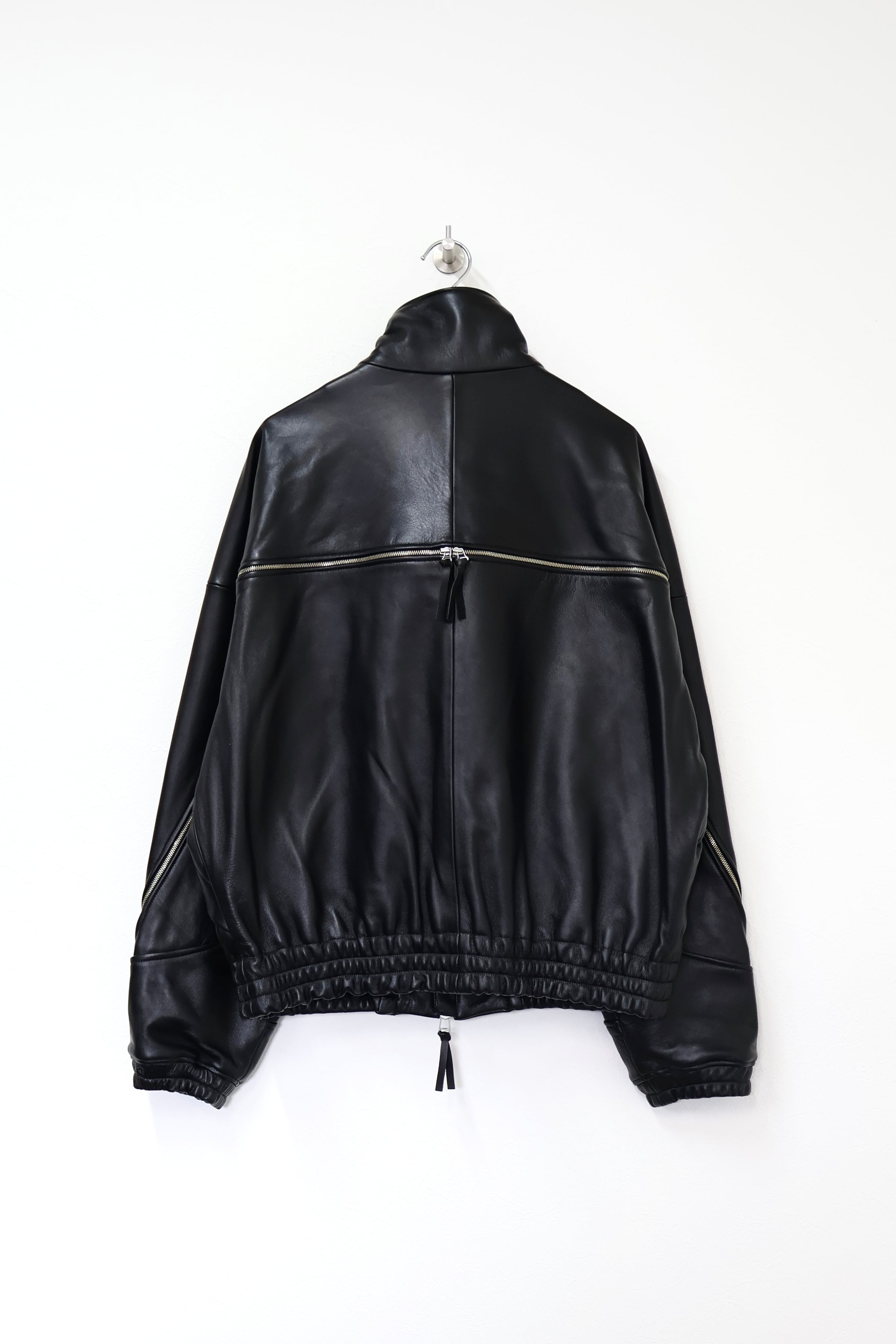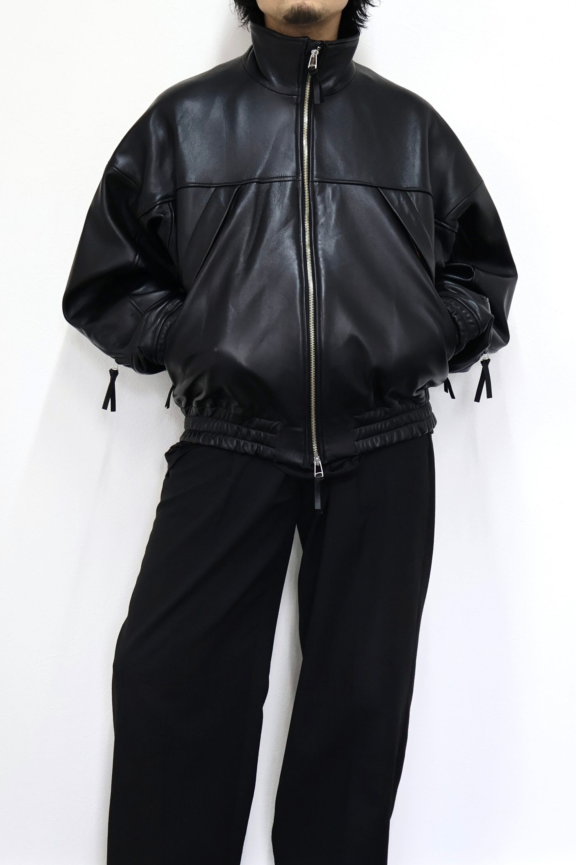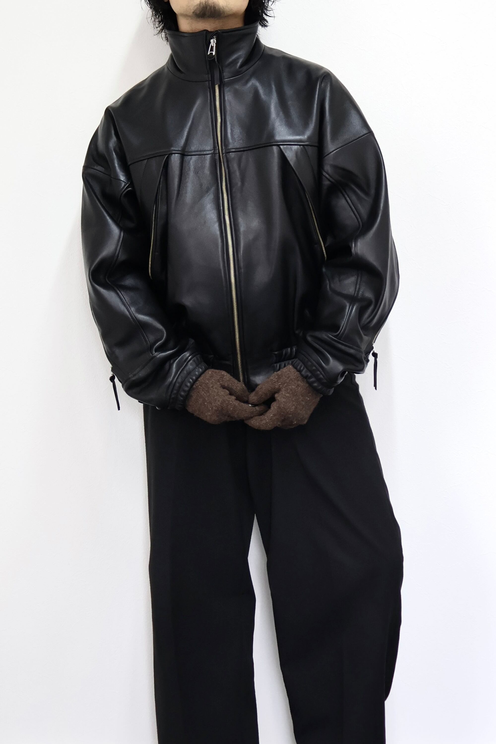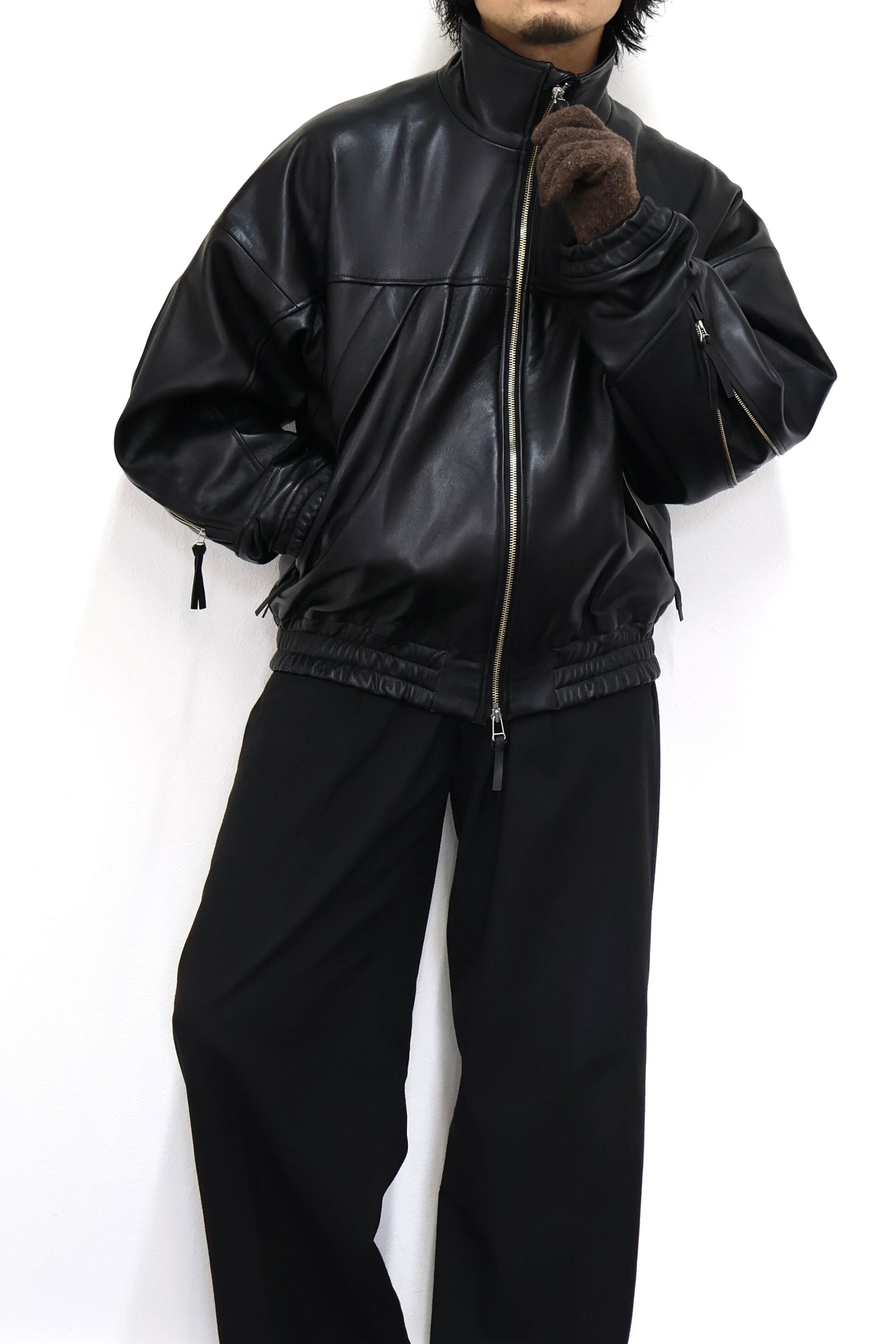 ブラックのシープレザーを使用したフルジップブルゾン。 背中のジップは開閉することでシルエットを変化させるだけでなくベンチレーションとしての機能も備えている。 袖口と裾はゴム仕様。 ハの字のジップ内は上下で仕切られており使い勝手の良い収納システムとなっている。