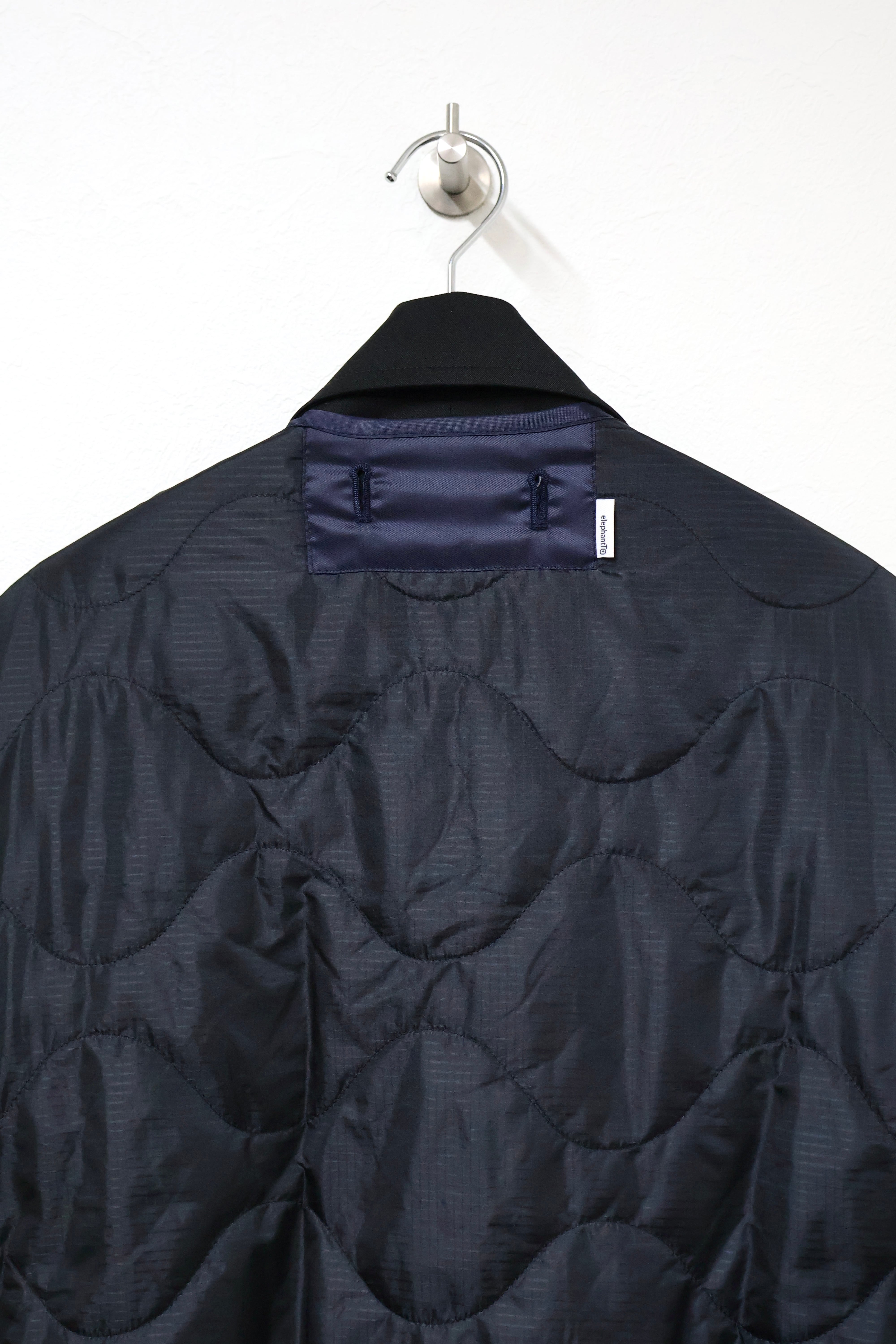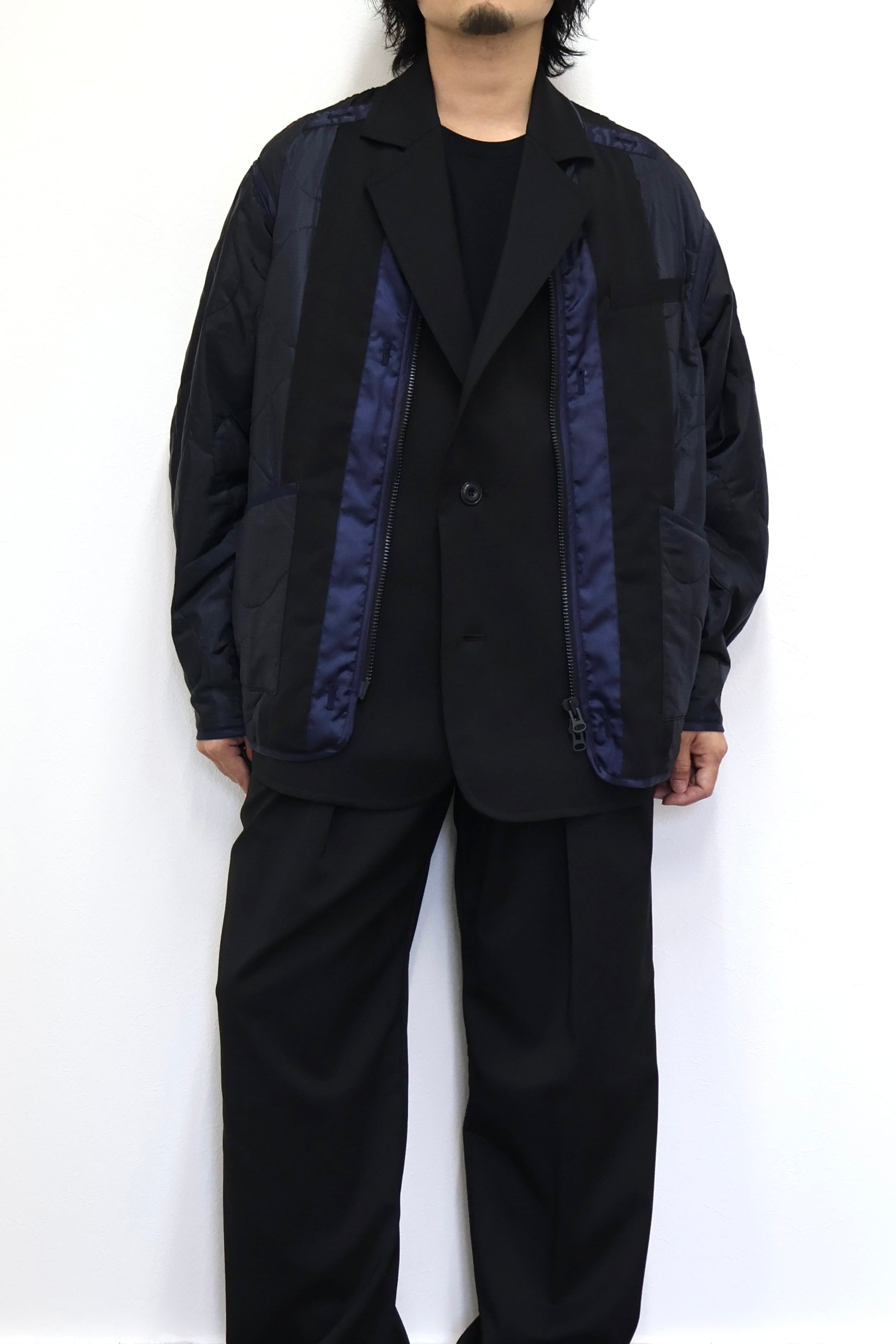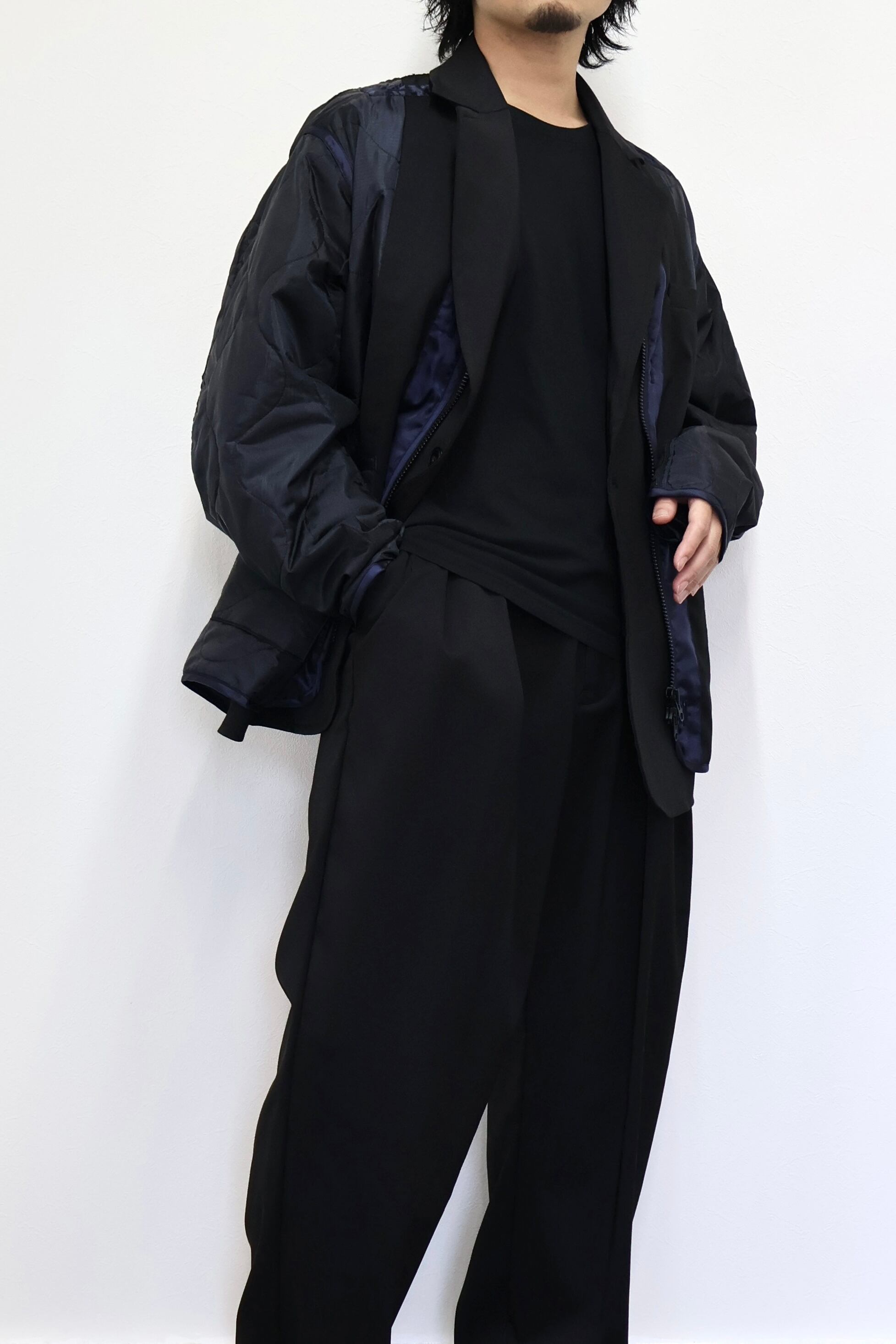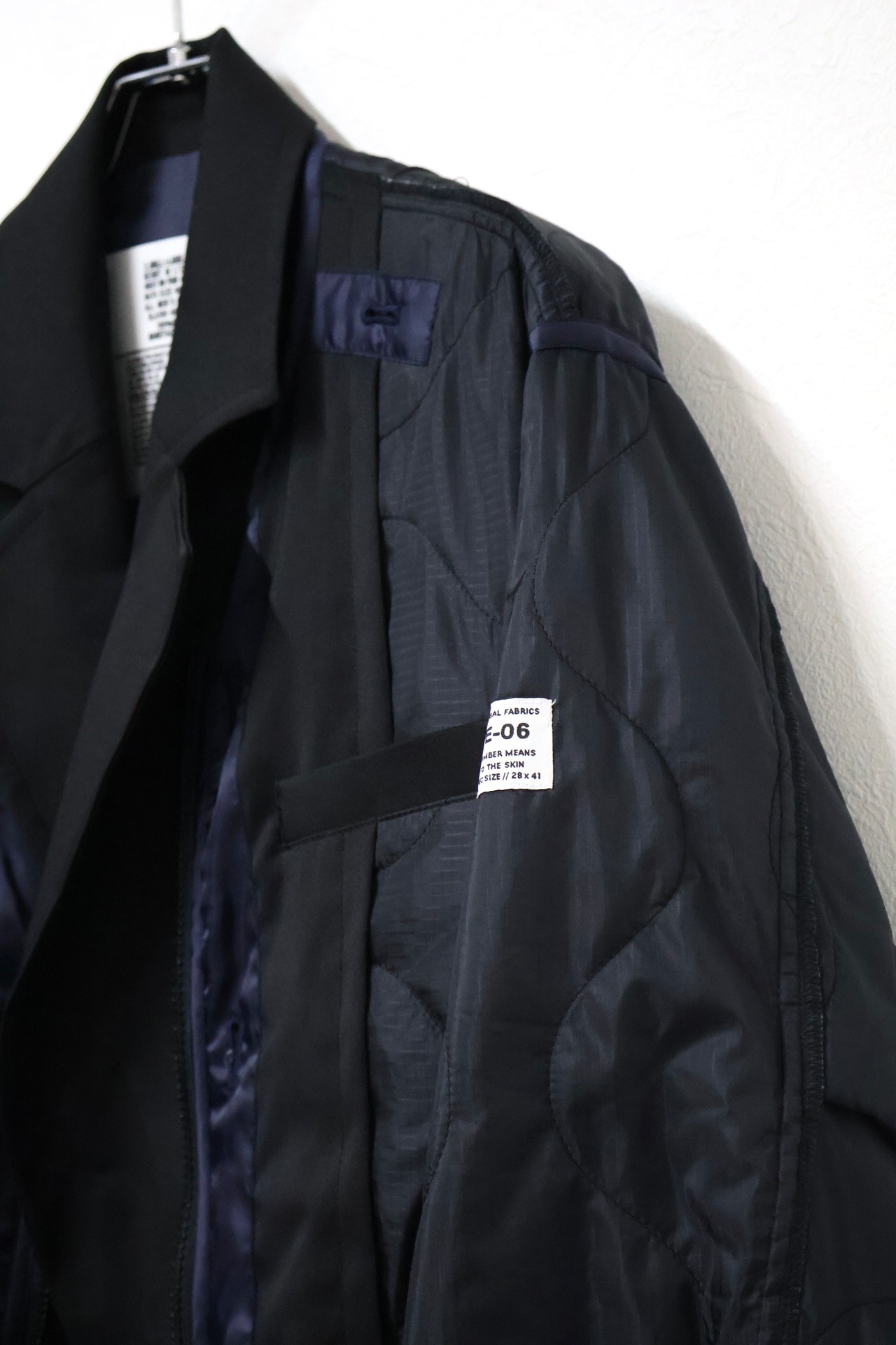 M65フィッシュテールコートのライナーとテーラードジャケットをドッキングしたアイテム。ただ切り替えるのではなく折り重なるように2着を合わせることで複雑でより立体的な見え方になる様パターンメイク。キルティングライナーには着ぶくれしない用、非常に薄くて軽量な3M社のThinsulate®EXを採用。保温性を上げる為に裏地には高密度のツイル生地を使用。襟を収納しファスナーで開閉可能。フロント部分にパッチポケット2ヶ所、胸ポケット1ヶ所。袖口はスナップボタンを配置しサイズ調整可能。同生地のFreedom Slacksと合わせてセットアップとして着用頂けます。