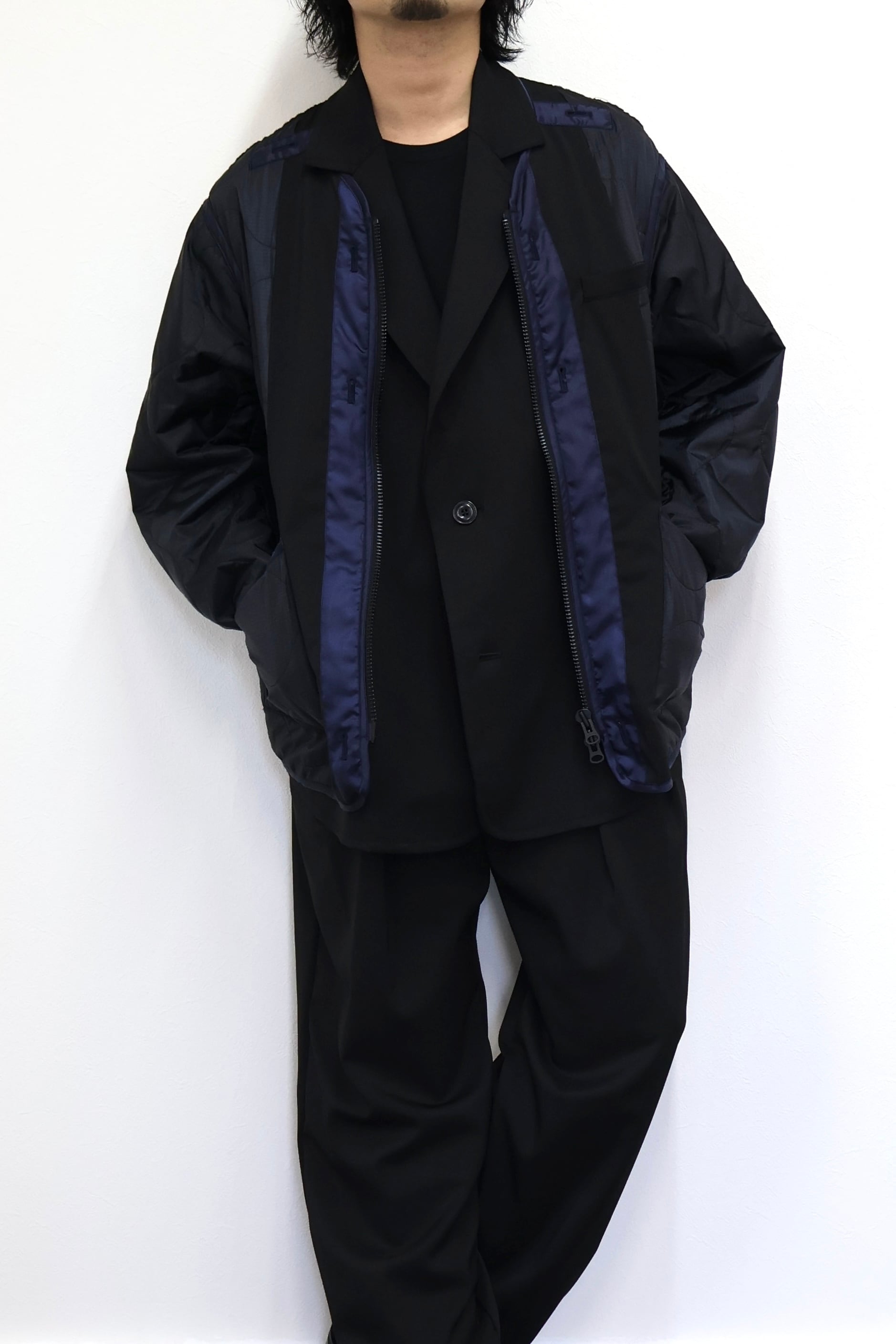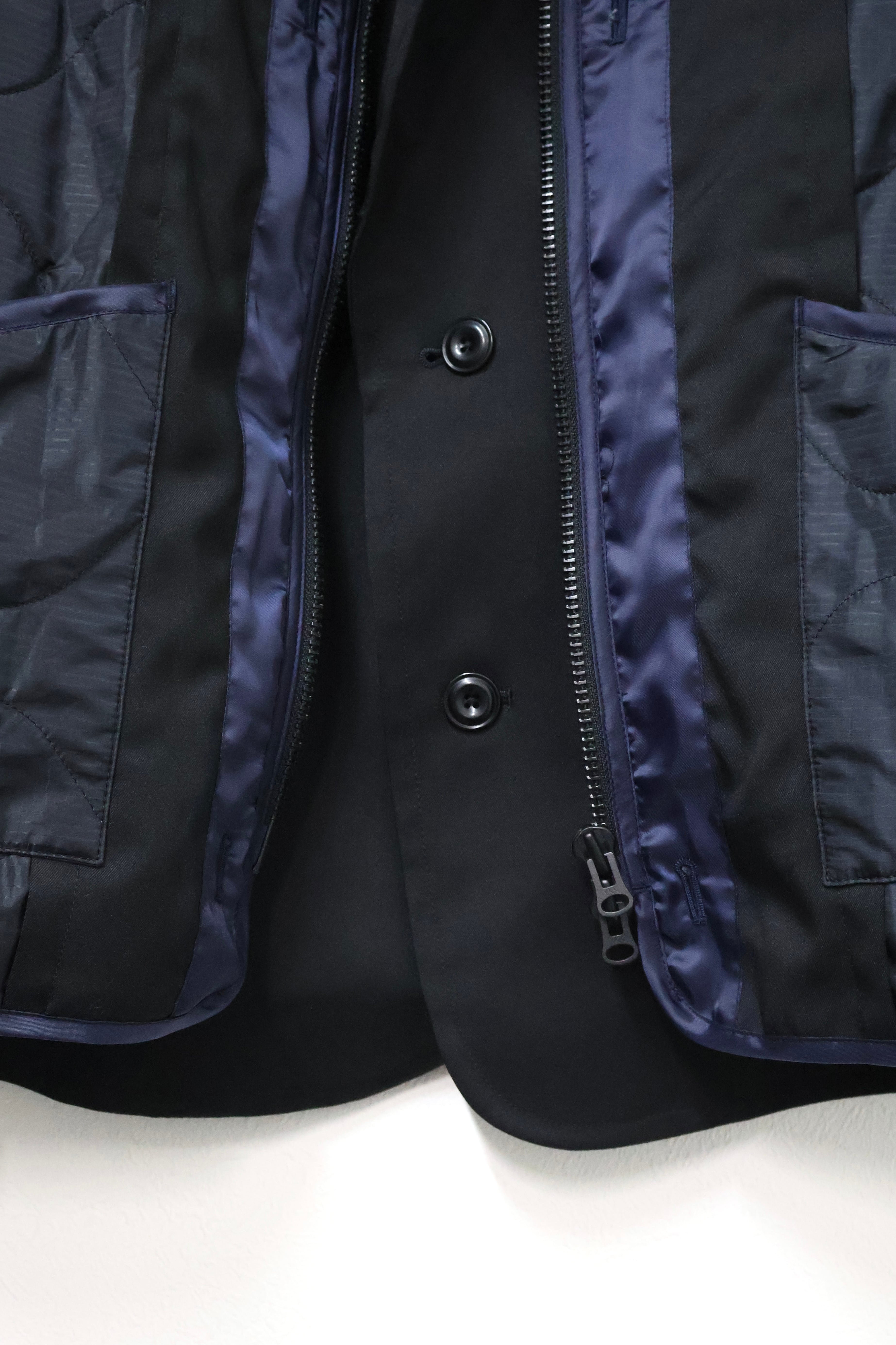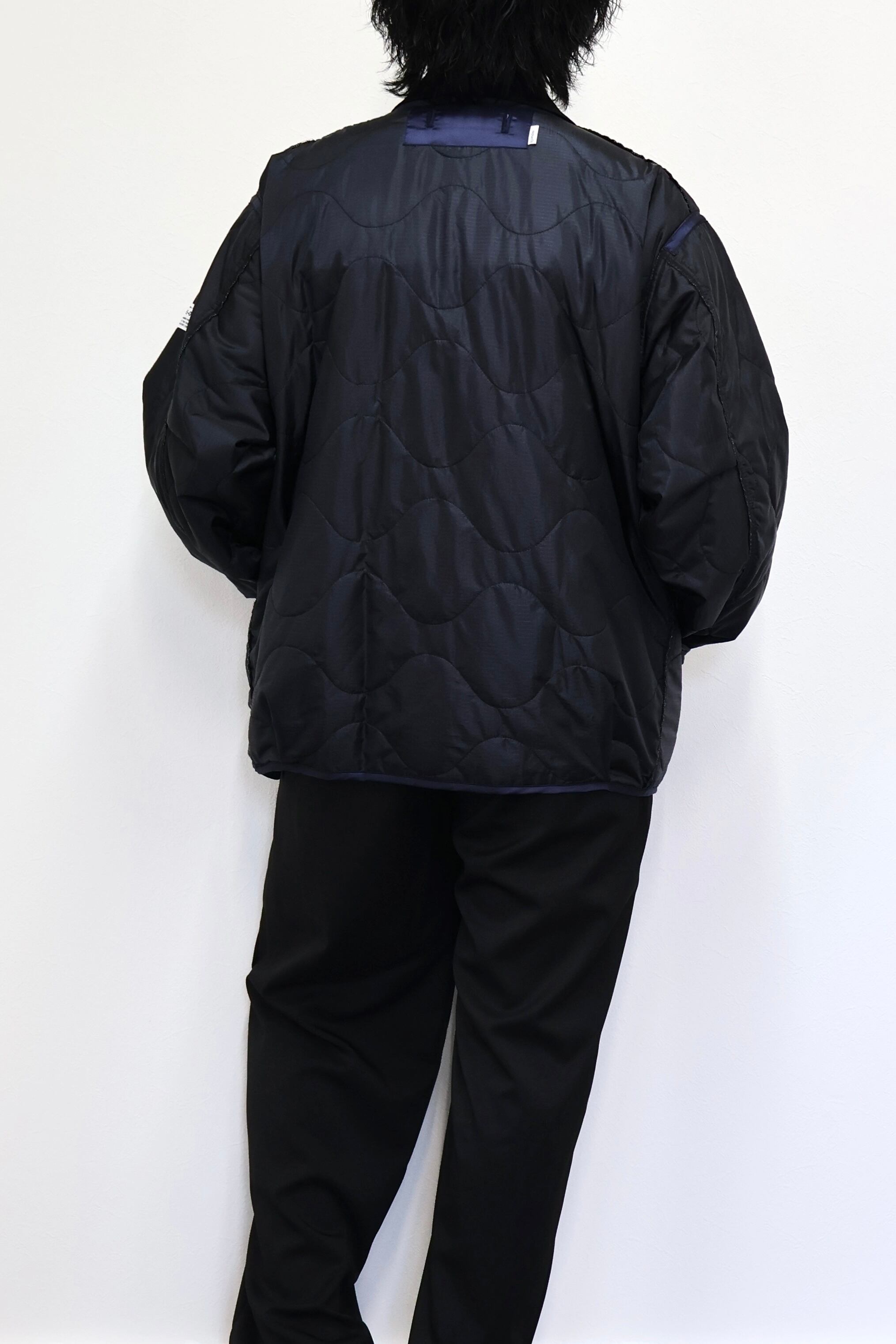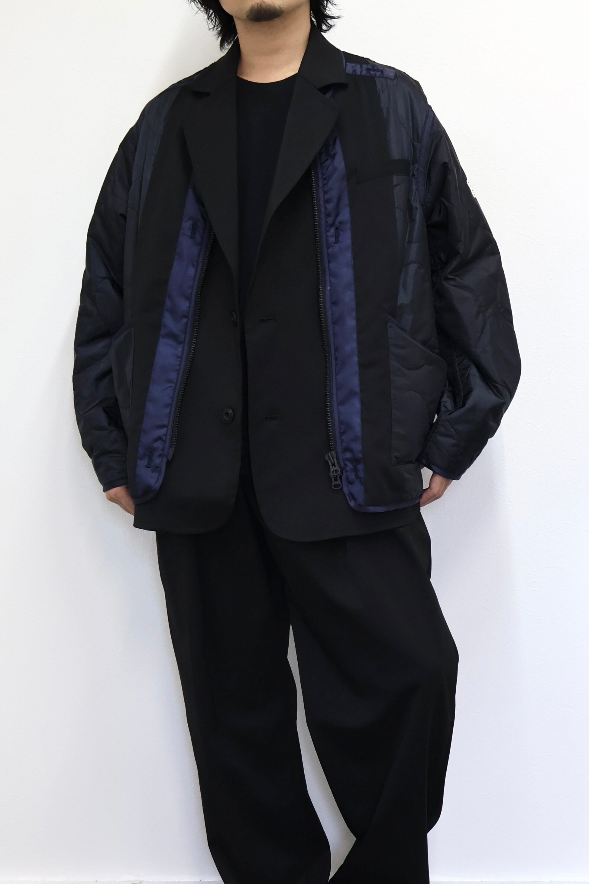 M65フィッシュテールコートのライナーとテーラードジャケットをドッキングしたアイテム。ただ切り替えるのではなく折り重なるように2着を合わせることで複雑でより立体的な見え方になる様パターンメイク。キルティングライナーには着ぶくれしない用、非常に薄くて軽量な3M社のThinsulate®EXを採用。保温性を上げる為に裏地には高密度のツイル生地を使用。襟を収納しファスナーで開閉可能。フロント部分にパッチポケット2ヶ所、胸ポケット1ヶ所。袖口はスナップボタンを配置しサイズ調整可能。同生地のFreedom Slacksと合わせてセットアップとして着用頂けます。