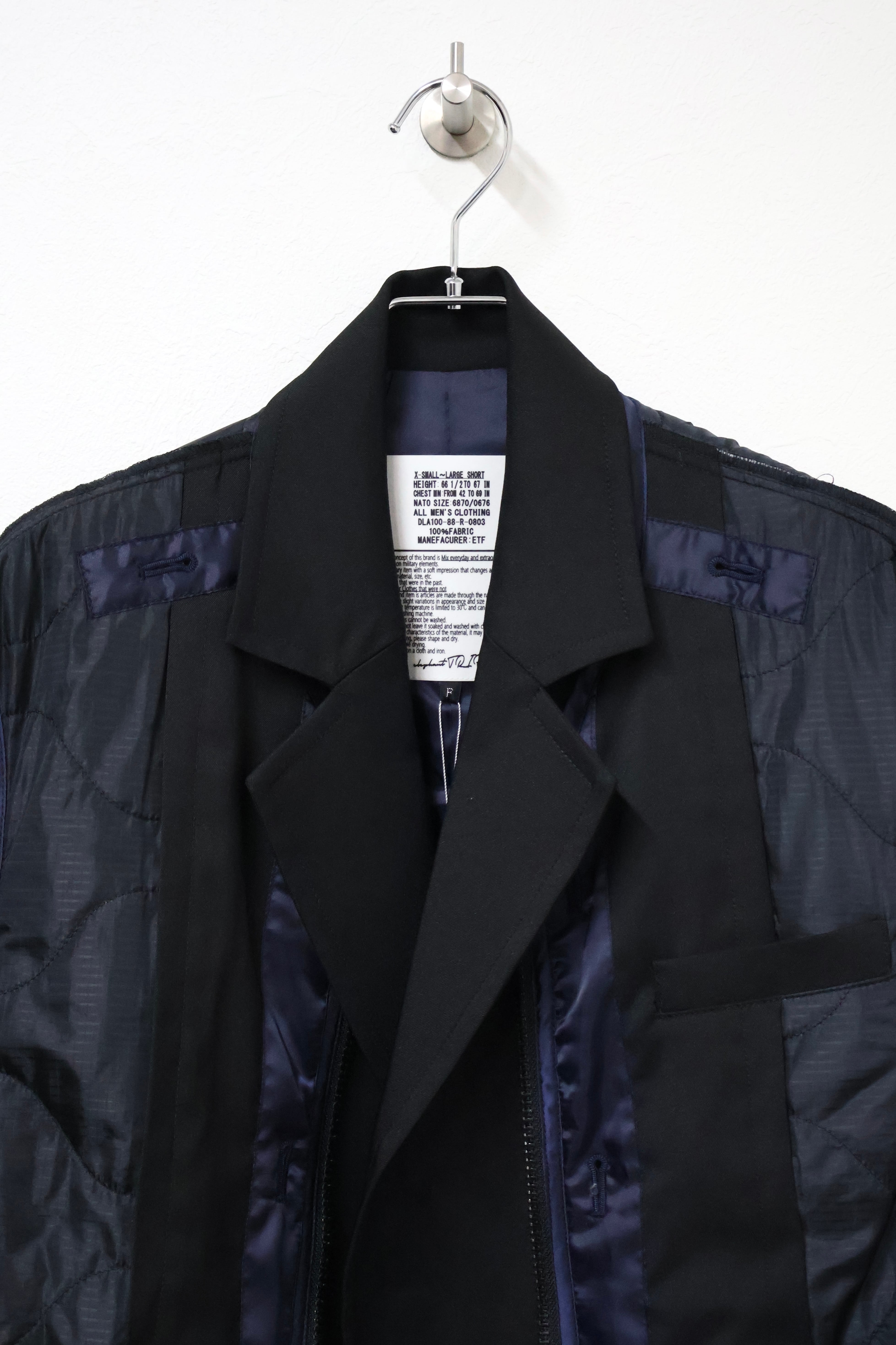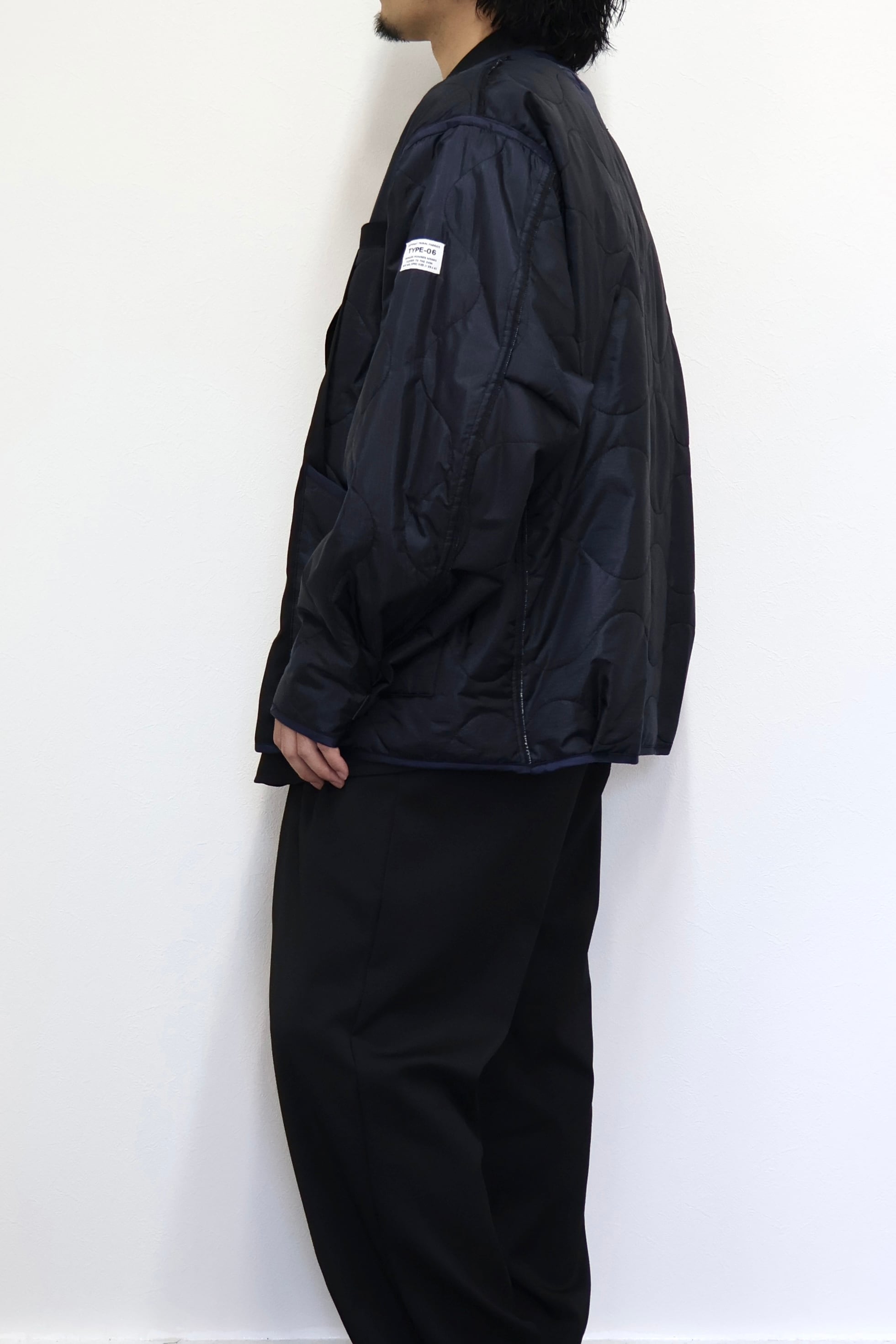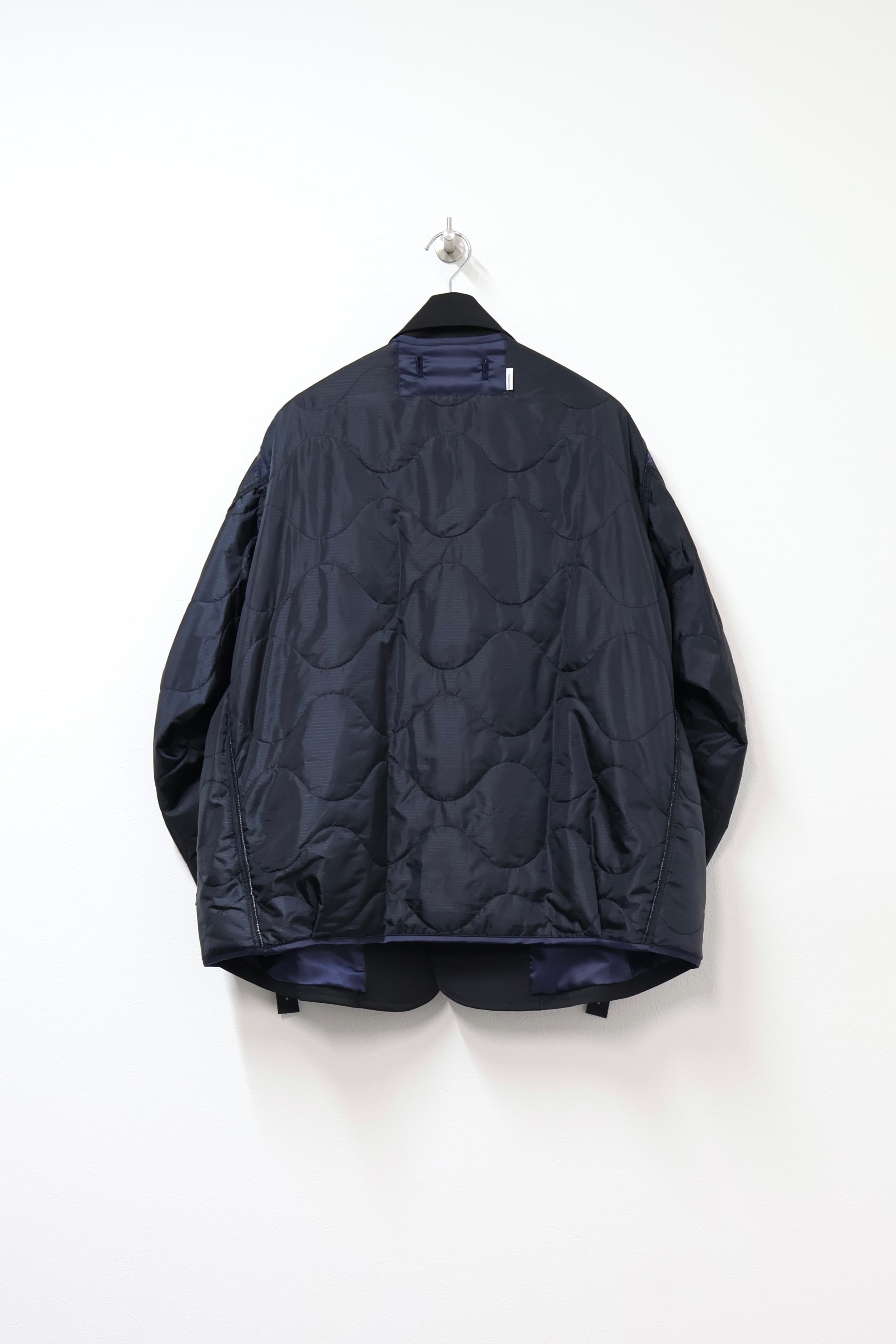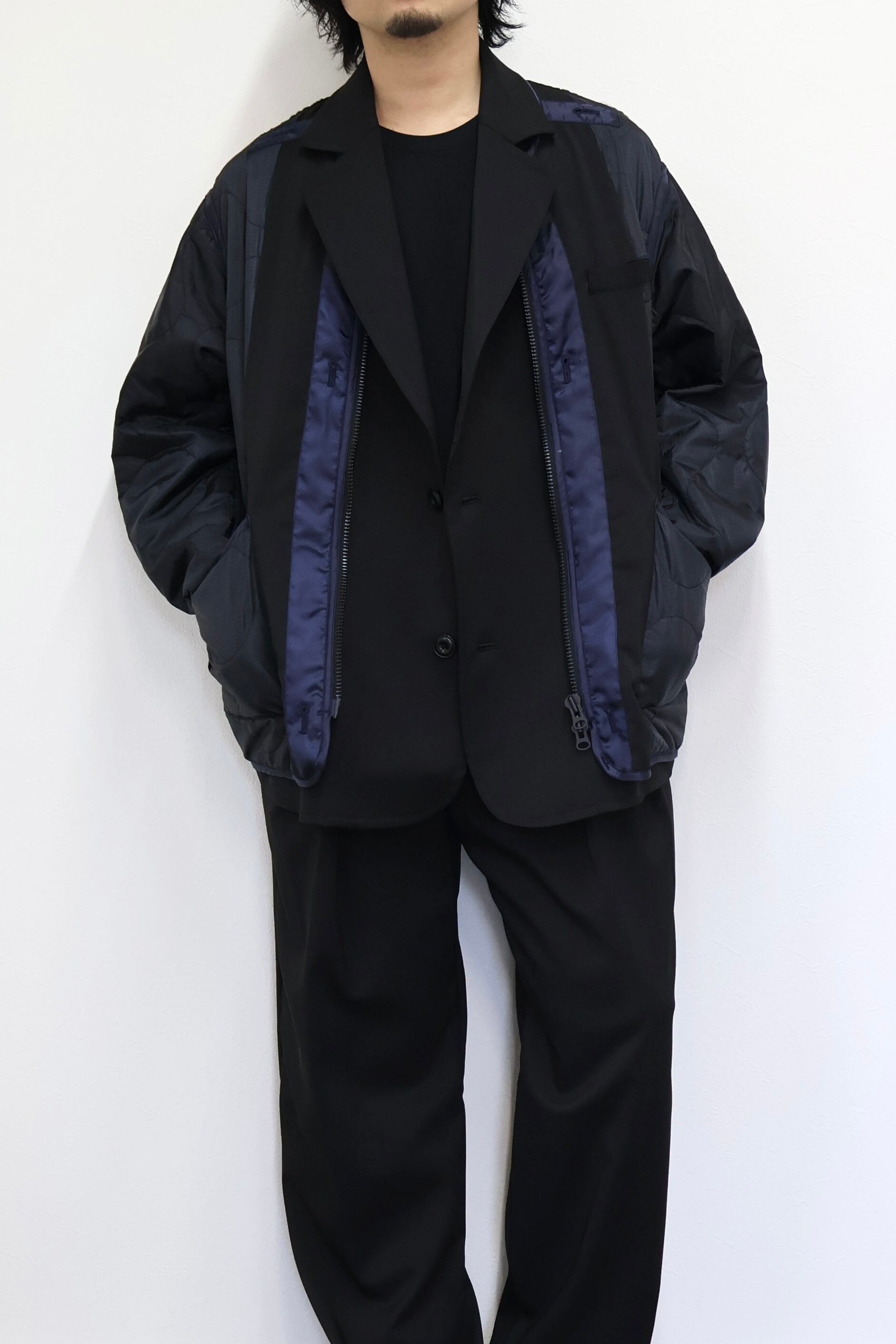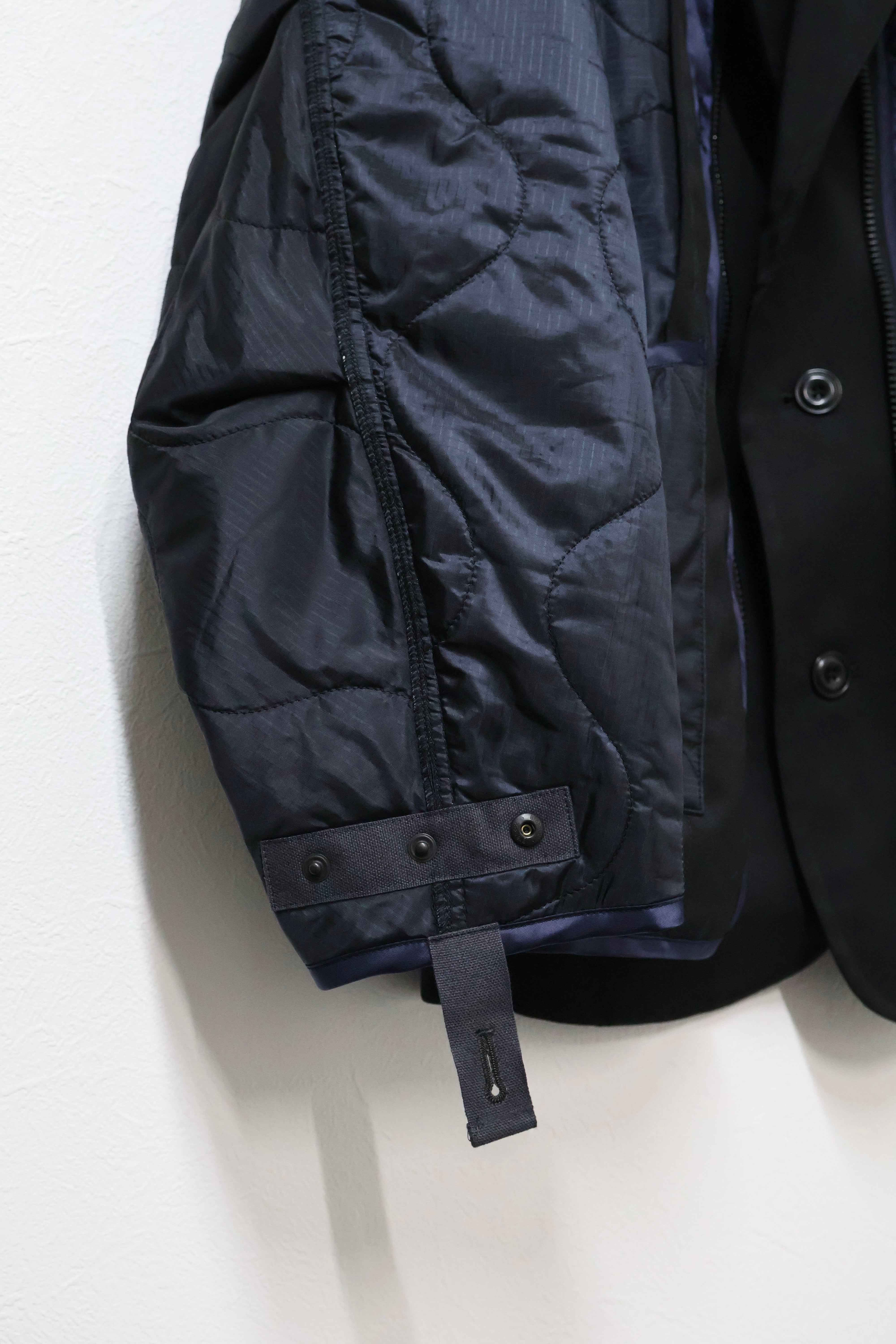 M65フィッシュテールコートのライナーとテーラードジャケットをドッキングしたアイテム。ただ切り替えるのではなく折り重なるように2着を合わせることで複雑でより立体的な見え方になる様パターンメイク。キルティングライナーには着ぶくれしない用、非常に薄くて軽量な3M社のThinsulate®EXを採用。保温性を上げる為に裏地には高密度のツイル生地を使用。襟を収納しファスナーで開閉可能。フロント部分にパッチポケット2ヶ所、胸ポケット1ヶ所。袖口はスナップボタンを配置しサイズ調整可能。同生地のFreedom Slacksと合わせてセットアップとして着用頂けます。