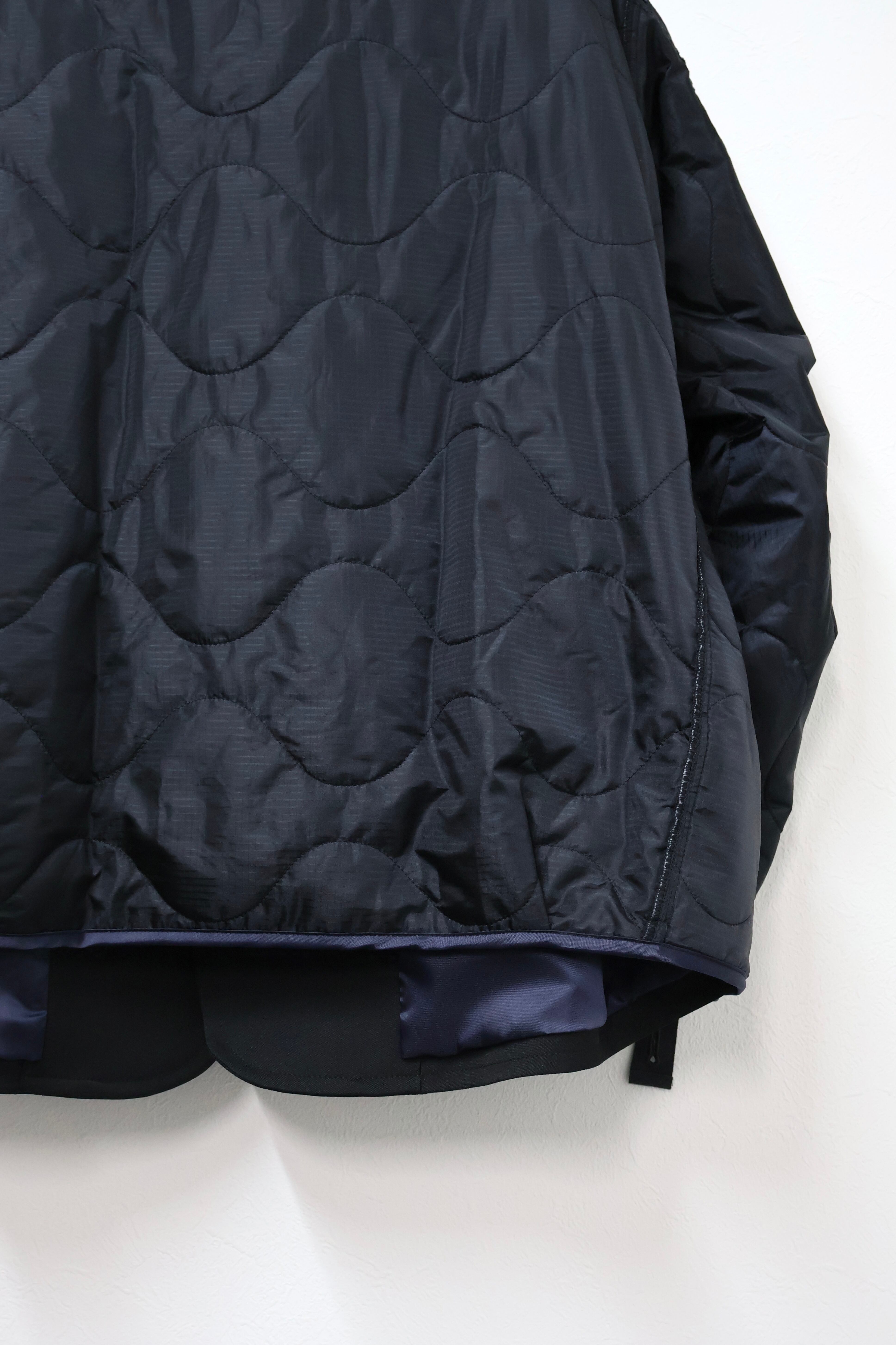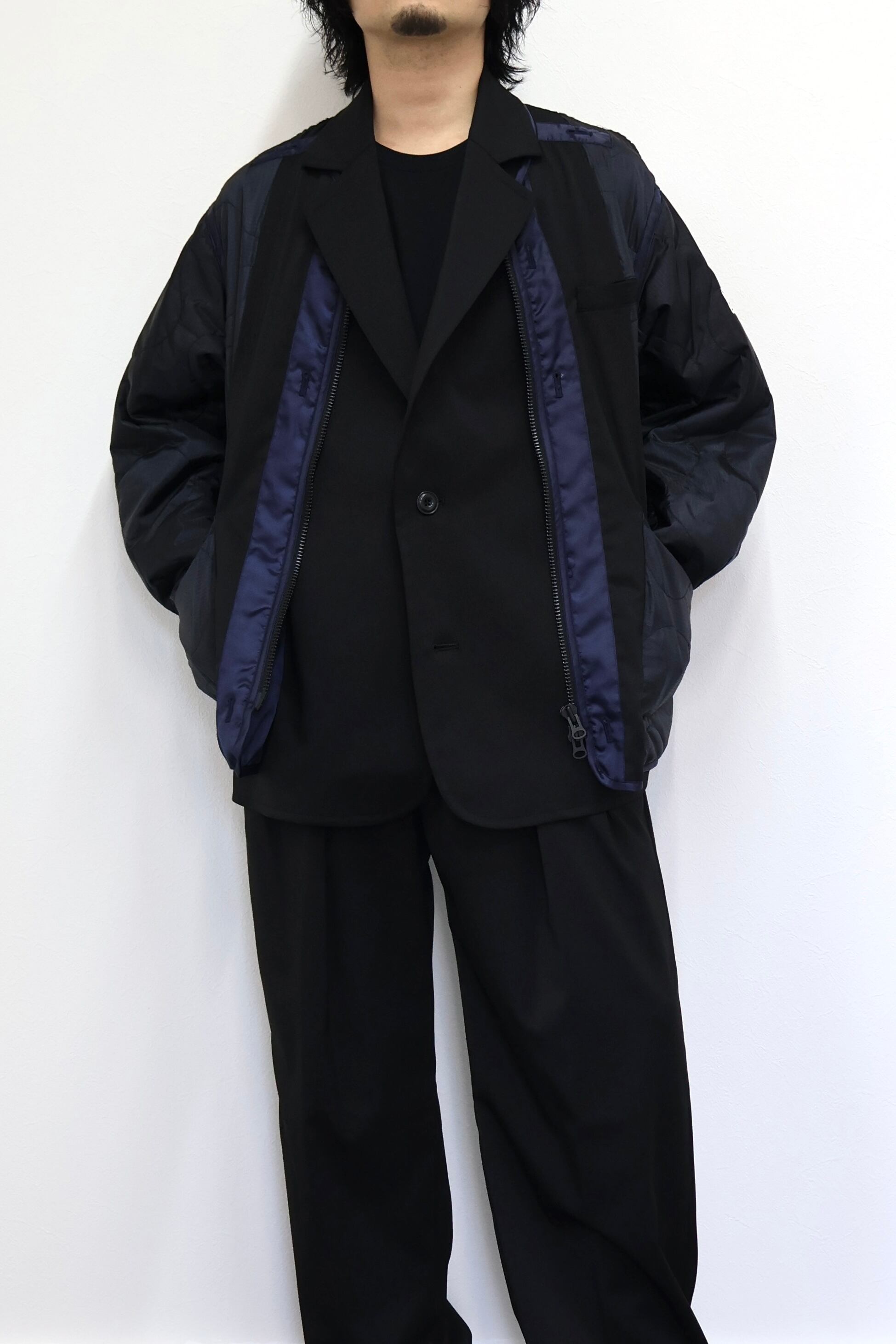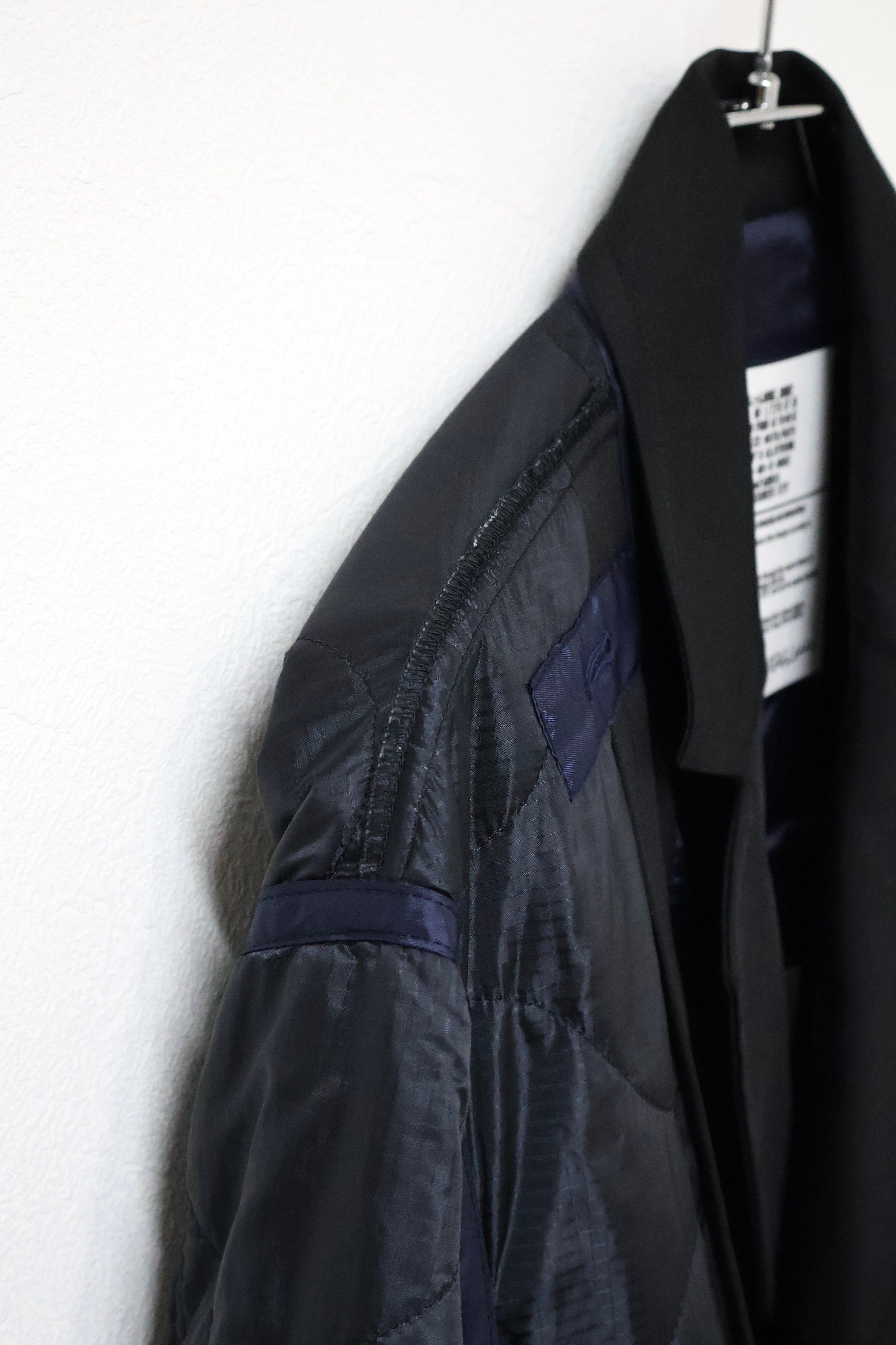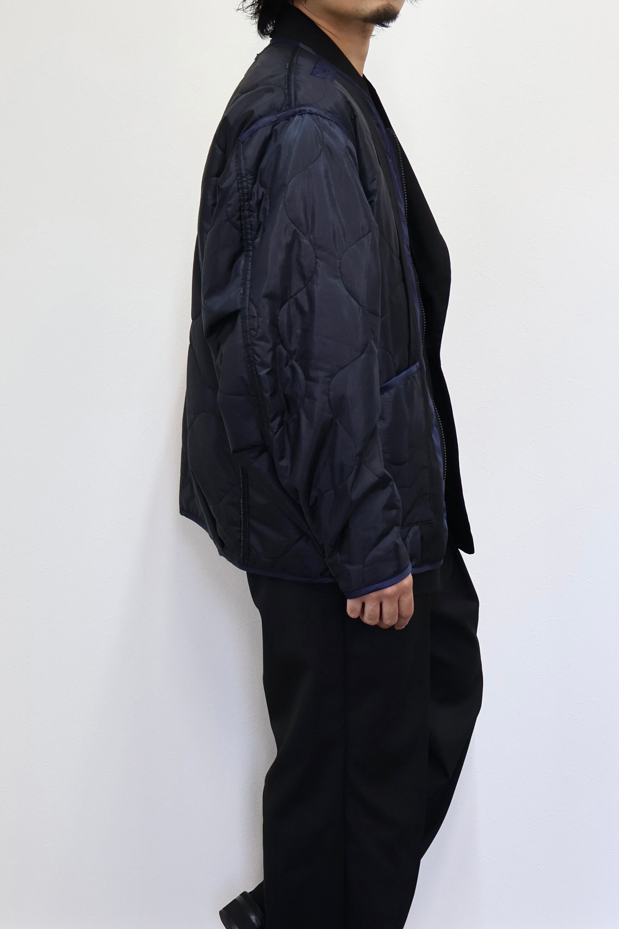 M65フィッシュテールコートのライナーとテーラードジャケットをドッキングしたアイテム。ただ切り替えるのではなく折り重なるように2着を合わせることで複雑でより立体的な見え方になる様パターンメイク。キルティングライナーには着ぶくれしない用、非常に薄くて軽量な3M社のThinsulate®EXを採用。保温性を上げる為に裏地には高密度のツイル生地を使用。襟を収納しファスナーで開閉可能。フロント部分にパッチポケット2ヶ所、胸ポケット1ヶ所。袖口はスナップボタンを配置しサイズ調整可能。同生地のFreedom Slacksと合わせてセットアップとして着用頂けます。
