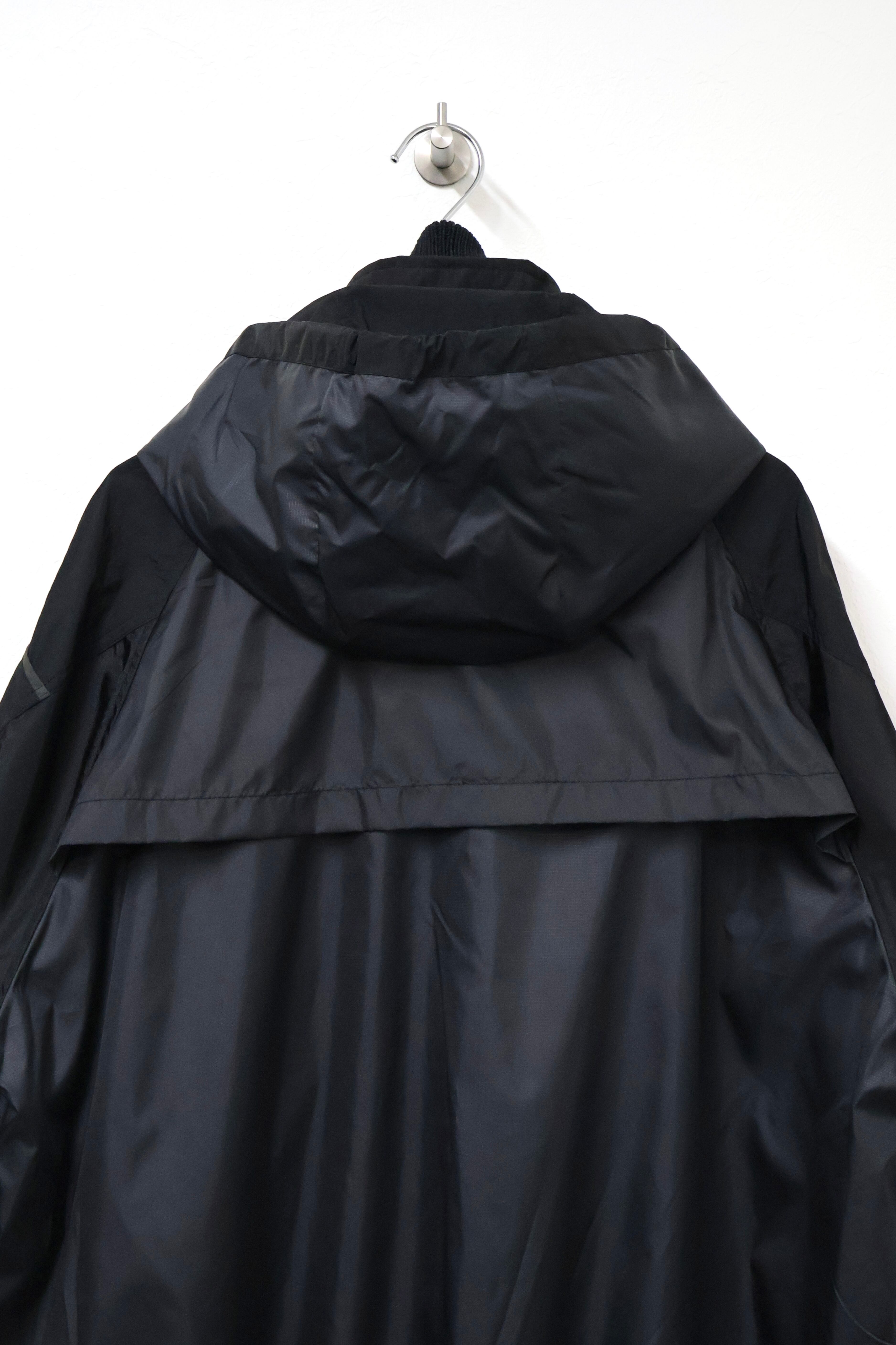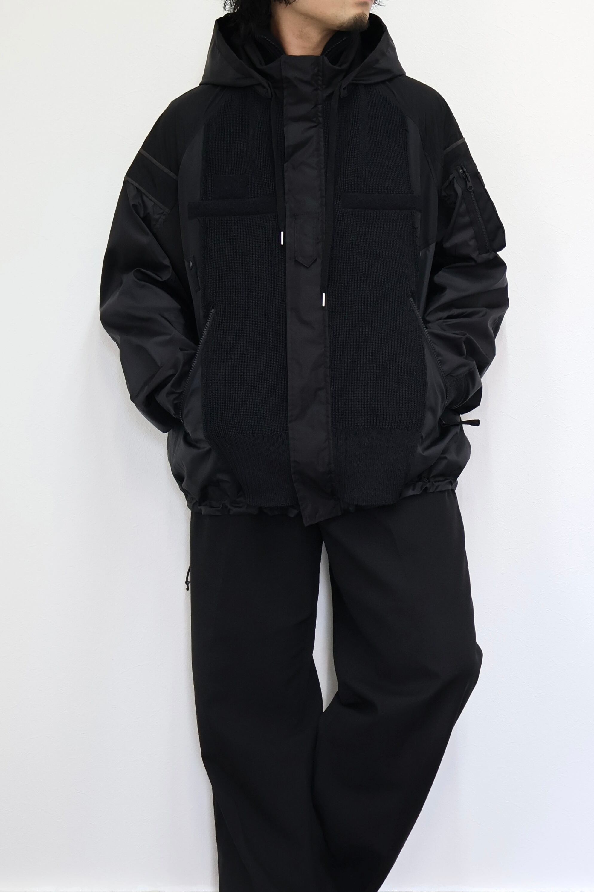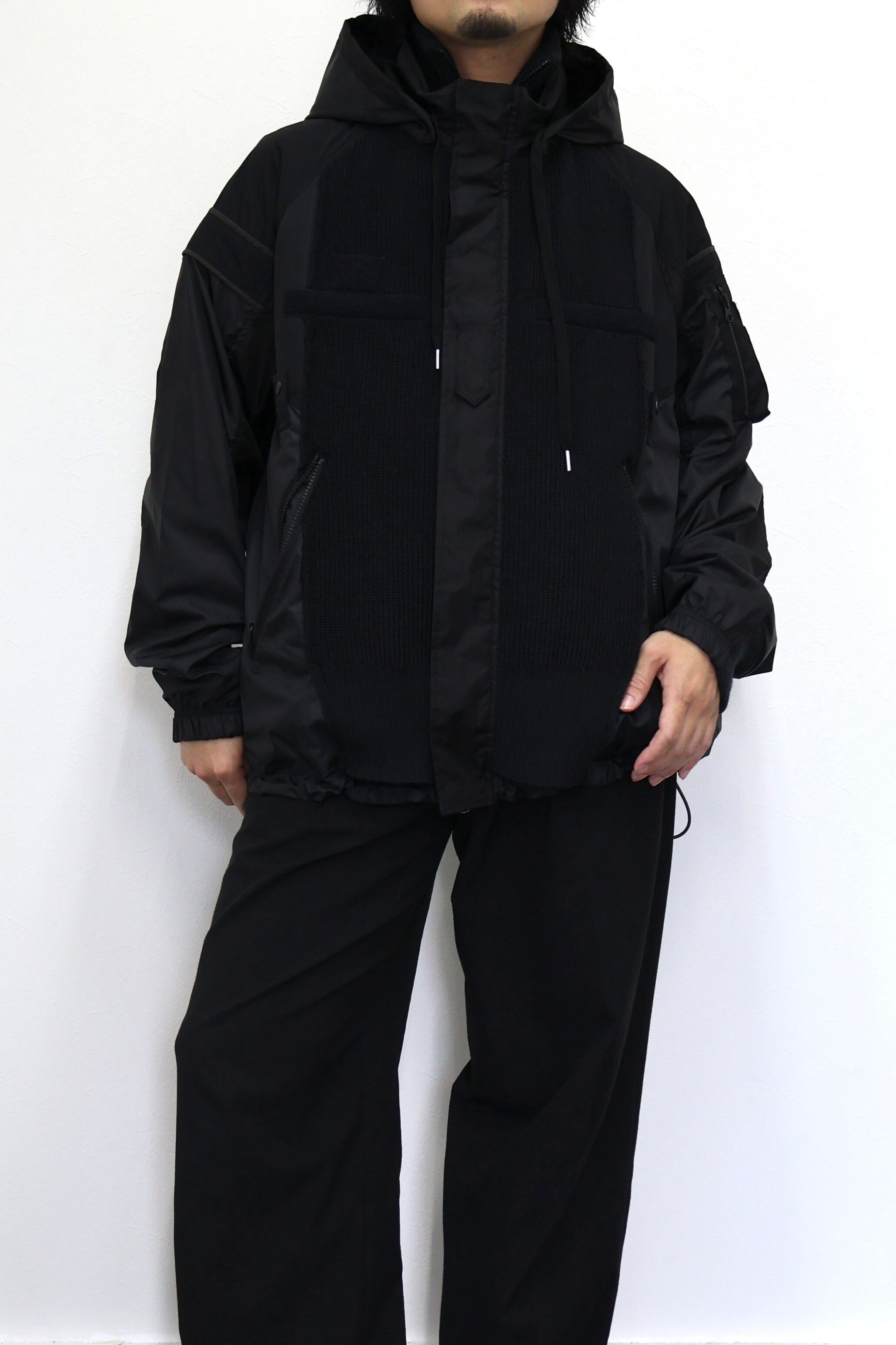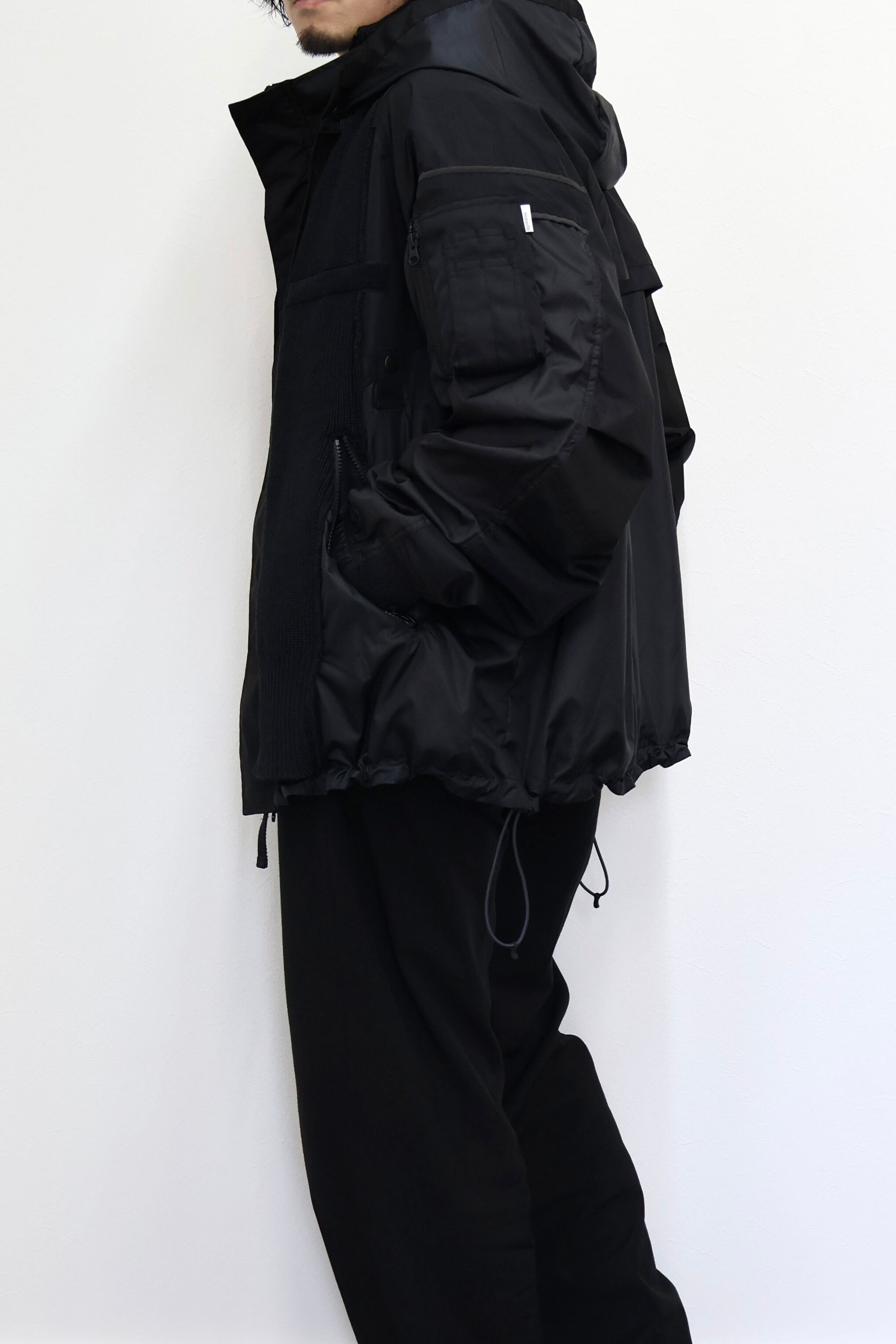 【MA-1】【ECWCS GEN3】【U.S.ARMY IPFU】【ECWCS GORE-TEX PARK】【Coach JKT】【Driver's knit】の合計6種類のアイテムを複雑にドッキングしたカオスブルゾン。ただ切り替えるだけでなく折り重なるように合わせることで複雑でより立体的な見え方になる様パターンメイク。首元はニットかぶれがおきないポリエステル100%の糸で構成したニットパーツを配置。総裏仕様。裏地にはソフトな肌触りが特徴の吸汗速乾機能のあるメッシュ生地を使用。フードはスナップボタンにて取り外し可能のデタッチャブル仕様。フロントには大振りなファスナーポケット2ヶ所、ユーティリティポケット1ヶ所。裾部分にはアジャスター付きドローコードを配置し、シルエット変更が可能。