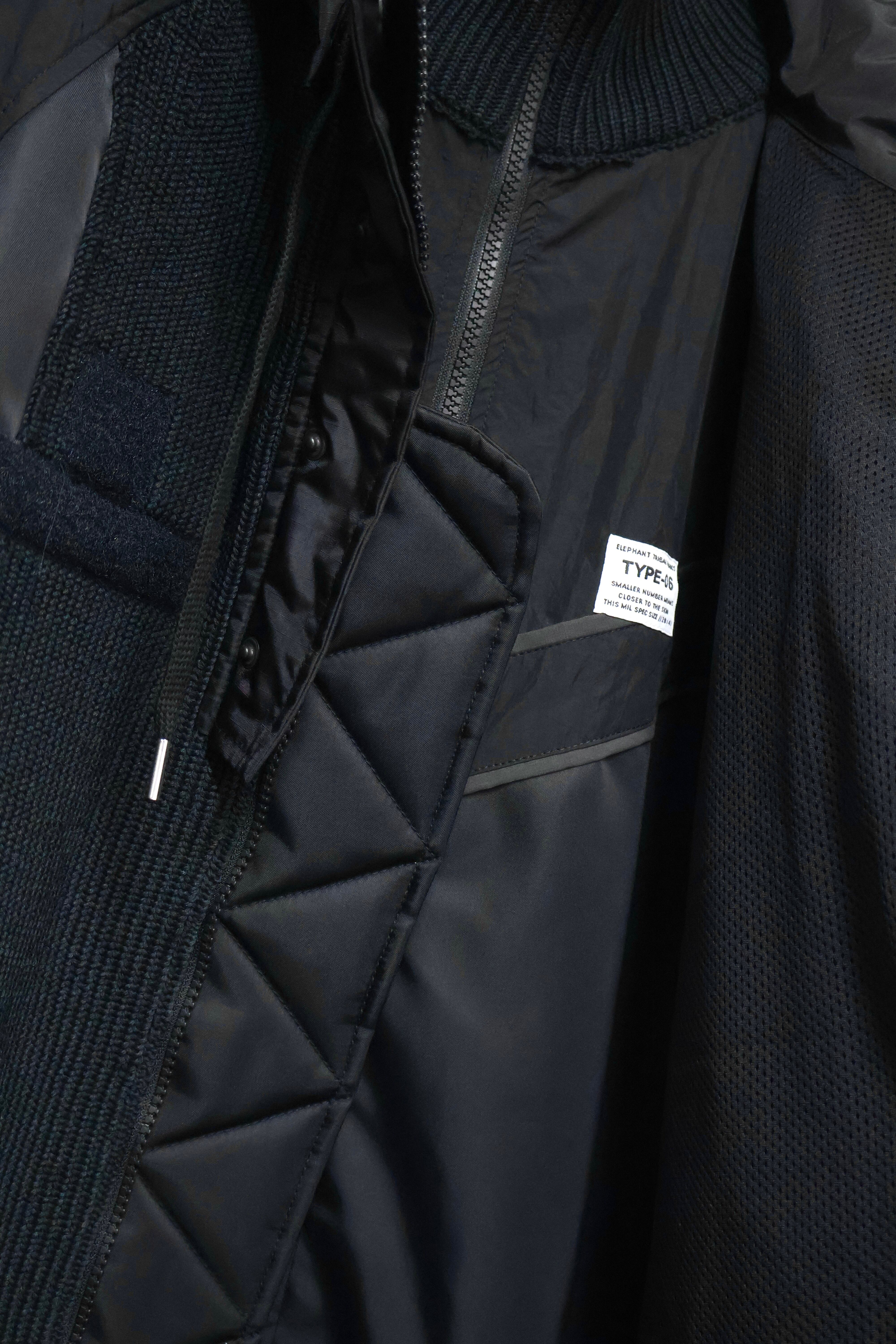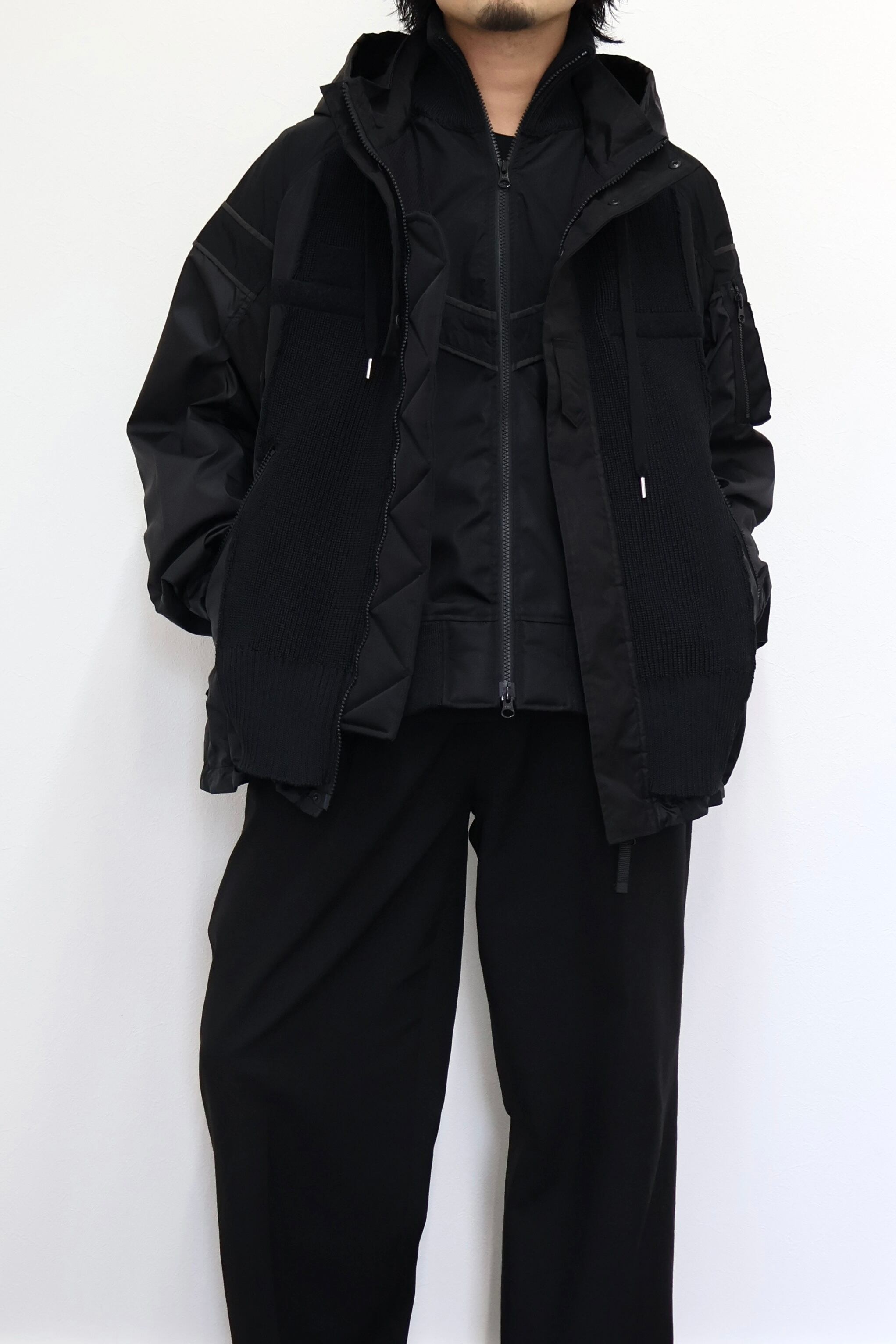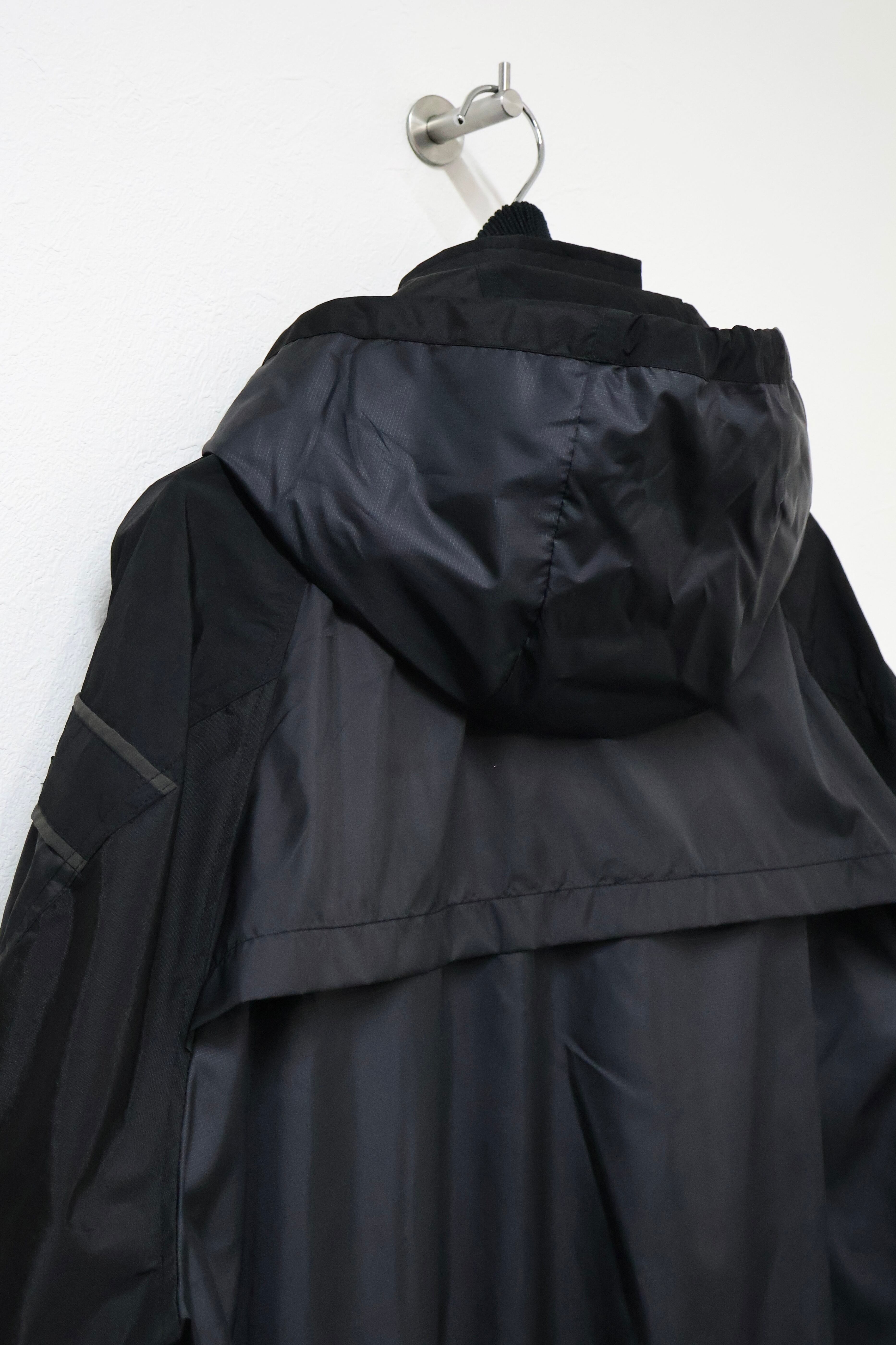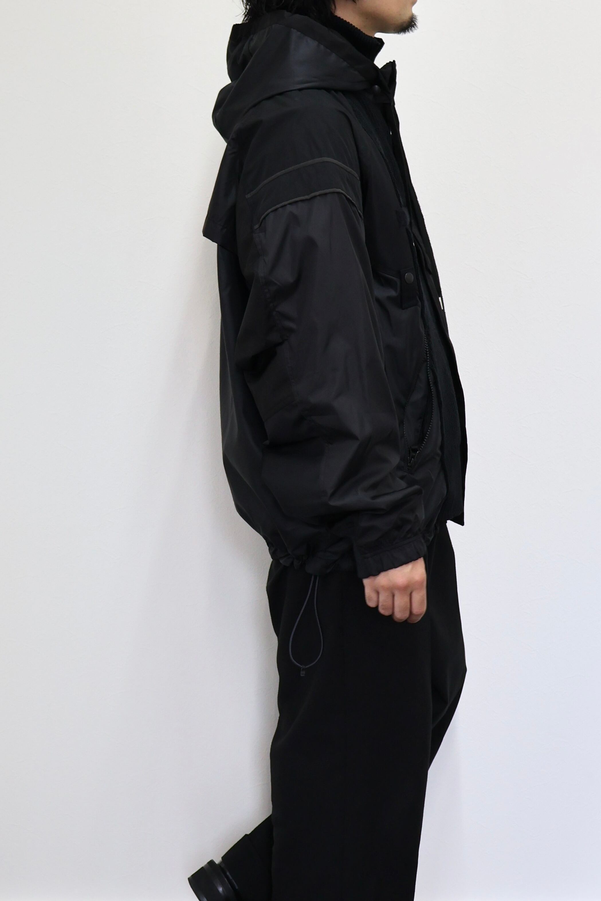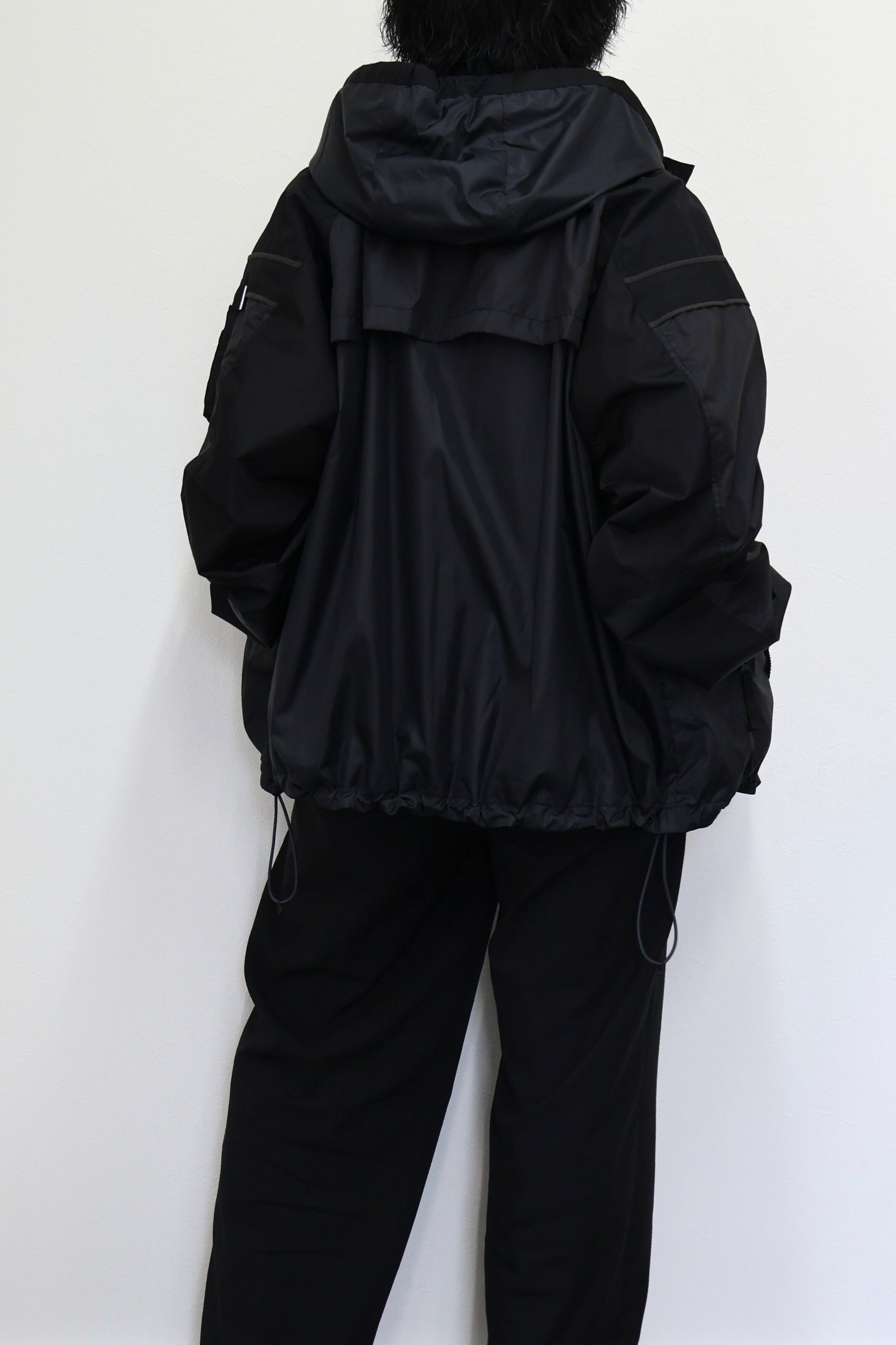 【MA-1】【ECWCS GEN3】【U.S.ARMY IPFU】【ECWCS GORE-TEX PARK】【Coach JKT】【Driver's knit】の合計6種類のアイテムを複雑にドッキングしたカオスブルゾン。ただ切り替えるだけでなく折り重なるように合わせることで複雑でより立体的な見え方になる様パターンメイク。首元はニットかぶれがおきないポリエステル100%の糸で構成したニットパーツを配置。総裏仕様。裏地にはソフトな肌触りが特徴の吸汗速乾機能のあるメッシュ生地を使用。フードはスナップボタンにて取り外し可能のデタッチャブル仕様。フロントには大振りなファスナーポケット2ヶ所、ユーティリティポケット1ヶ所。裾部分にはアジャスター付きドローコードを配置し、シルエット変更が可能。