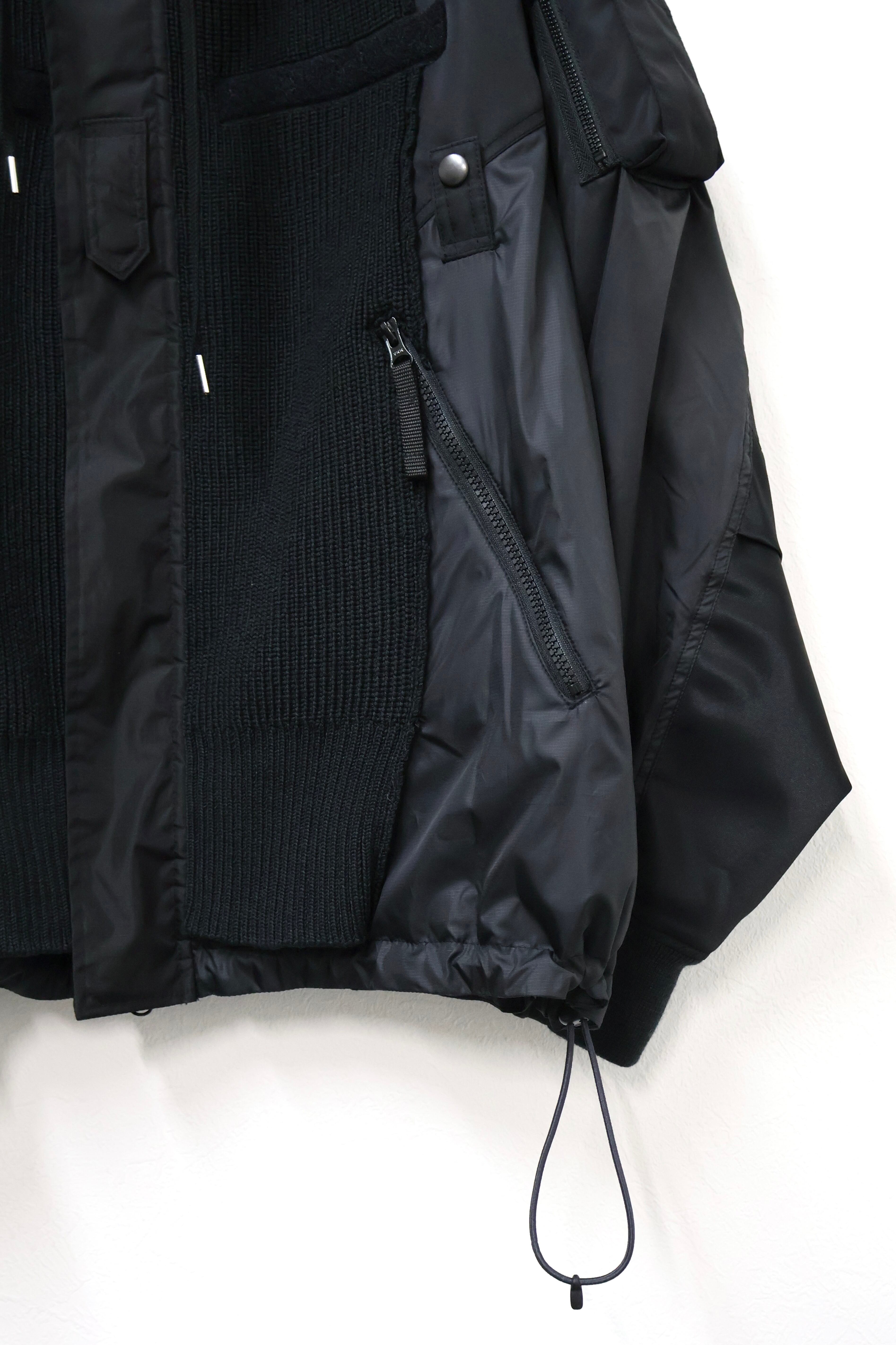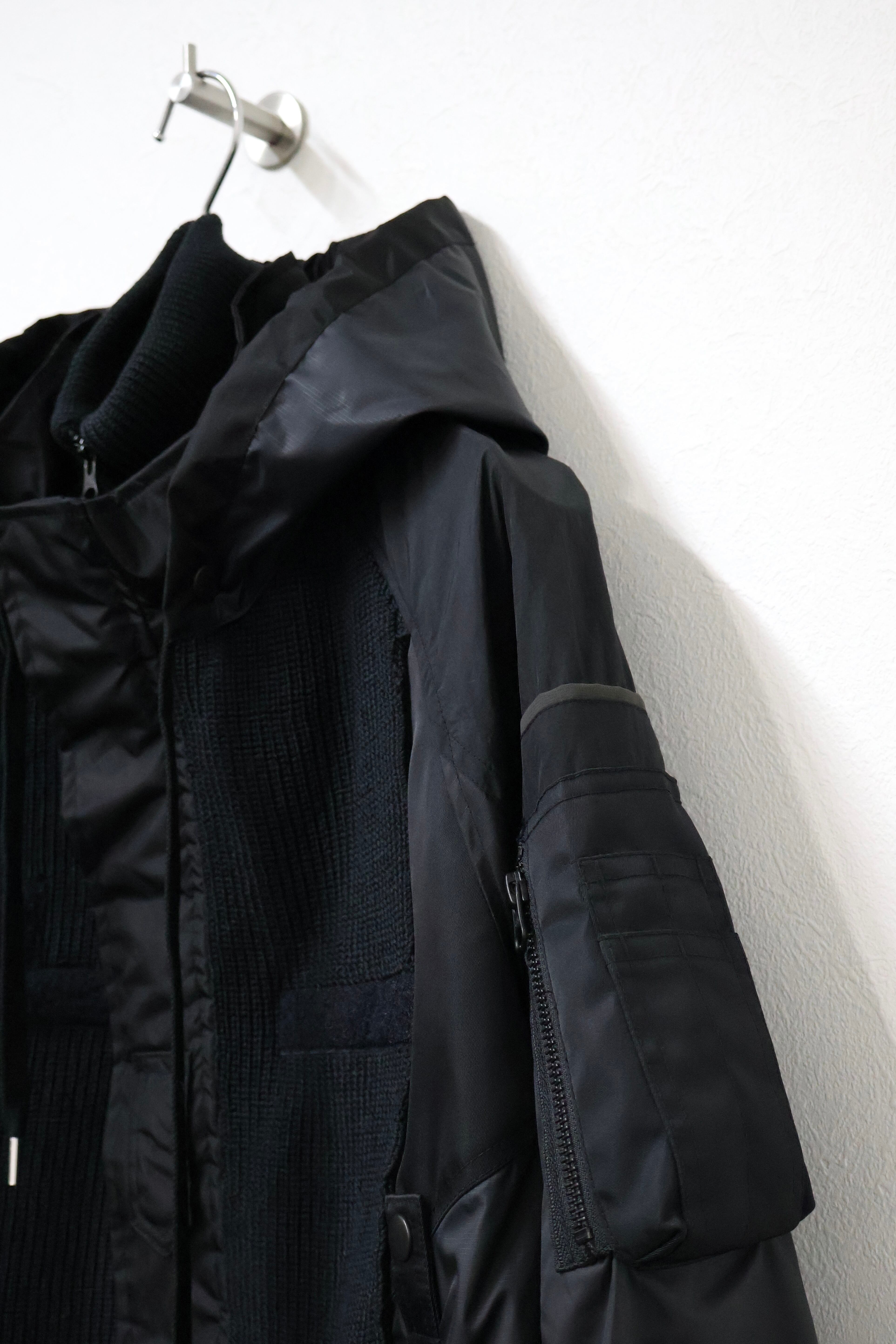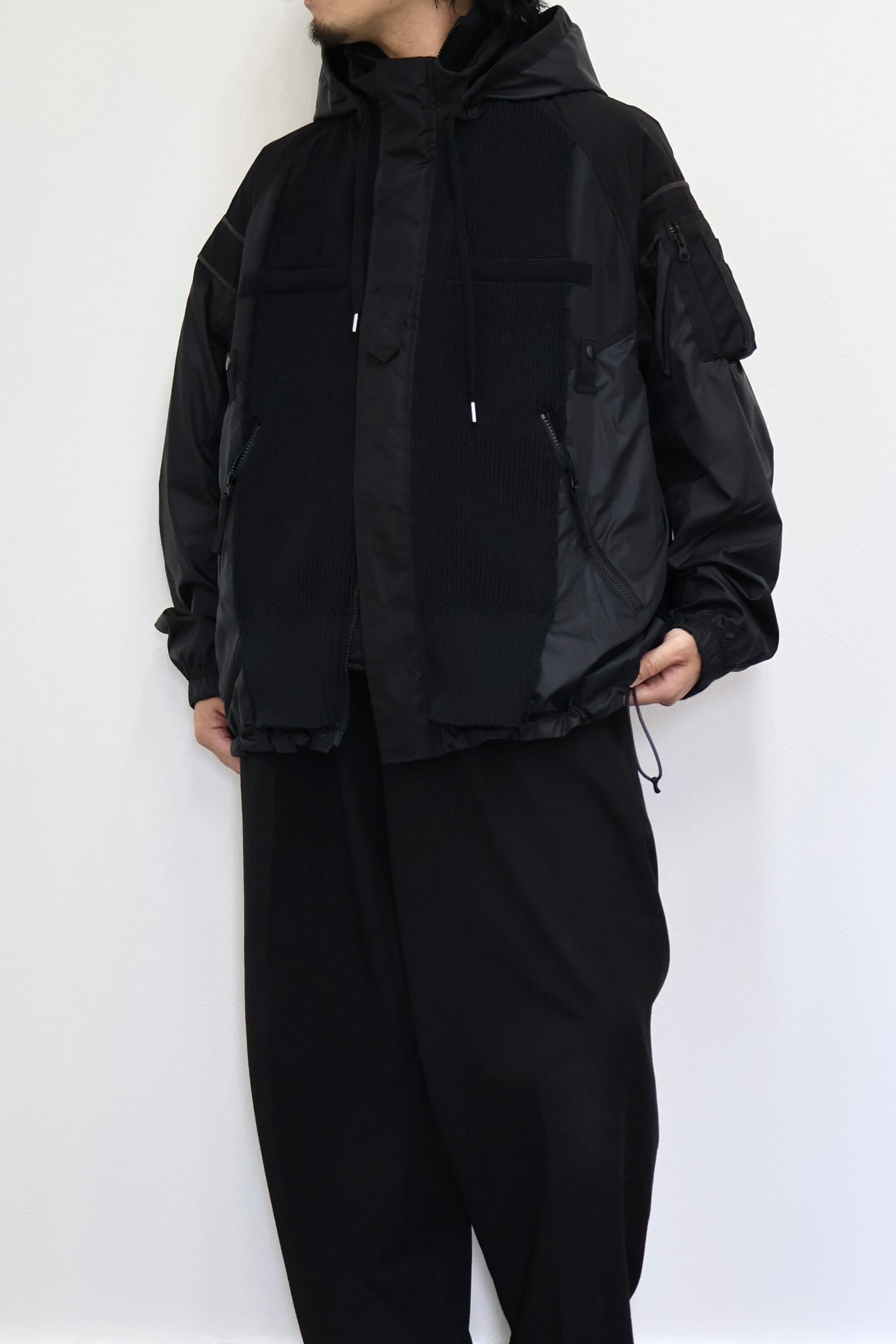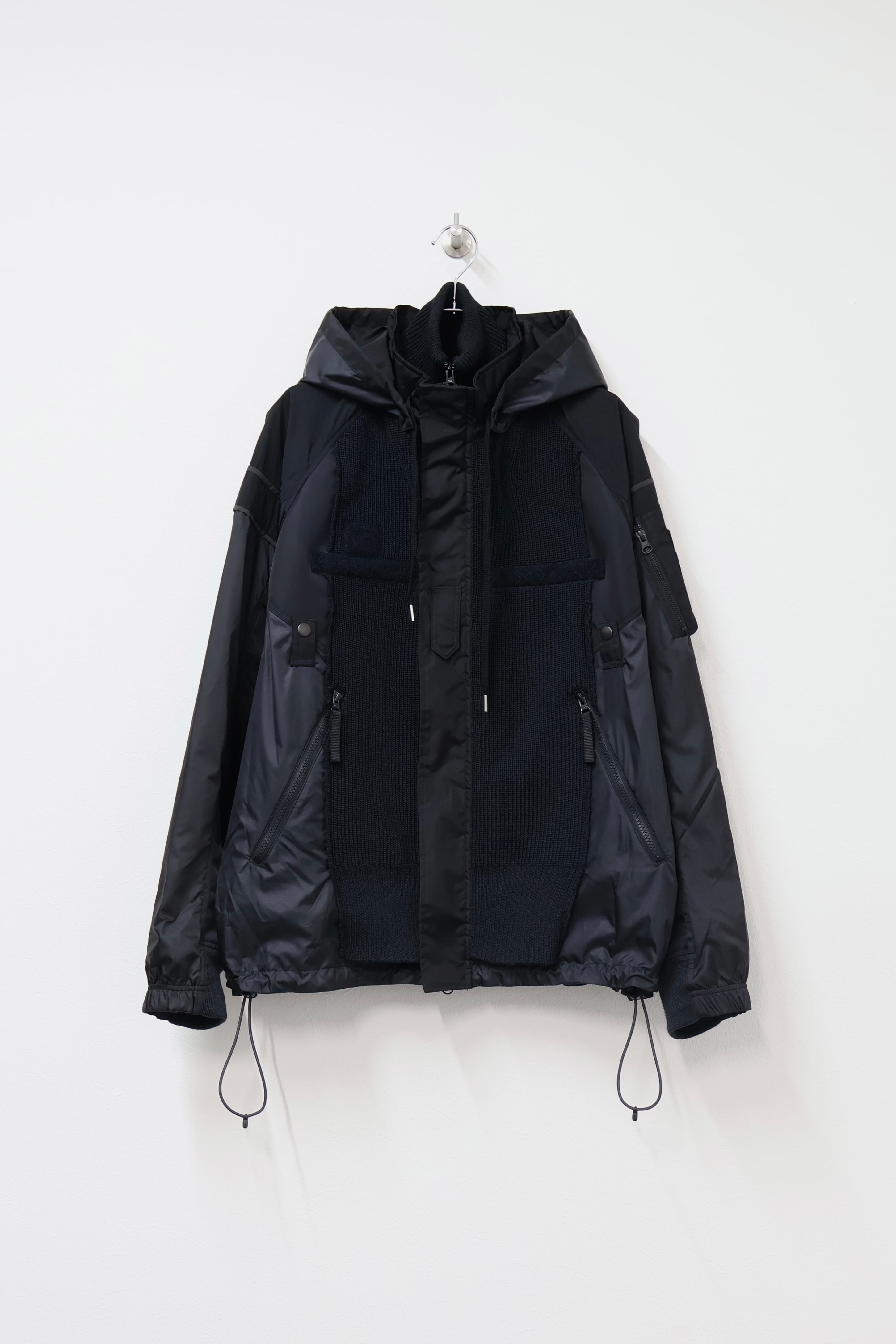 【MA-1】【ECWCS GEN3】【U.S.ARMY IPFU】【ECWCS GORE-TEX PARK】【Coach JKT】【Driver's knit】の合計6種類のアイテムを複雑にドッキングしたカオスブルゾン。ただ切り替えるだけでなく折り重なるように合わせることで複雑でより立体的な見え方になる様パターンメイク。首元はニットかぶれがおきないポリエステル100%の糸で構成したニットパーツを配置。総裏仕様。裏地にはソフトな肌触りが特徴の吸汗速乾機能のあるメッシュ生地を使用。フードはスナップボタンにて取り外し可能のデタッチャブル仕様。フロントには大振りなファスナーポケット2ヶ所、ユーティリティポケット1ヶ所。裾部分にはアジャスター付きドローコードを配置し、シルエット変更が可能。