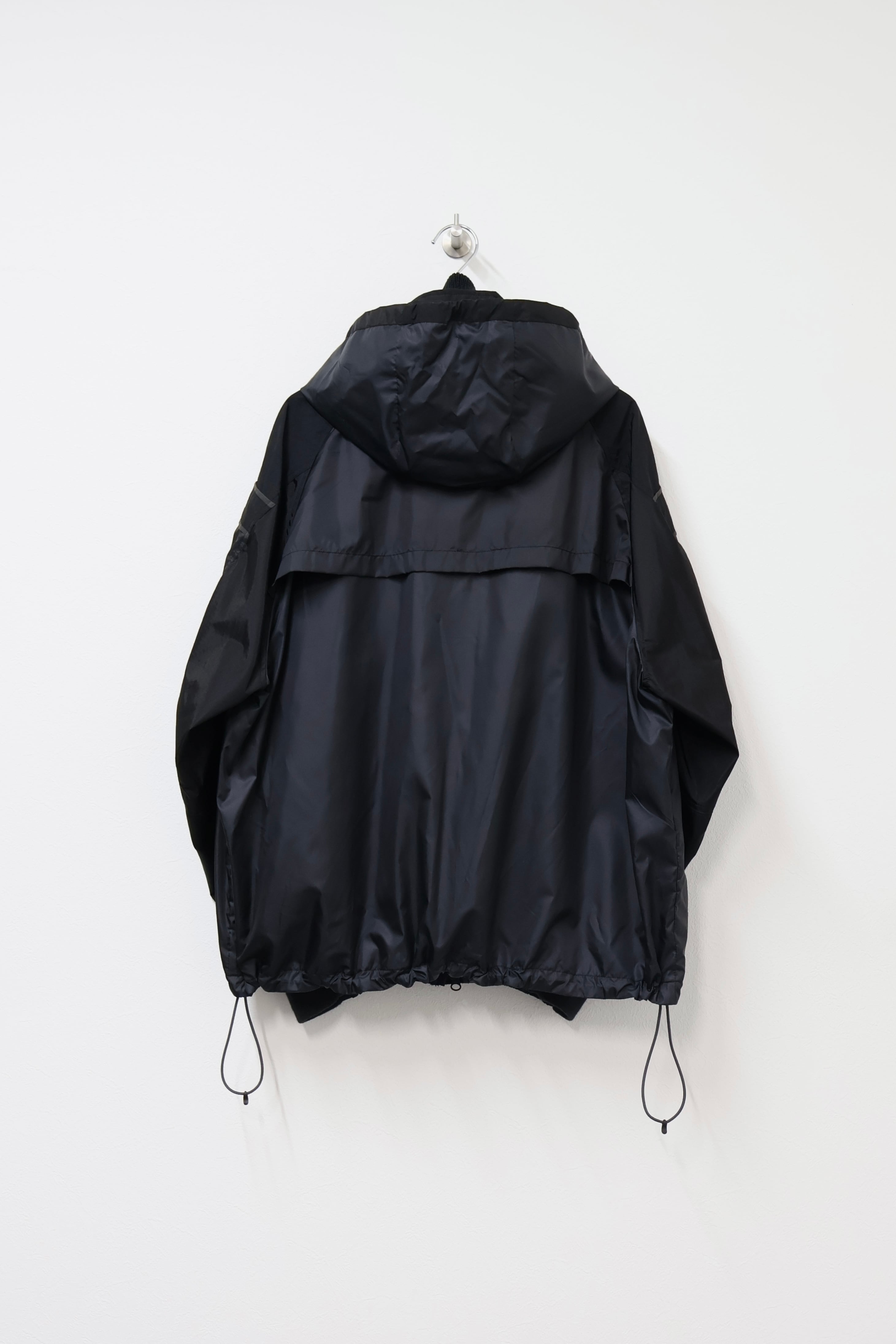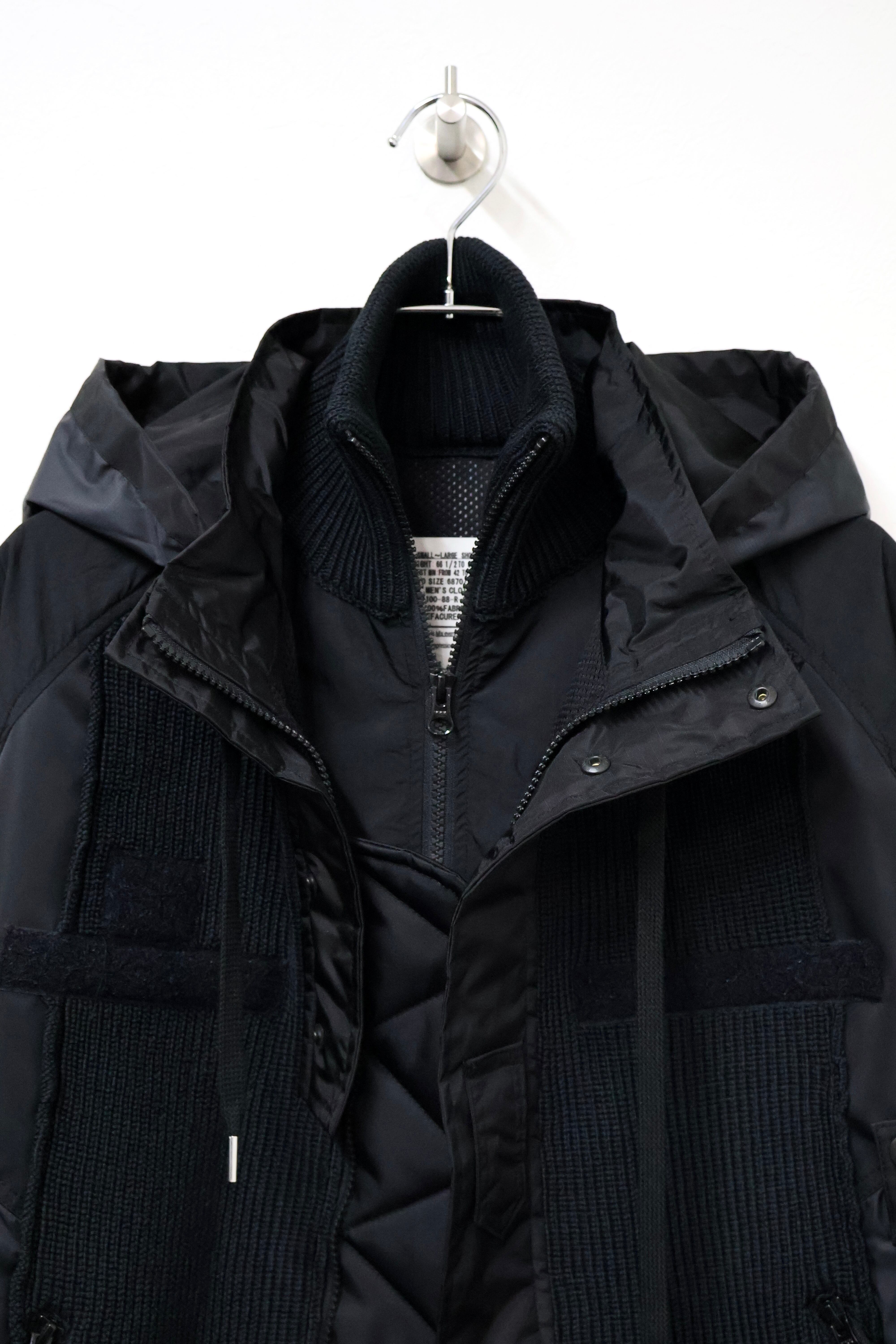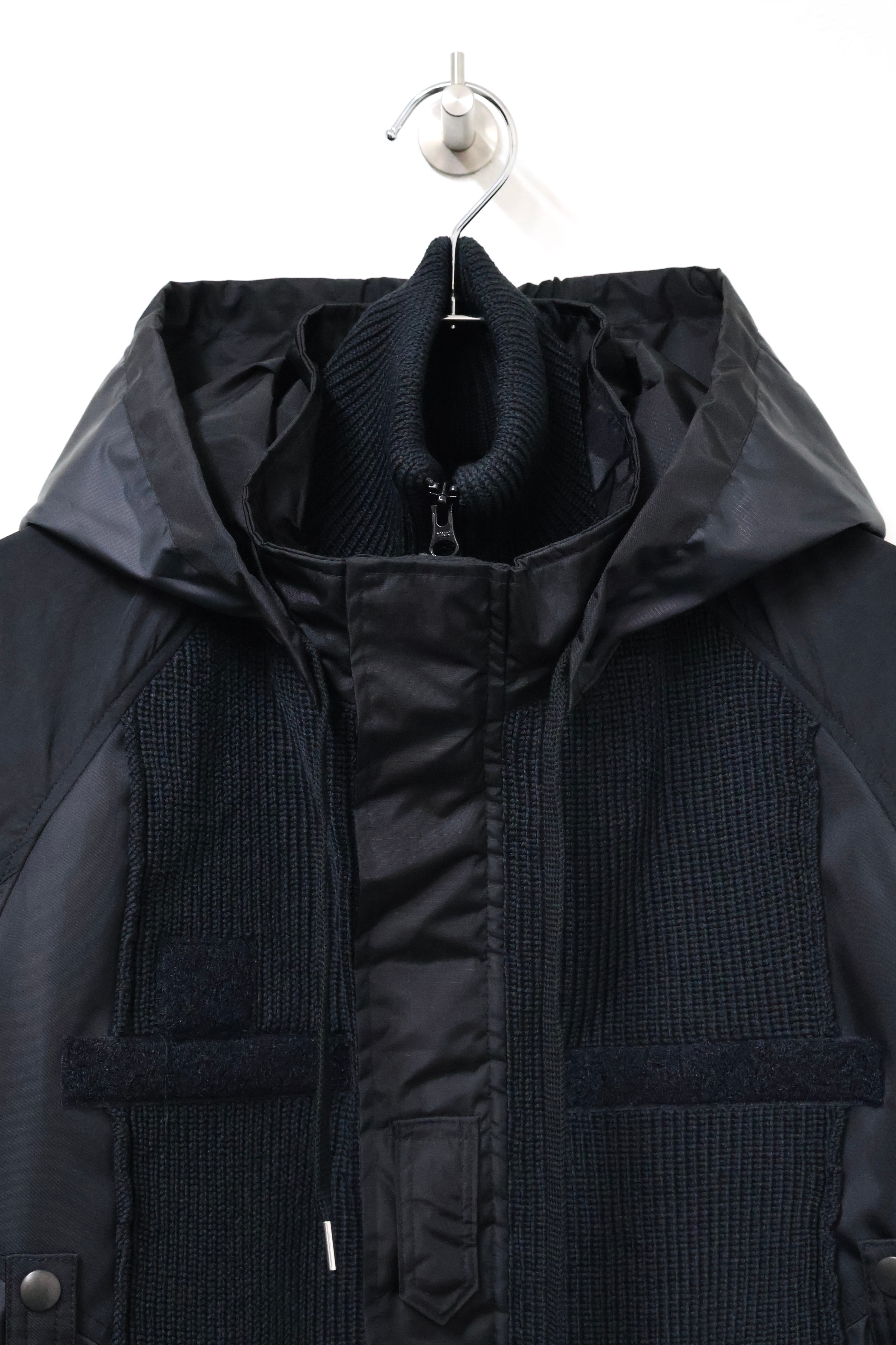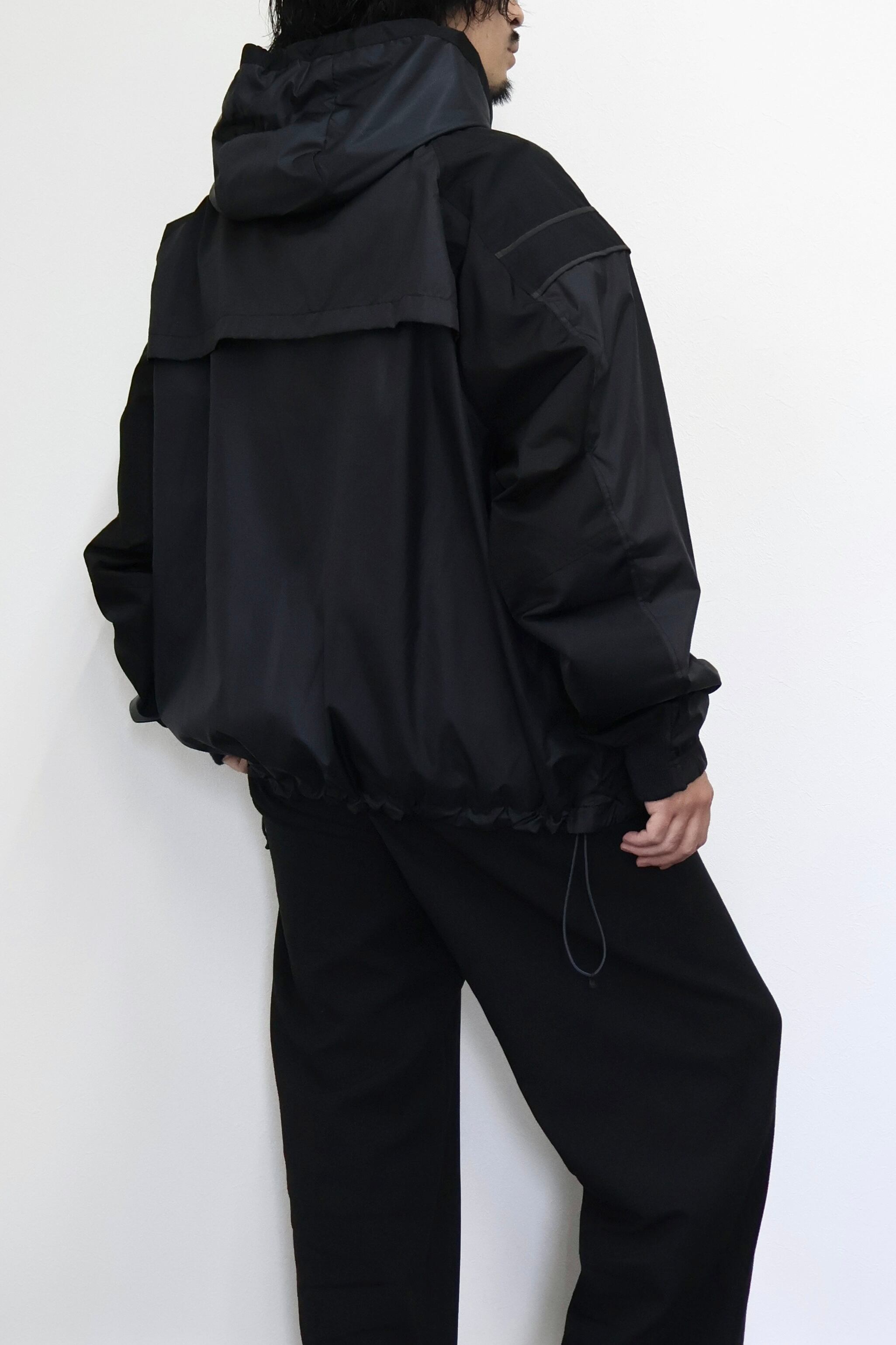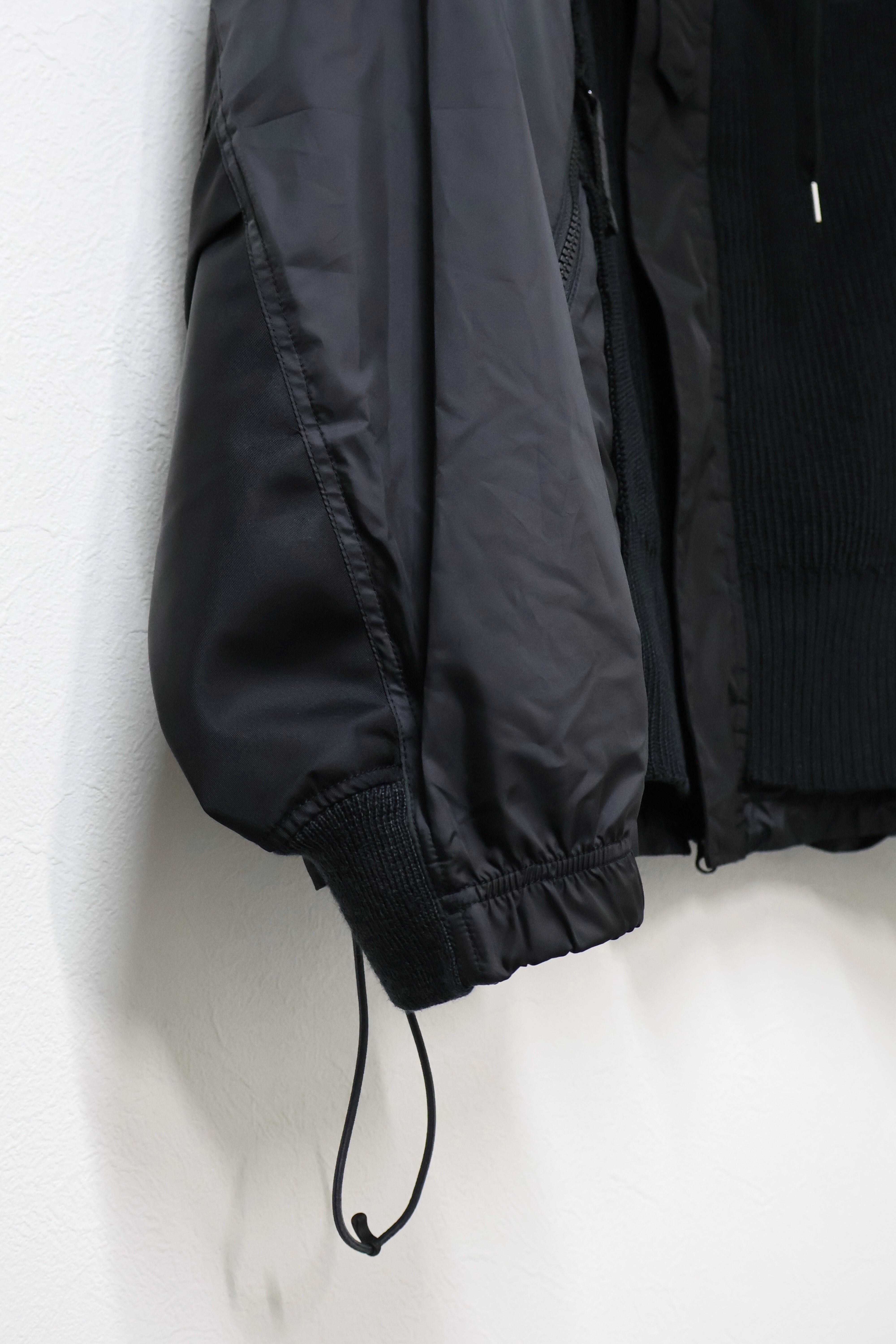 【MA-1】【ECWCS GEN3】【U.S.ARMY IPFU】【ECWCS GORE-TEX PARK】【Coach JKT】【Driver's knit】の合計6種類のアイテムを複雑にドッキングしたカオスブルゾン。ただ切り替えるだけでなく折り重なるように合わせることで複雑でより立体的な見え方になる様パターンメイク。首元はニットかぶれがおきないポリエステル100%の糸で構成したニットパーツを配置。総裏仕様。裏地にはソフトな肌触りが特徴の吸汗速乾機能のあるメッシュ生地を使用。フードはスナップボタンにて取り外し可能のデタッチャブル仕様。フロントには大振りなファスナーポケット2ヶ所、ユーティリティポケット1ヶ所。裾部分にはアジャスター付きドローコードを配置し、シルエット変更が可能。