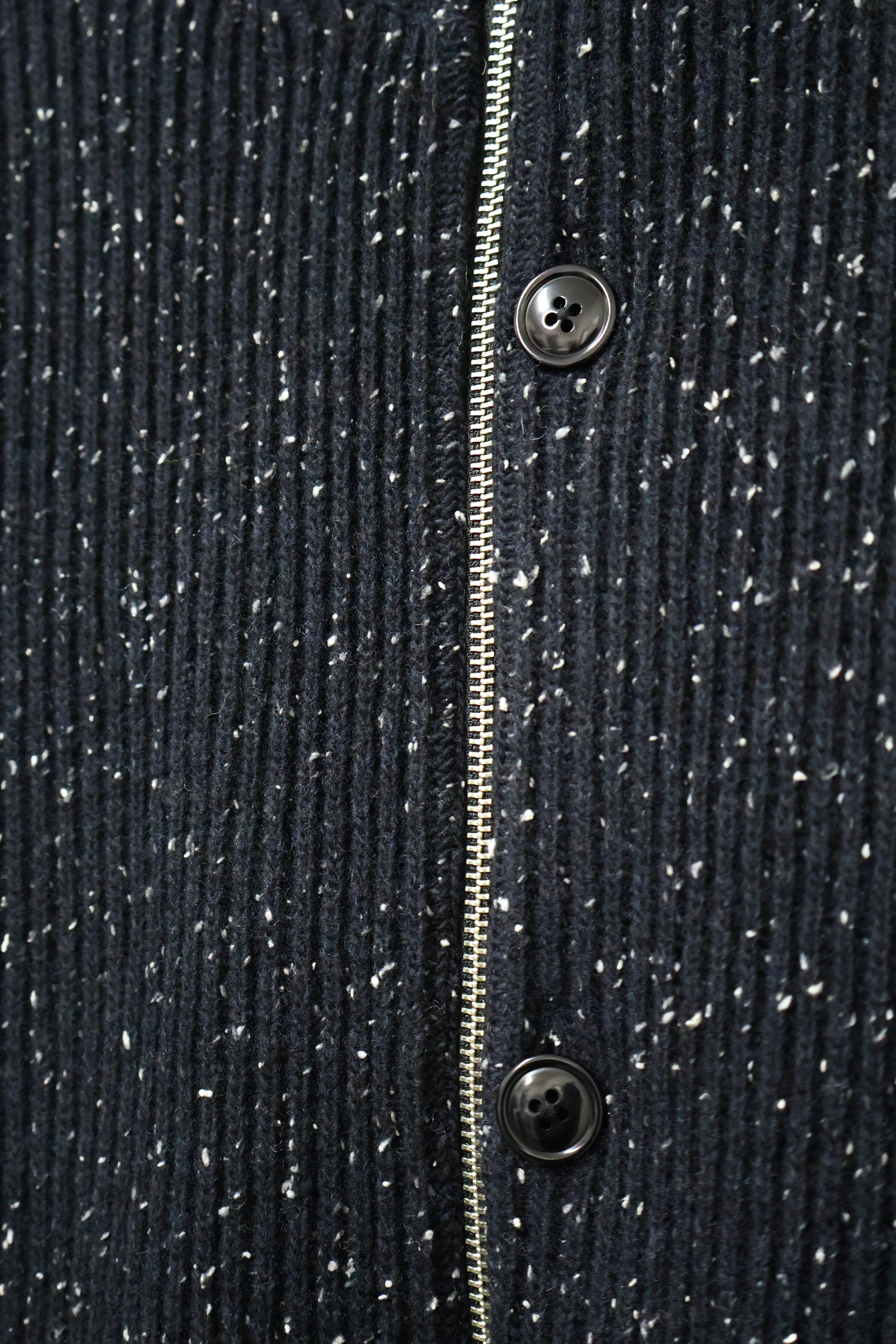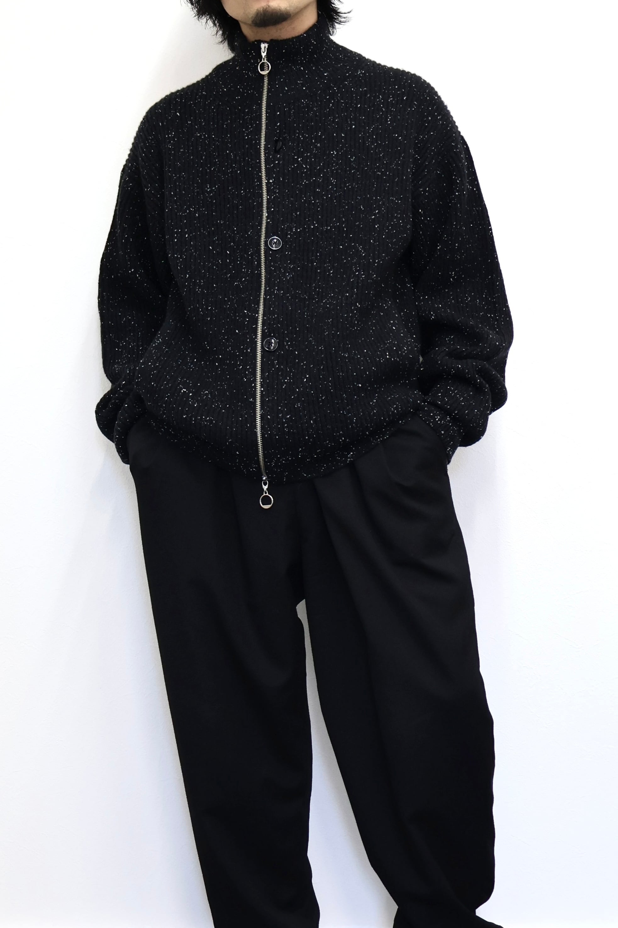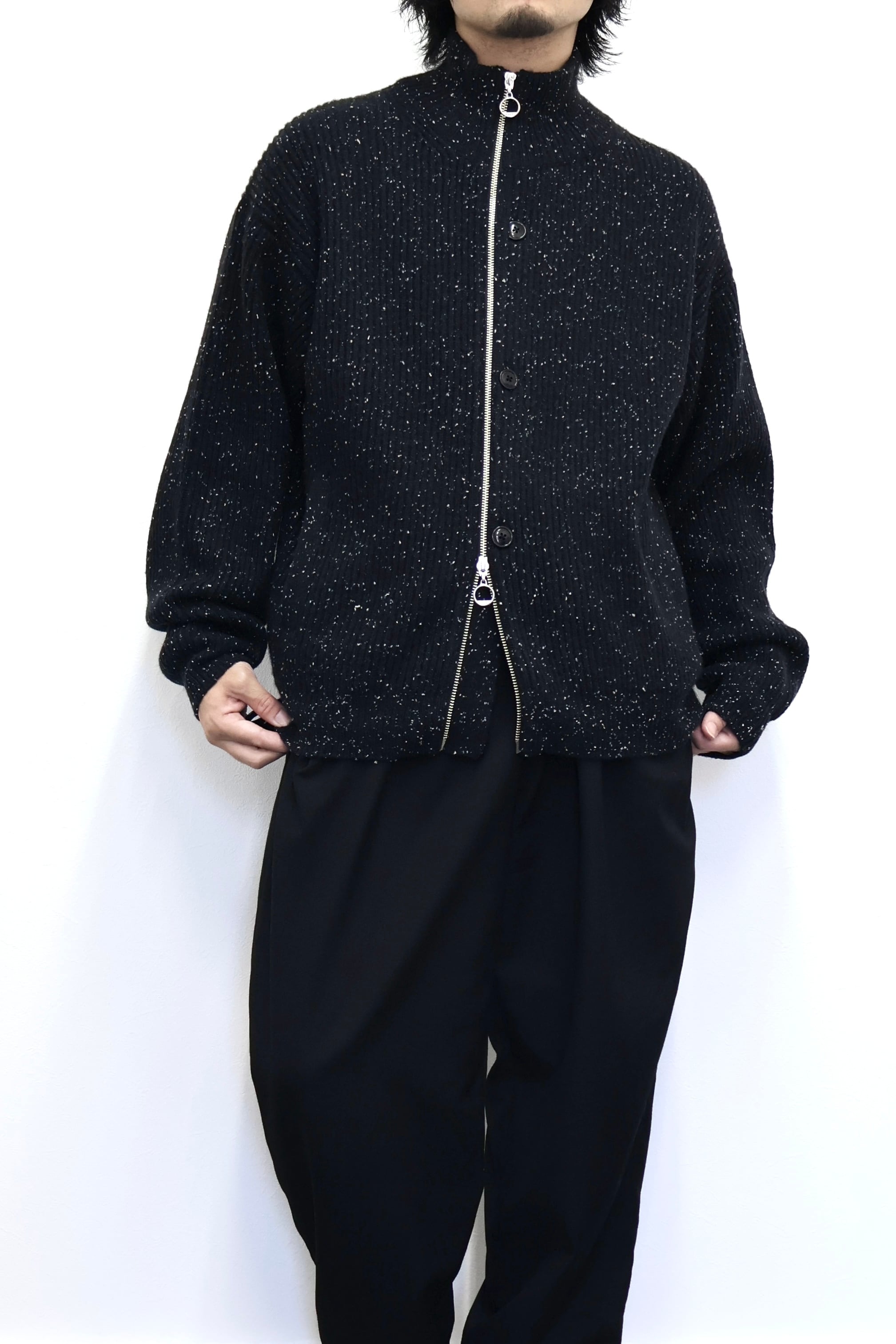 ドライバーズニットジャケット。ファスナーの位置を右側にずらしカーディガンの要素を加え中心にはボタンを配置。糸は少し懐かしさのあるメリノウールが原料のネップ糸を採用。編み組織は両畔を採用ししっかりとした重厚感が特徴。程よいゆとりのリラックスフィット。