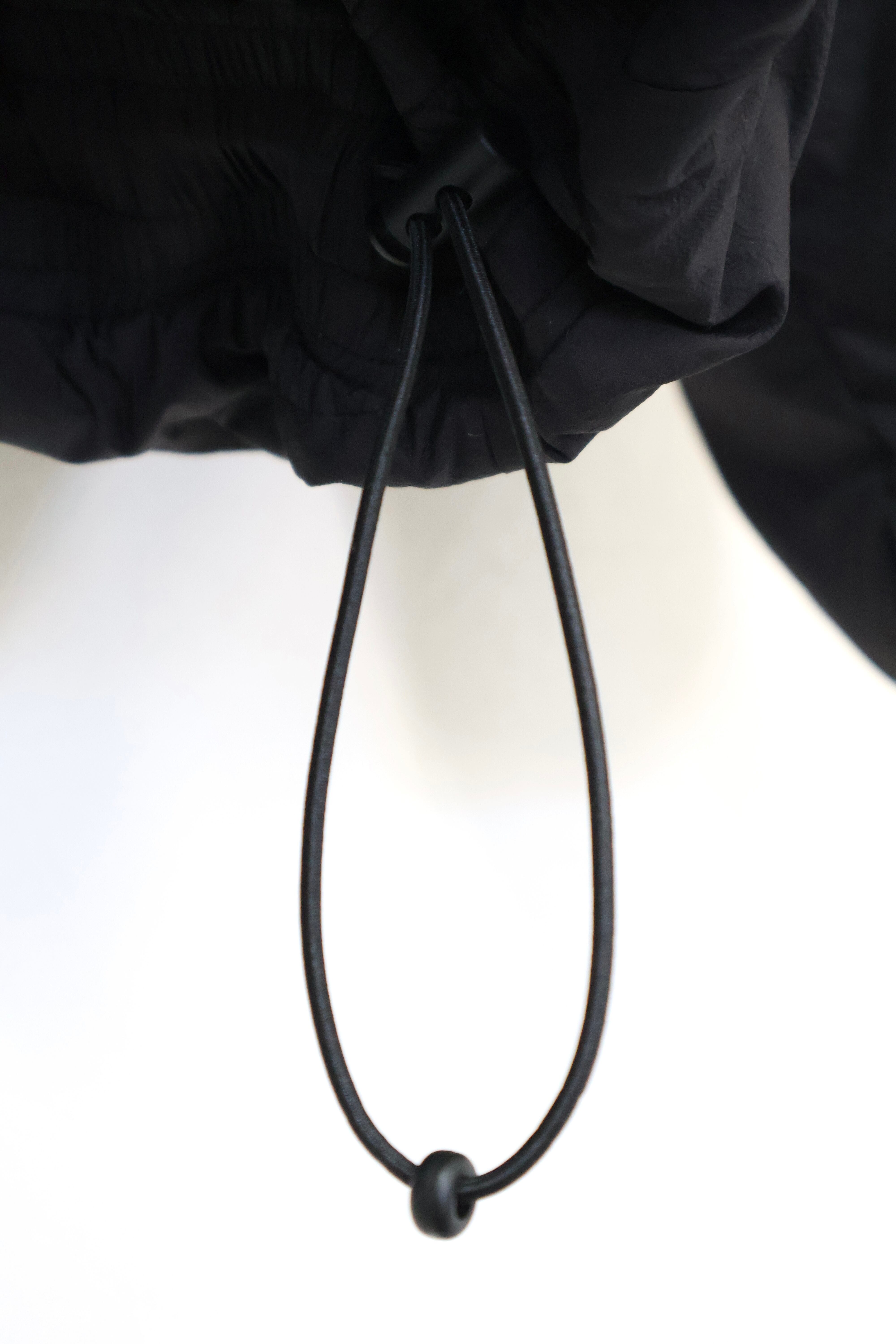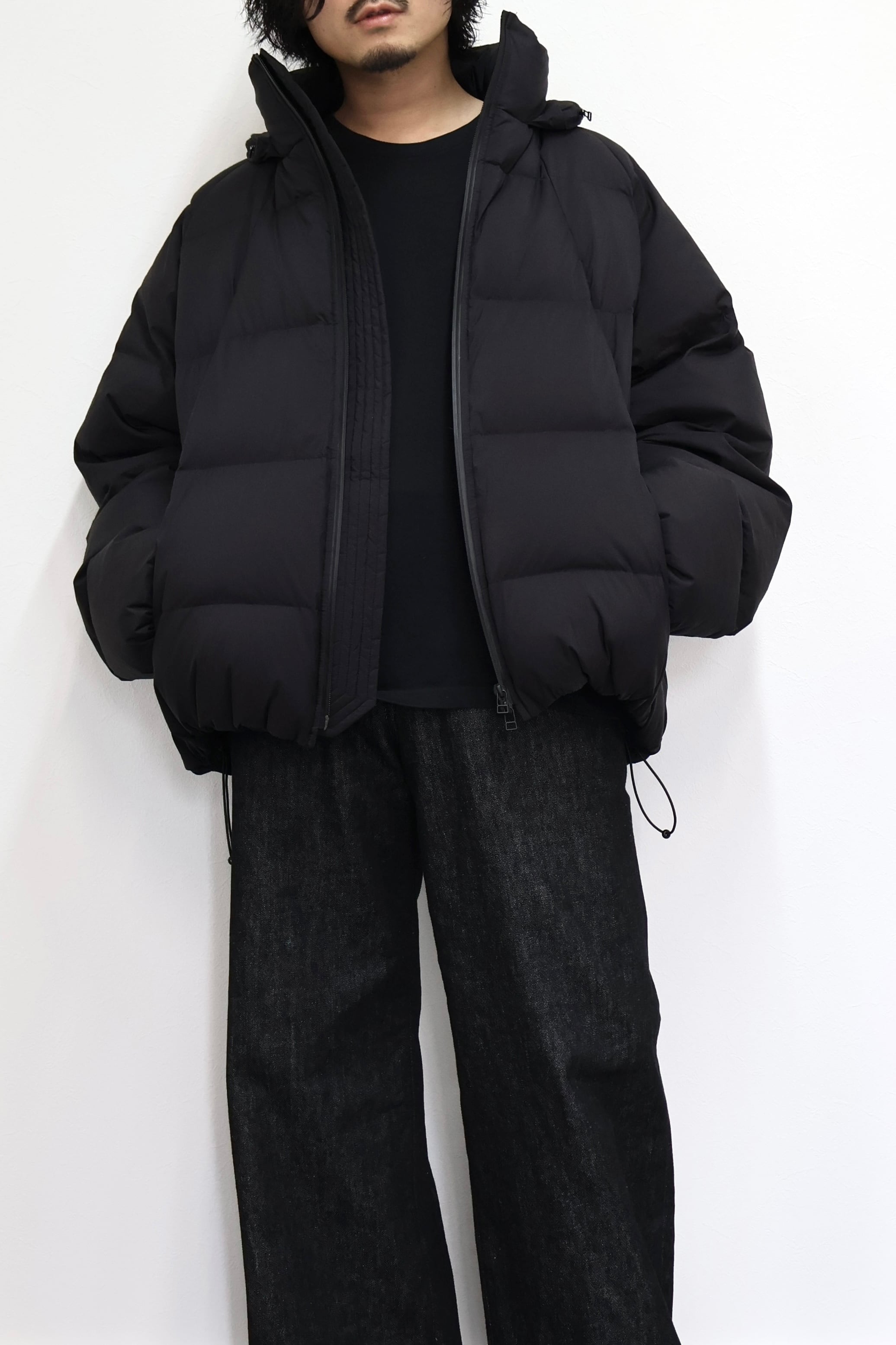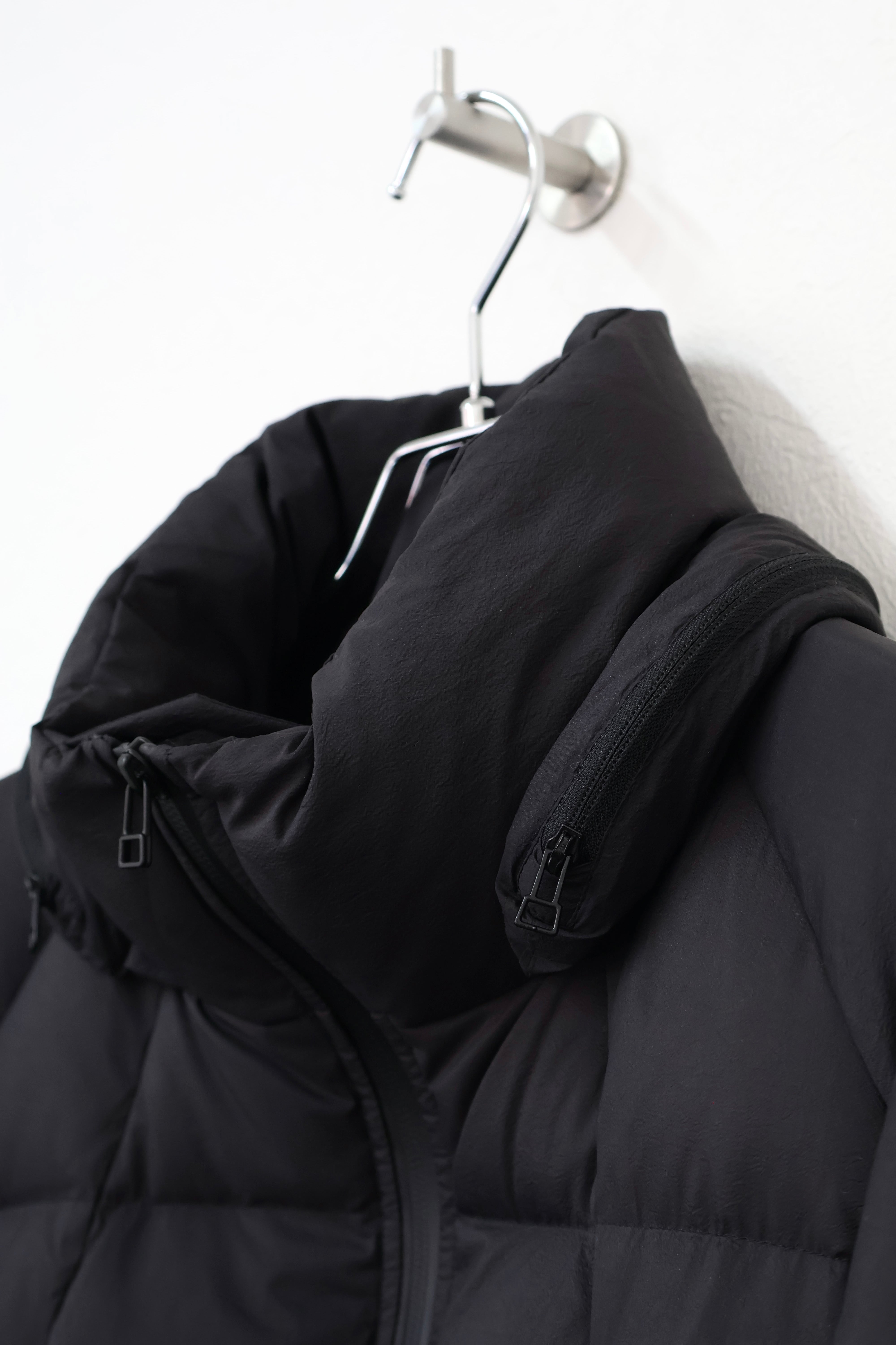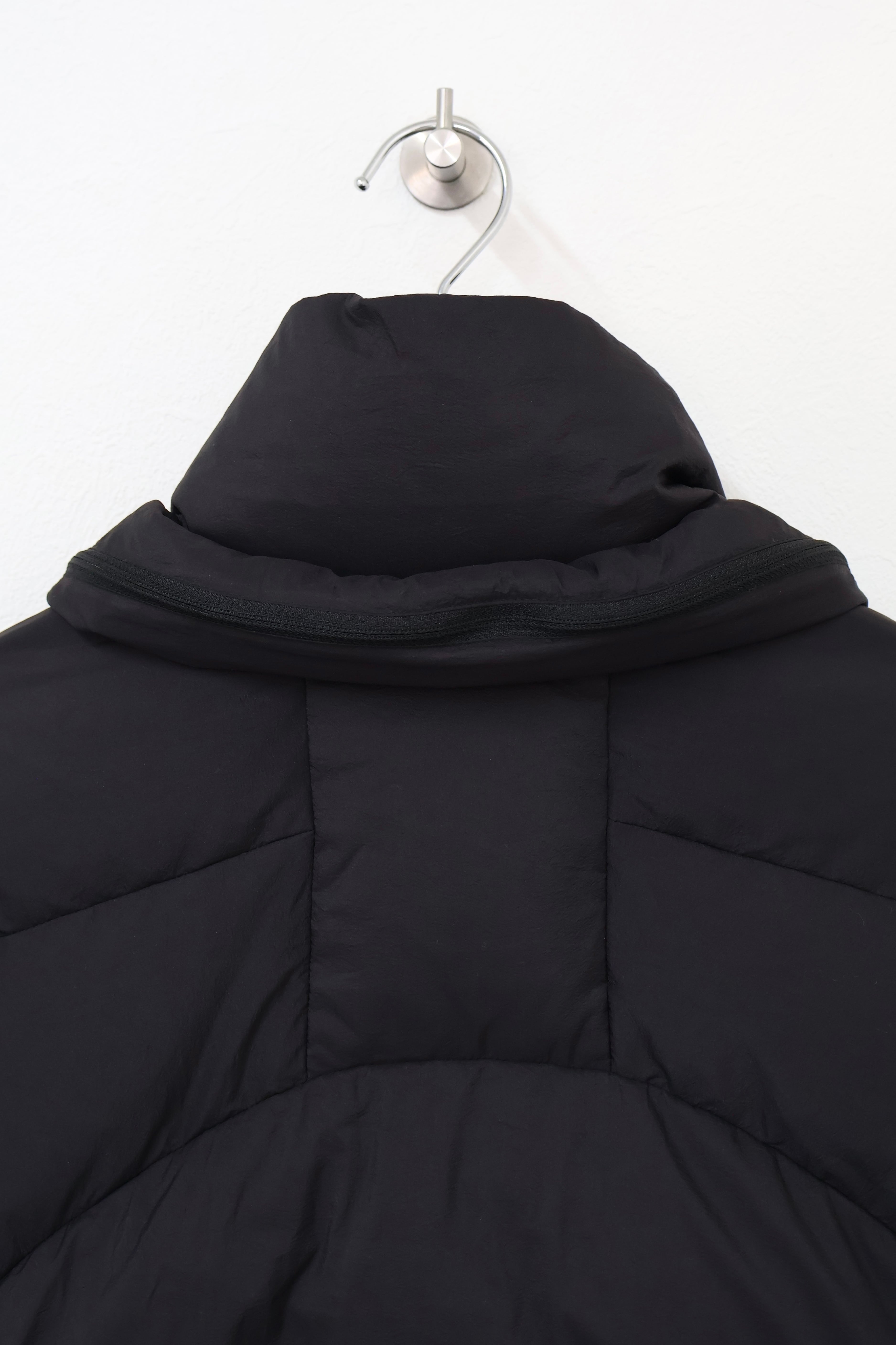 ステッチデザインによるカーブと首に付けられた収納フードが特徴のダウンジャケット。 ハの字のジップ内ポケットは上下で仕切られておりフロント内側にはメッシュポケットを採用するなど大容量の収納システムとなっている。 肩はラグランスリーブ仕様。 裾口にドローコードを配することでシルエットを調整することも可能。