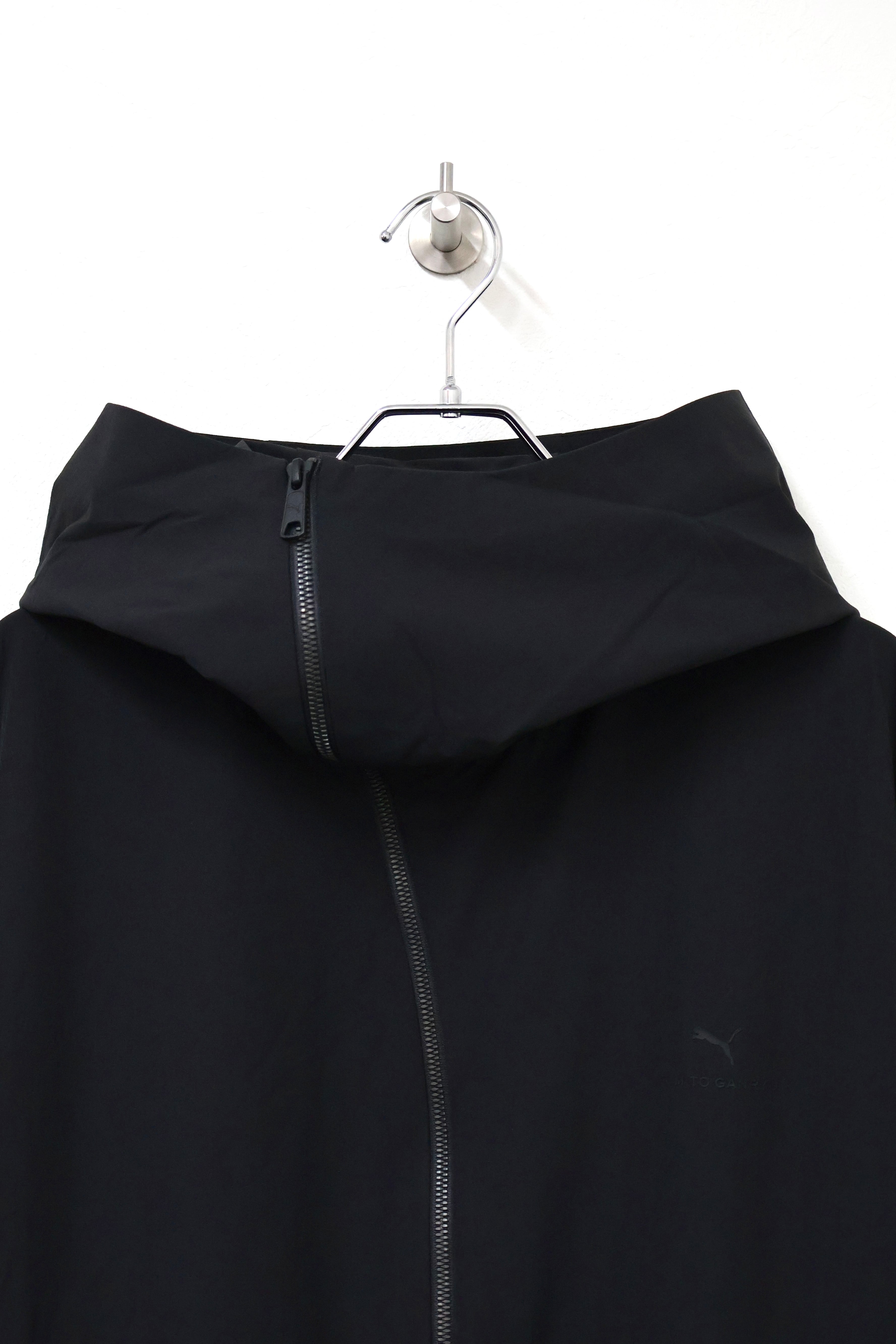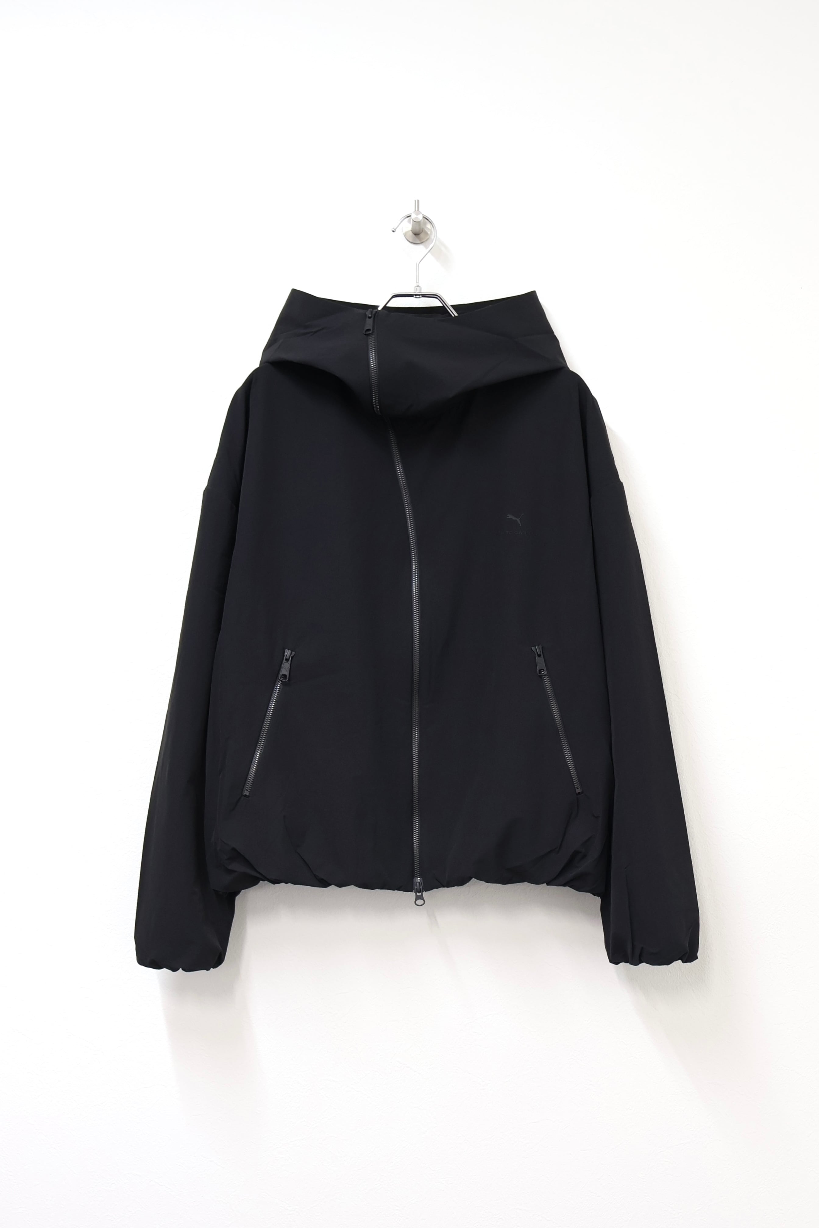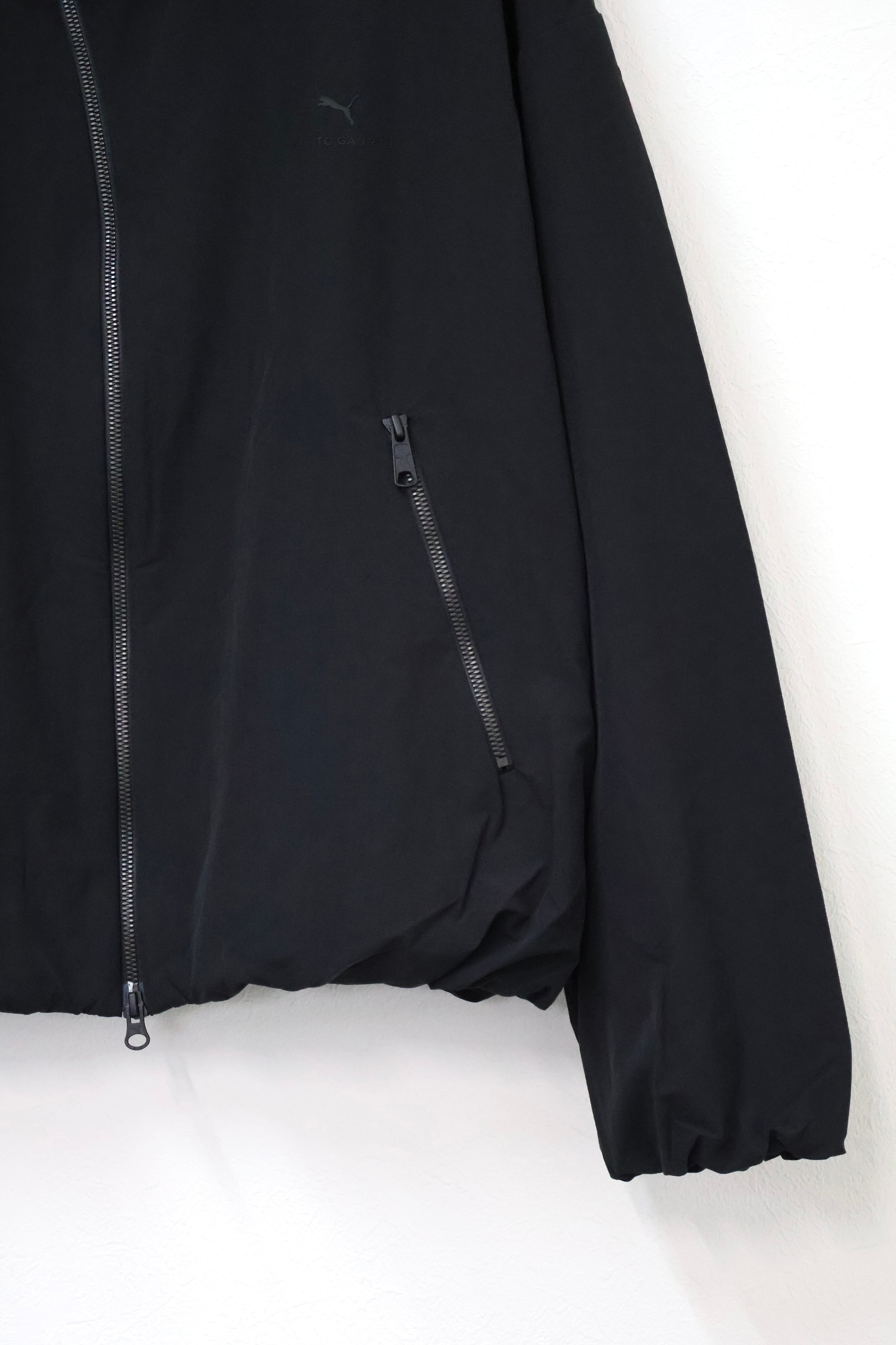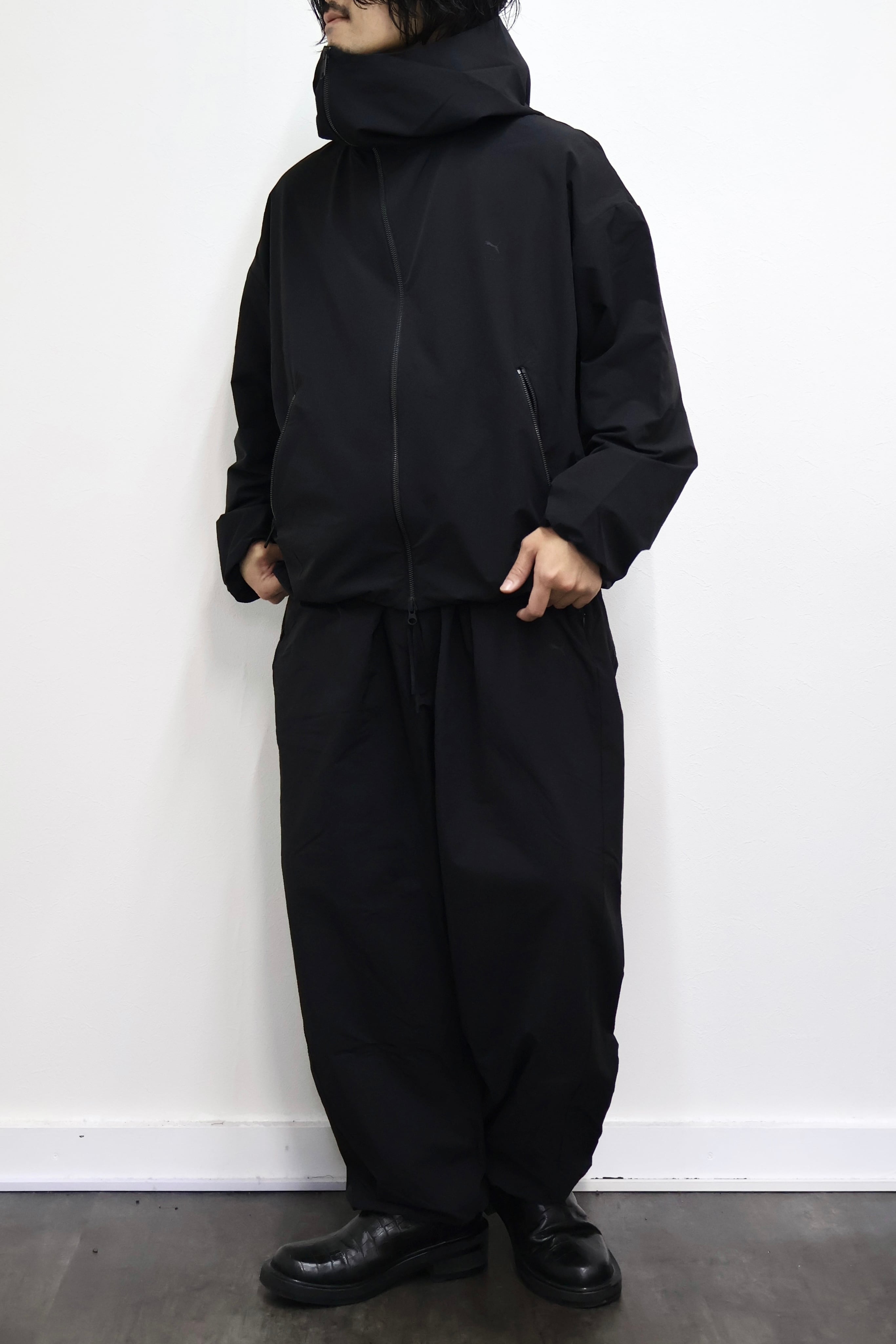PUMAとのコラボレーション。快適性を考慮したアシンメトリーなファスナー明き。袖口と裾はエアリーな雰囲気を狙った特殊なシャーリング仕様。裏地とポケット袋布は温かみのあるライトなフリースを使用。左胸にPUMAのプリント。PUMA Baggy Slacksとセットアップで着用可能。