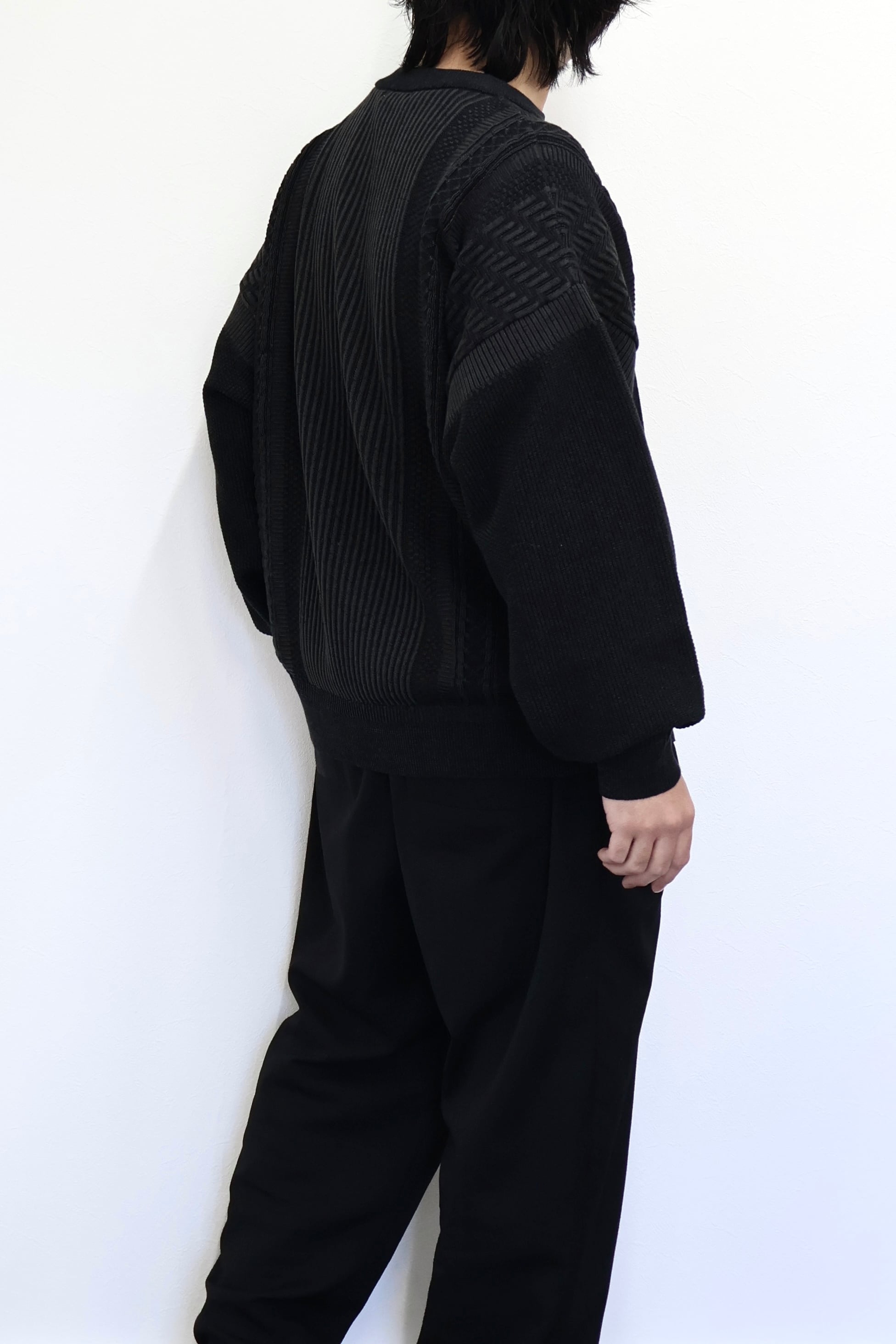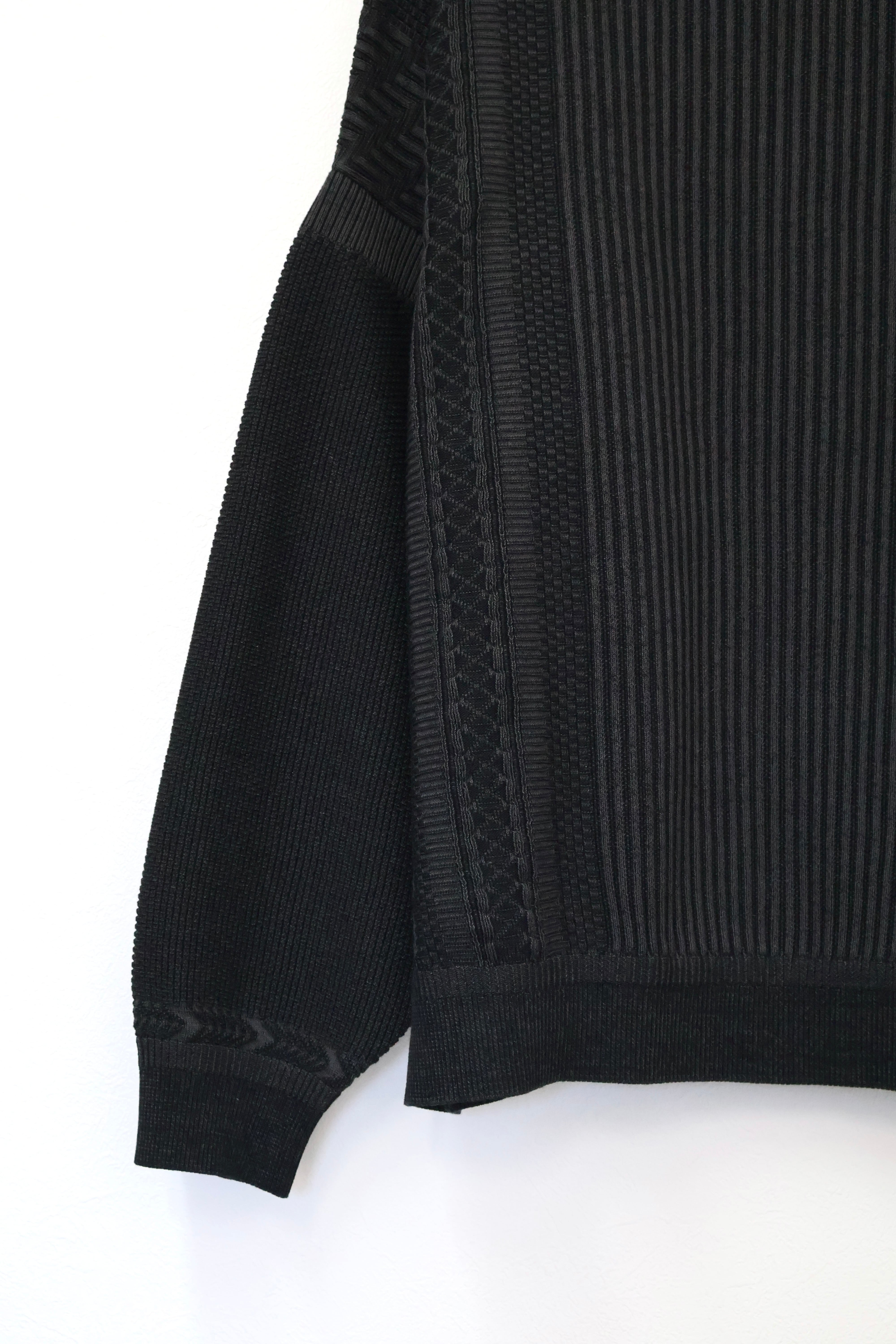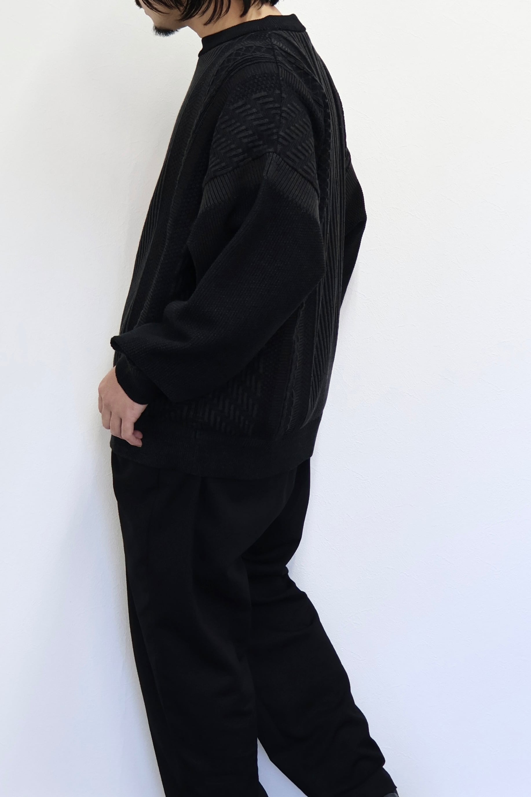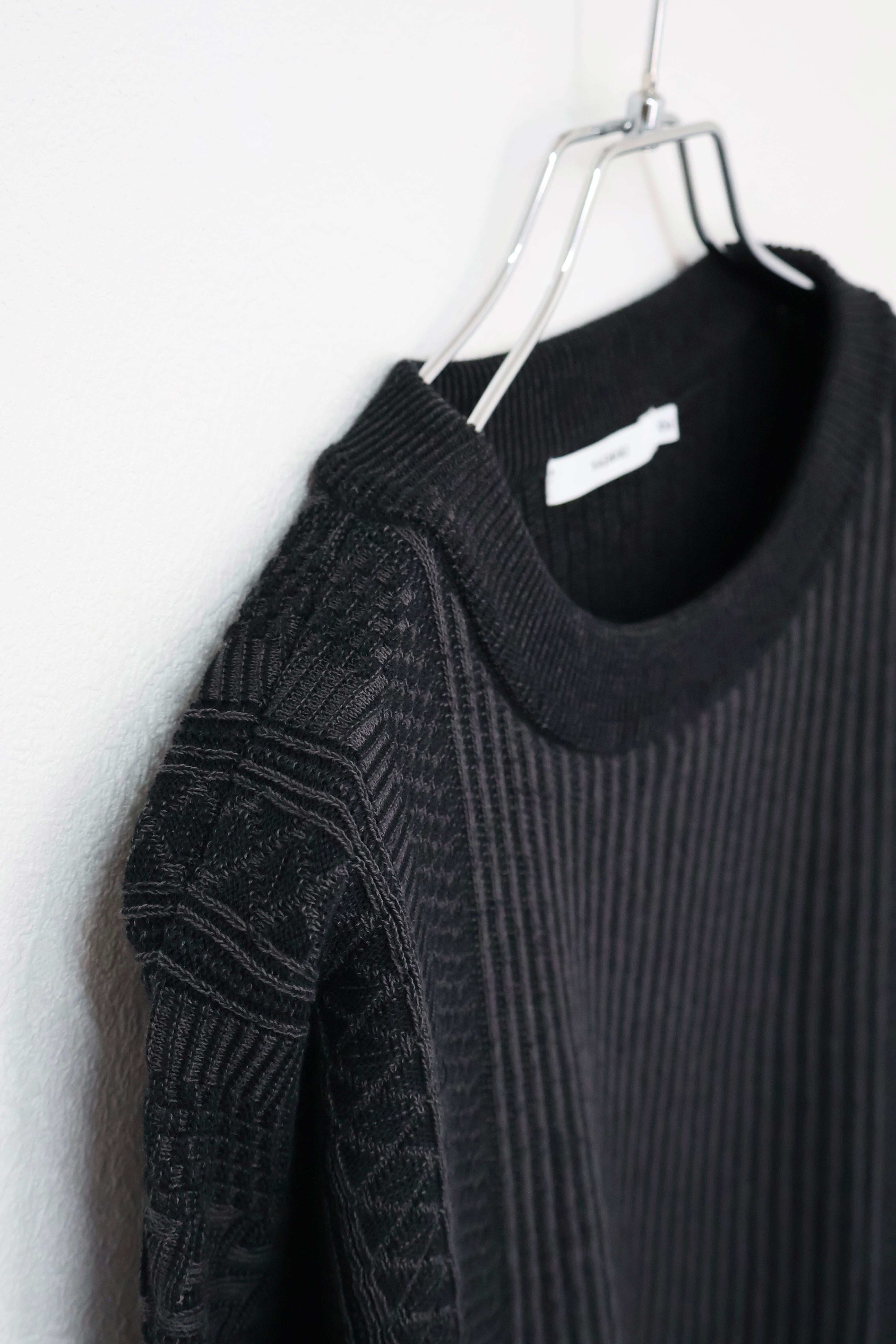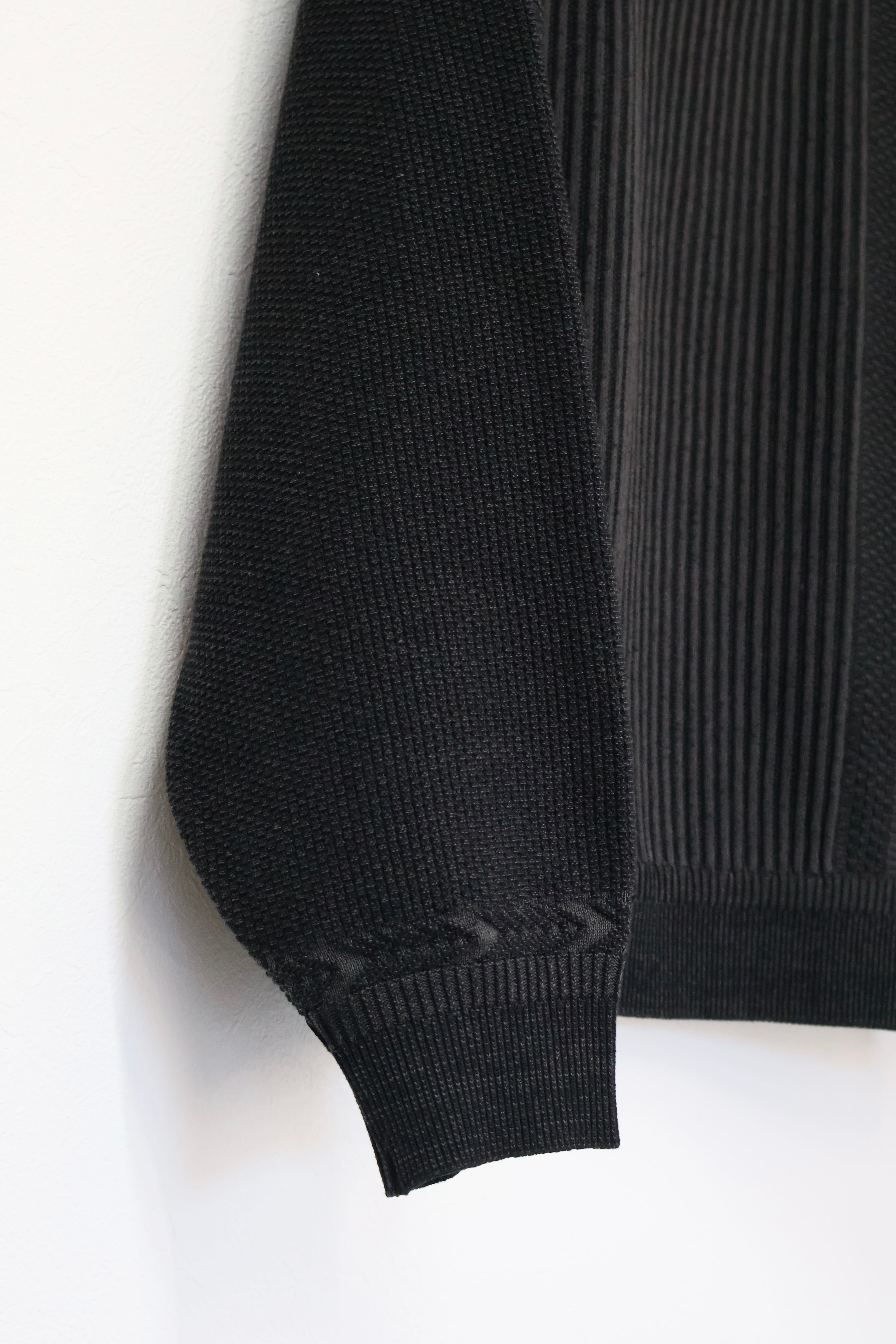 プレーティング編みと言われる表日側と裏日側で異なる糸を編む技法を使用し、表と裏で糸の色を変えて、2色で編むことで奥行きのある表情に。
