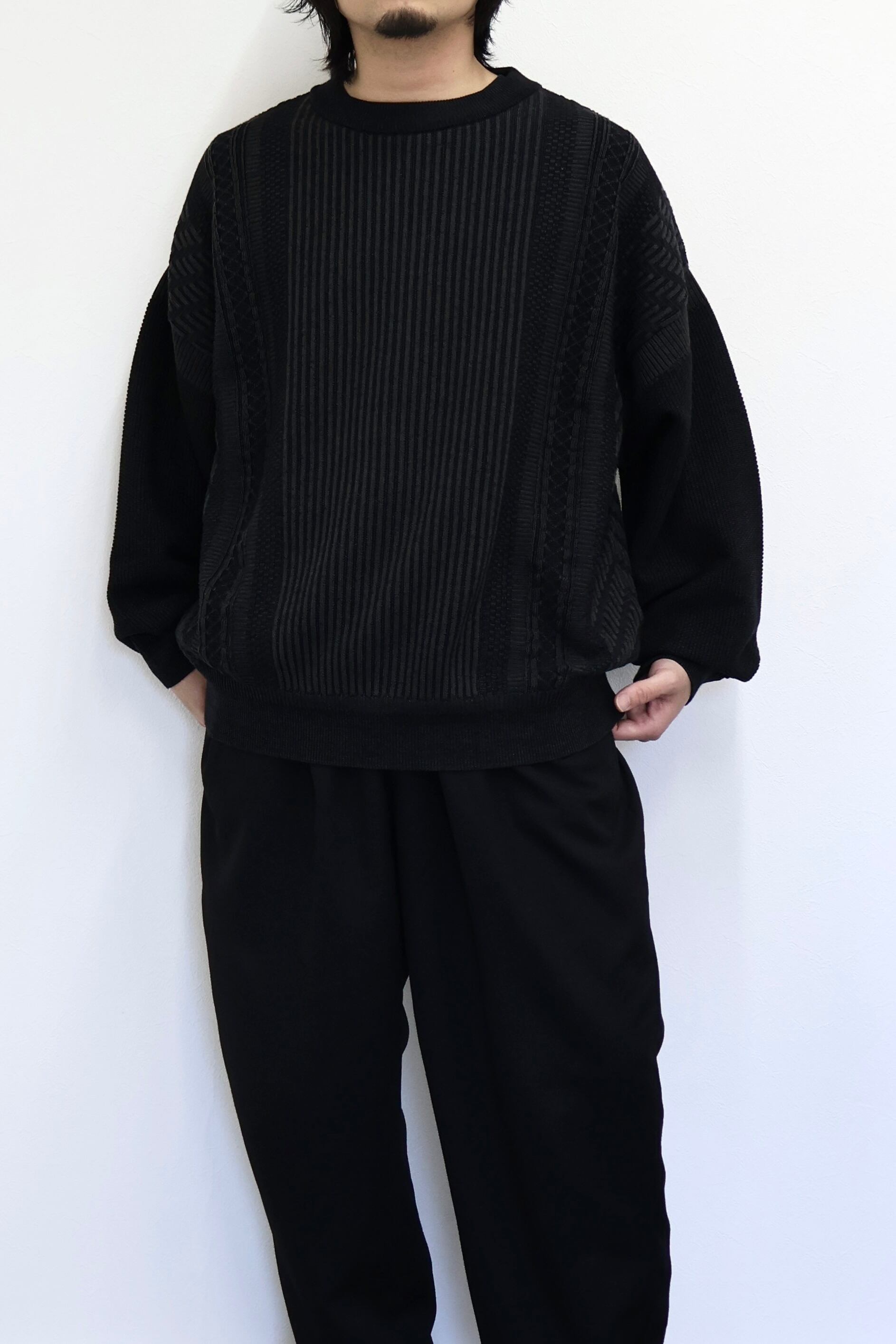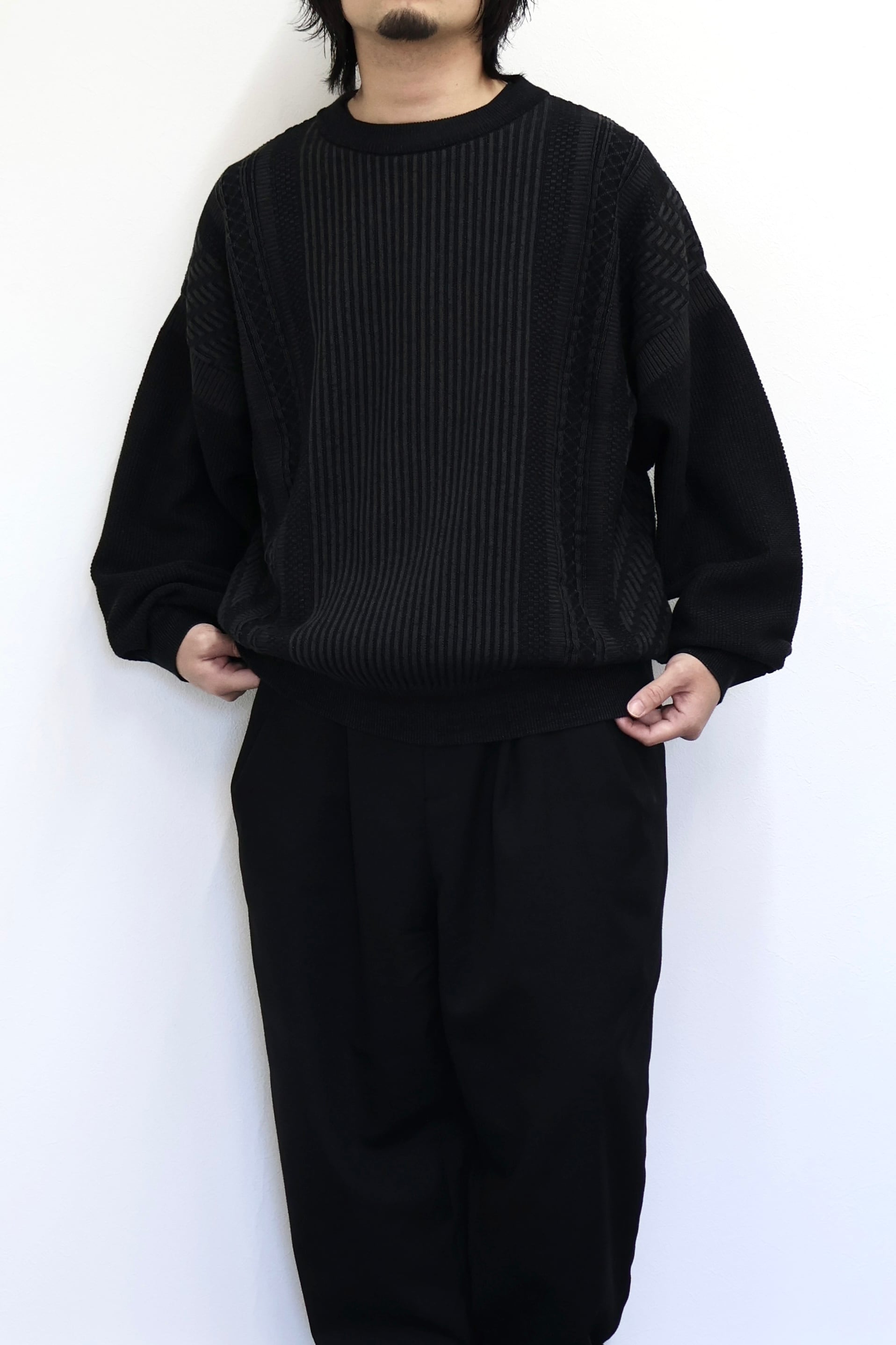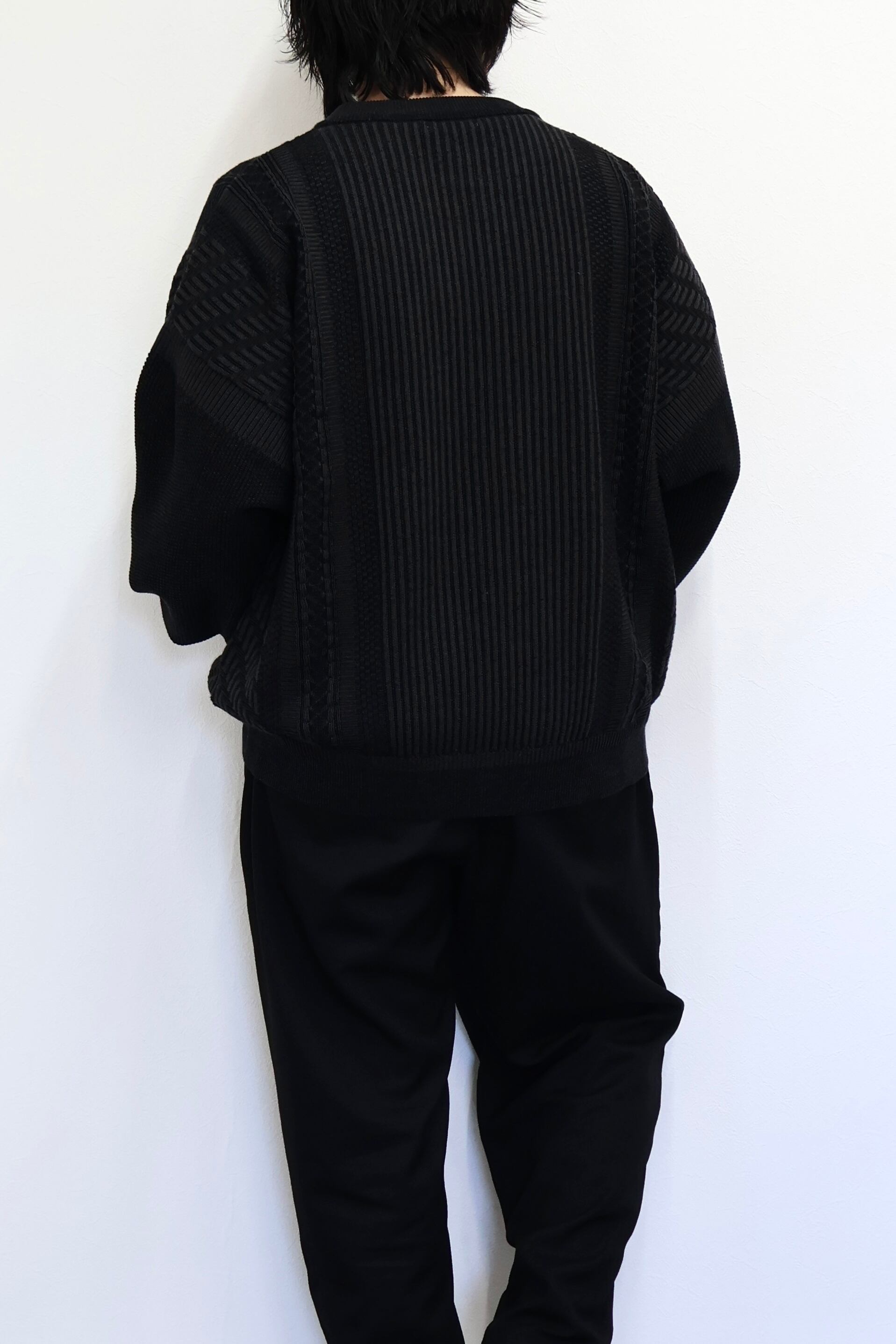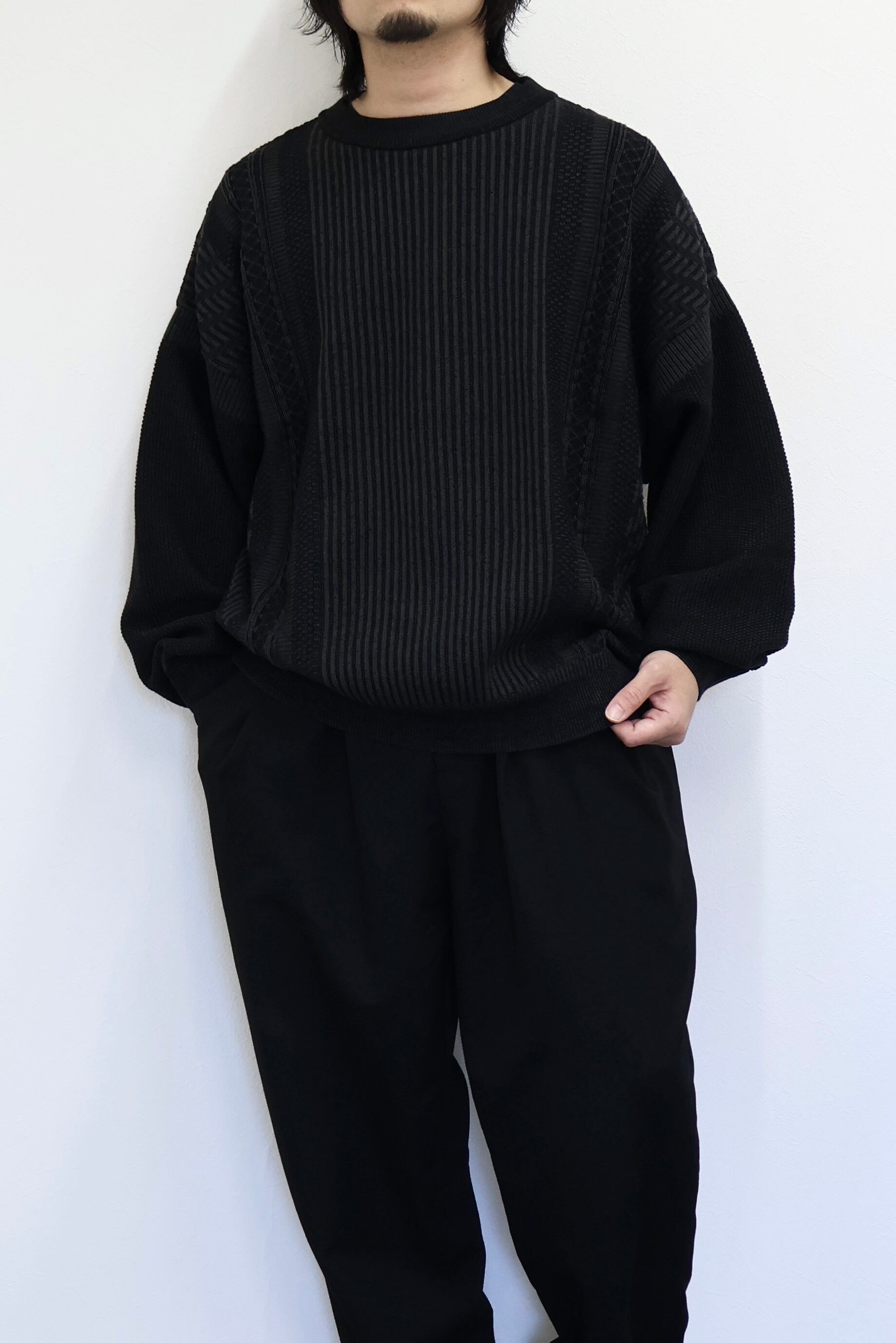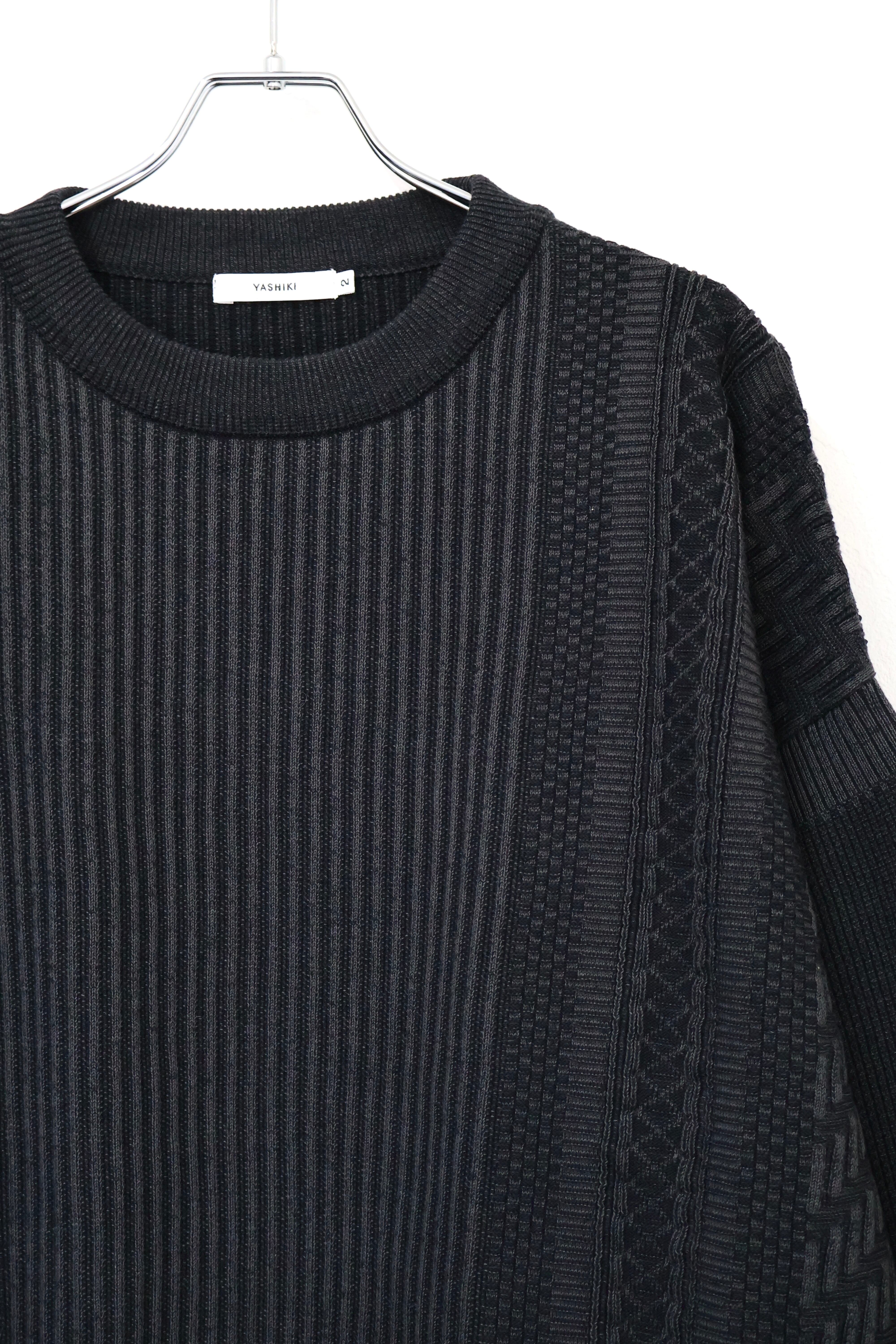 プレーティング編みと言われる表日側と裏日側で異なる糸を編む技法を使用し、表と裏で糸の色を変えて、2色で編むことで奥行きのある表情に。